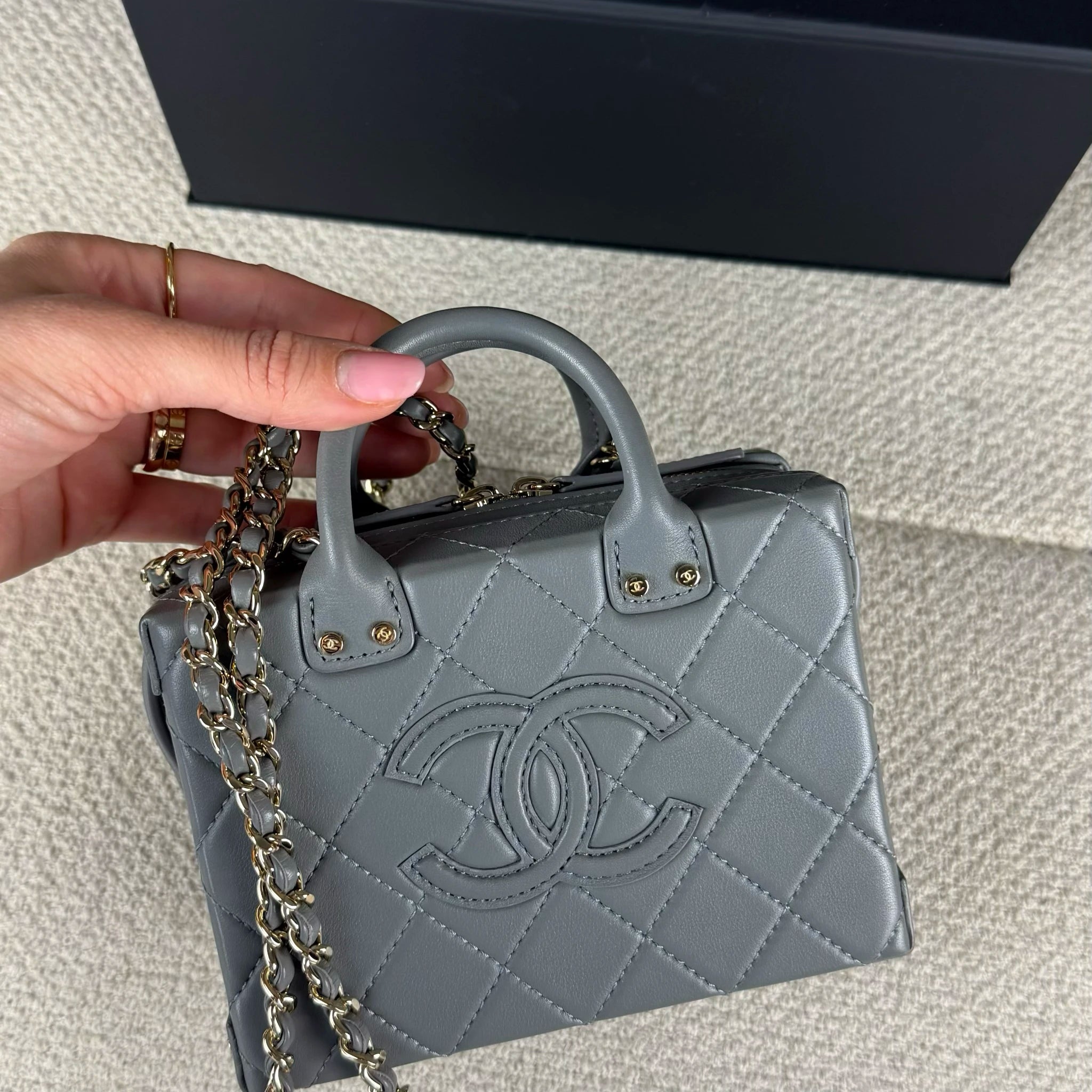 The Chanel Small CC Quilted Calfskin Top Handle Convertible Vanity Case is a women's handbag, recognized by its iconic quilted pattern and CC detail, symbols of the Chanel brand identity. This model stands out for its versatility and design, remaining true to the legacy of elegance associated with the brand.