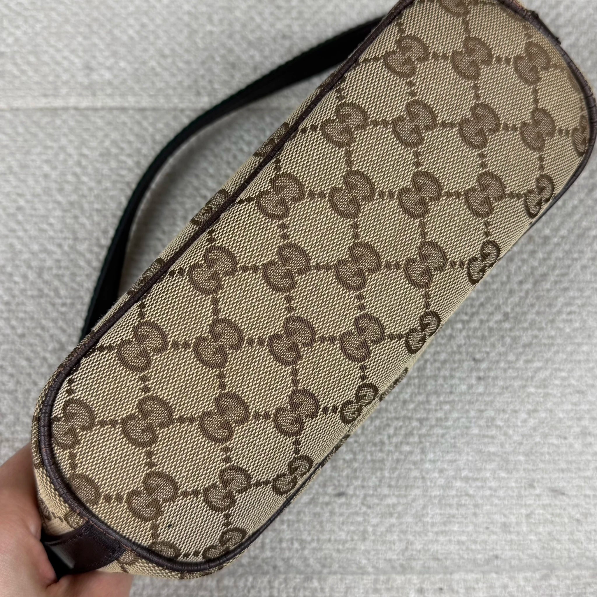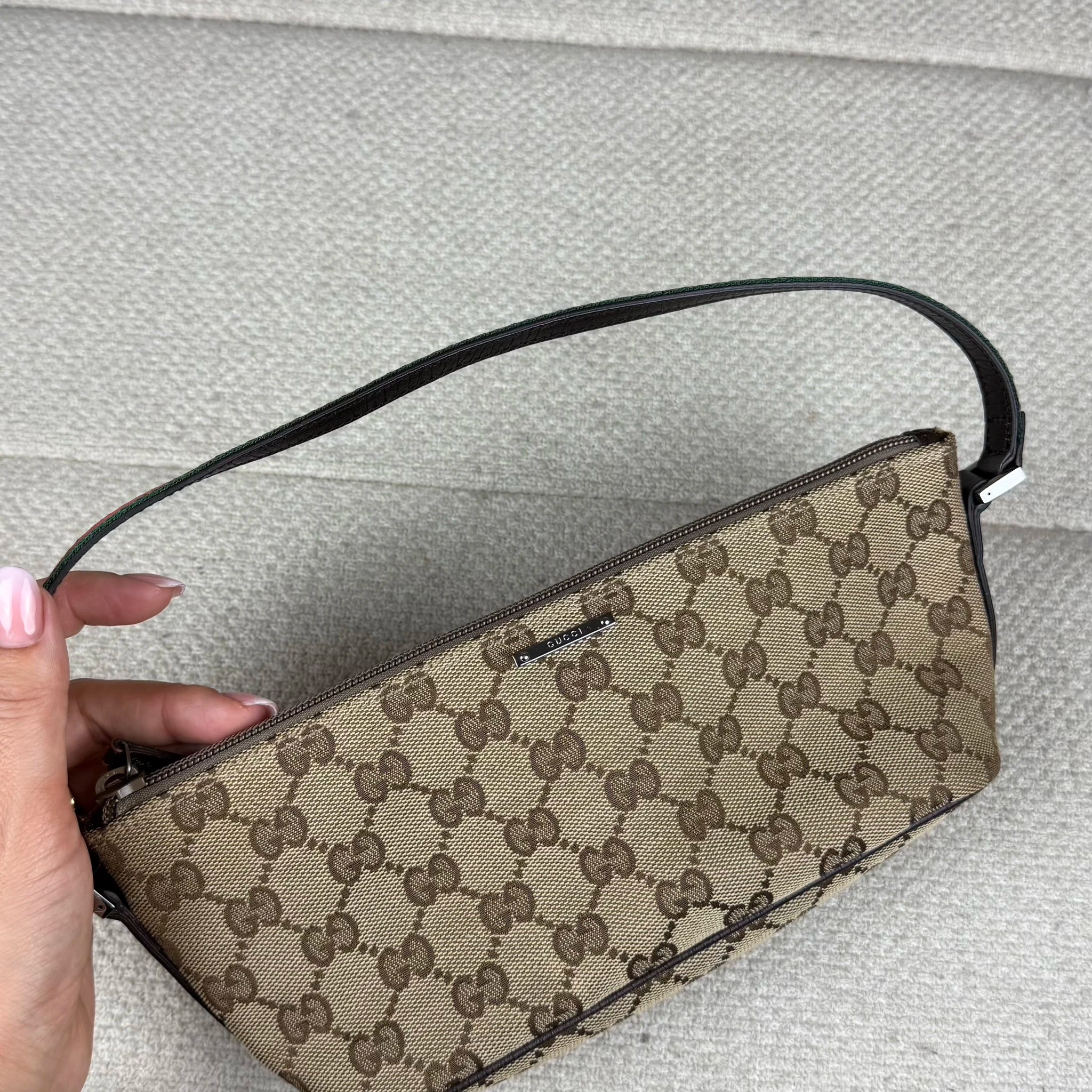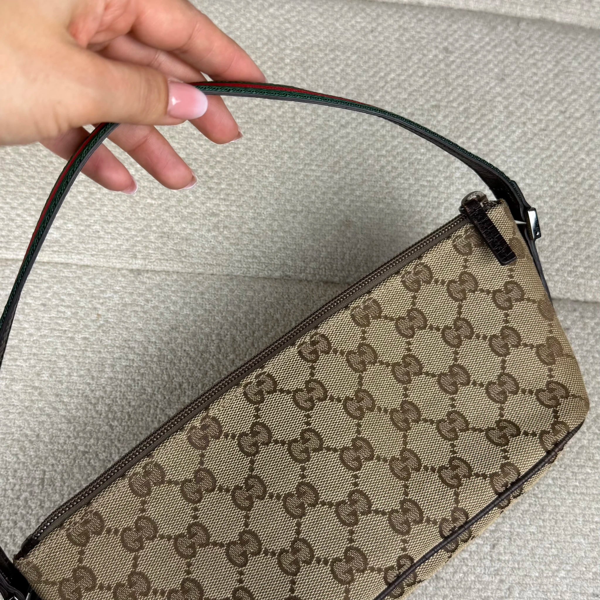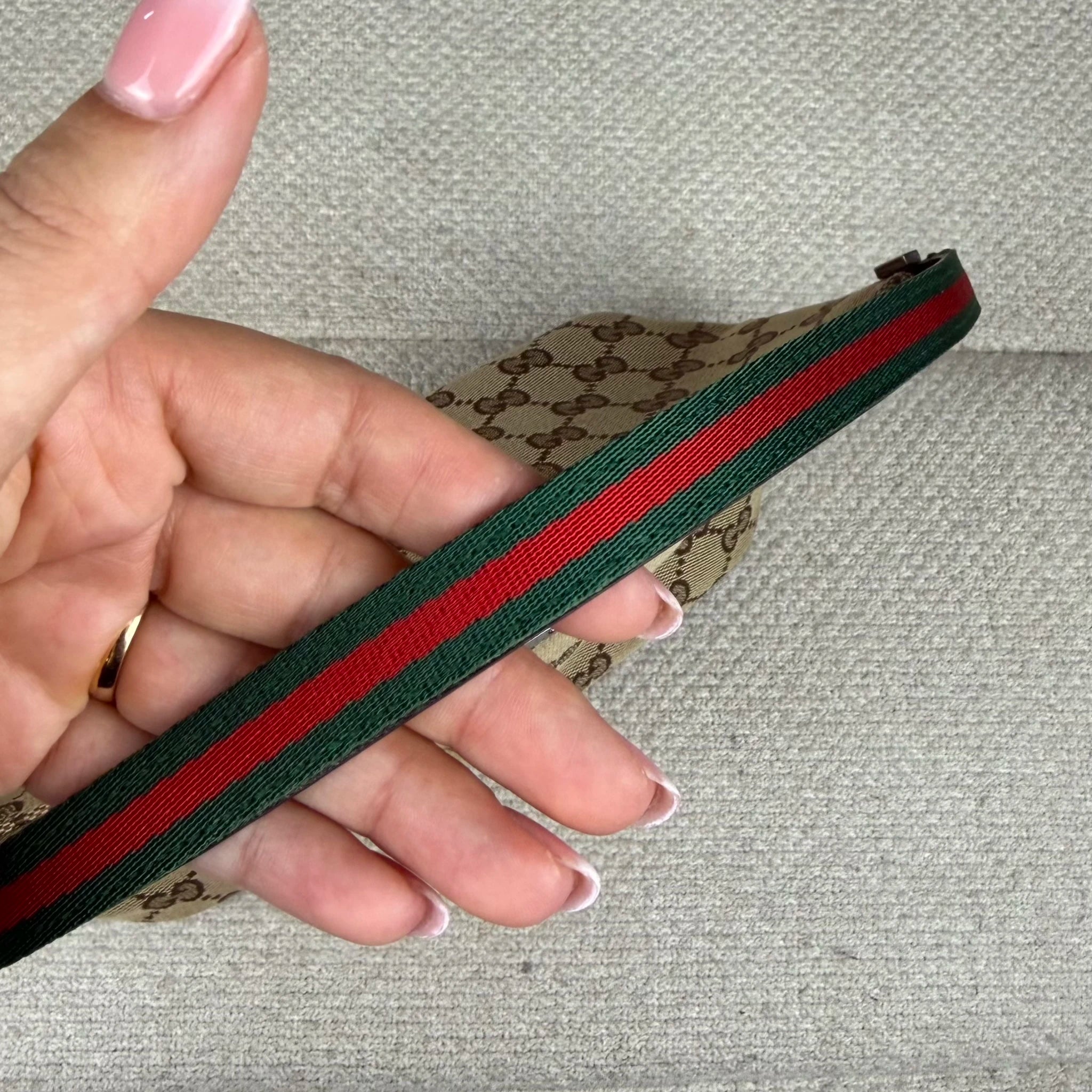 The Gucci GG Canvas Web Boat model is a handbag designed for women, reflecting the brand’s design identity. This pre-owned item stands out with the iconic GG Canvas pattern, a recognized element in the Gucci universe. Designed to complement different styles, it combines functionality with a striking legacy in the fashion world.
