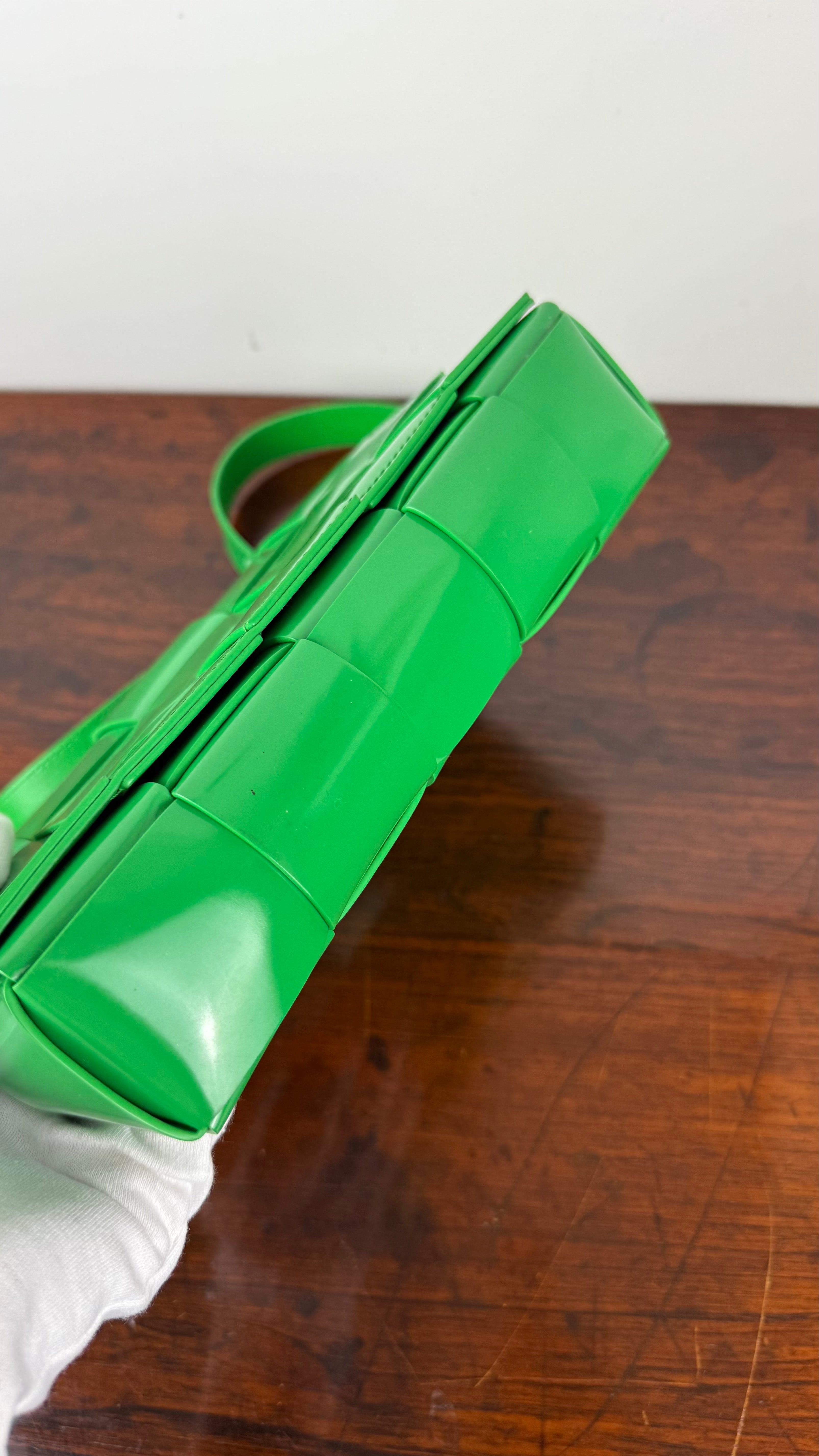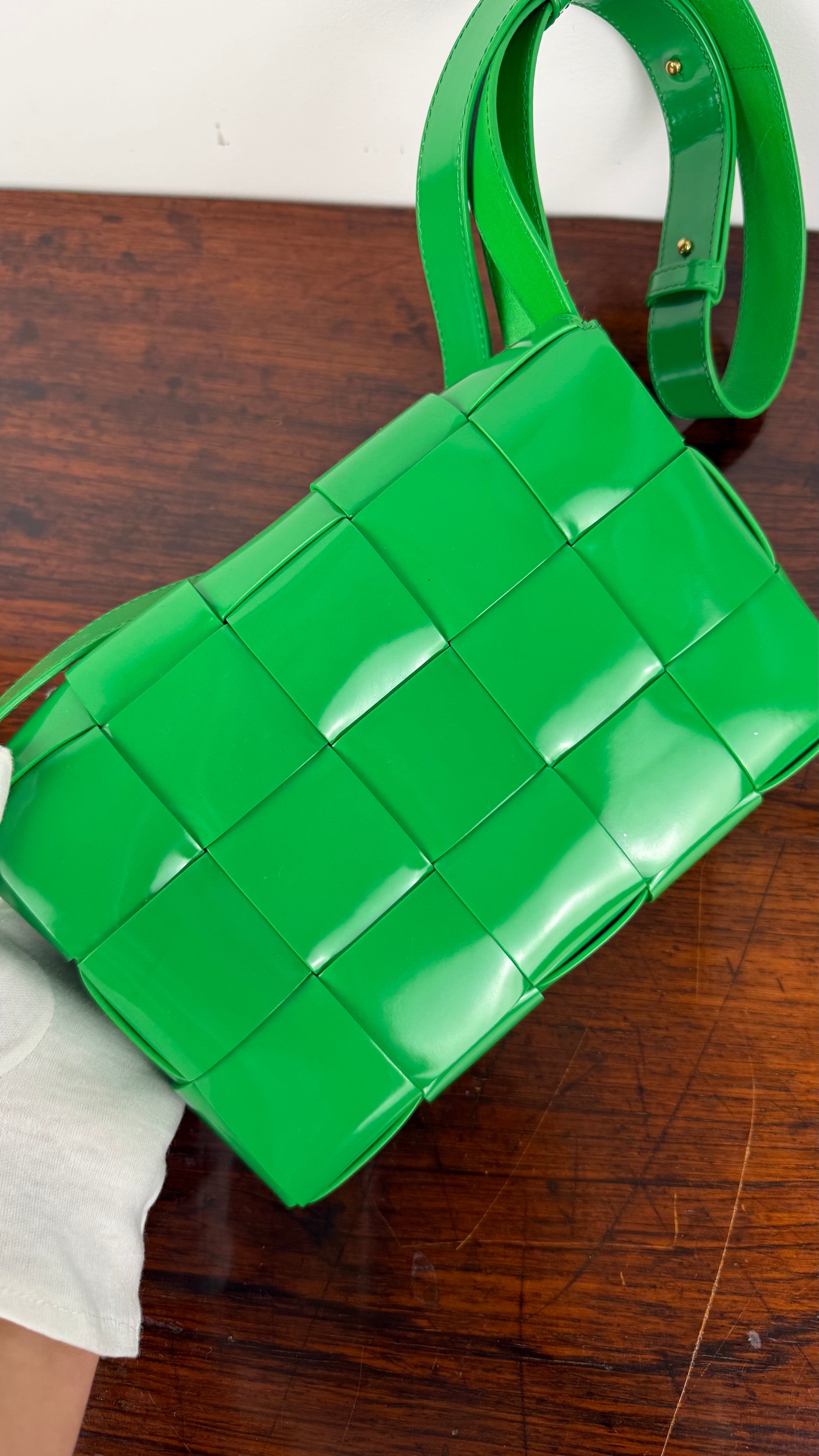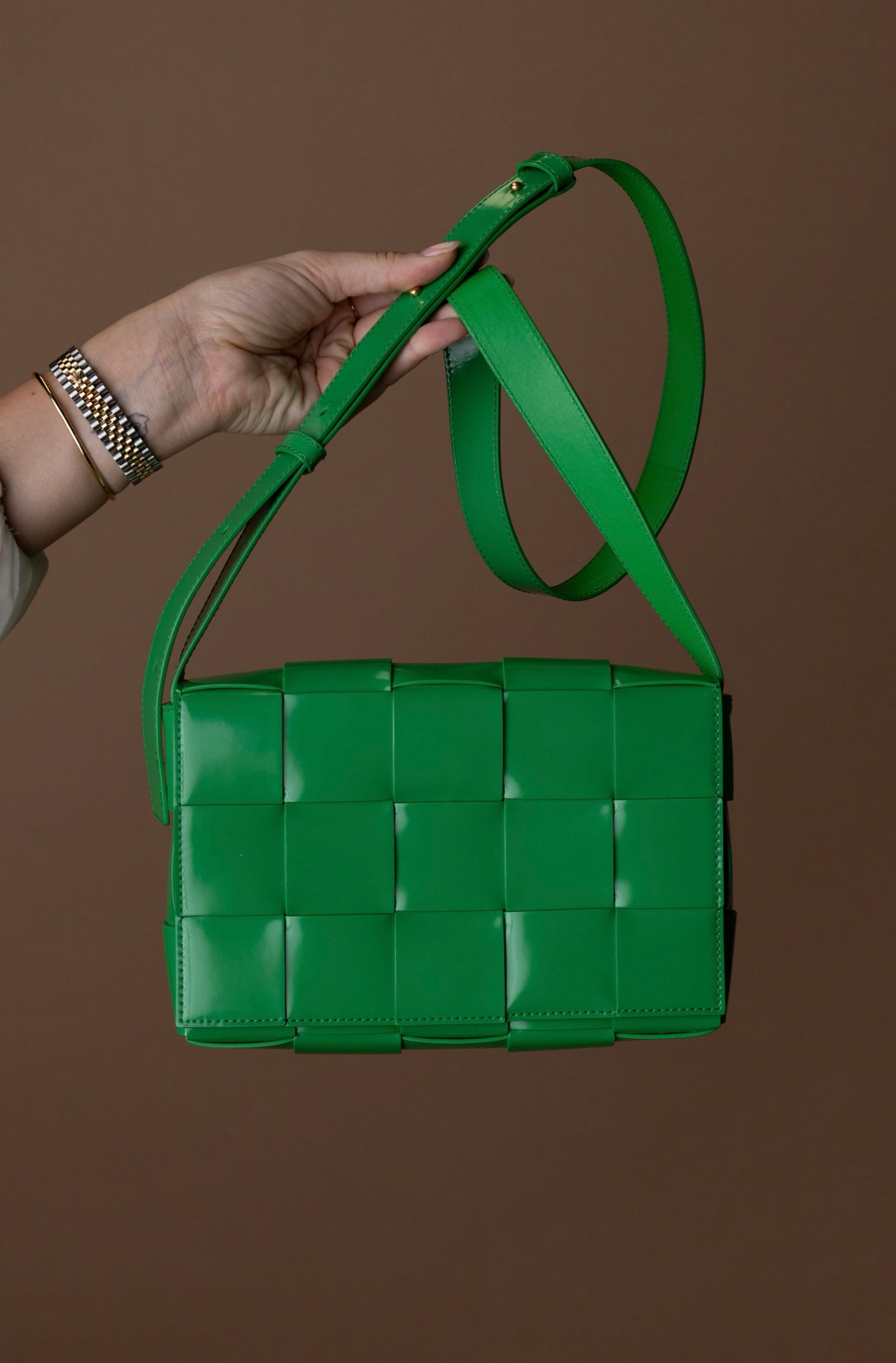A mala Cassette da Bottega Veneta é um clássico contemporâneo, reconhecida pelo seu design em tiras largas de pele entrançadas, que se tornaram assinatura da marca.