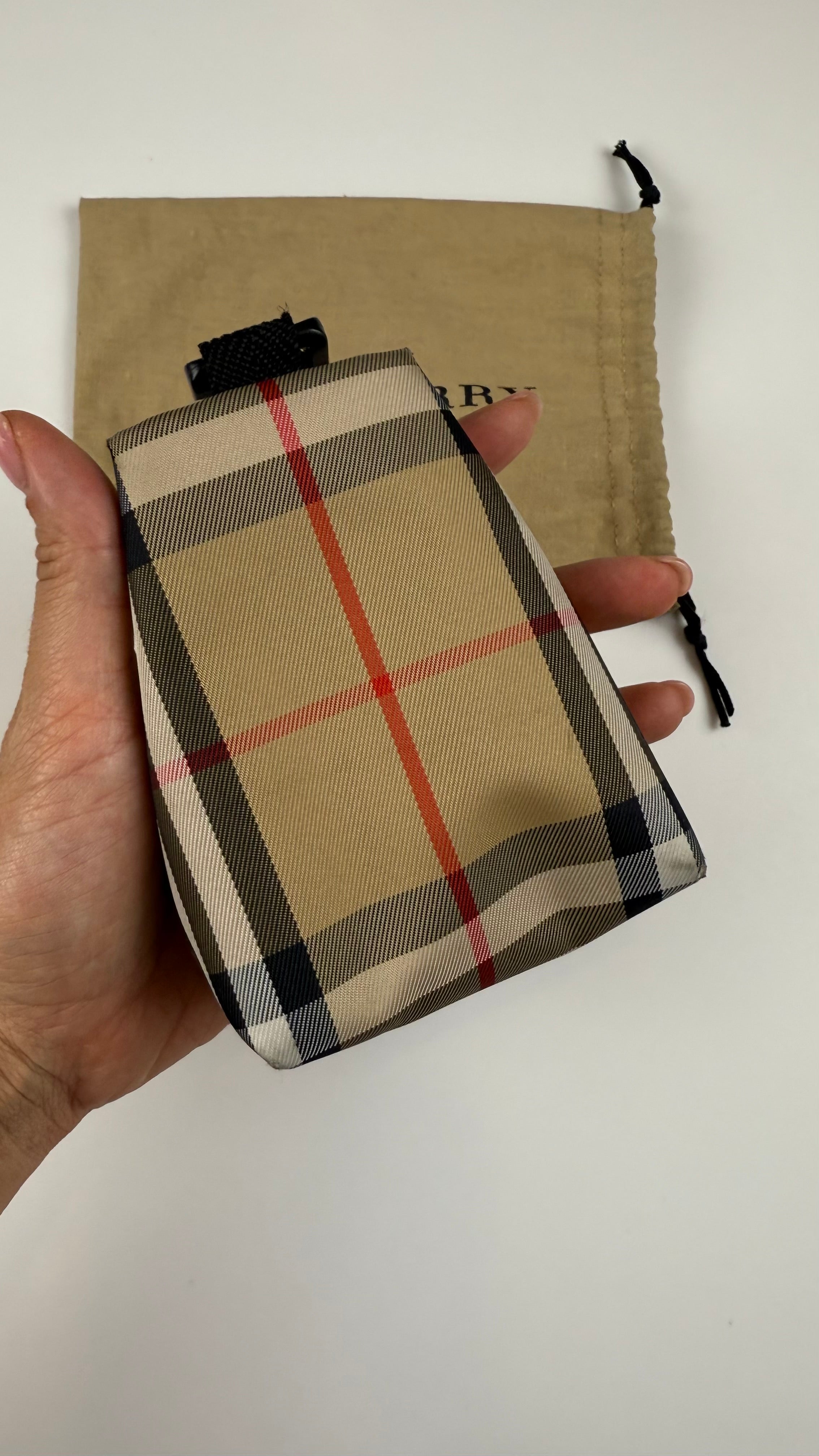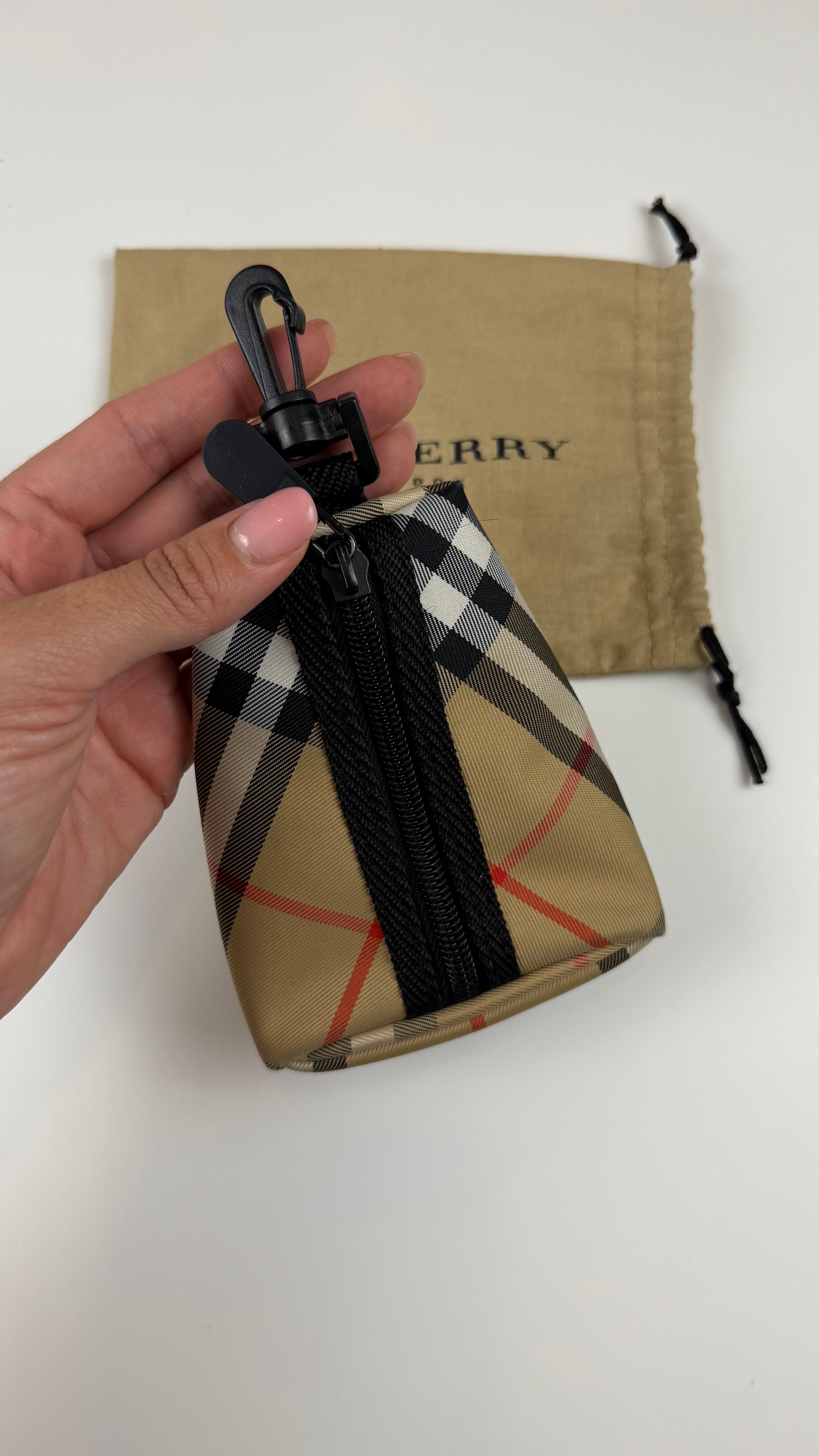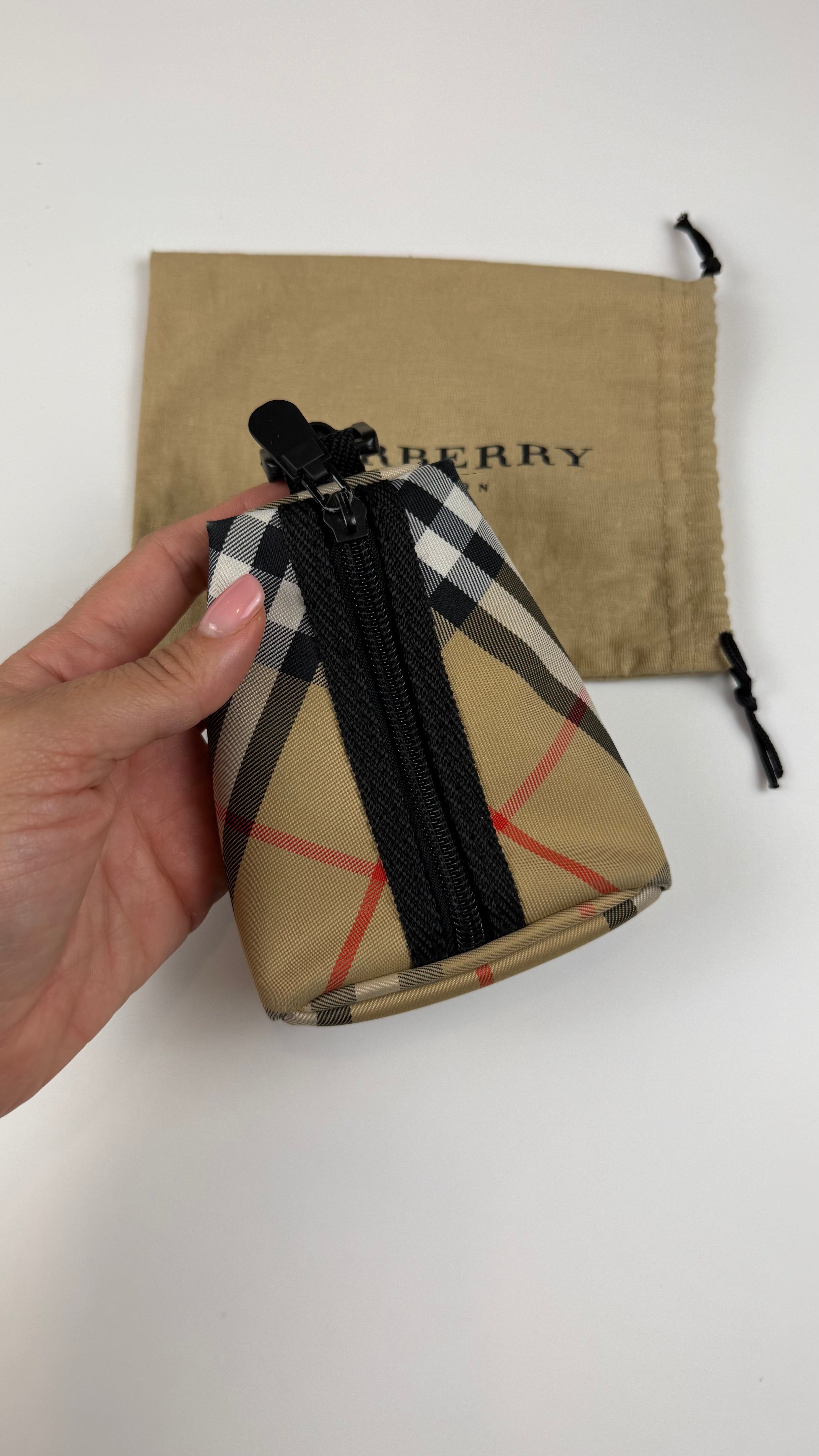 Este acessório da Burberry é um porta‑moedas ou mini estojo confeccionado em lona revestida com o icônico padrão xadrez “Vintage Check” da marca, em tons de bege, preto, branco e vermelho.