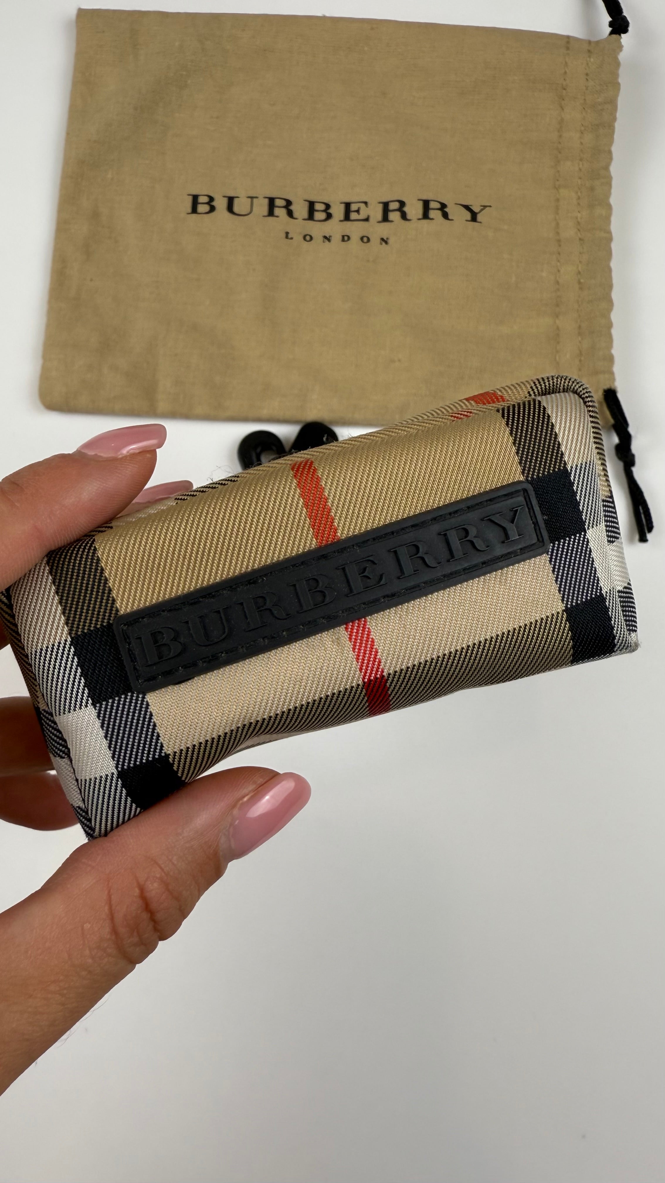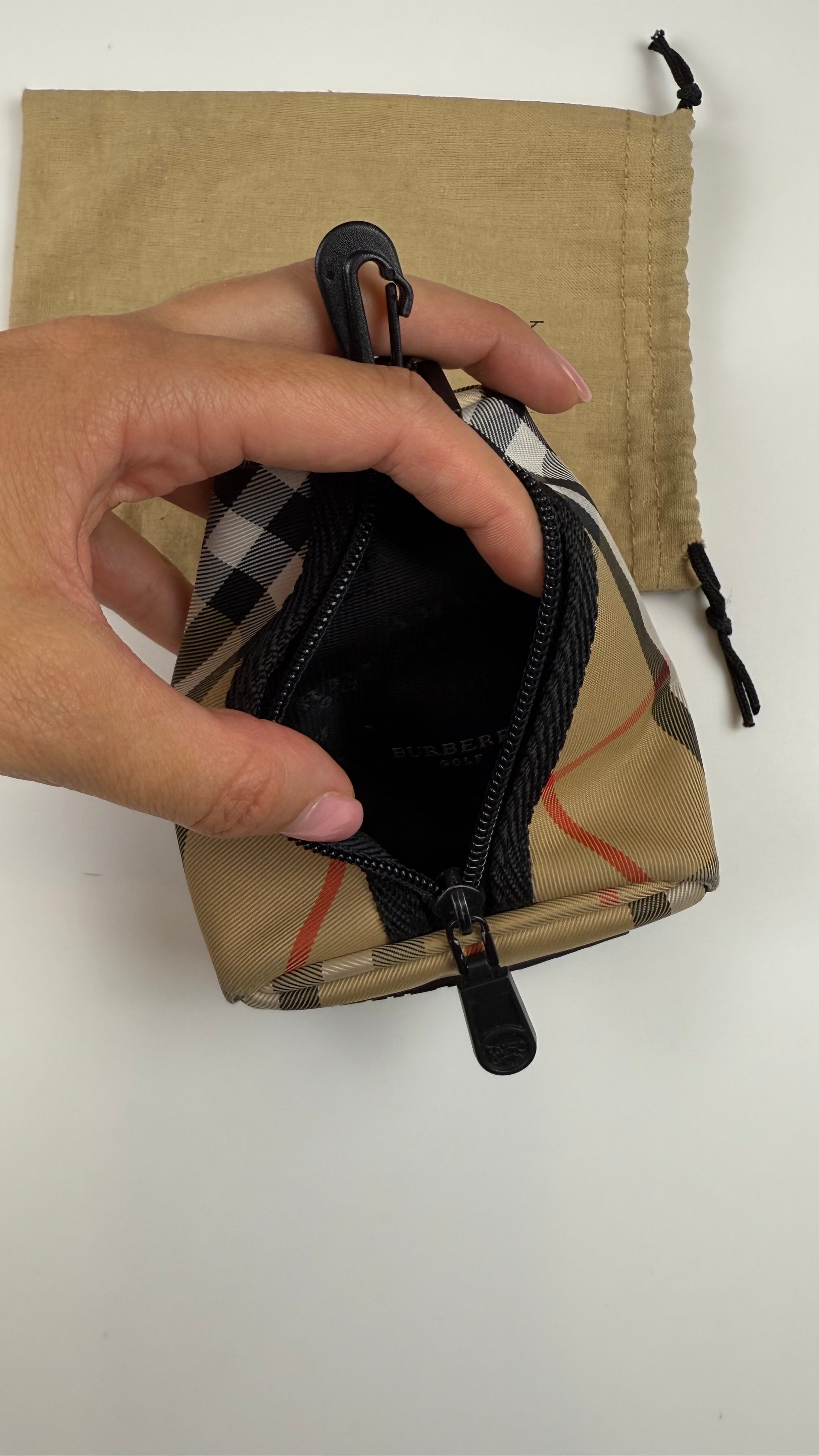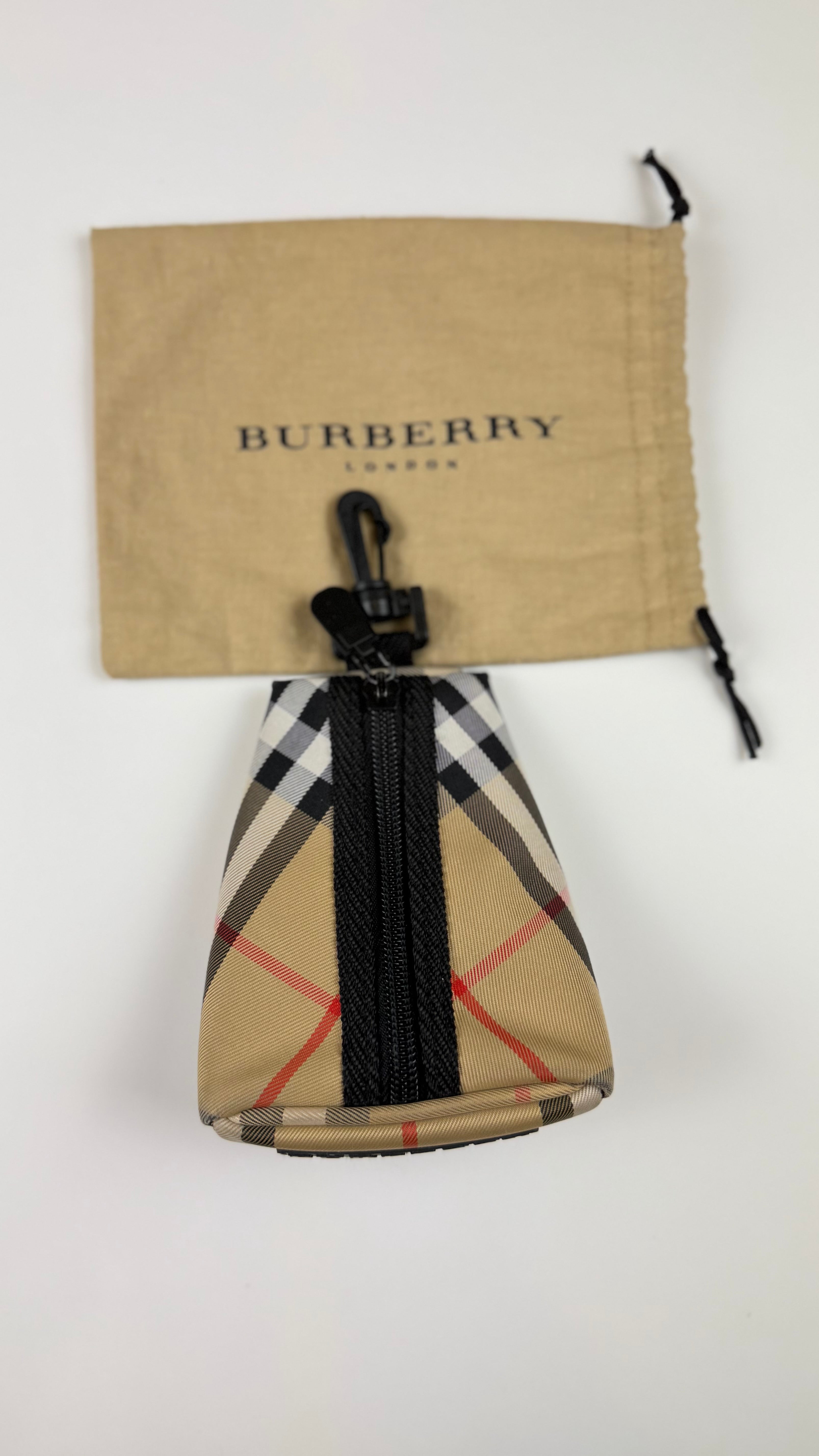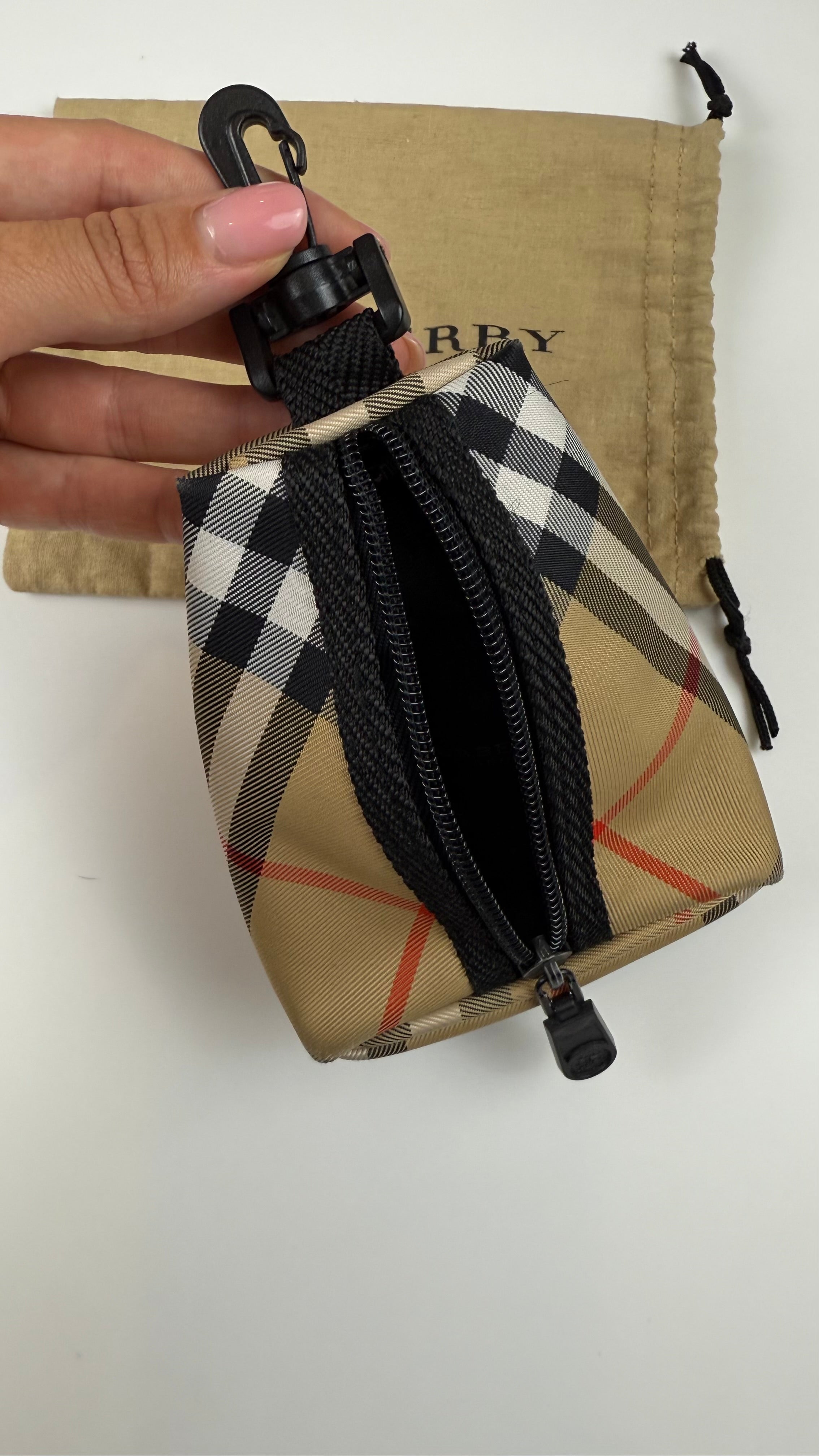 Este acessório da Burberry é um porta‑moedas ou mini estojo confeccionado em lona revestida com o icônico padrão xadrez “Vintage Check” da marca, em tons de bege, preto, branco e vermelho.