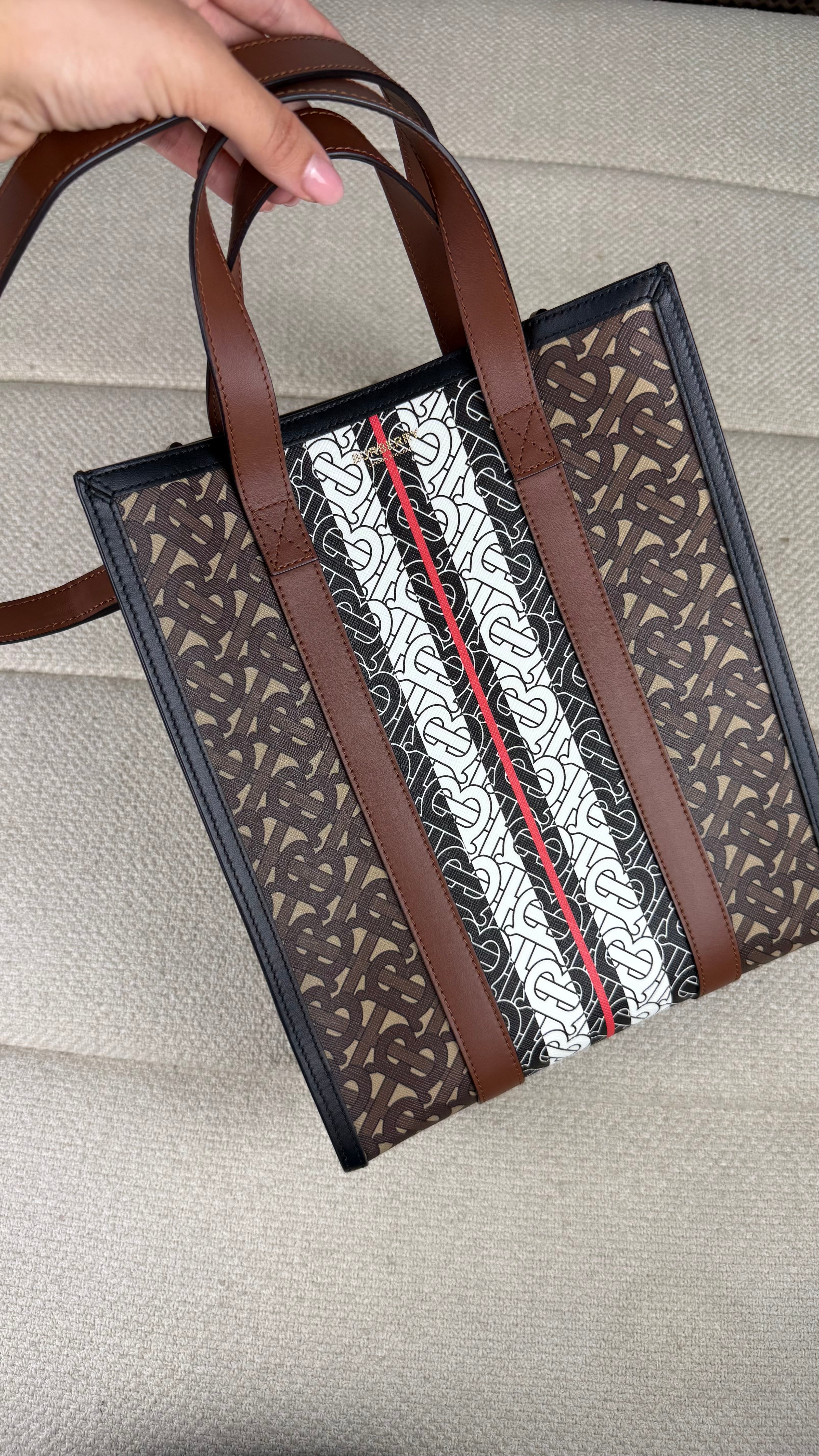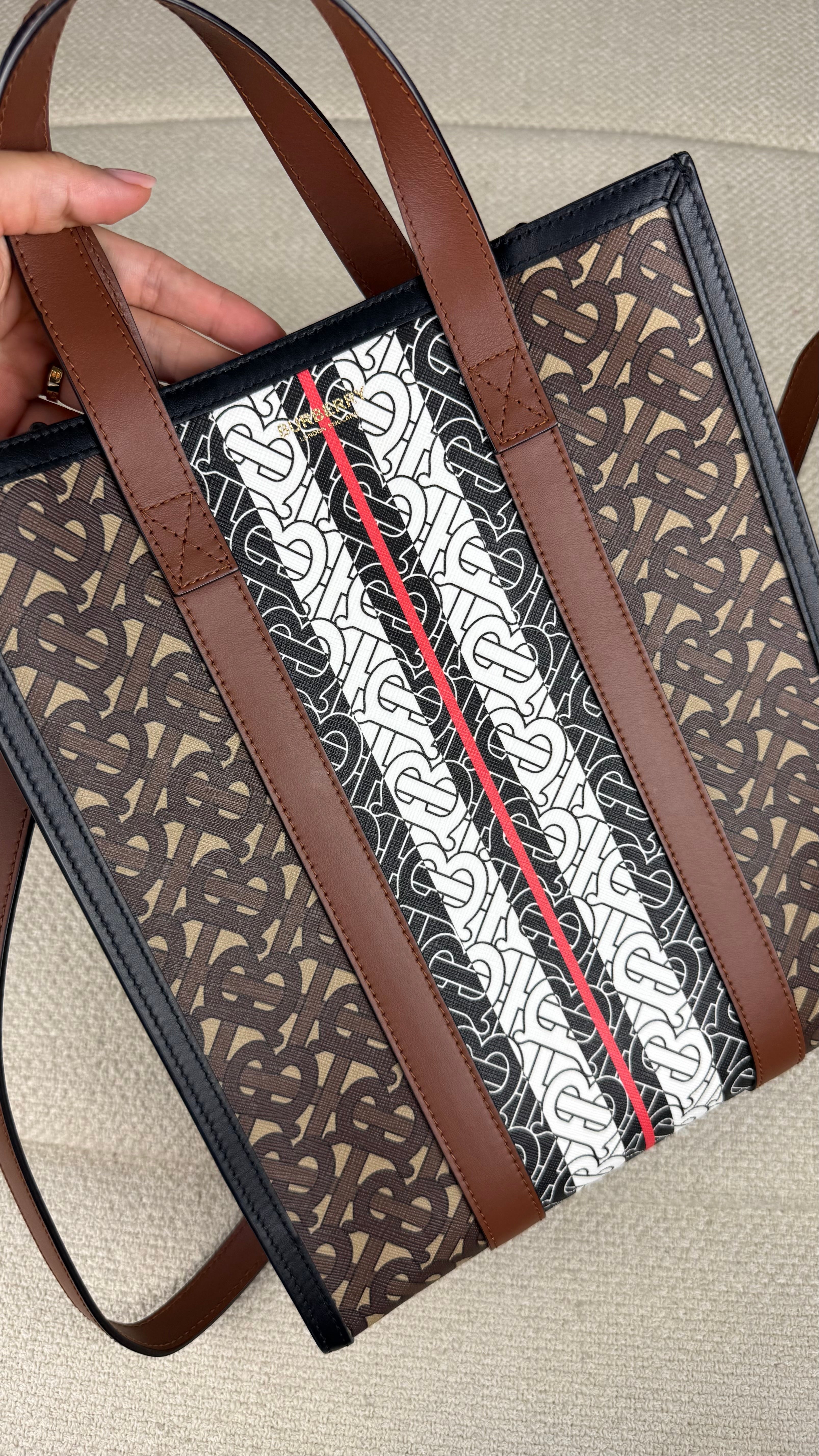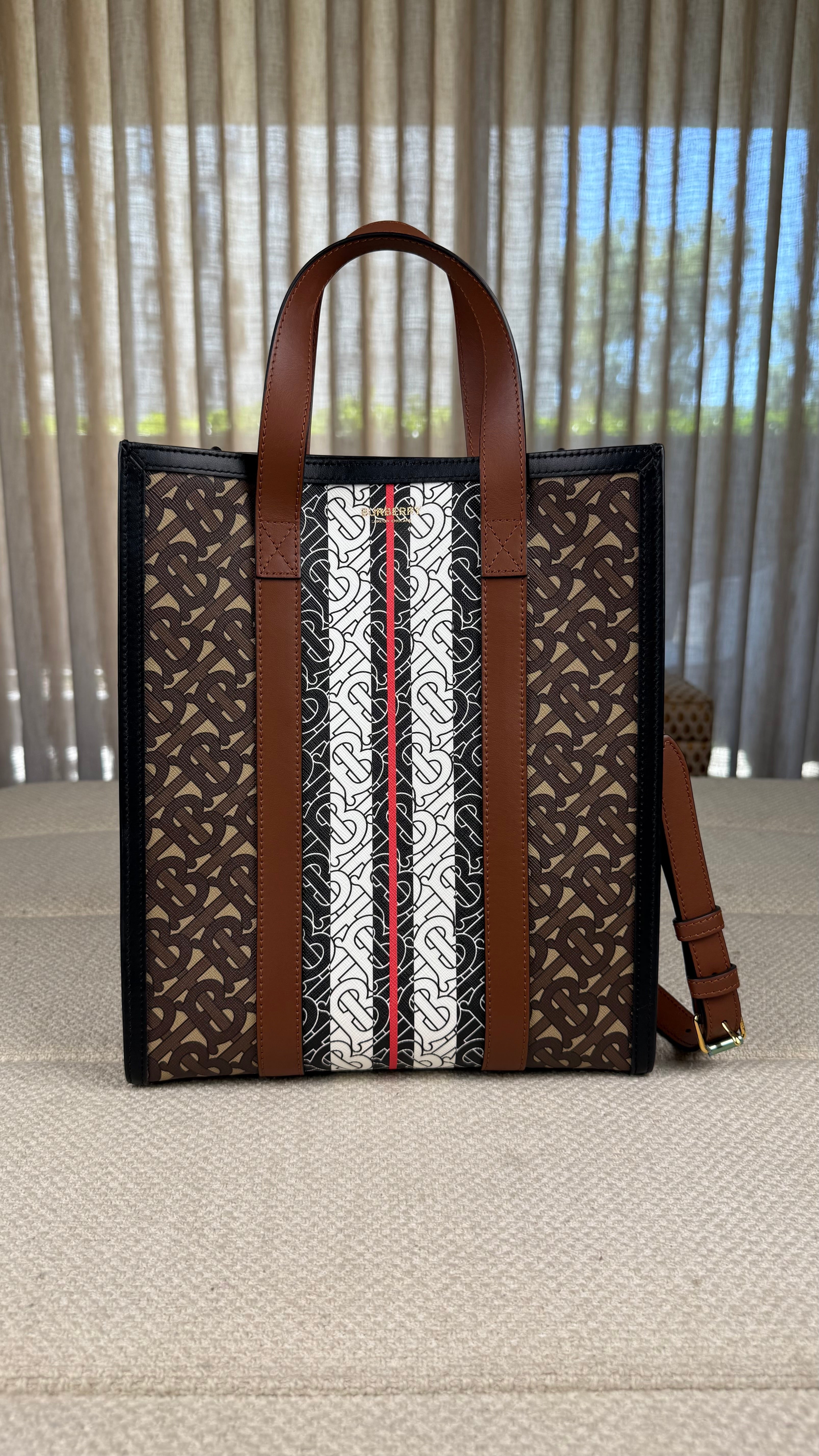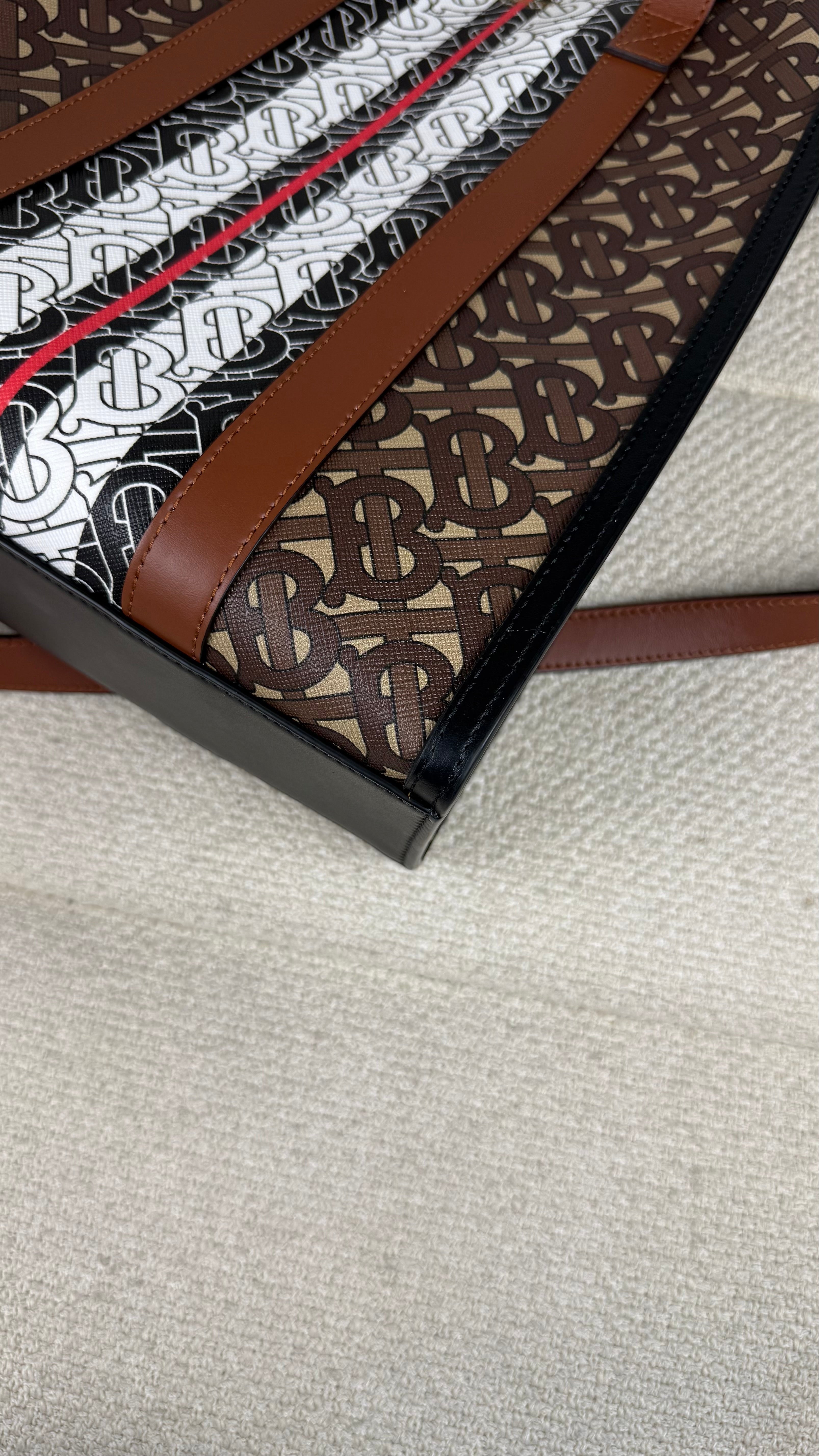 A Monogram Stripe Tote Bag da Burberry é um ícone moderno da marca britânica, combinando o clássico e o contemporâneo numa única peça. Estampada com o monograma TB (Thomas Burberry), este modelo celebra o legado da casa com um toque gráfico arrojado, desenhado sob a direção criativa de Riccardo Tisci.