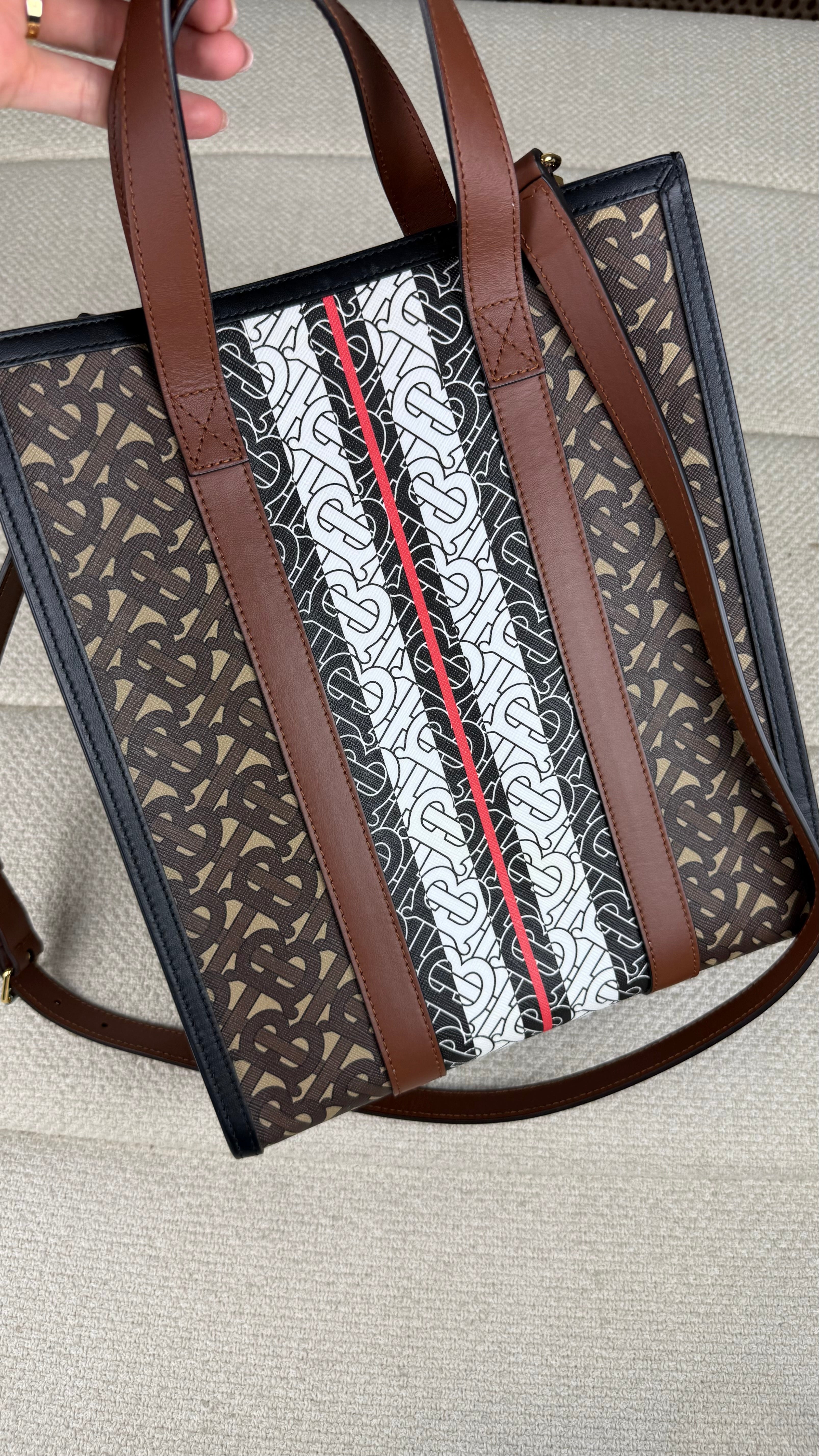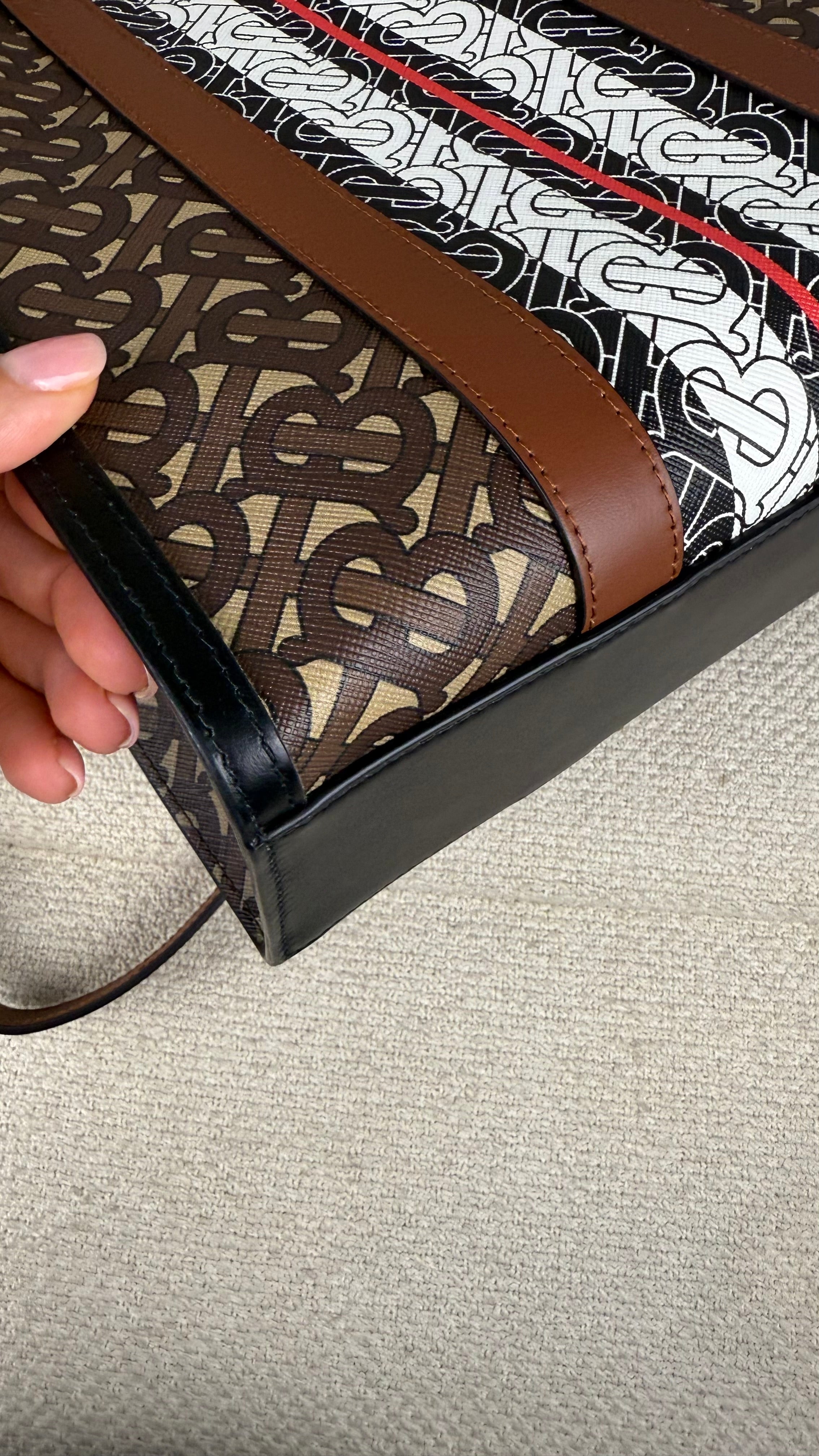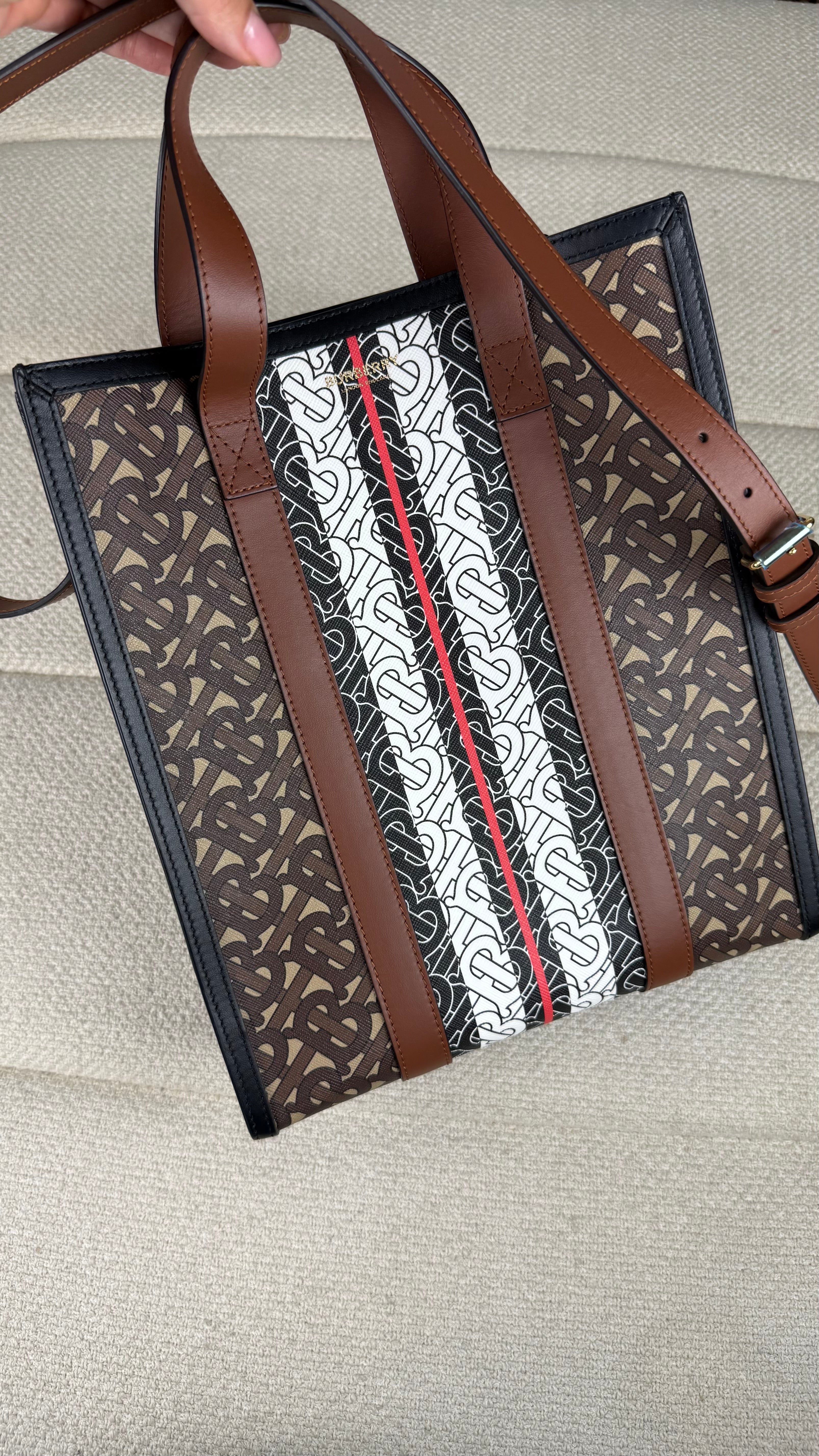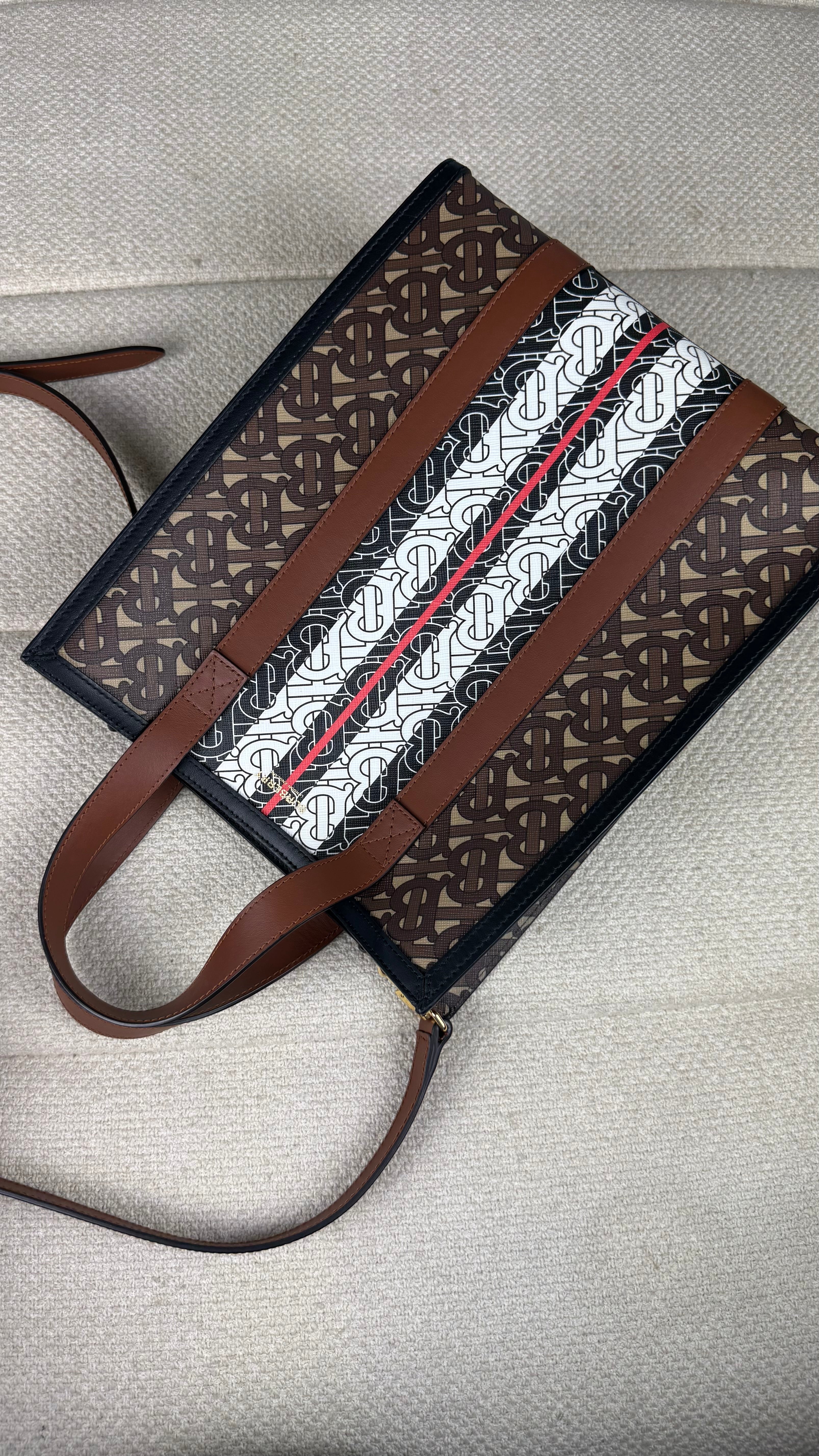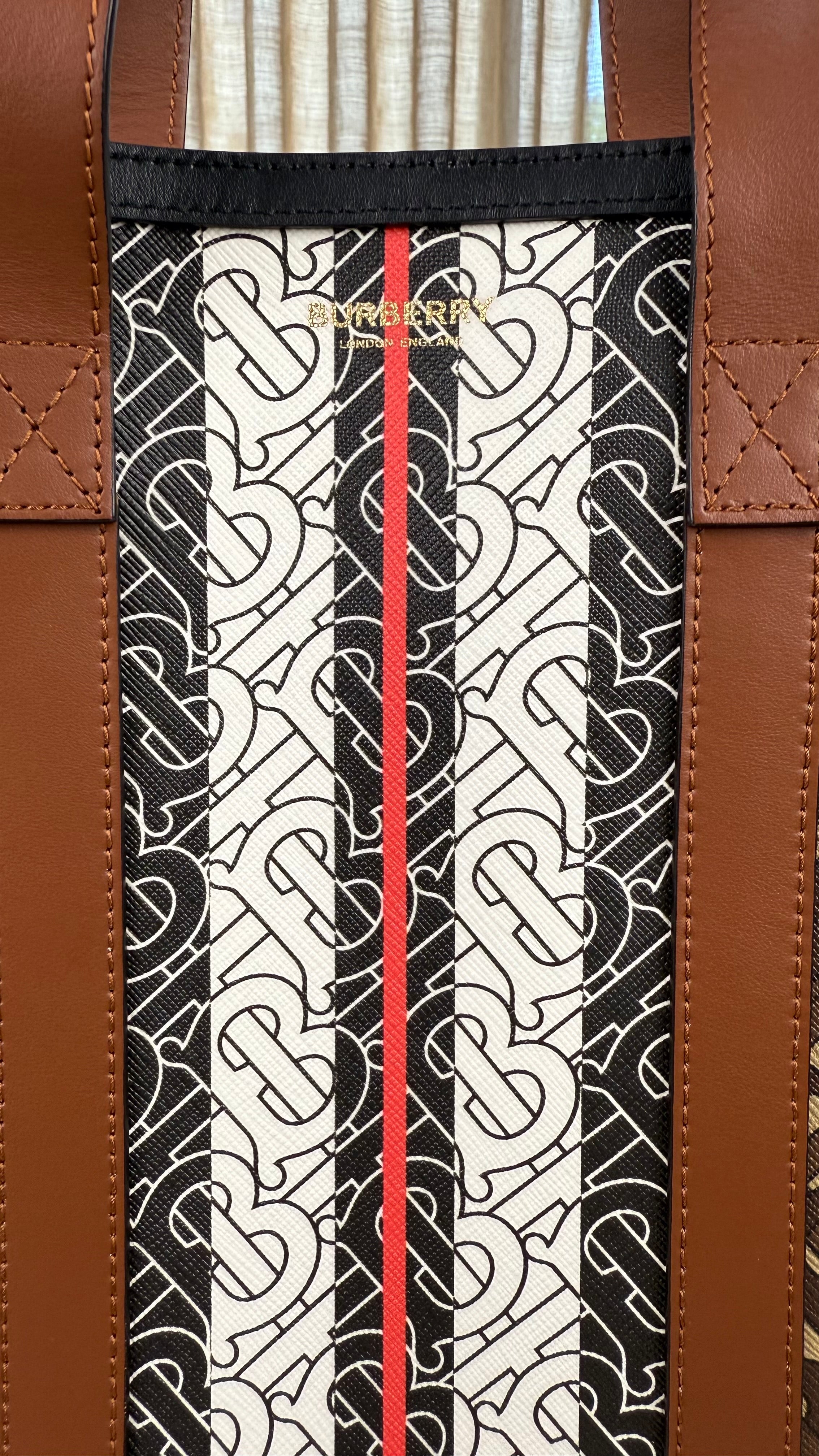 A Monogram Stripe Tote Bag da Burberry é um ícone moderno da marca britânica, combinando o clássico e o contemporâneo numa única peça. Estampada com o monograma TB (Thomas Burberry), este modelo celebra o legado da casa com um toque gráfico arrojado, desenhado sob a direção criativa de Riccardo Tisci.