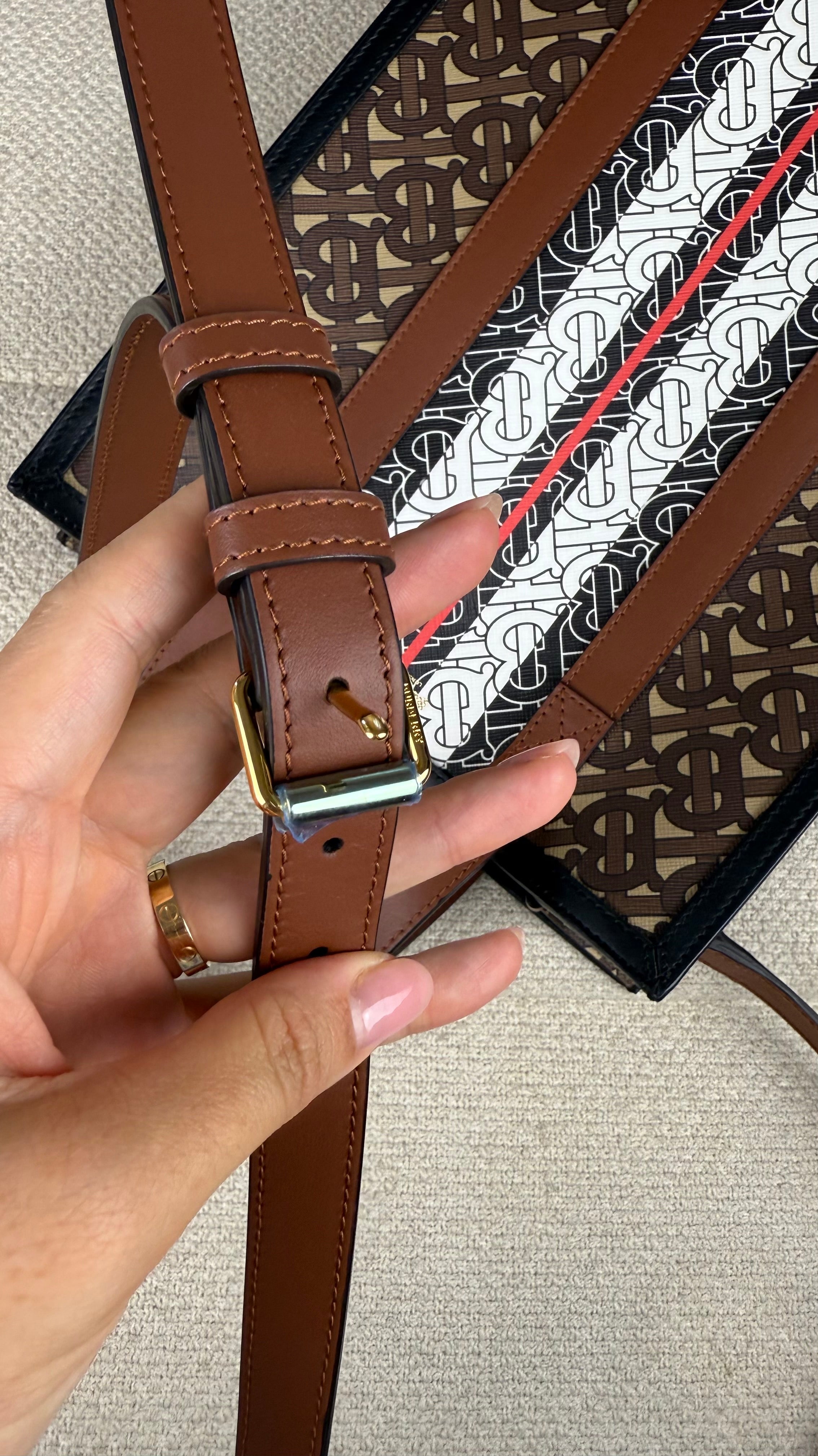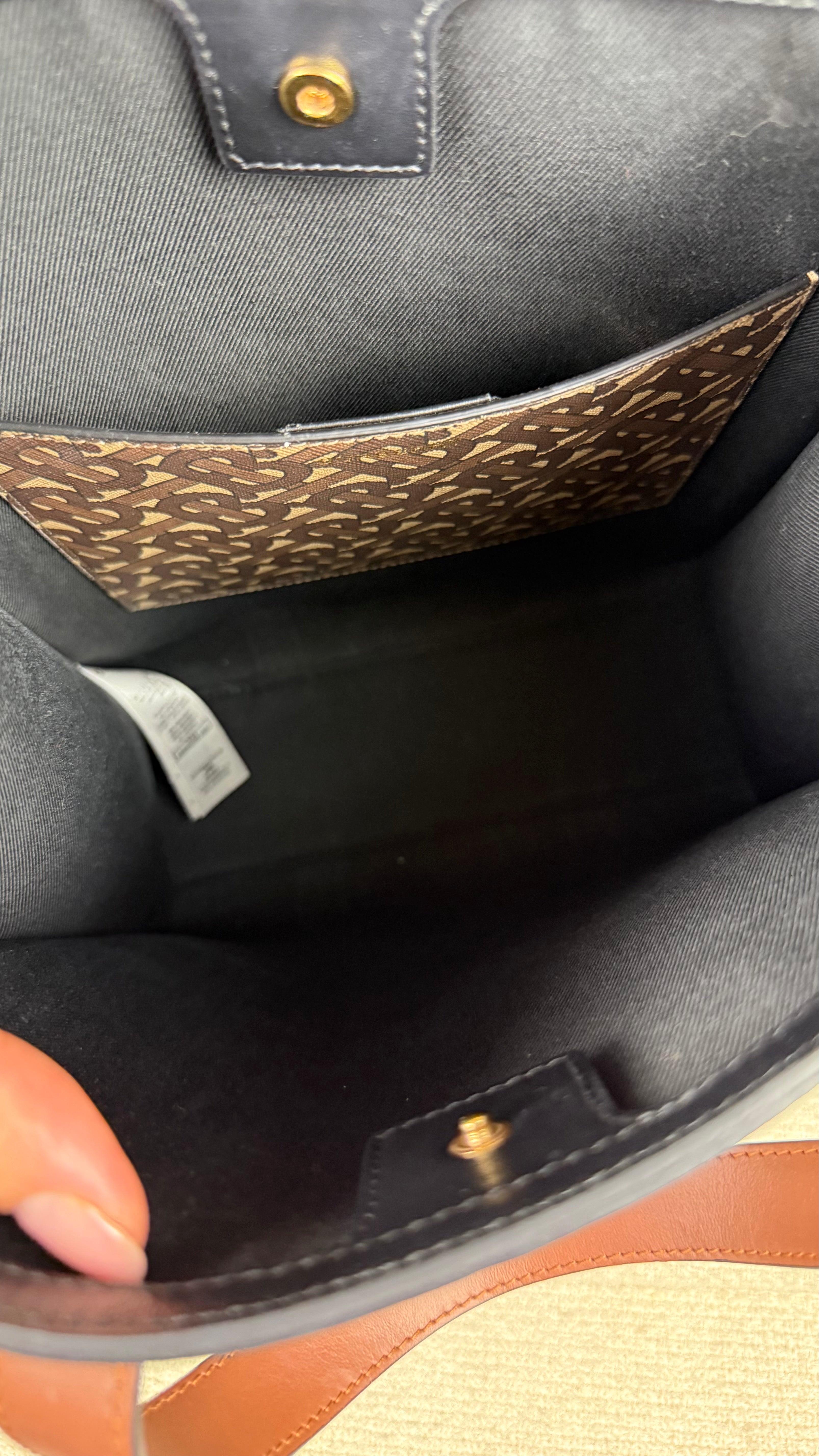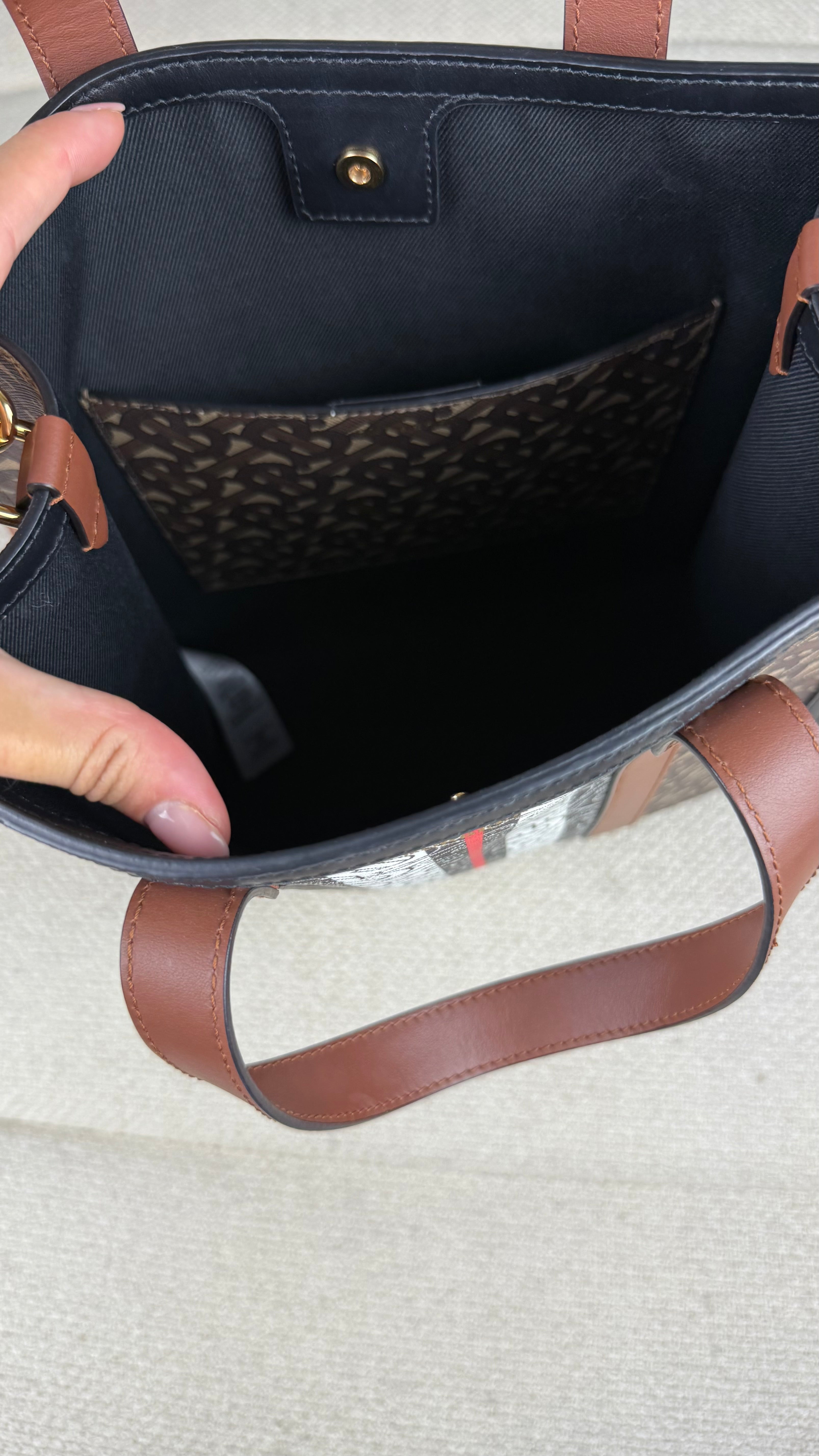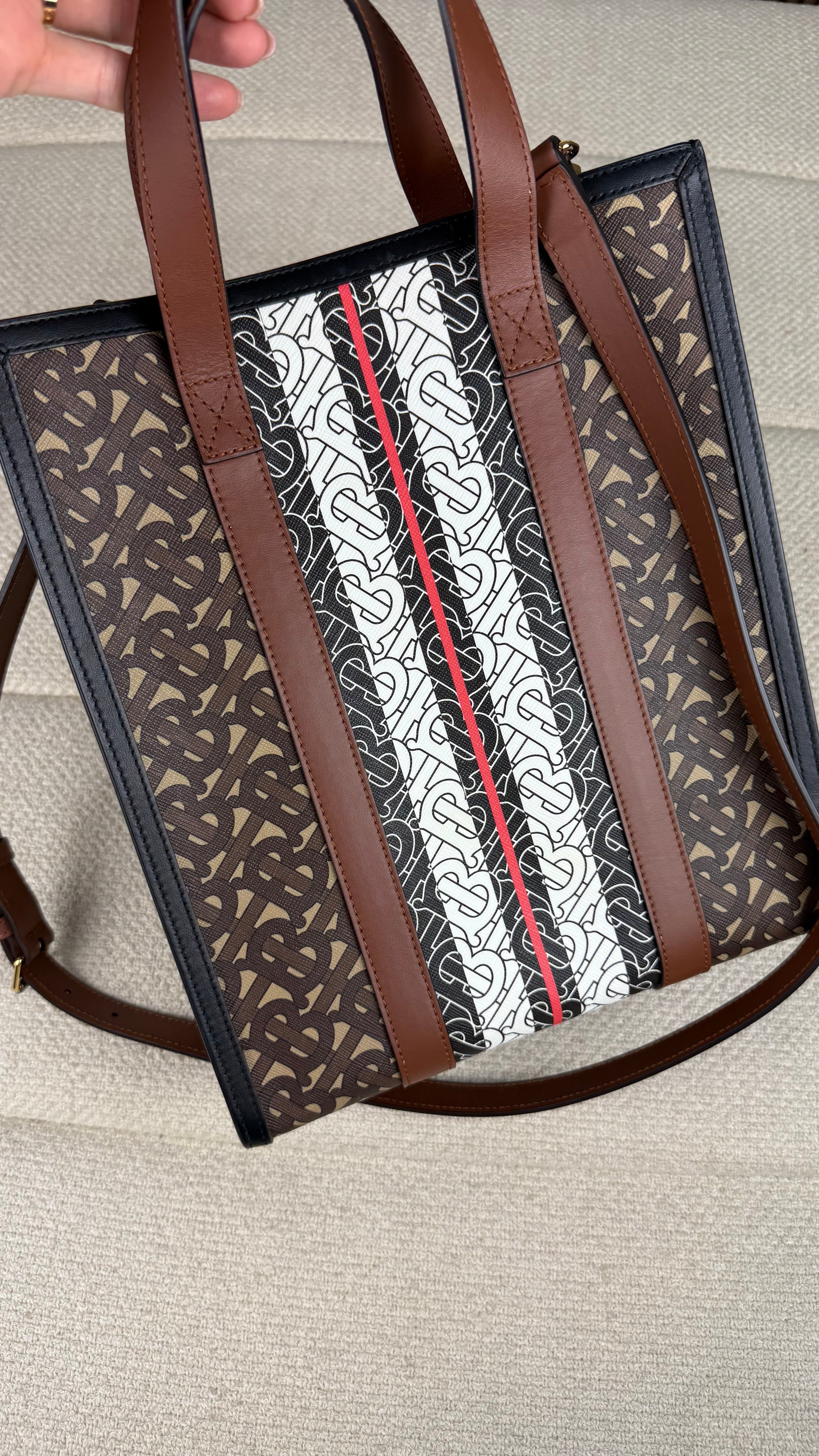 A Monogram Stripe Tote Bag da Burberry é um ícone moderno da marca britânica, combinando o clássico e o contemporâneo numa única peça. Estampada com o monograma TB (Thomas Burberry), este modelo celebra o legado da casa com um toque gráfico arrojado, desenhado sob a direção criativa de Riccardo Tisci.