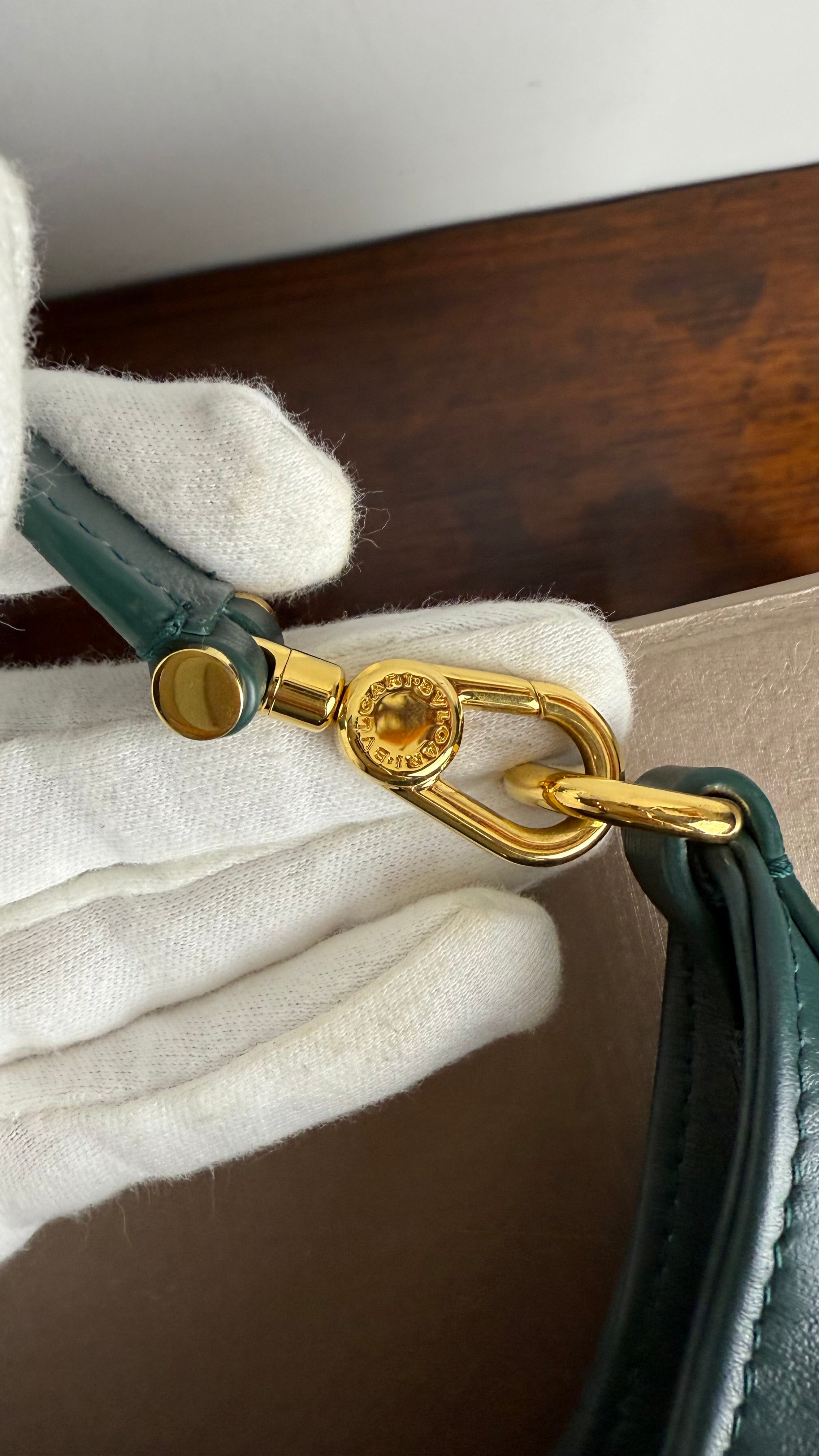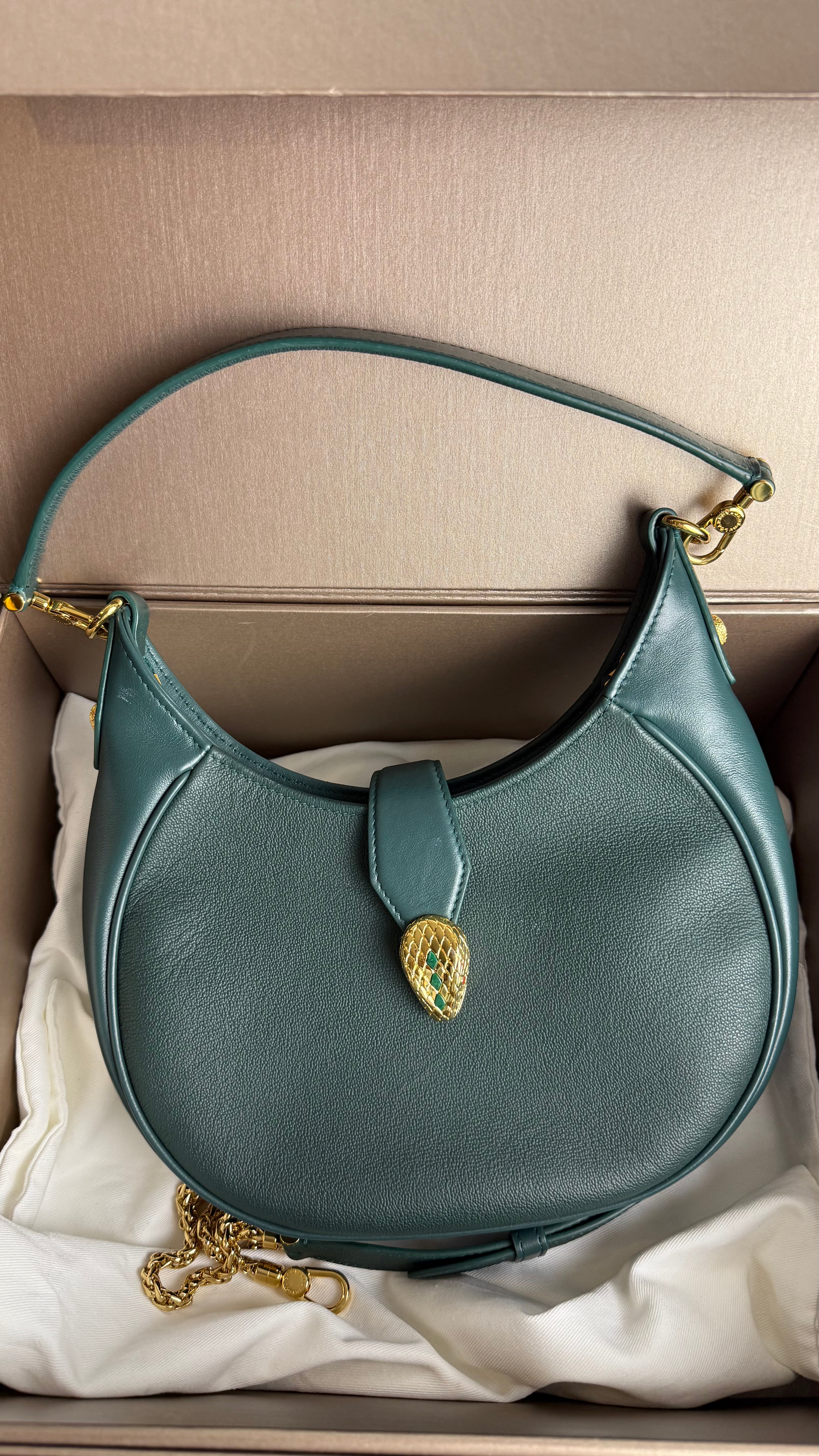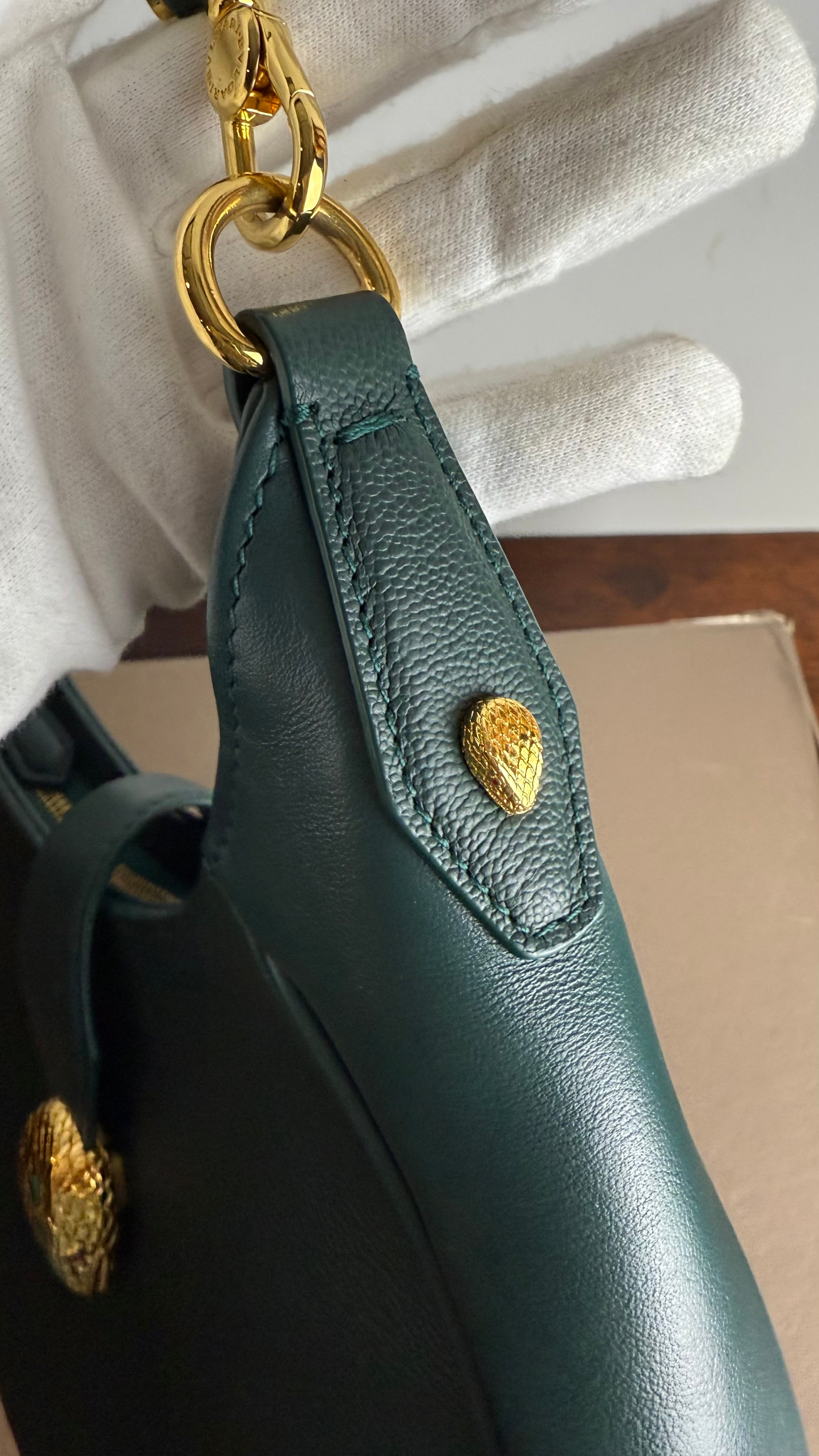 A icónica Bvlgari Serpenti combina luxo e sofisticação em cada detalhe. Confeccionada em pele de alta qualidade na cor verde escura, apresenta o emblemático fecho em forma de cabeça de serpente esmaltada com acabamento dourado, símbolo de elegância intemporal da Maison.