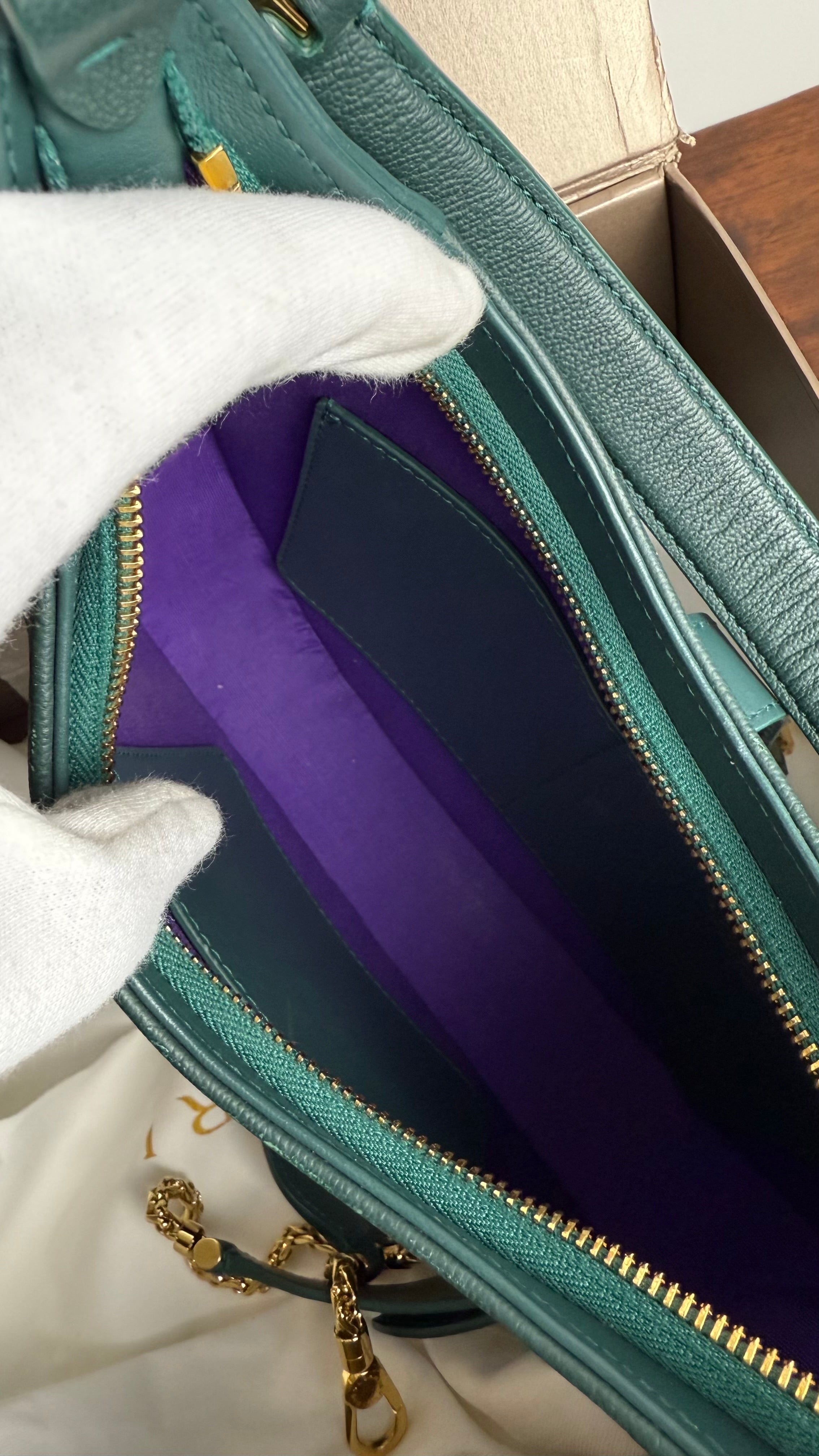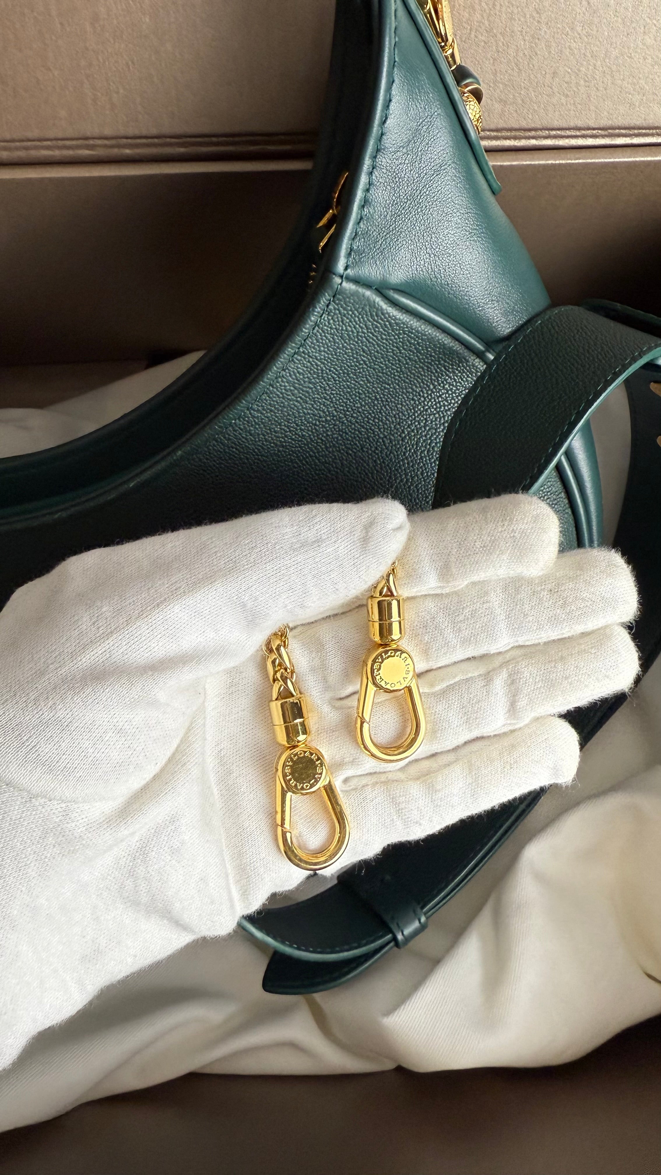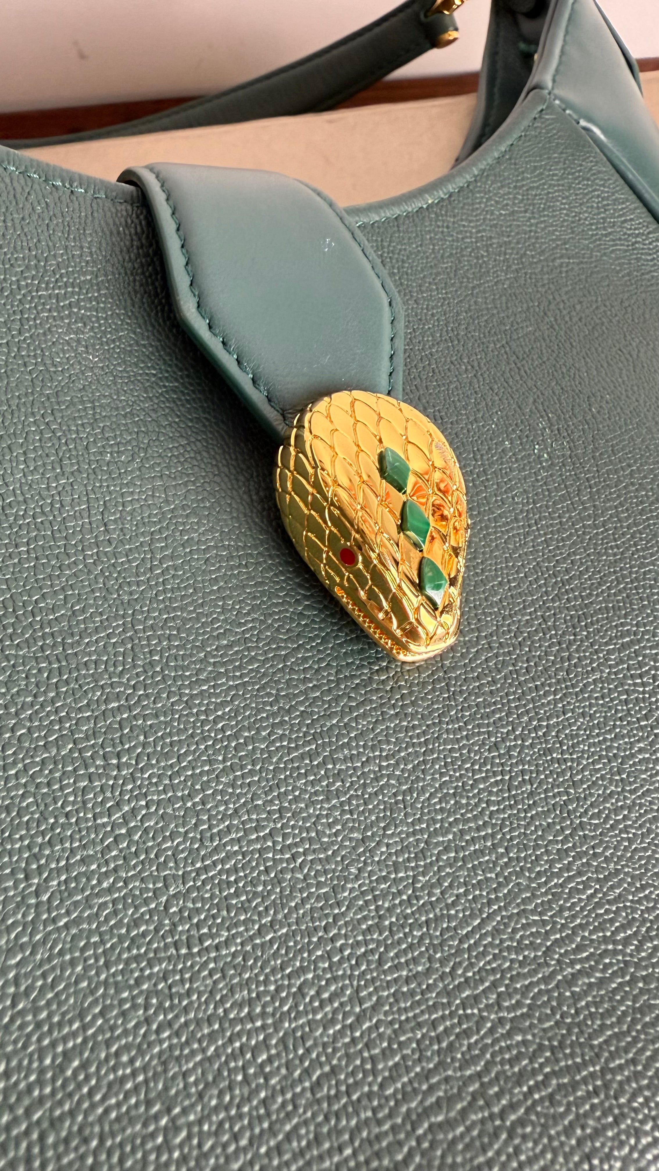 A icónica Bvlgari Serpenti combina luxo e sofisticação em cada detalhe. Confeccionada em pele de alta qualidade na cor verde escura, apresenta o emblemático fecho em forma de cabeça de serpente esmaltada com acabamento dourado, símbolo de elegância intemporal da Maison.