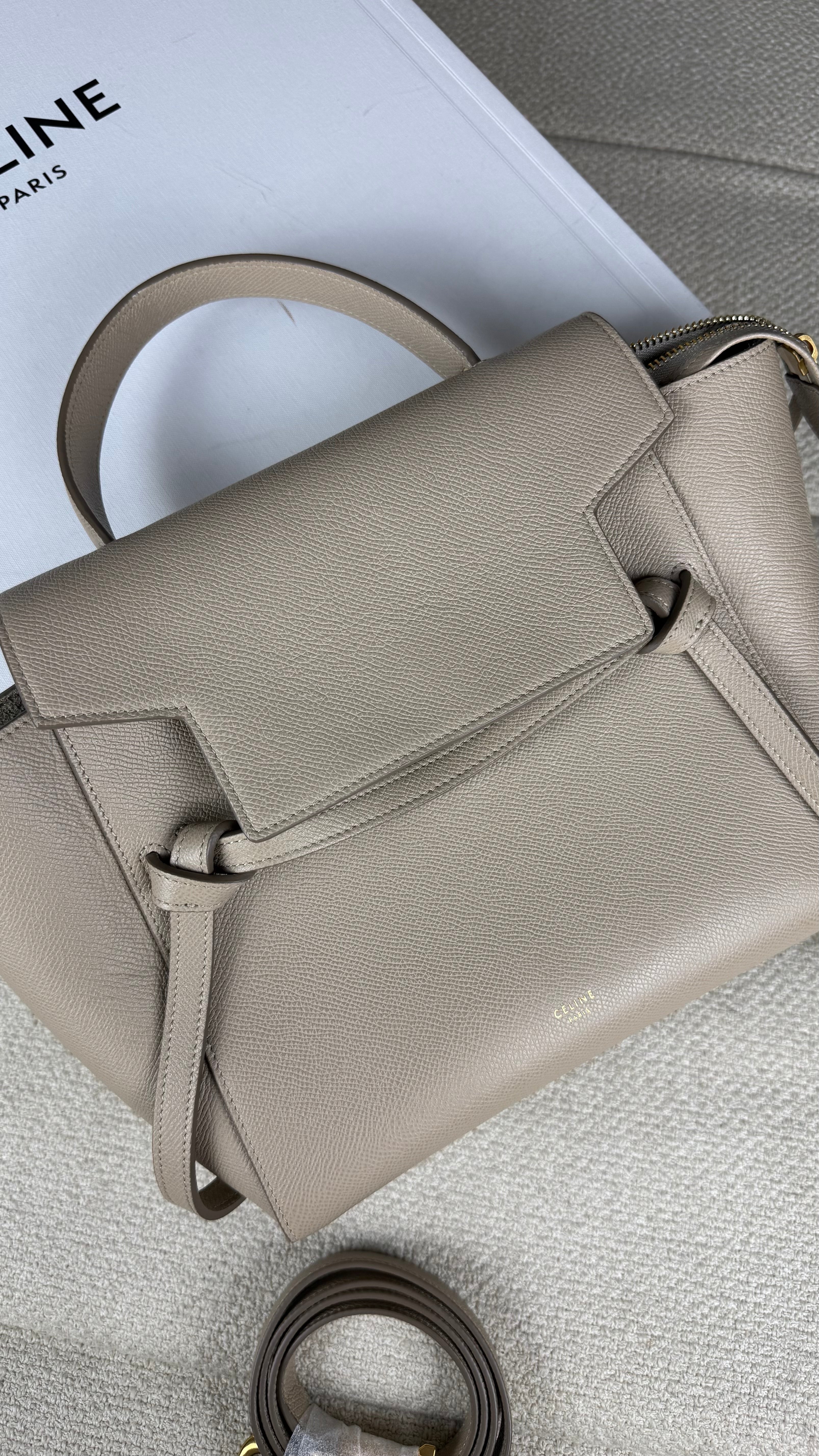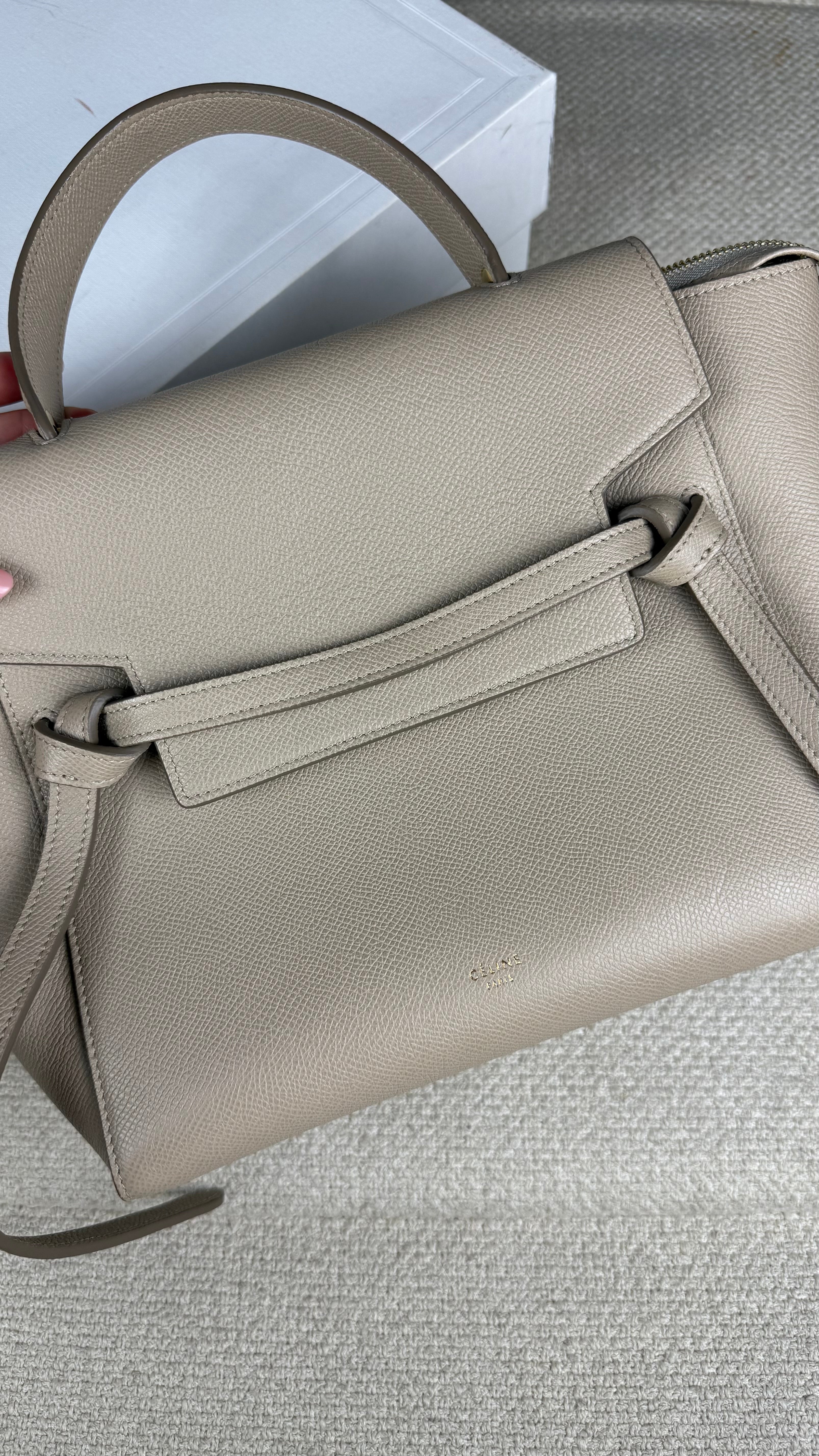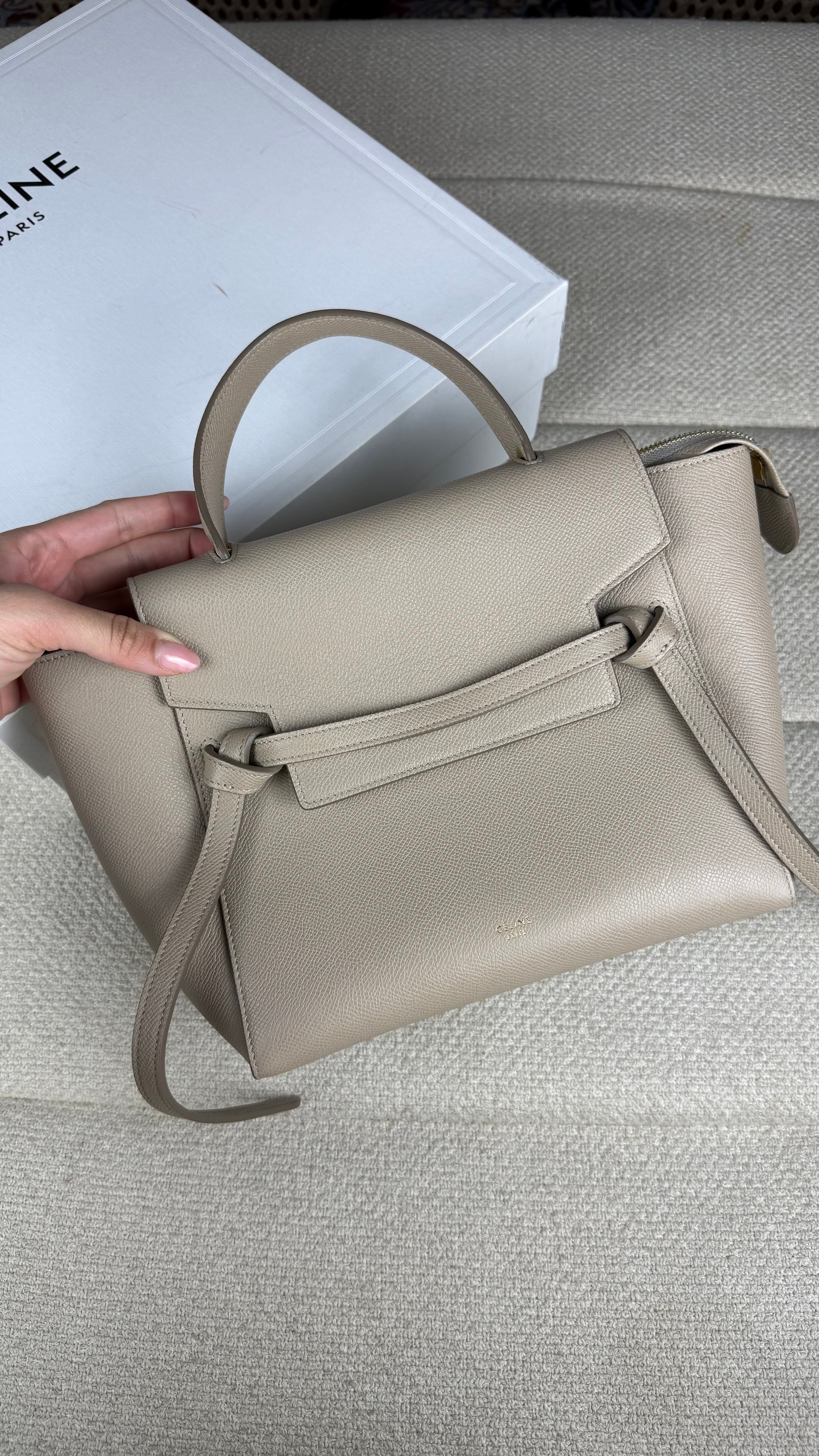 A Celine Micro Belt Bag representa o equilíbrio perfeito entre sofisticação e design minimalista — um ícone intemporal da maison francesa. Fabricada em pele granulada de alta qualidade, distingue-se pelas linhas estruturadas e pelo emblemático detalhe do “cinto” na parte frontal, símbolo da elegância discreta da Celine.