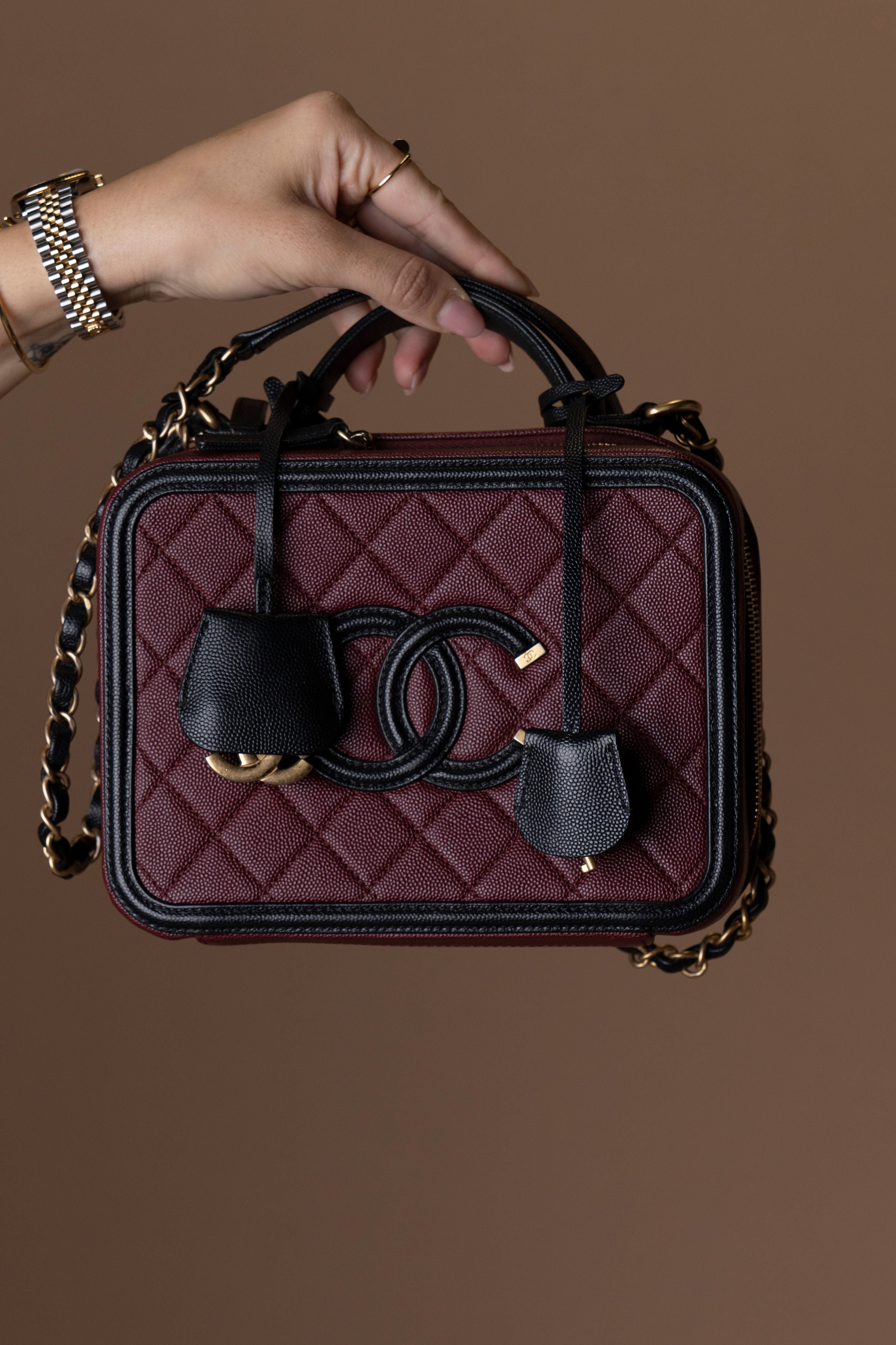 A Chanel Filigree Vanity Case Medium é uma das criações mais icônicas e desejadas da maison francesa. Inspirada nas clássicas malas de maquiagem vintage da Chanel, esta peça combina design estruturado e elegância atemporal em um formato moderno e funcional.