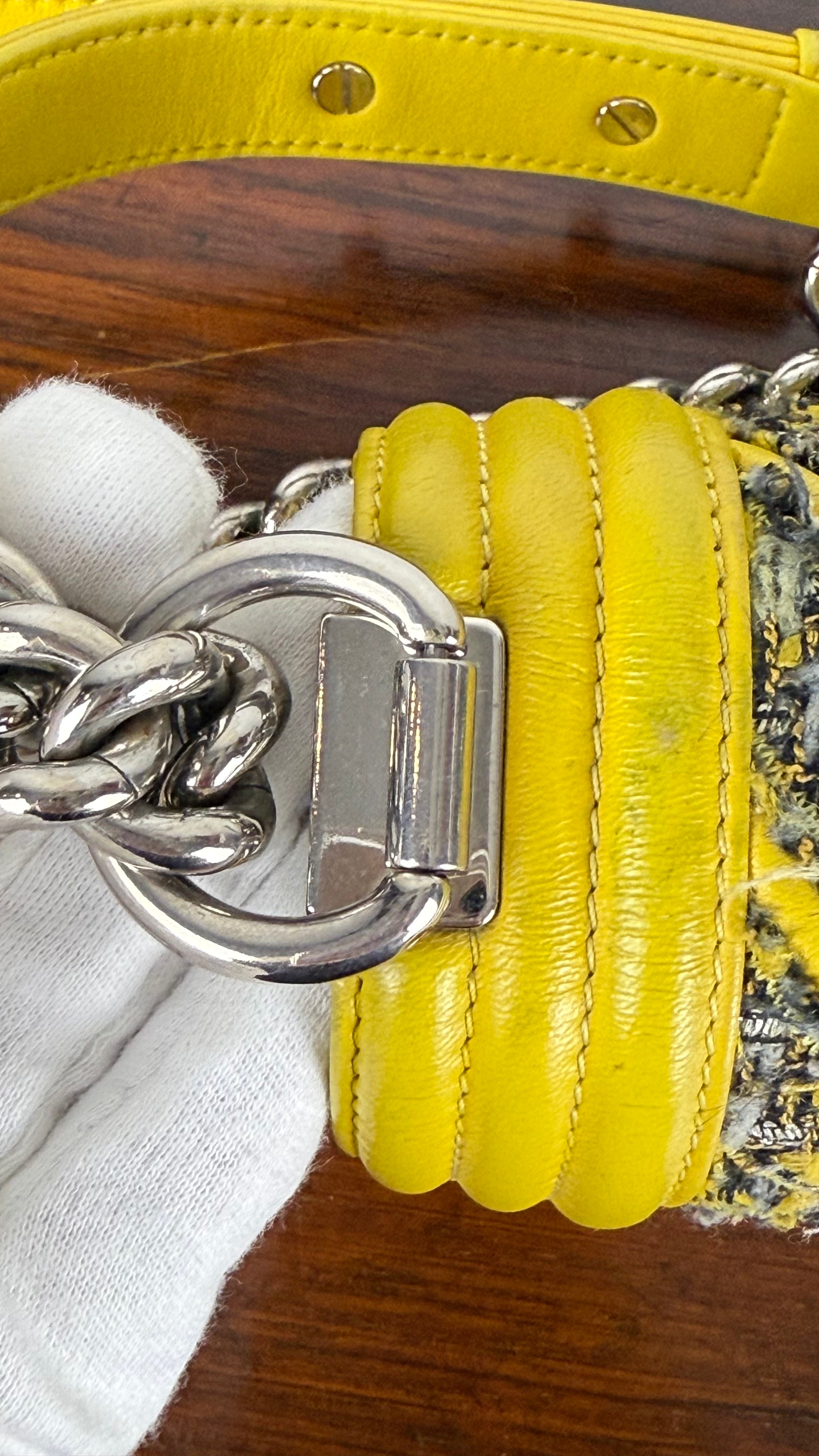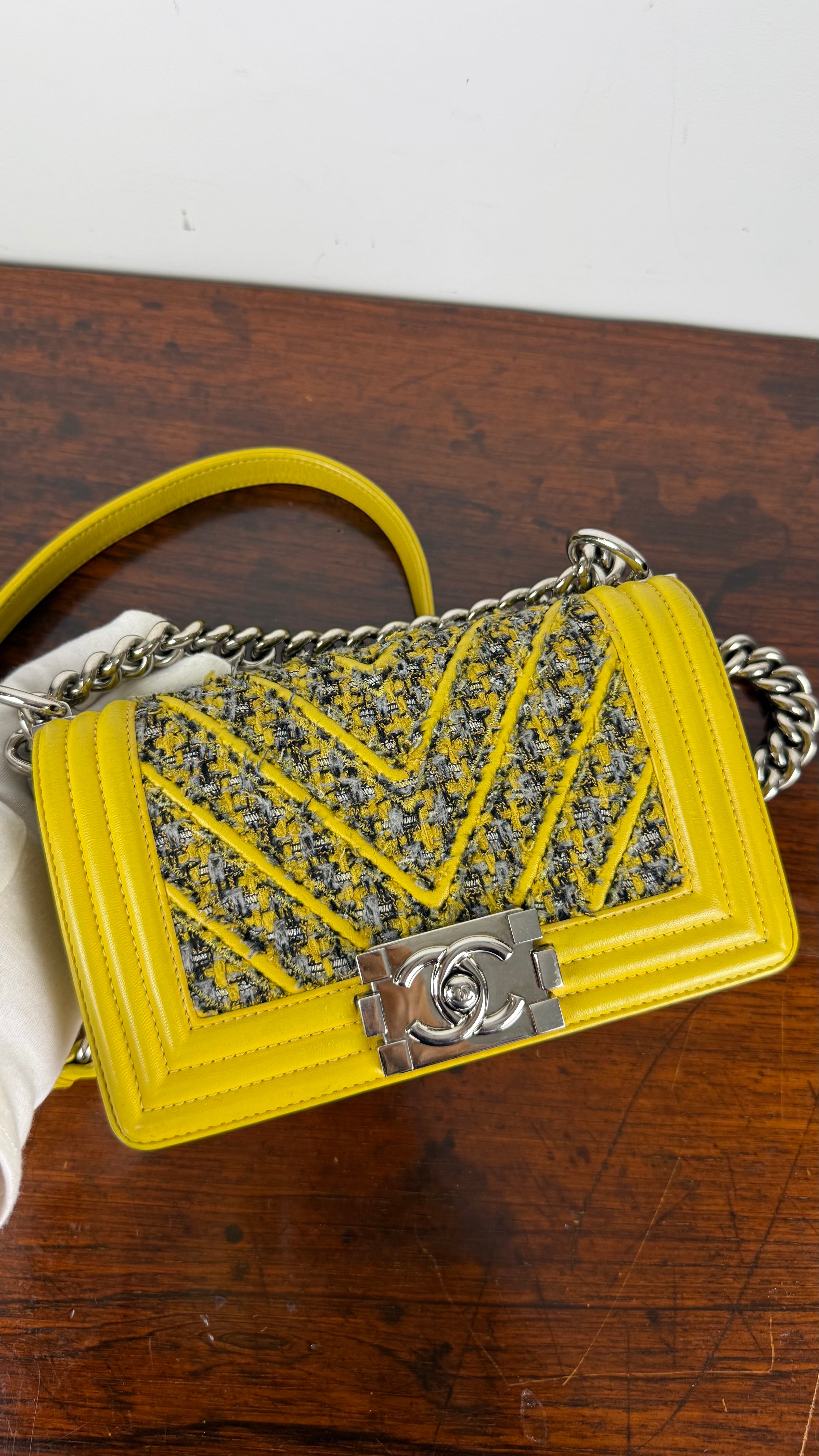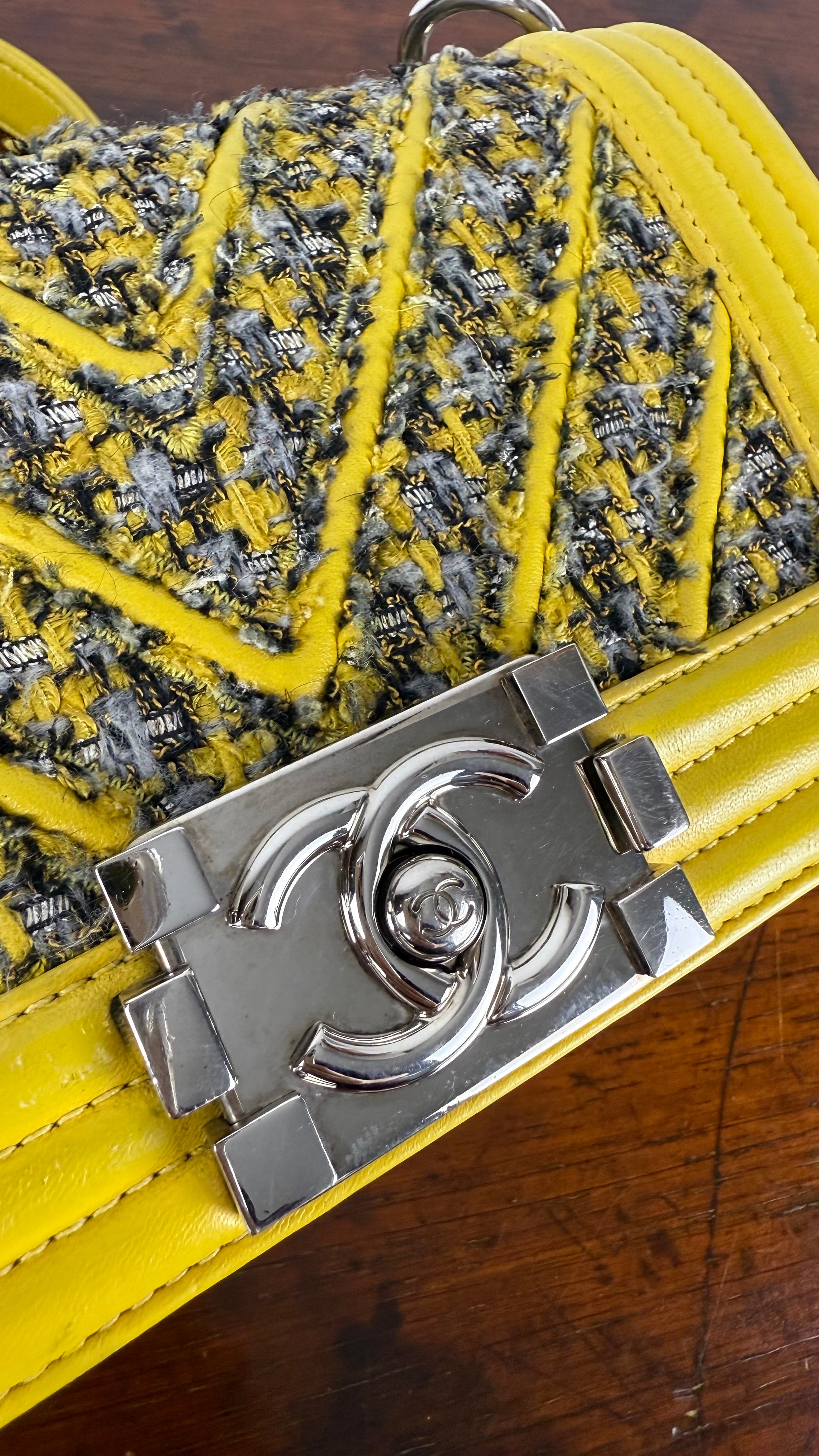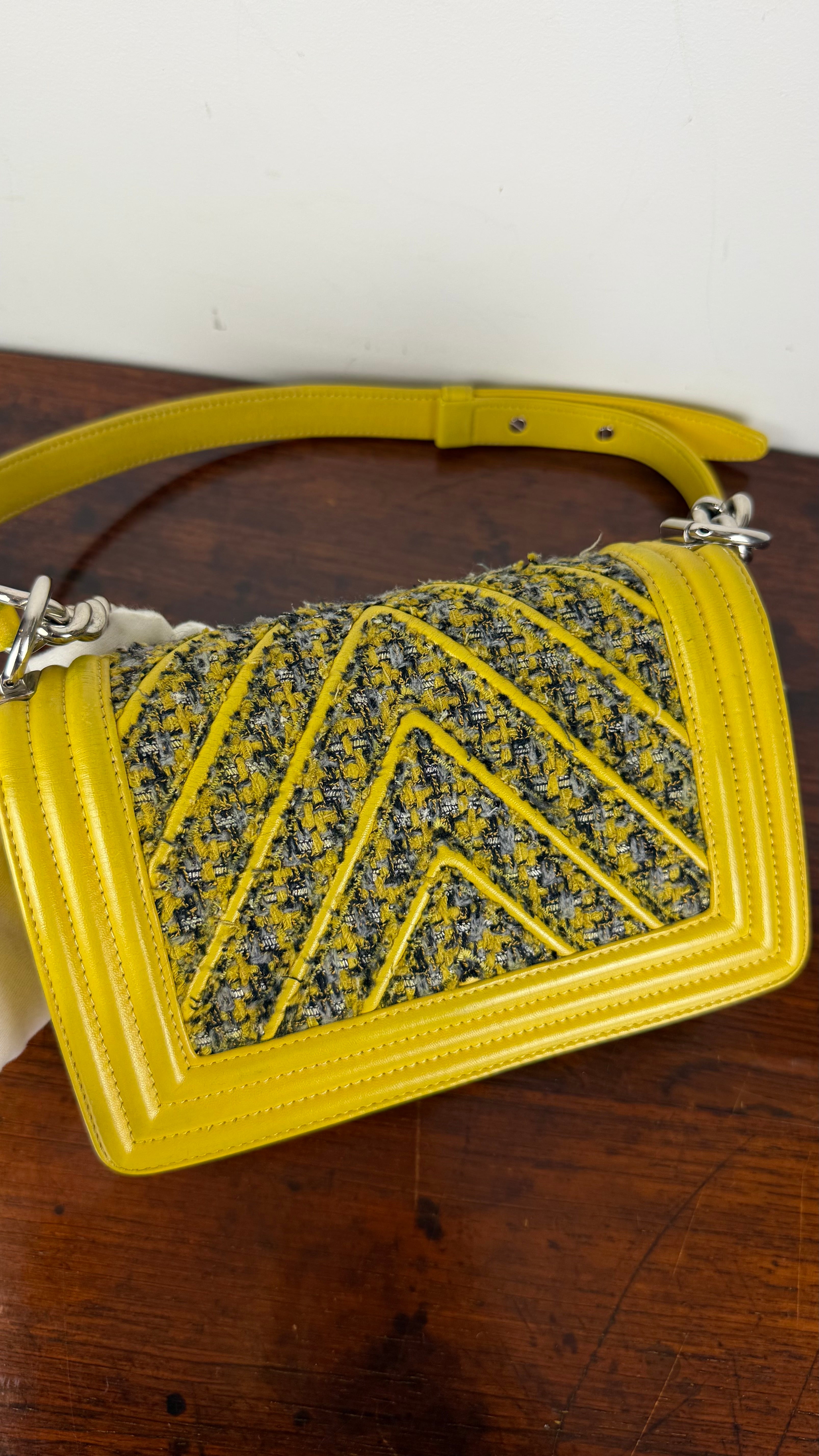 - MaterialTweed em padrão Chevron com detalhes em couro amarelo