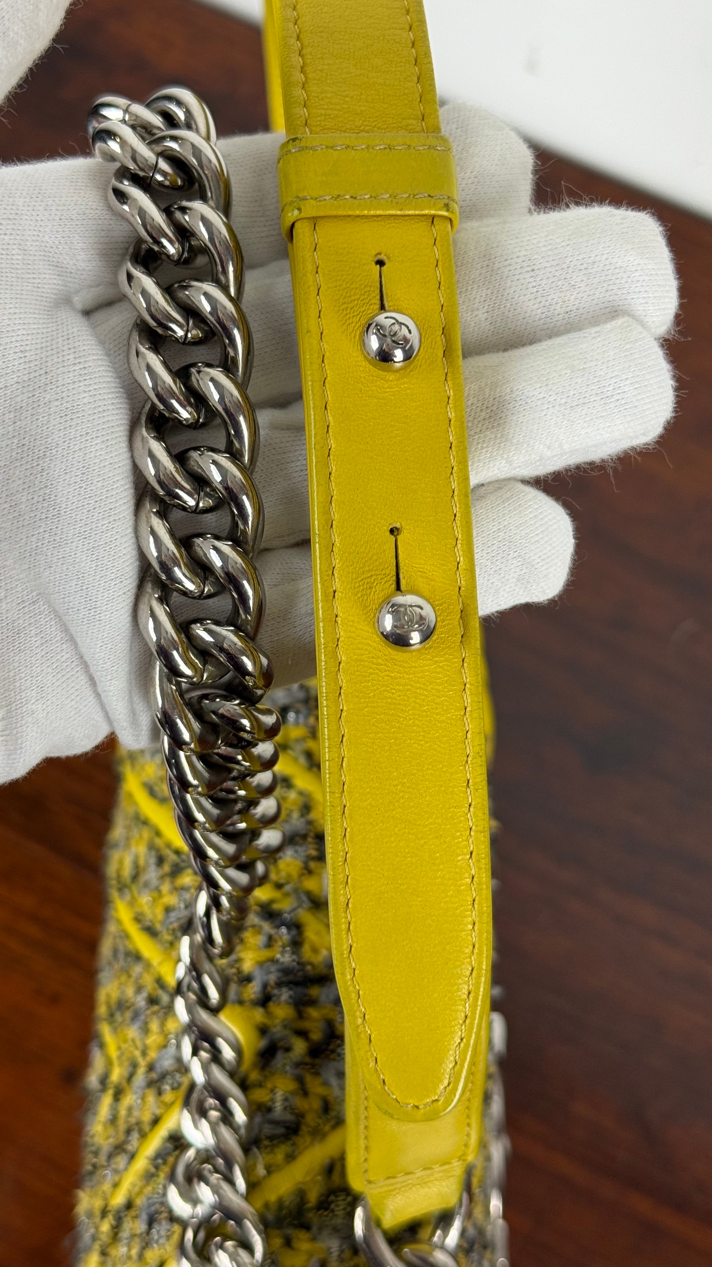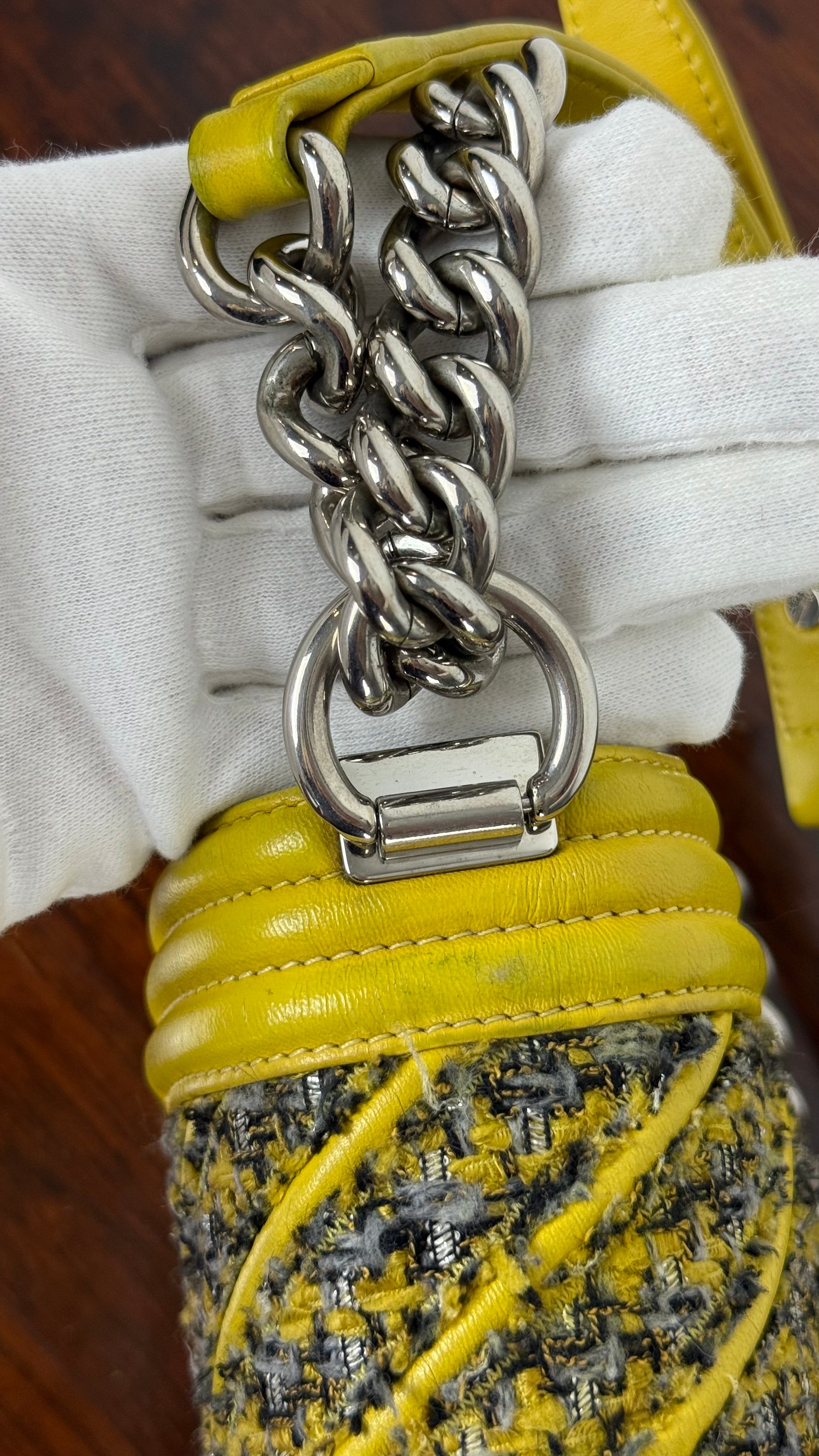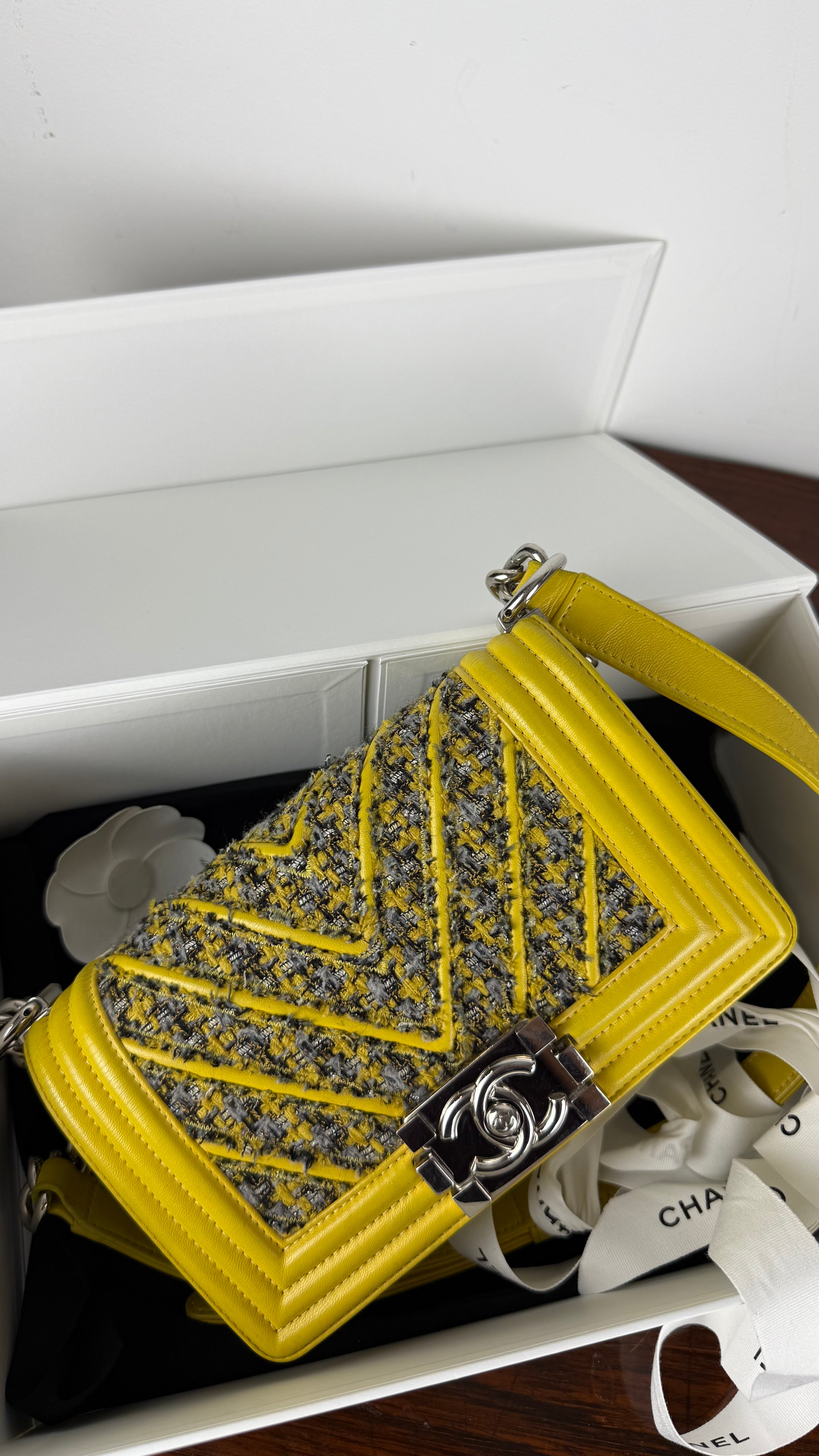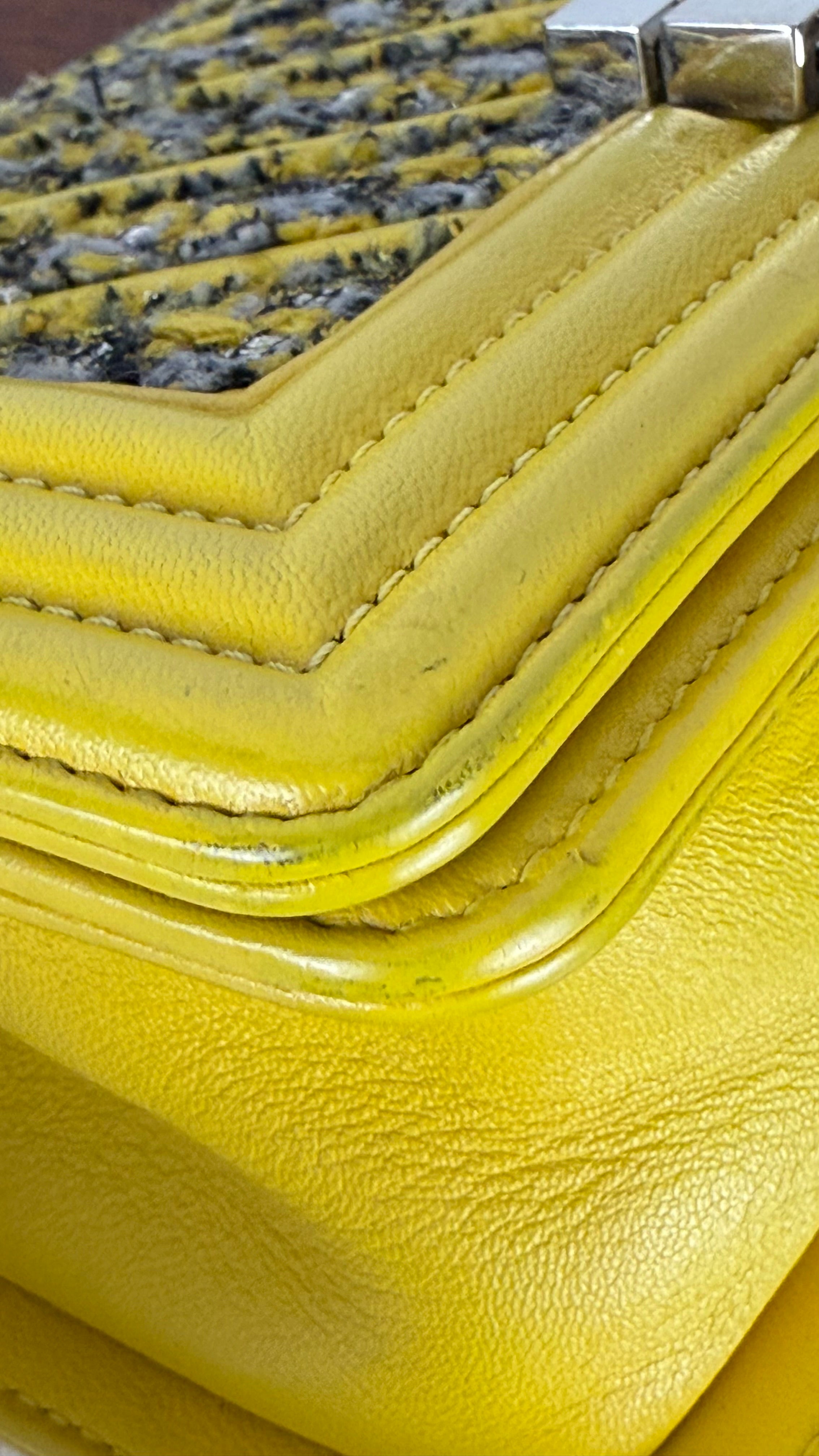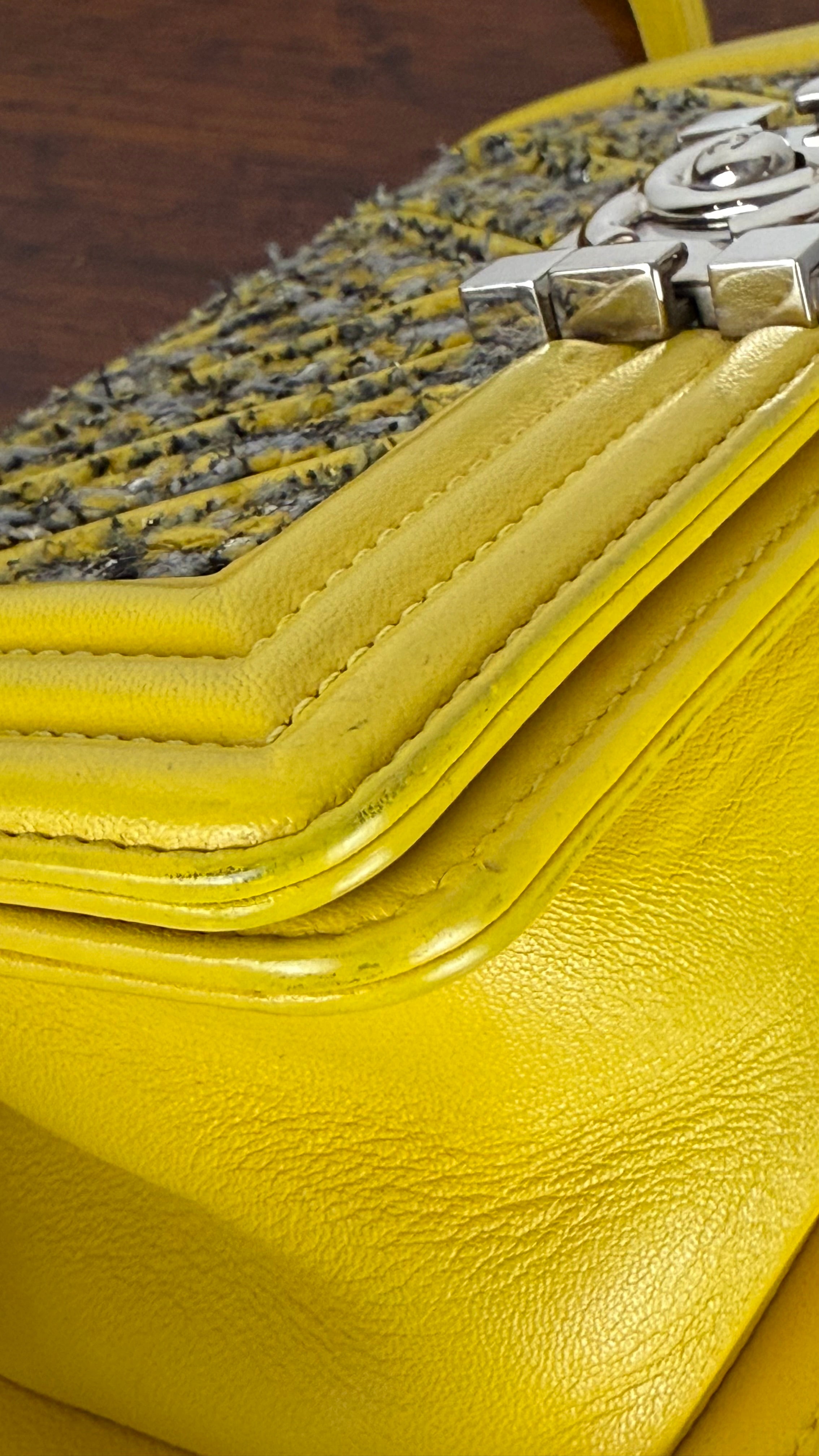 - MaterialTweed em padrão Chevron com detalhes em couro amarelo