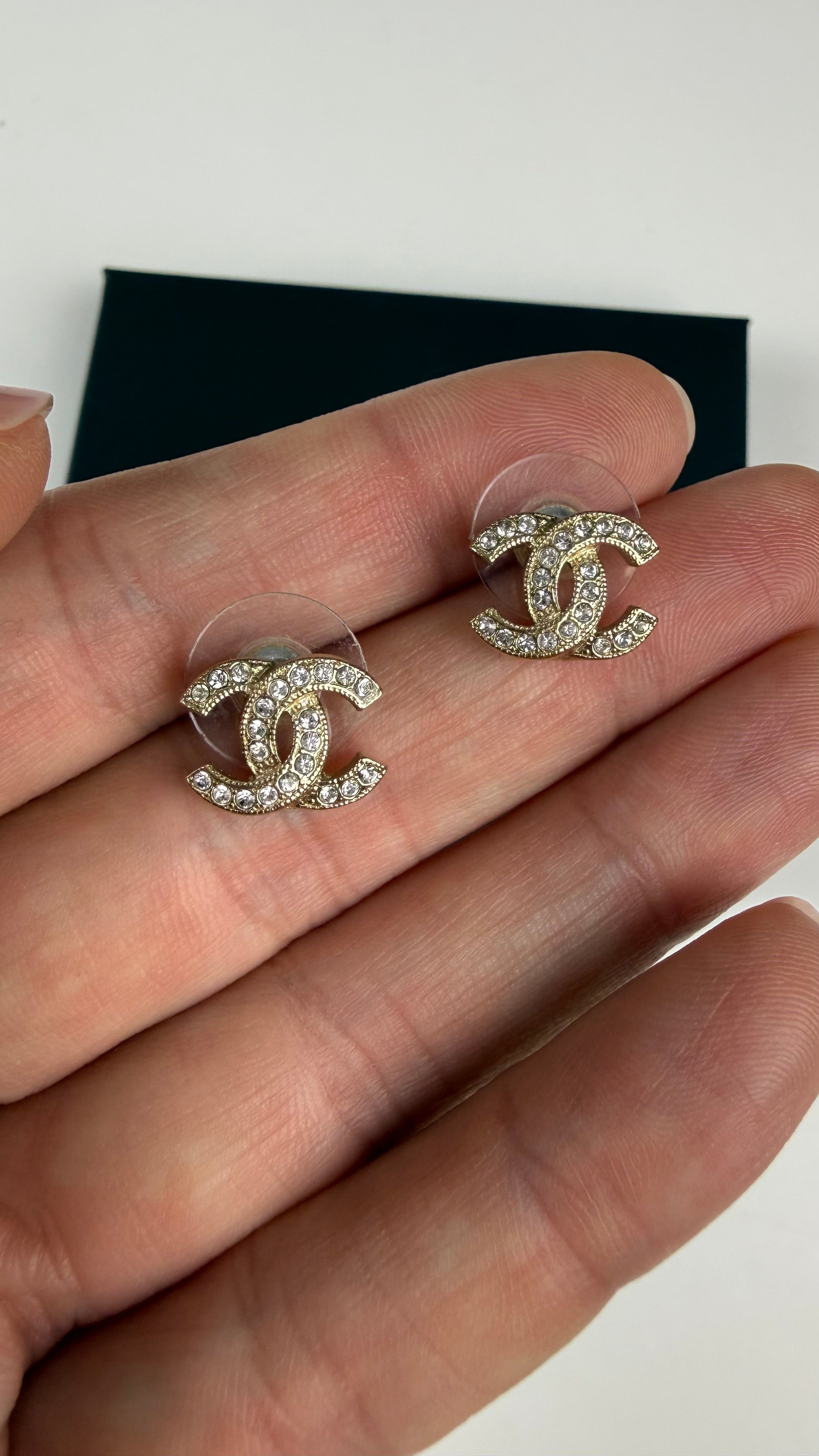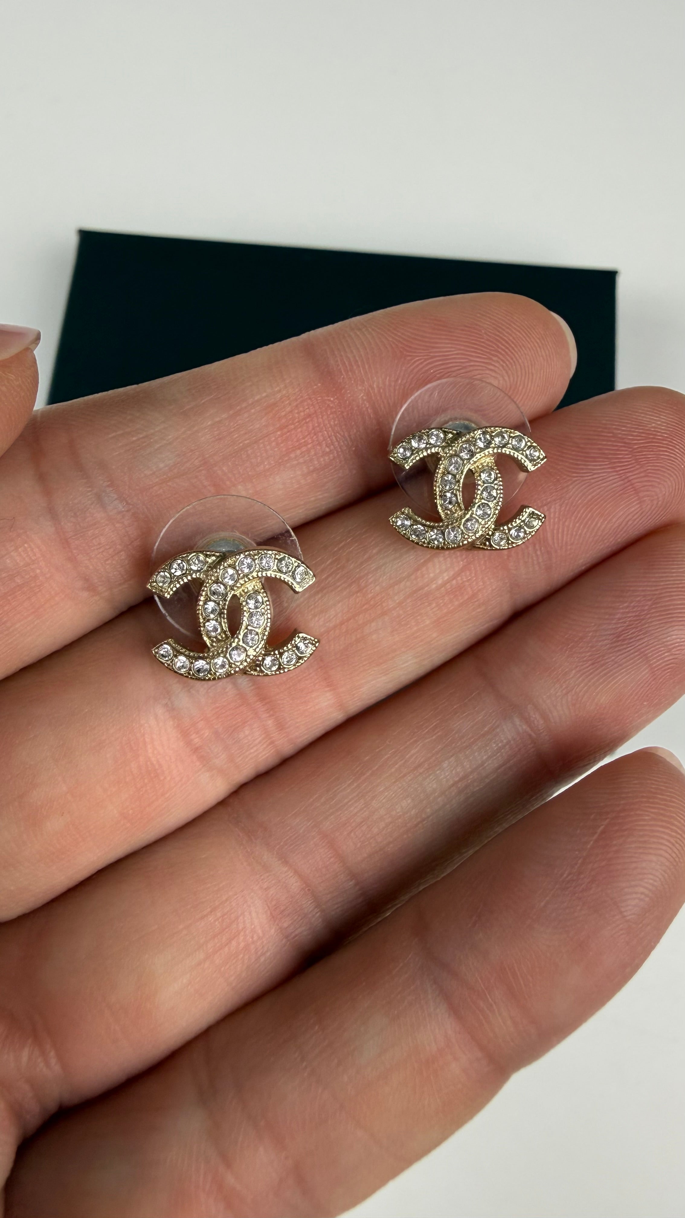 Elegância atemporal em cada detalhe. Estes brincos Chanel apresentam o icônico logo CC entrelaçado, confeccionado em metal banhado a ouro, adornado com strass brilhantes e finalizado com uma pérola que confere um toque clássico e sofisticado.