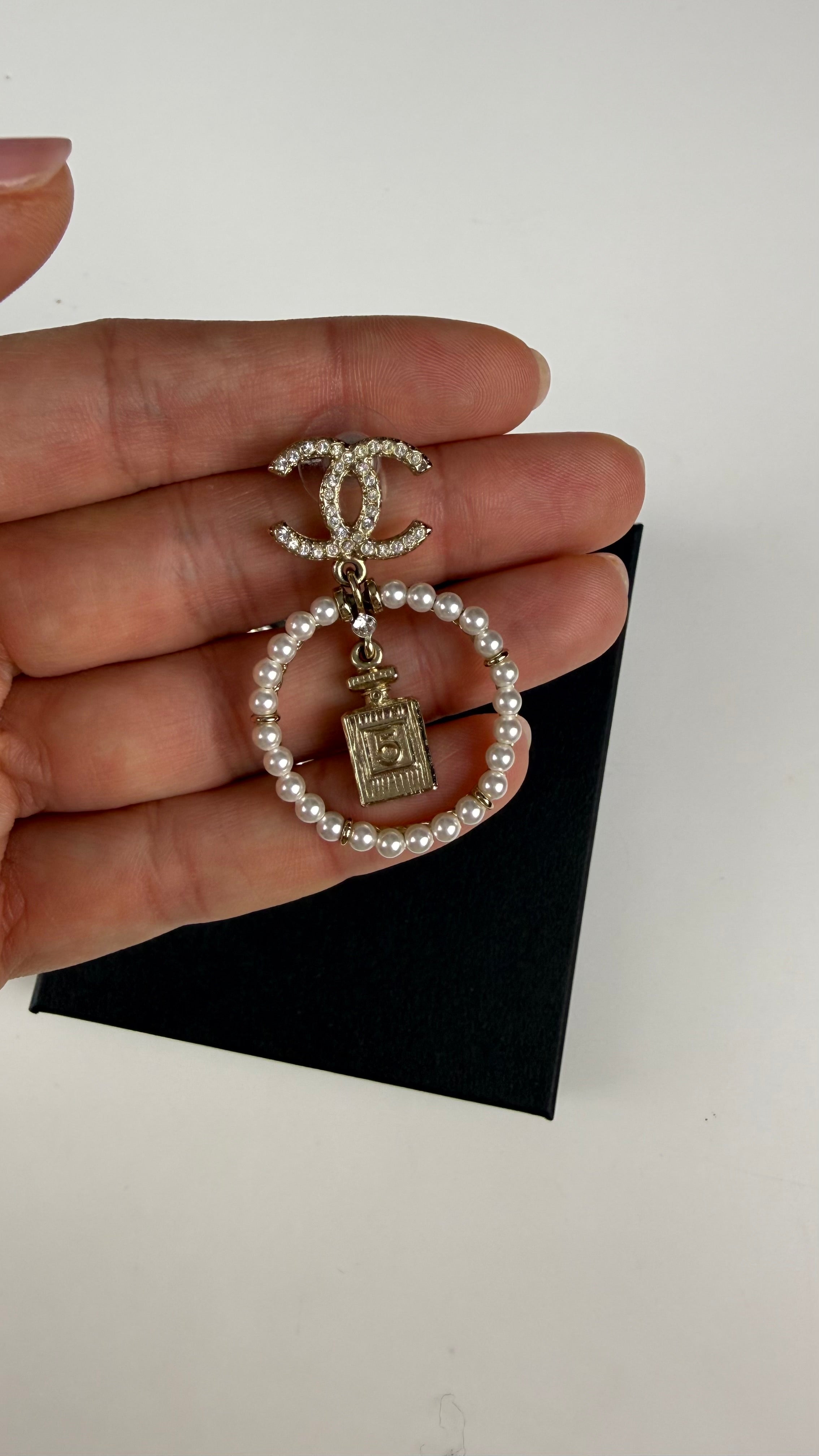 Elegantes e cheios de personalidade, estes brincos Chanel combinam elementos icônicos da Maison em uma peça marcante e feminina. O design apresenta o tradicional logo CC cravejado de cristais, conectado a um aro composto por mini pérolas brancas, que conferem delicadeza e sofisticação.