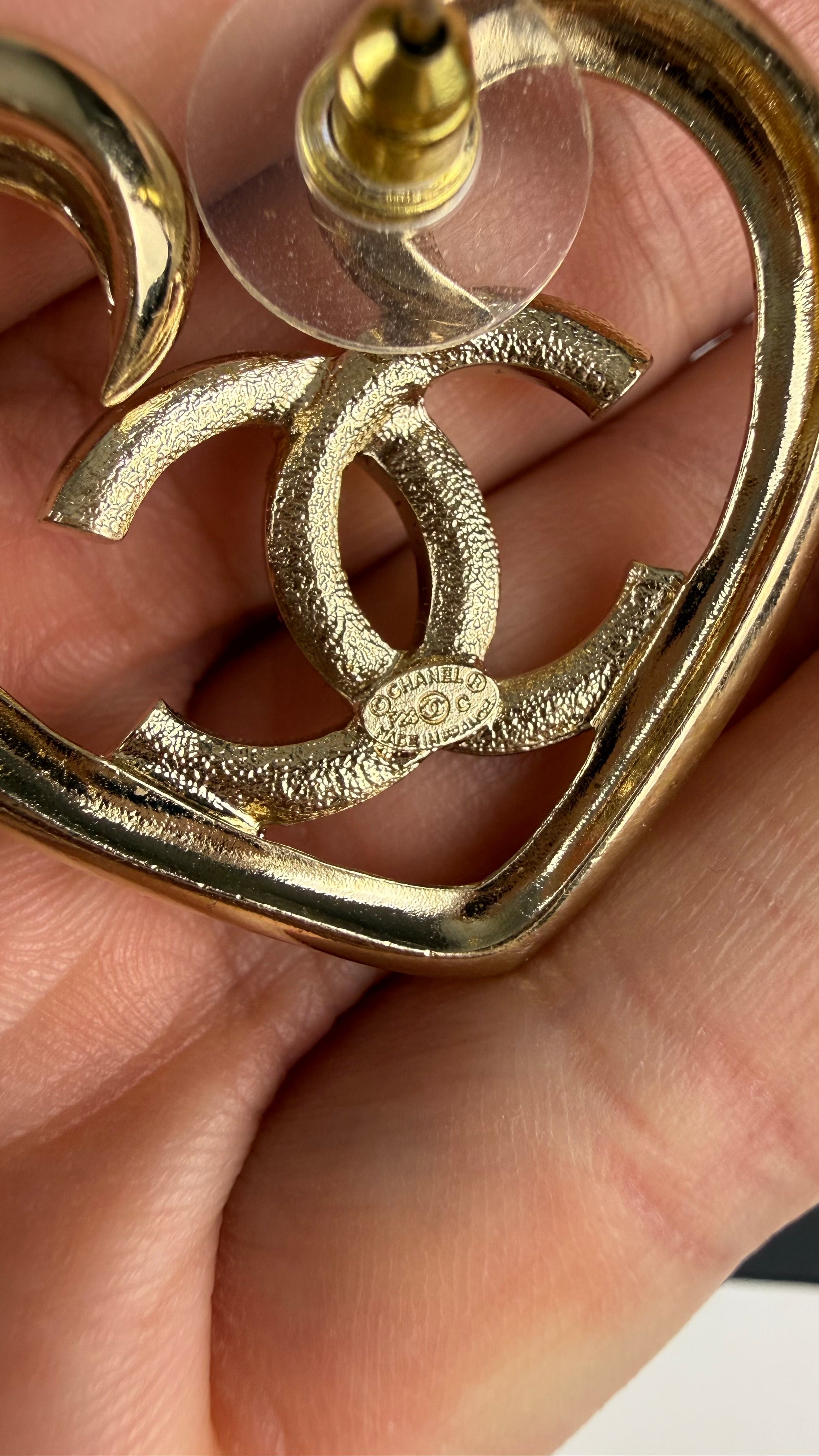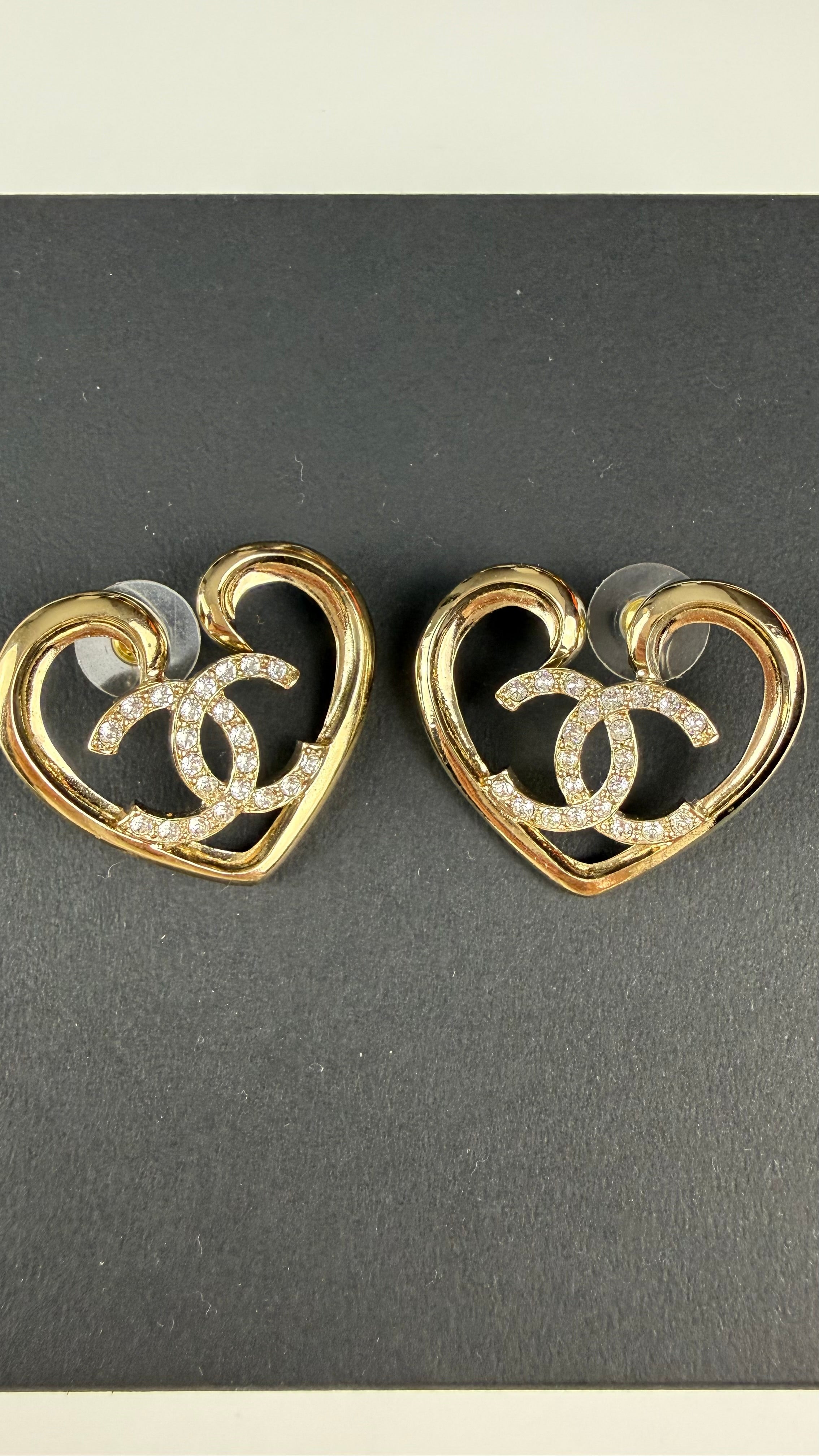 Românticos e sofisticados, estes brincos Chanel apresentam um design icônico que combina feminilidade, brilho e o luxo clássico da Maison. O modelo traz a estrutura em formato de coração vazado, em metal dourado polido, com acabamento brilhante e linhas curvas que garantem um visual harmonioso e elegante.