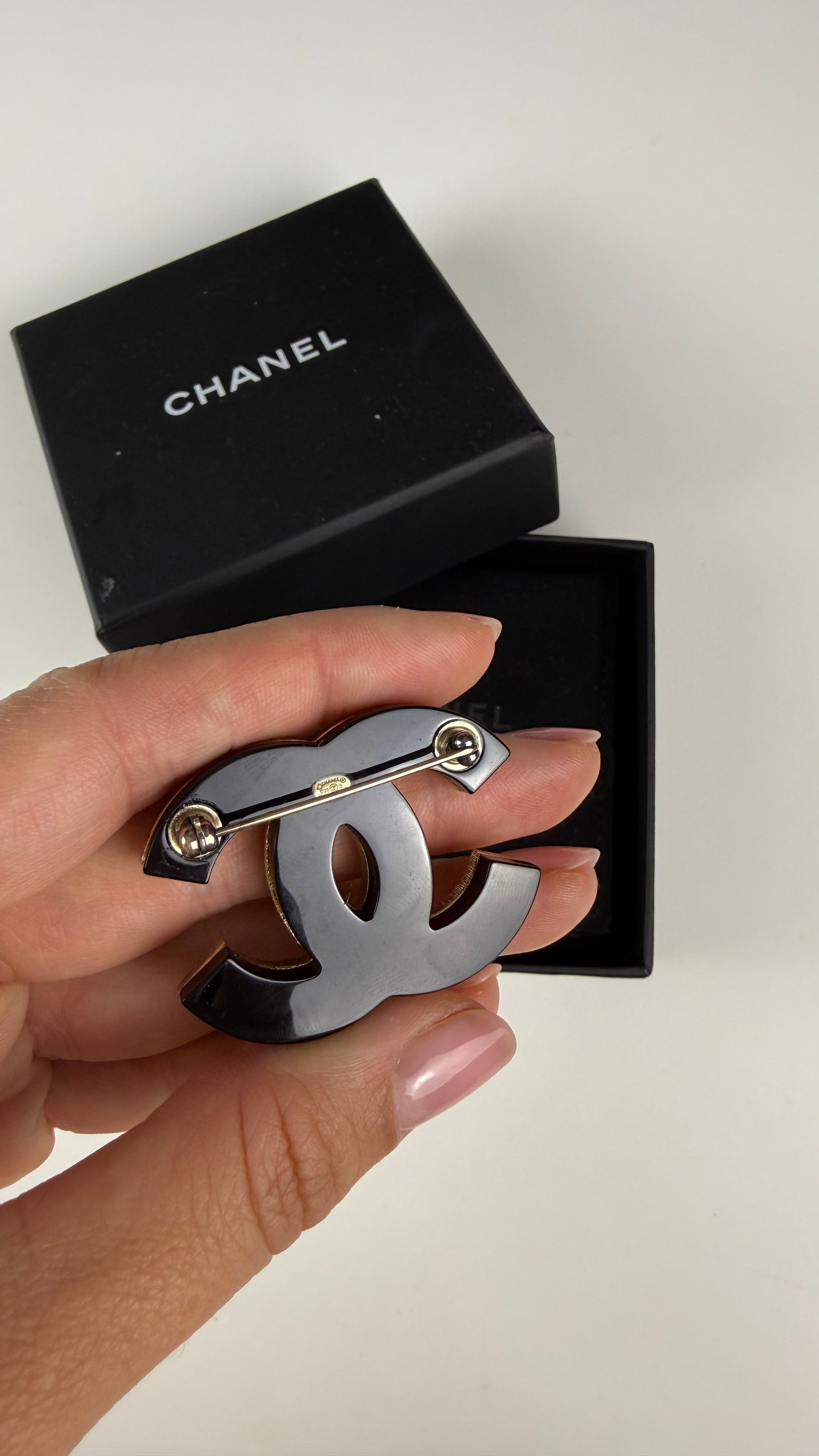 A borda dourada texturizada contorna toda a peça, acrescentando brilho, elegância e reforçando o caráter artesanal típico das criações Chanel. Essa combinação de resina luxuosa com metal dourado faz do broche uma peça versátil, ideal para usar em casacos, blazers, camisas, vestidos ou até mesmo em bolsas.