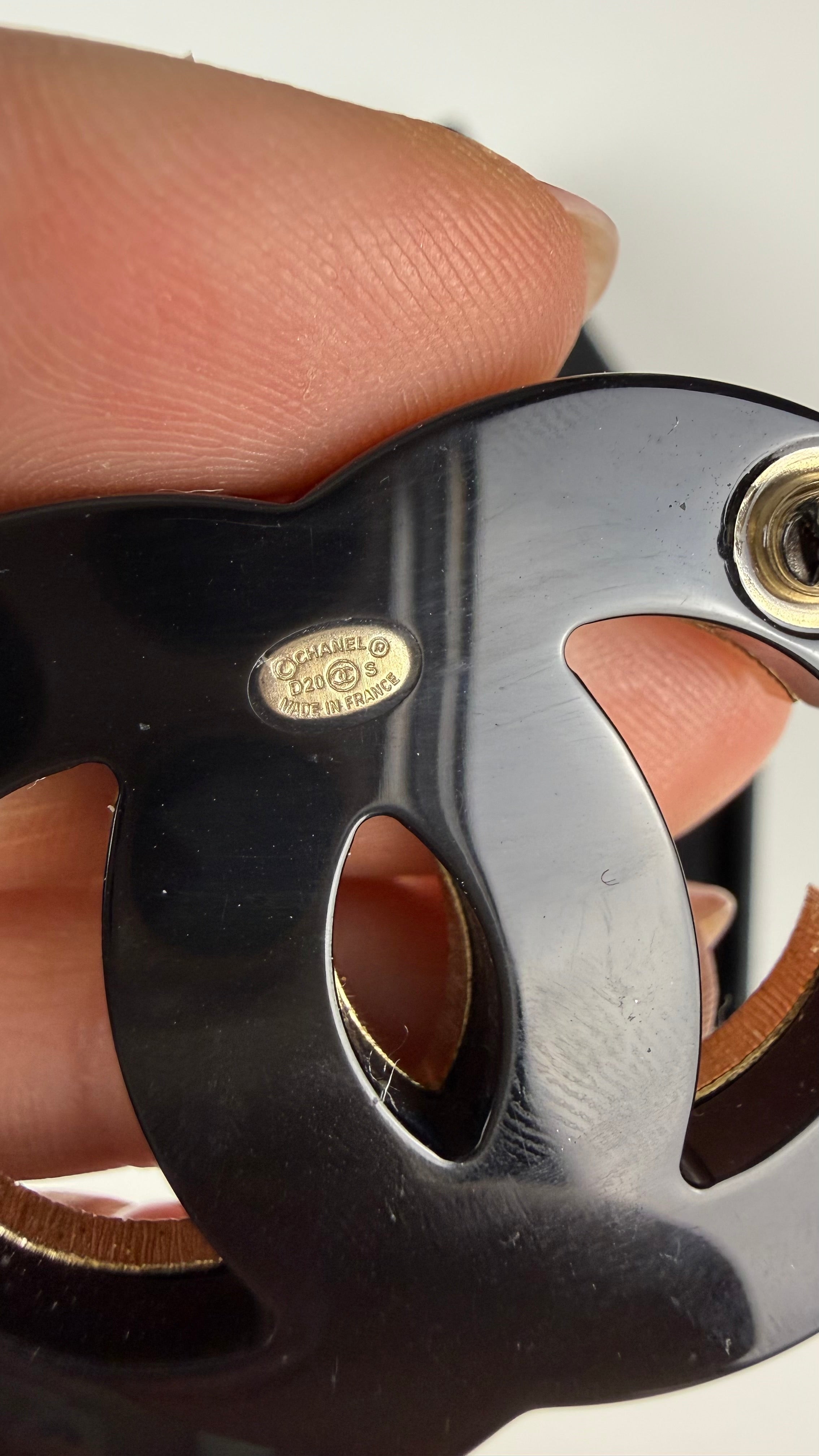 Este broche Chanel é uma peça sofisticada e marcante, perfeita para elevar qualquer look com o luxo atemporal da Maison. O design traz o icônico logo CC entrelaçado, confeccionado em resina com acabamento que lembra o efeito tartaruga (tortoiseshell) em tons profundos de preto e vermelho, criando um visual moderno e exuberante.