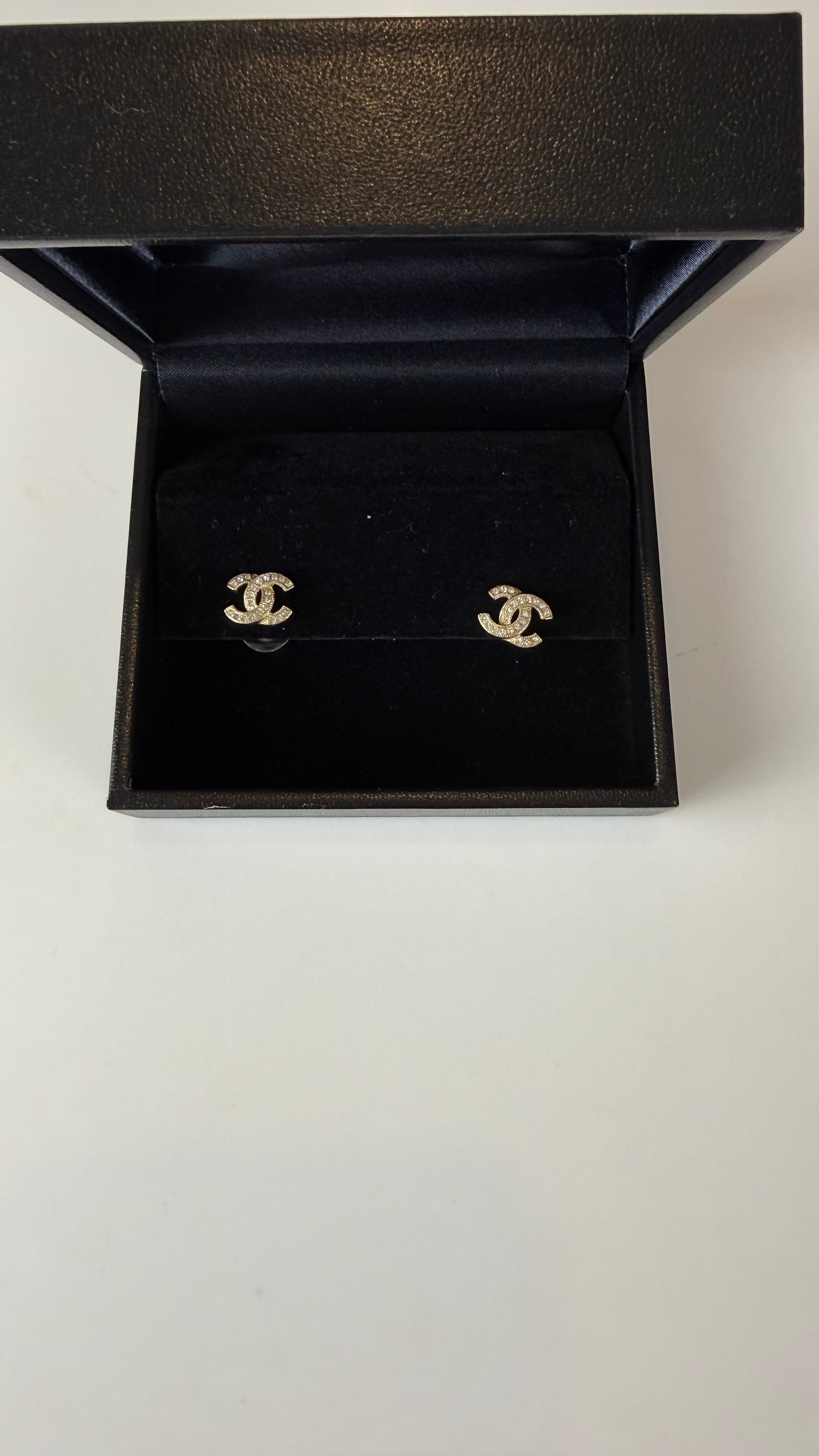 Estes elegantes brincos Chanel apresentam o icónico logótipo duplo “CC” da marca, símbolo de luxo e sofisticação. Produzidos em metal dourado, estão totalmente cravejados com cristais transparentes, que refletem a luz com brilho subtil e requintado.