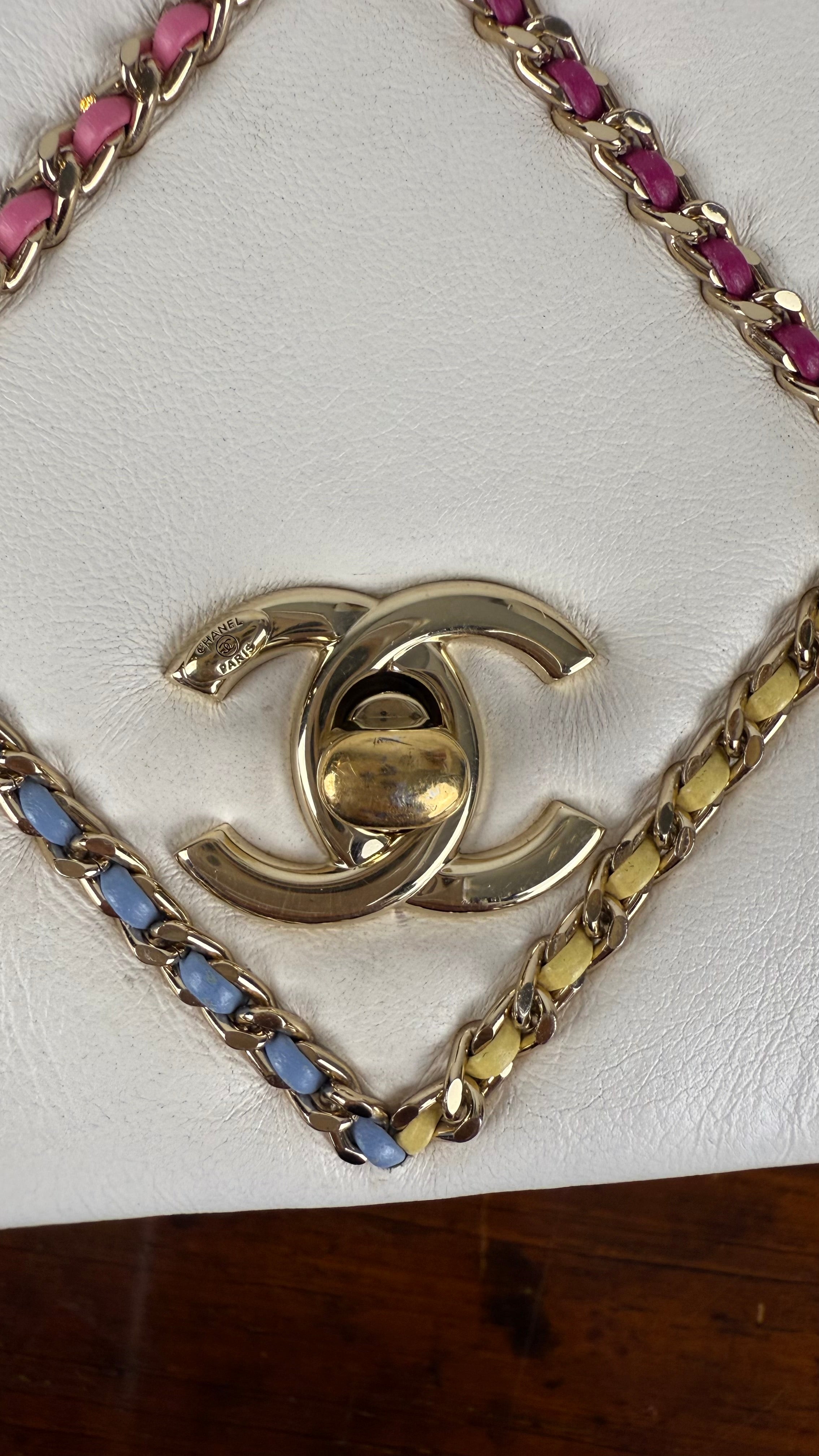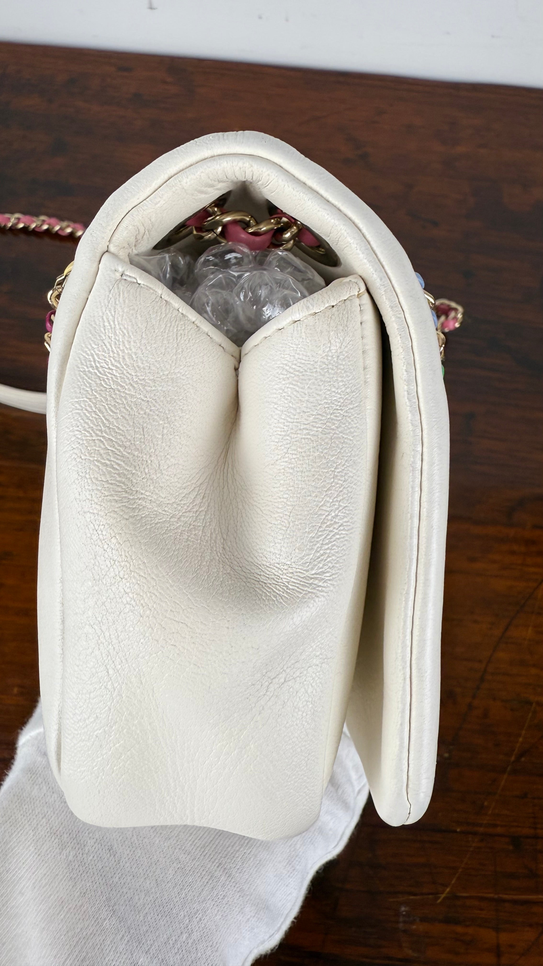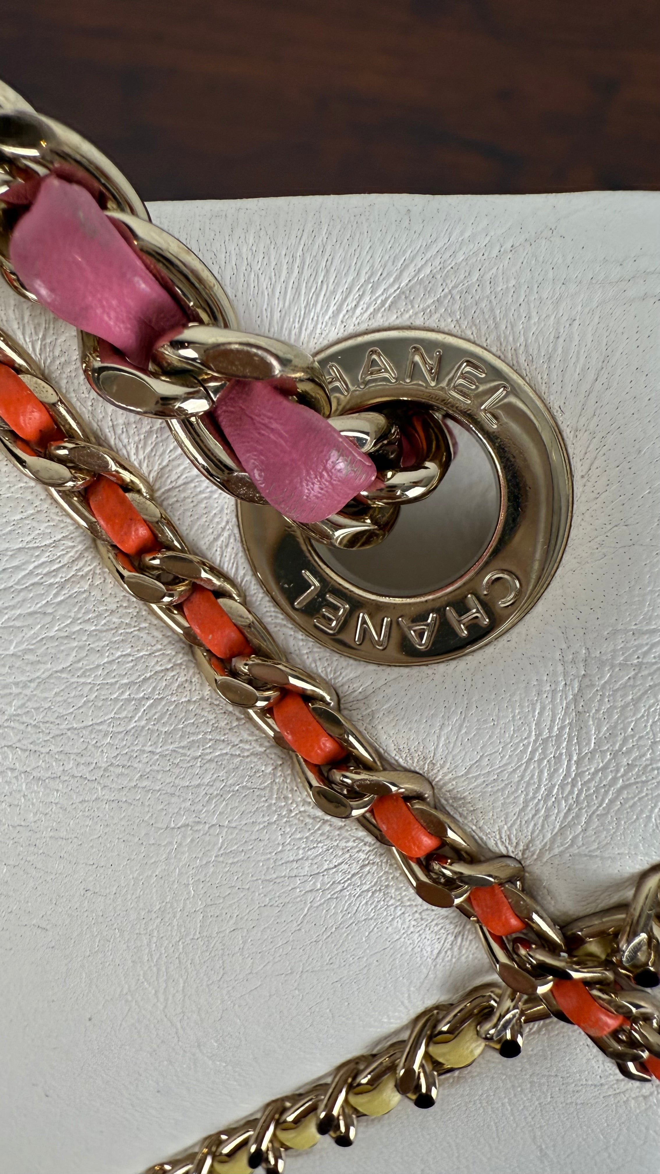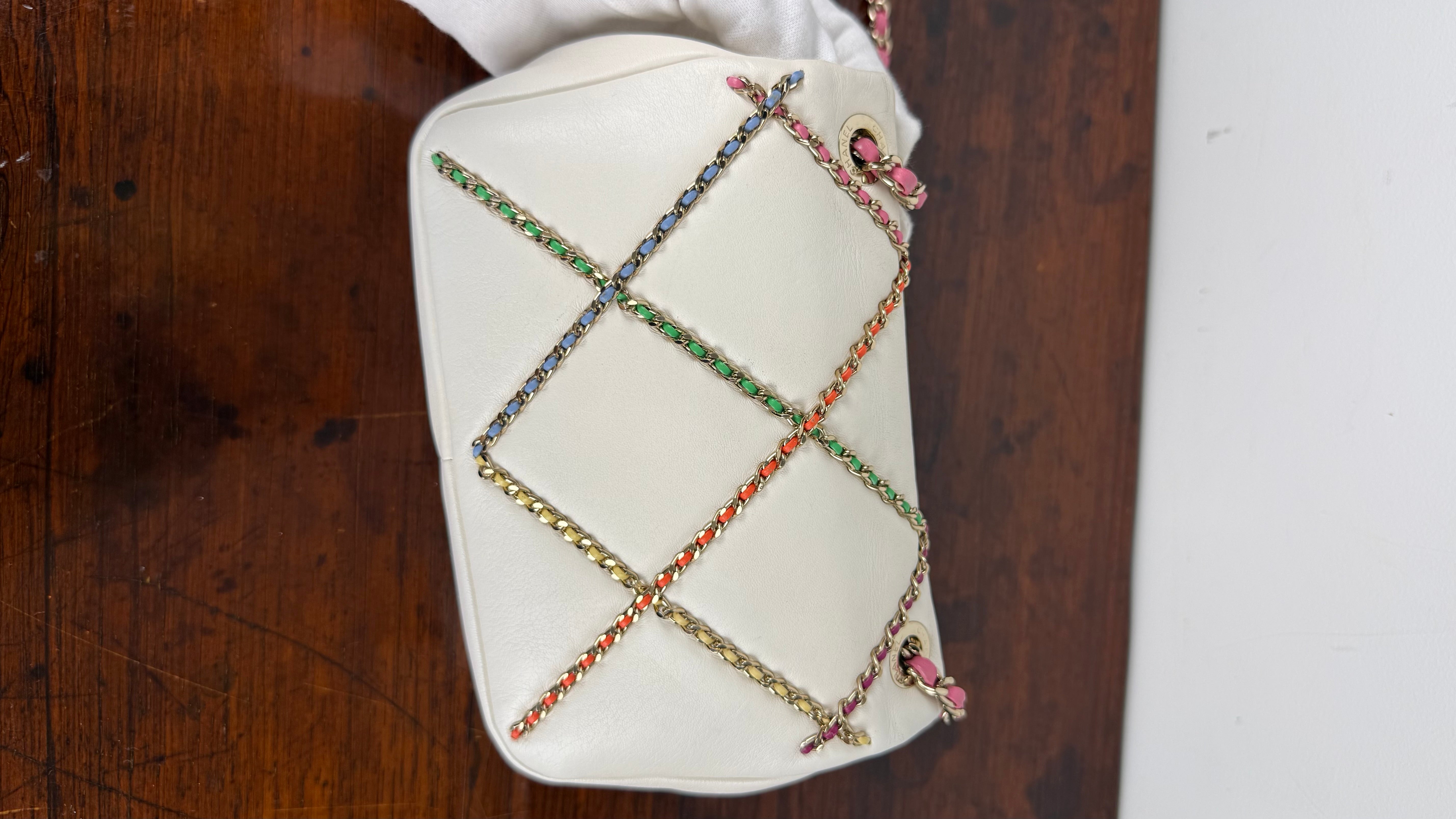 A icônica Chanel Classic Flap Bag recebe um toque contemporâneo e vibrante nesta versão sofisticada em couro lambskin branco, conhecido por sua maciez luxuosa e acabamento acetinado. O corpo estruturado da bolsa contrasta lindamente com o detalhe ousado da corrente entrelaçada multicolorida, uma releitura moderna da tradicional corrente Chanel.