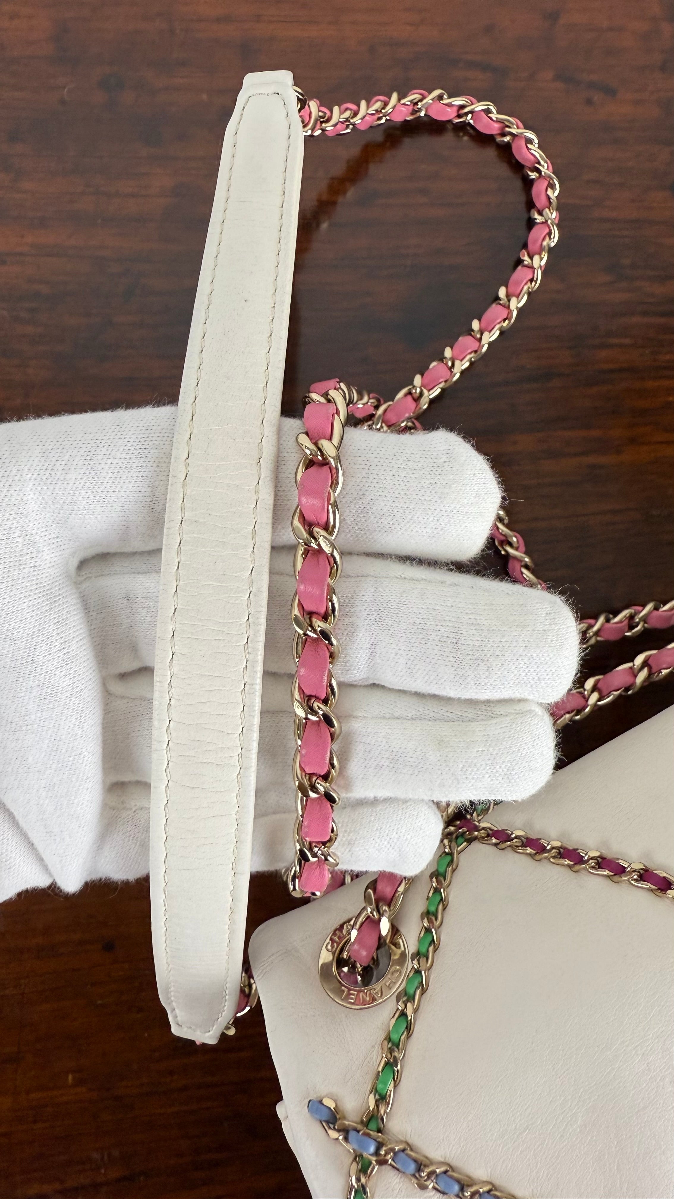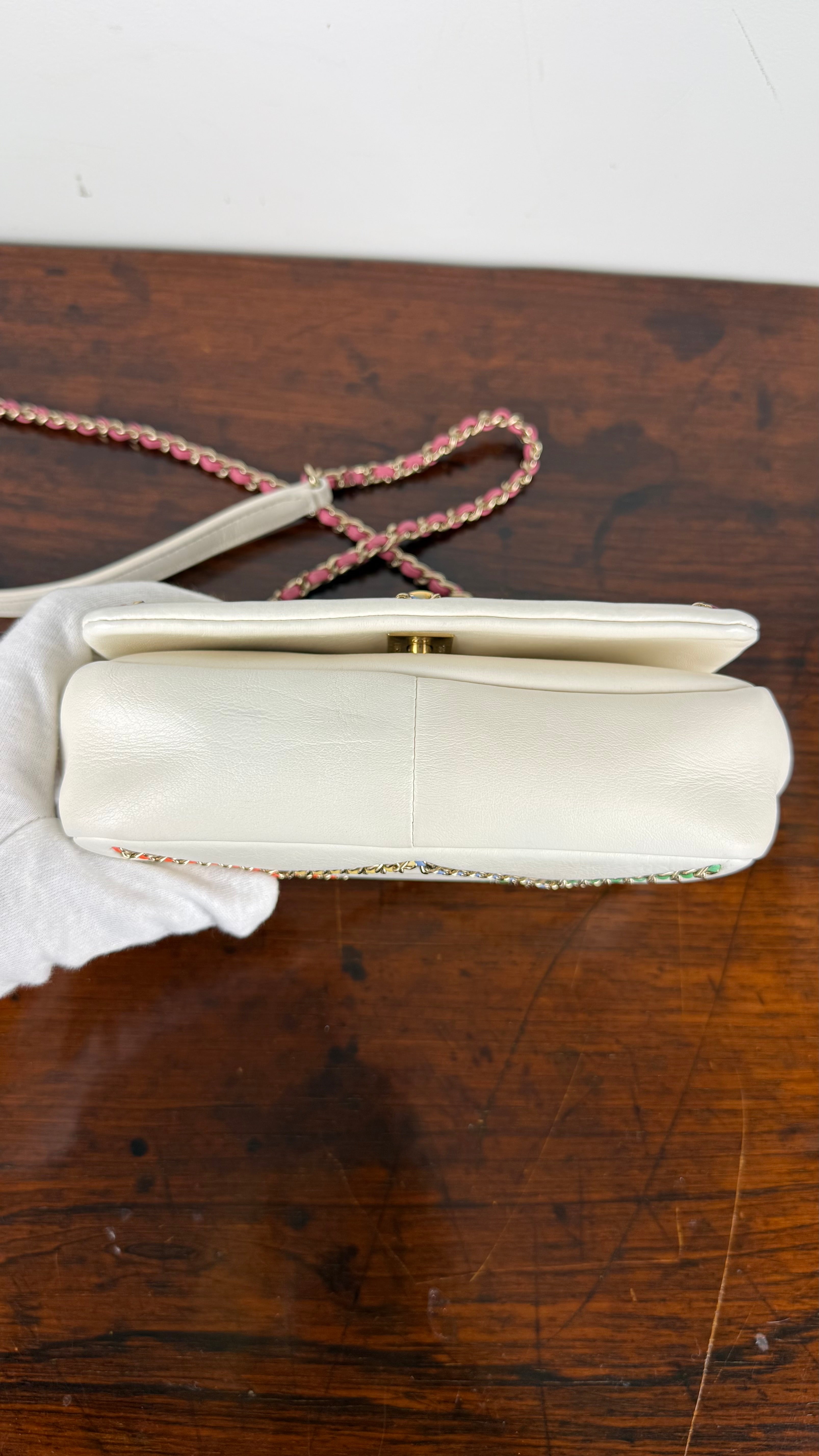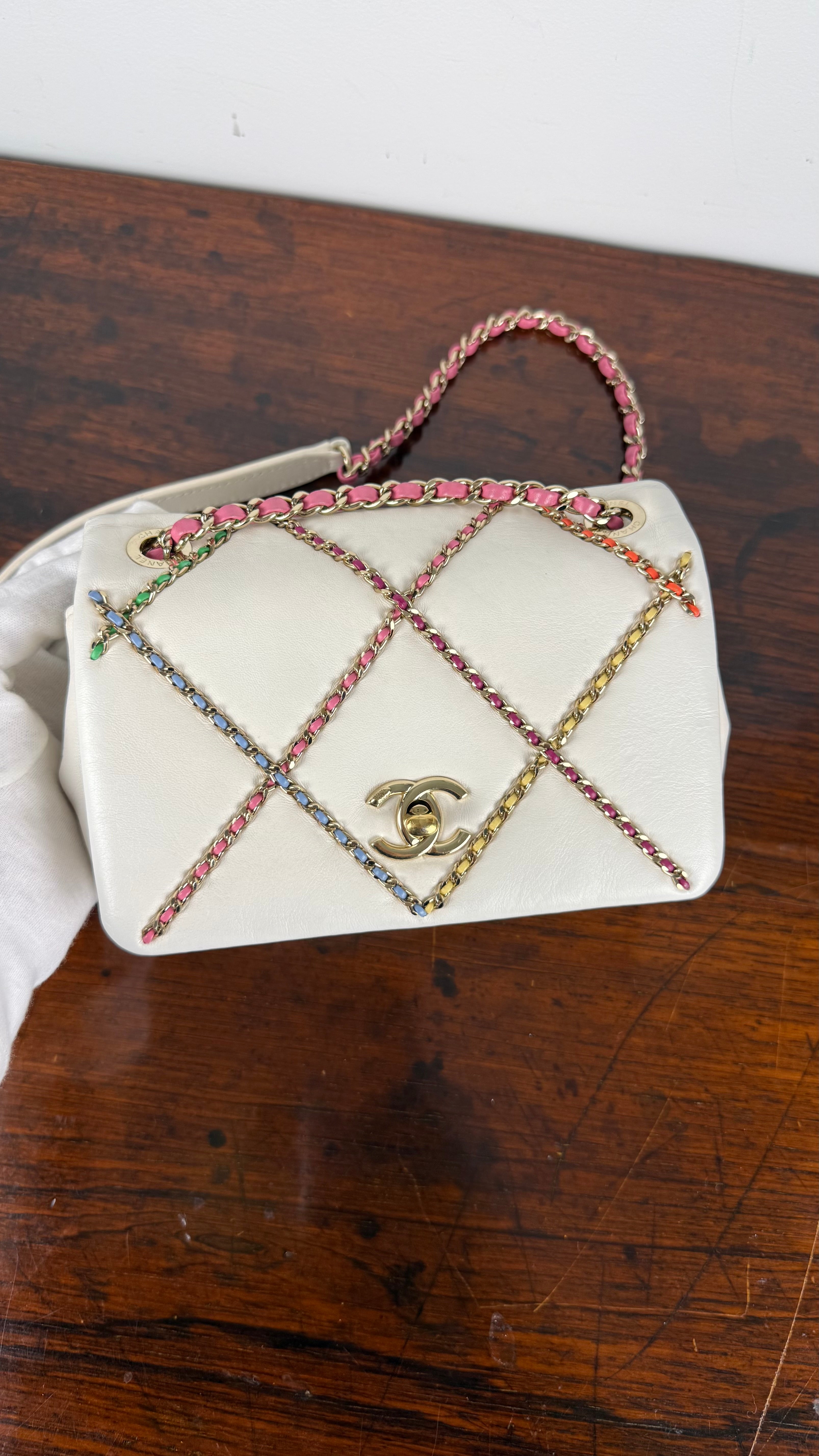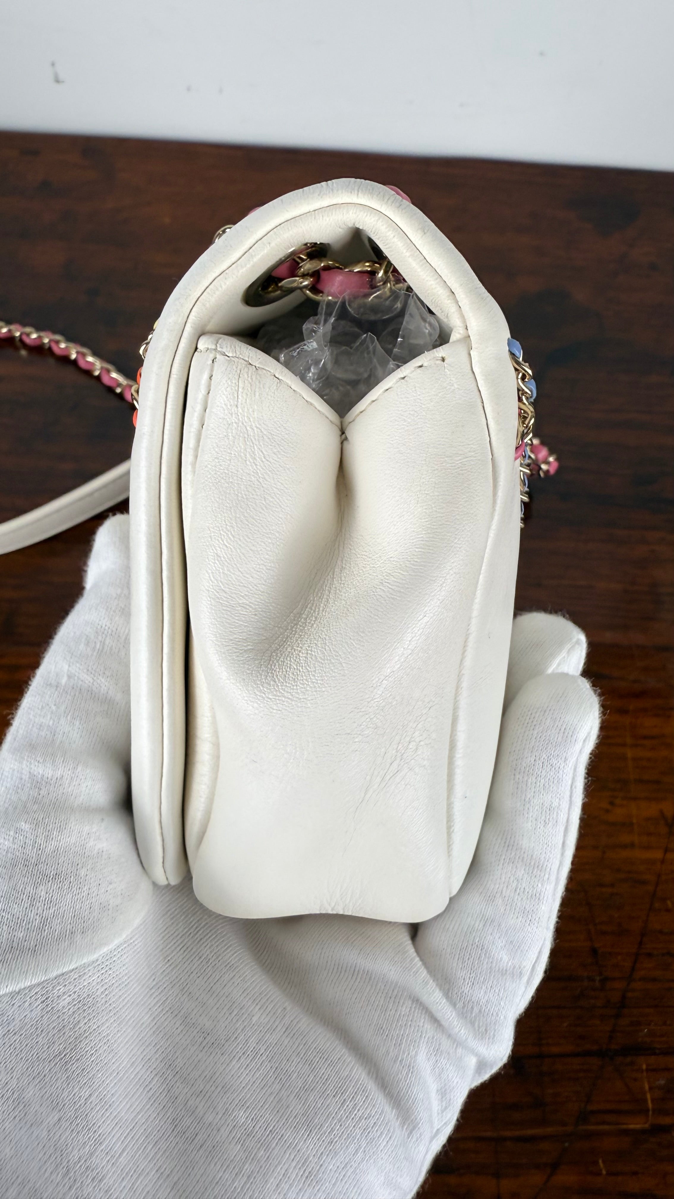 A icônica Chanel Classic Flap Bag recebe um toque contemporâneo e vibrante nesta versão sofisticada em couro lambskin branco, conhecido por sua maciez luxuosa e acabamento acetinado. O corpo estruturado da bolsa contrasta lindamente com o detalhe ousado da corrente entrelaçada multicolorida, uma releitura moderna da tradicional corrente Chanel.