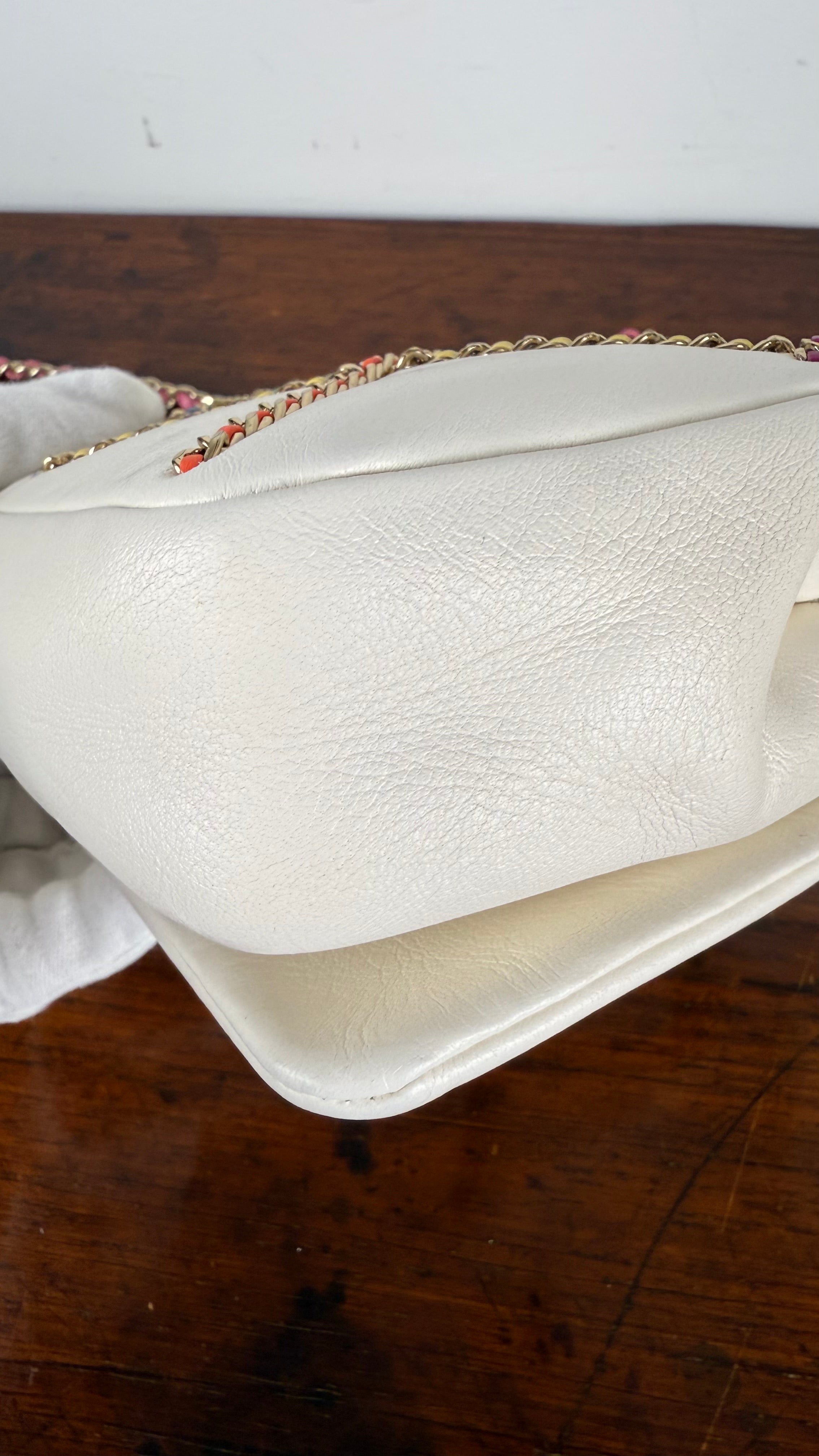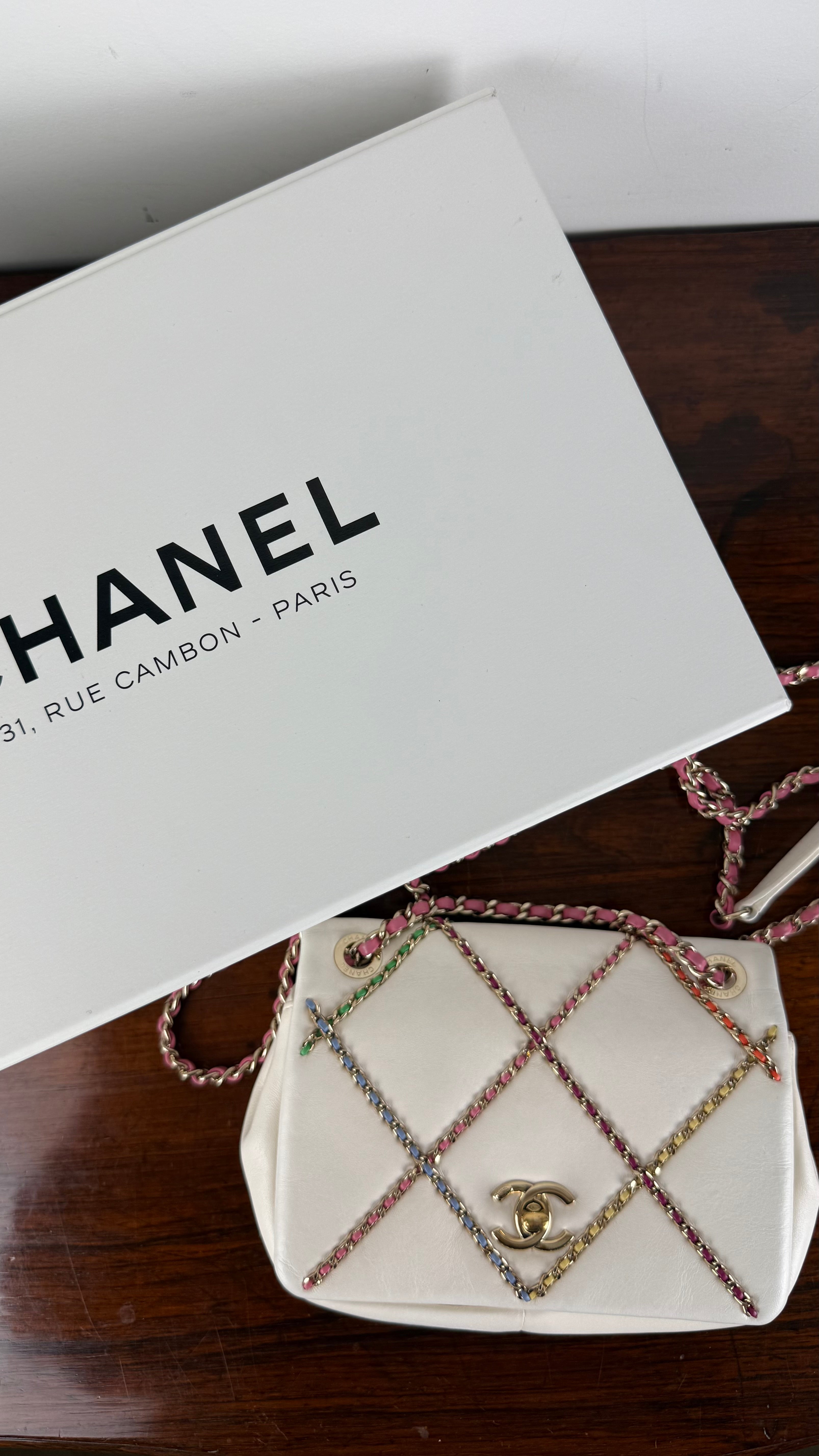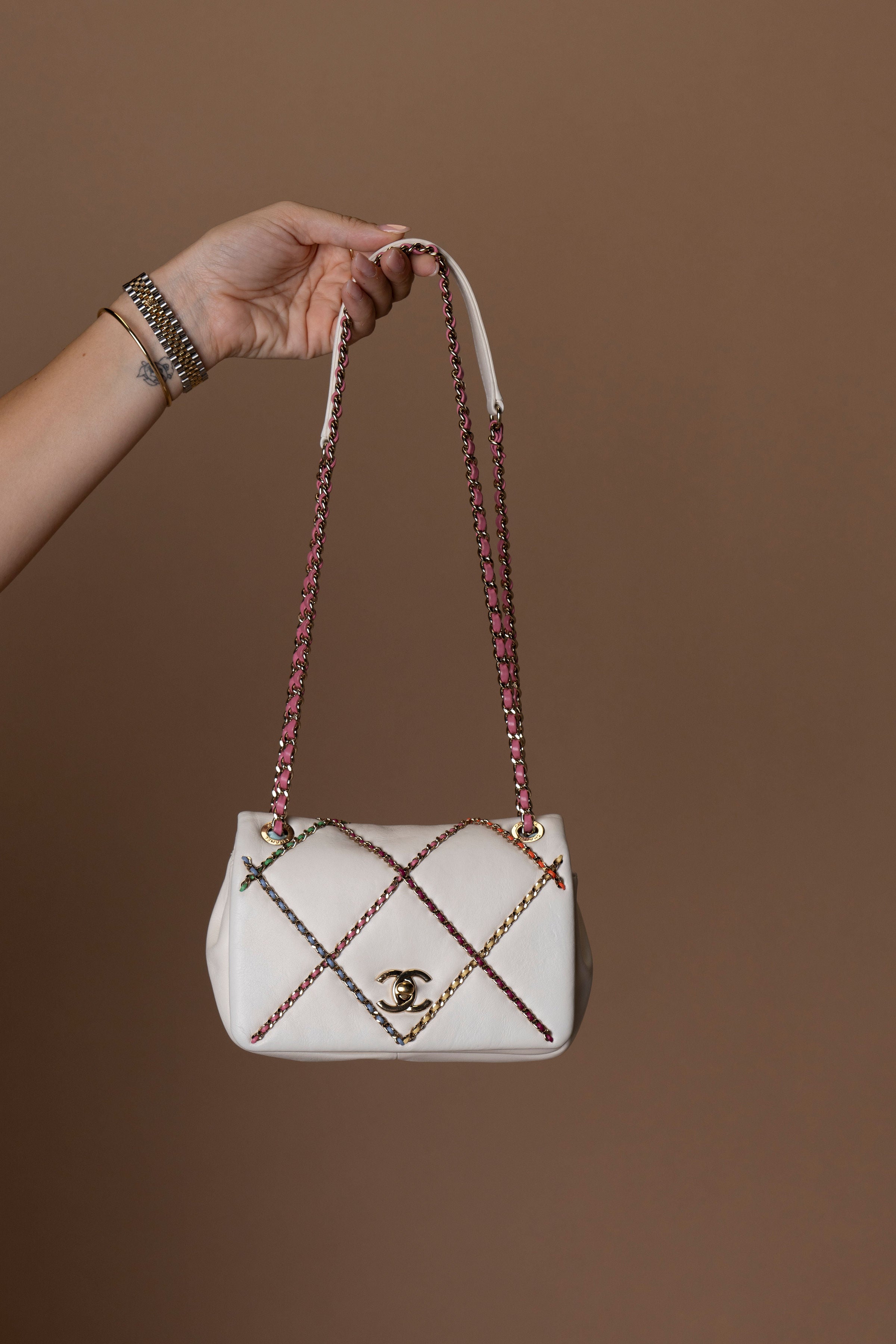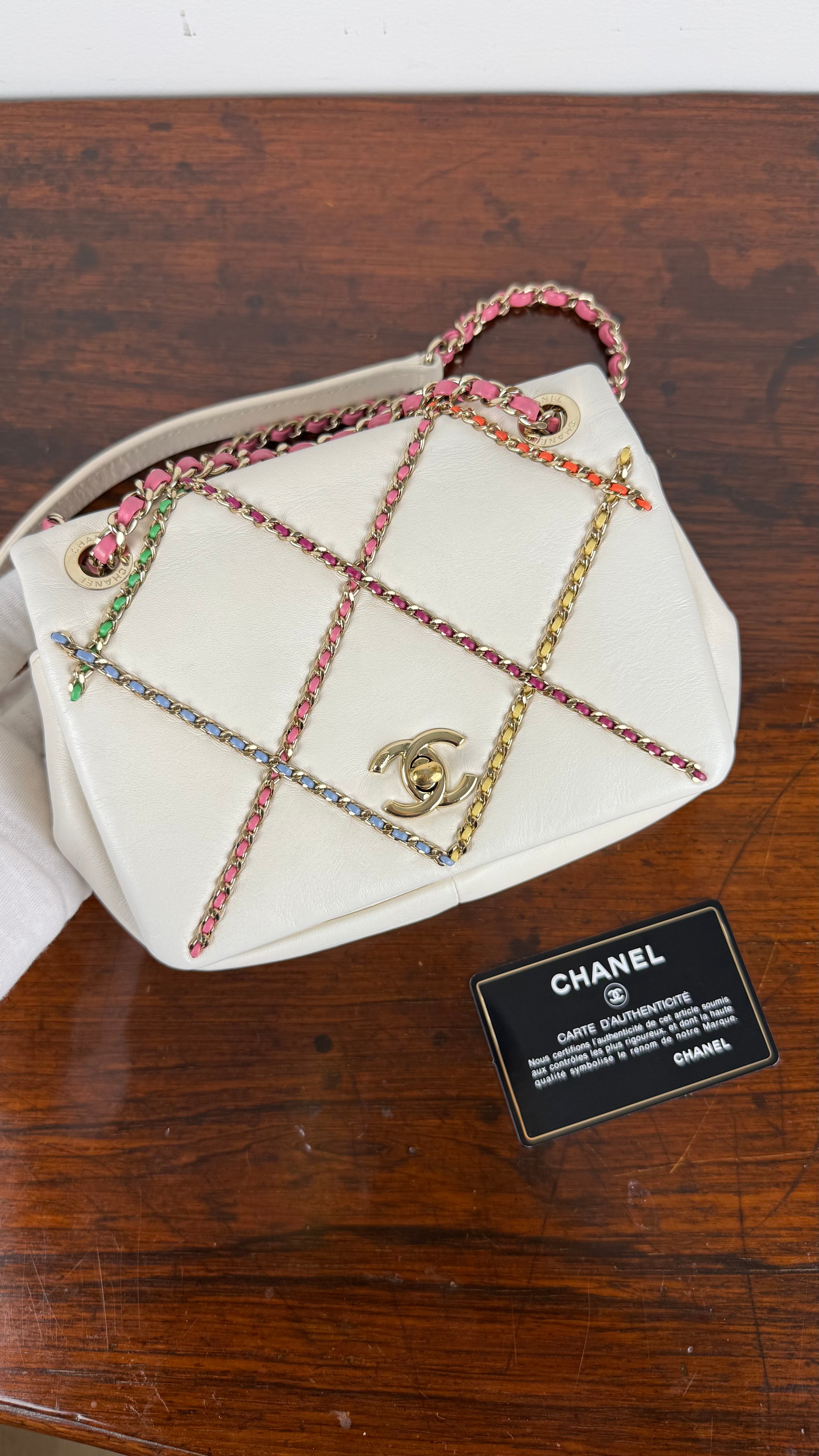 A icônica Chanel Classic Flap Bag recebe um toque contemporâneo e vibrante nesta versão sofisticada em couro lambskin branco, conhecido por sua maciez luxuosa e acabamento acetinado. O corpo estruturado da bolsa contrasta lindamente com o detalhe ousado da corrente entrelaçada multicolorida, uma releitura moderna da tradicional corrente Chanel.
