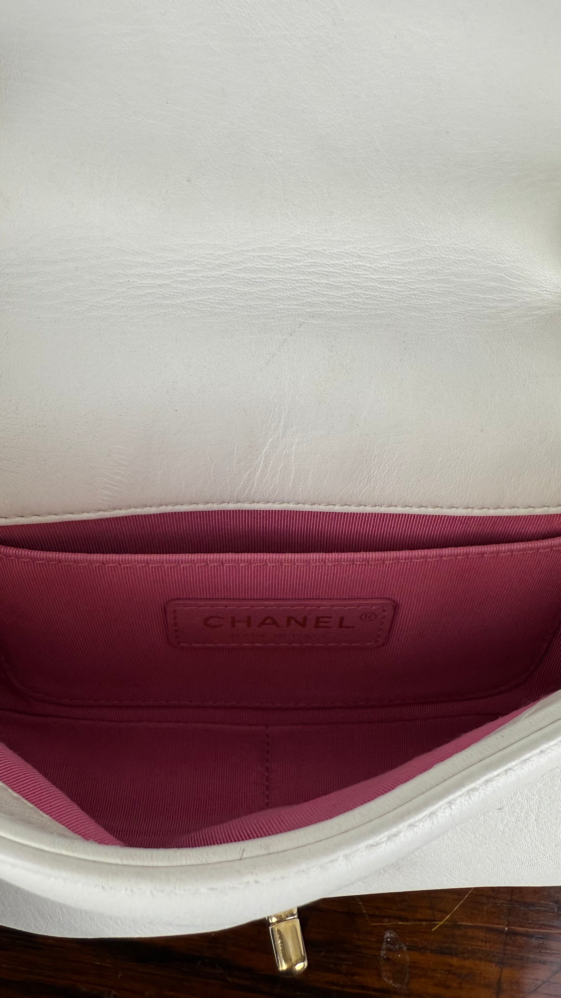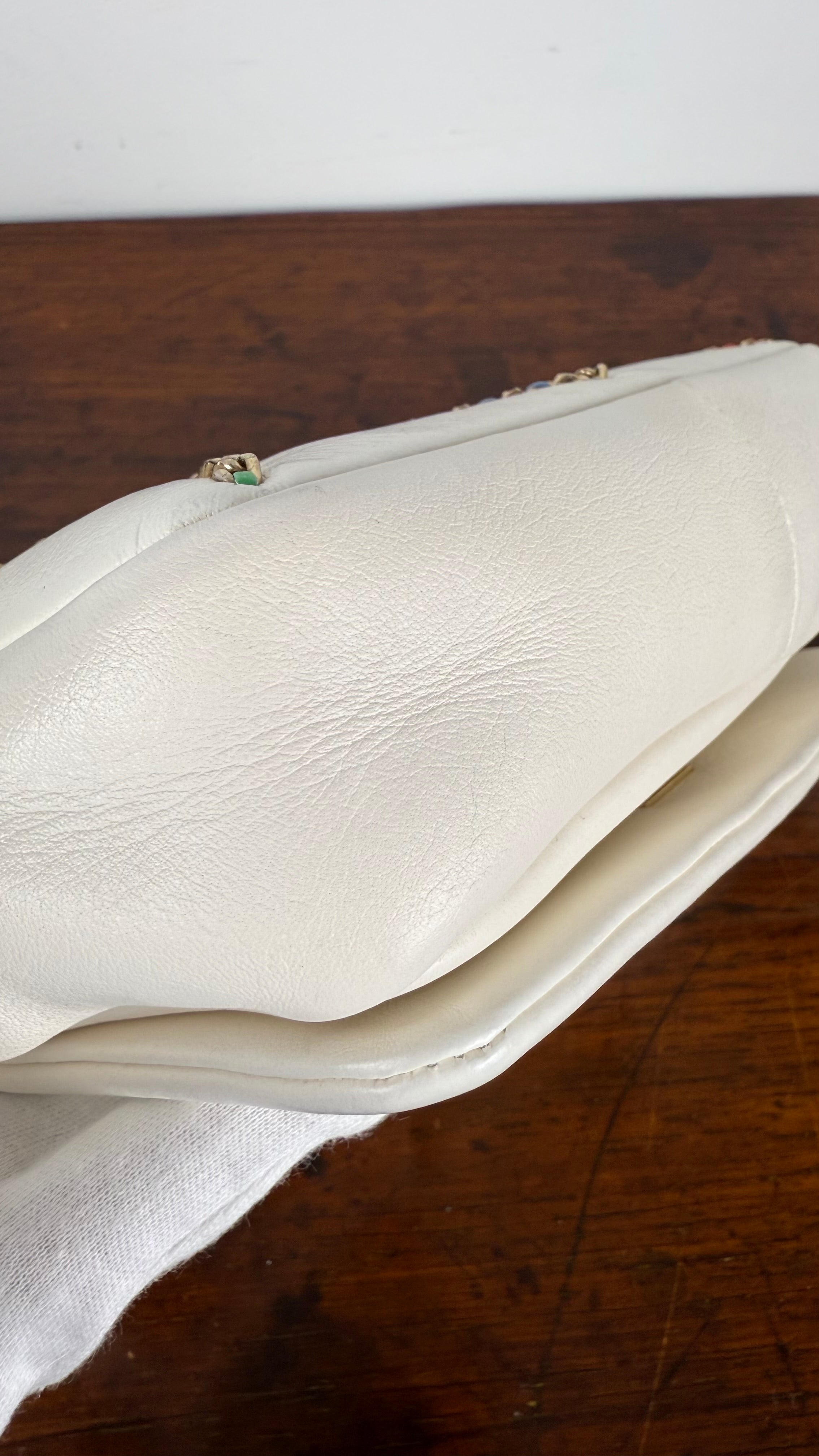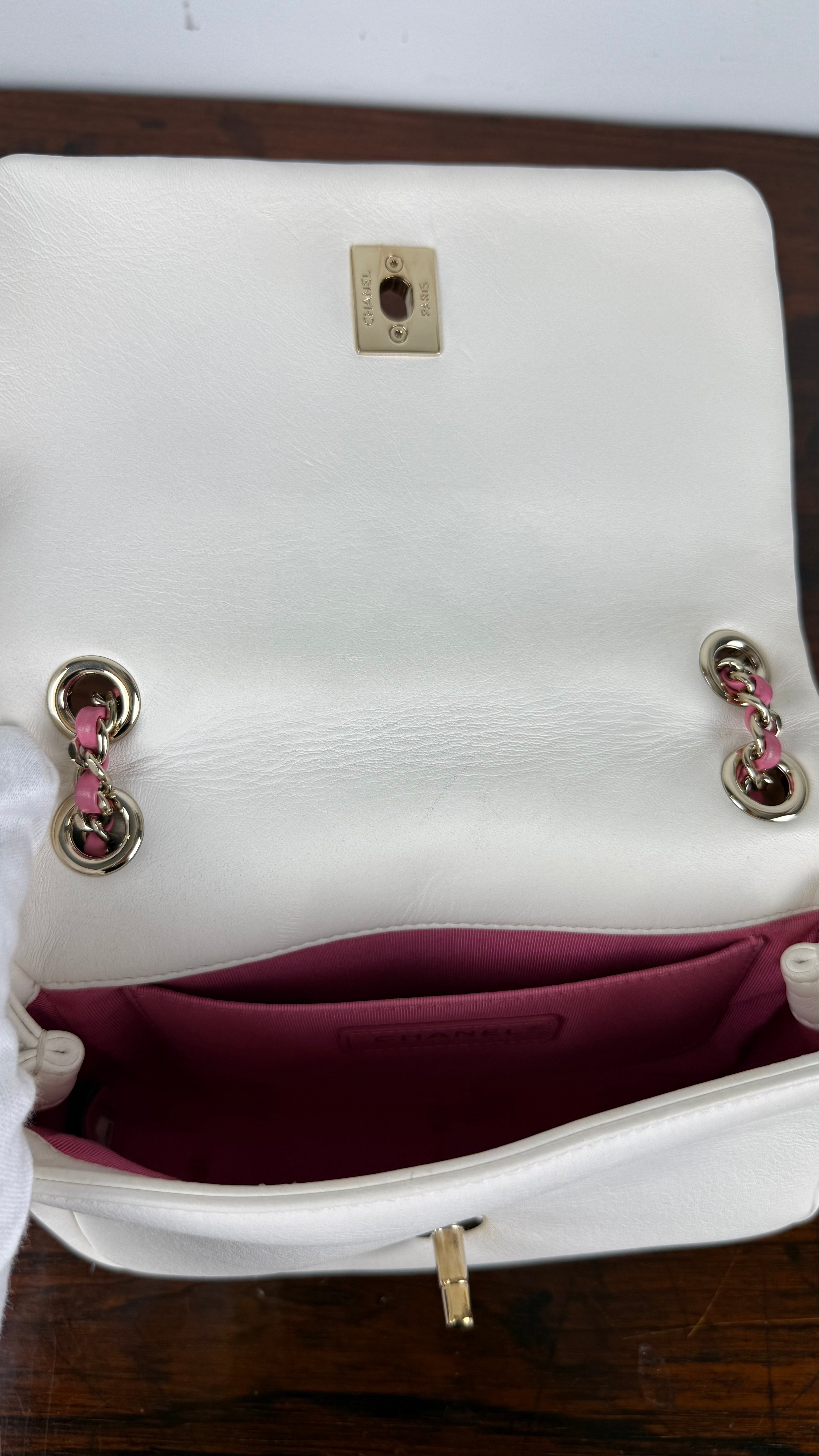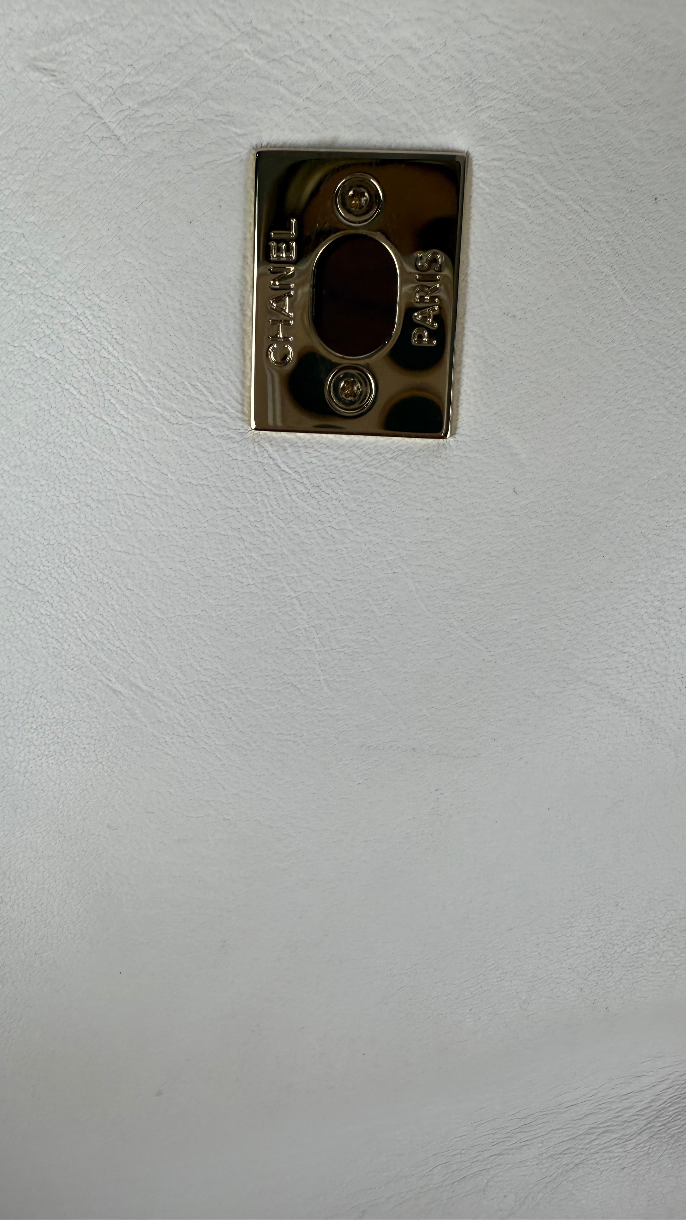 A icônica Chanel Classic Flap Bag recebe um toque contemporâneo e vibrante nesta versão sofisticada em couro lambskin branco, conhecido por sua maciez luxuosa e acabamento acetinado. O corpo estruturado da bolsa contrasta lindamente com o detalhe ousado da corrente entrelaçada multicolorida, uma releitura moderna da tradicional corrente Chanel.