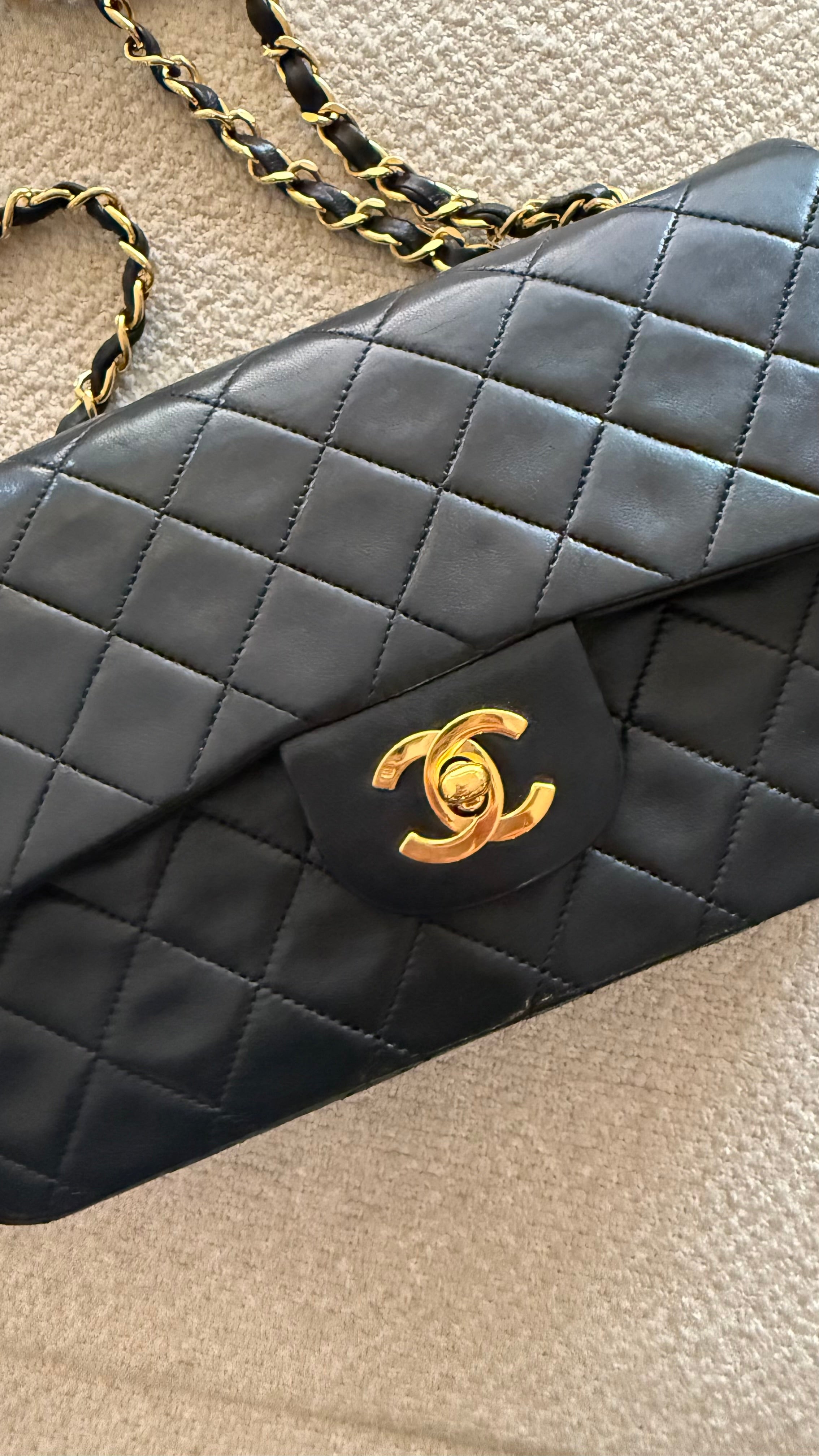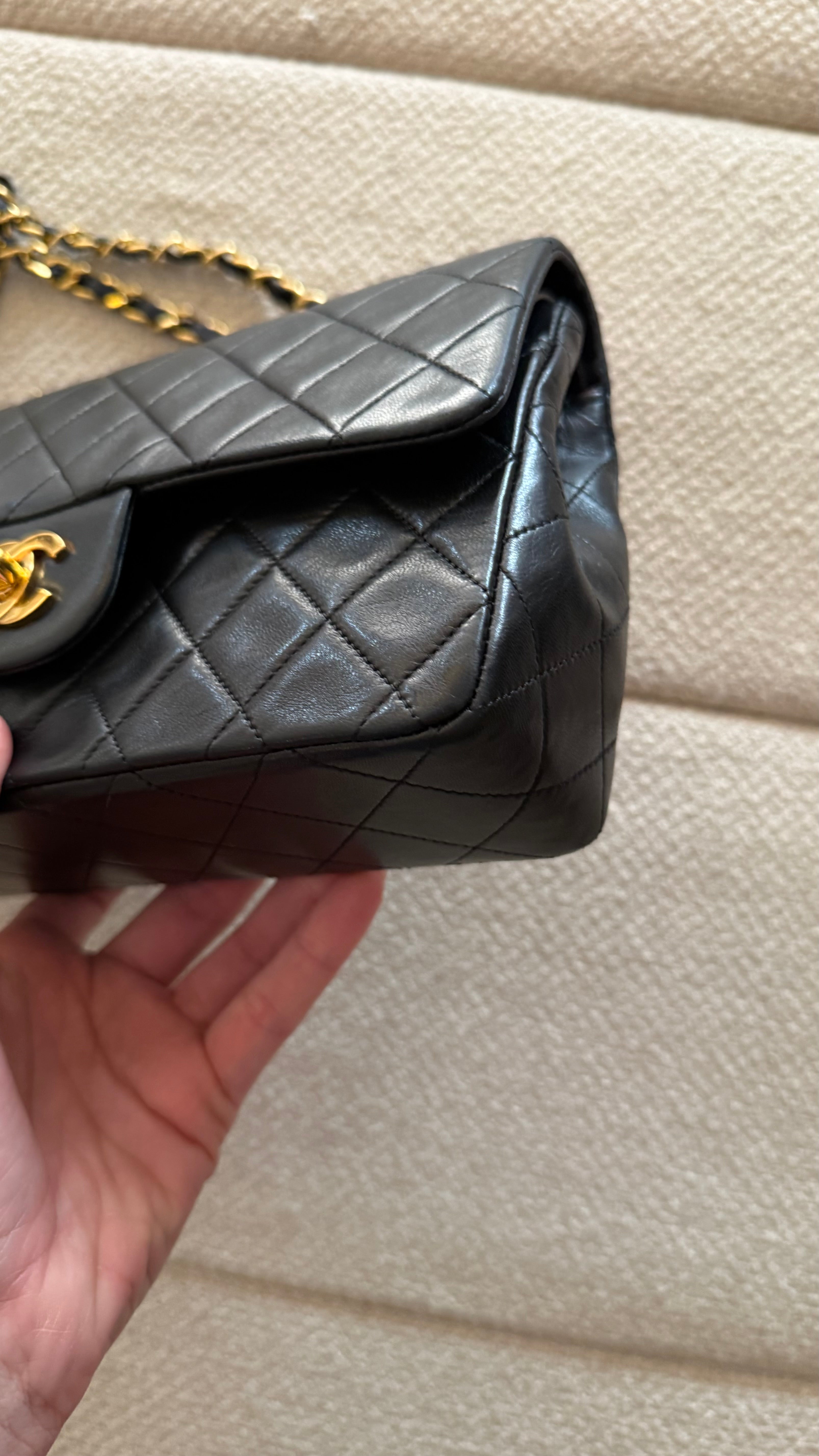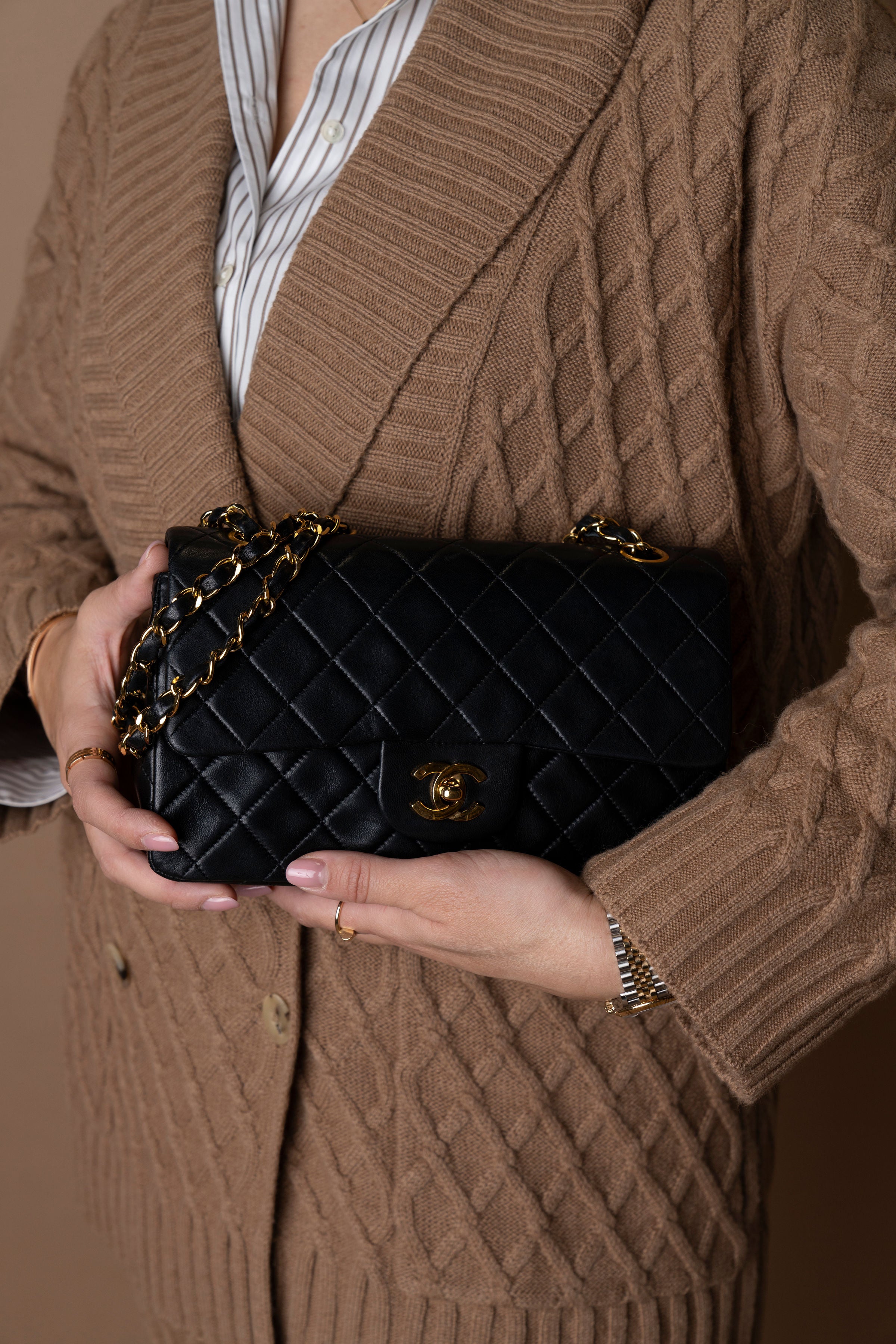 A pala dupla — assinatura dos designs mais emblemáticos de Coco Chanel — revela um interior meticulosamente construído, pensado para quem aprecia luxo discreto. O fecho CC turn-lock, em metal banhado a ouro, irradia um brilho profundo e característico das criações vintage da casa, elevando a peça a um patamar de autenticidade e raridade.