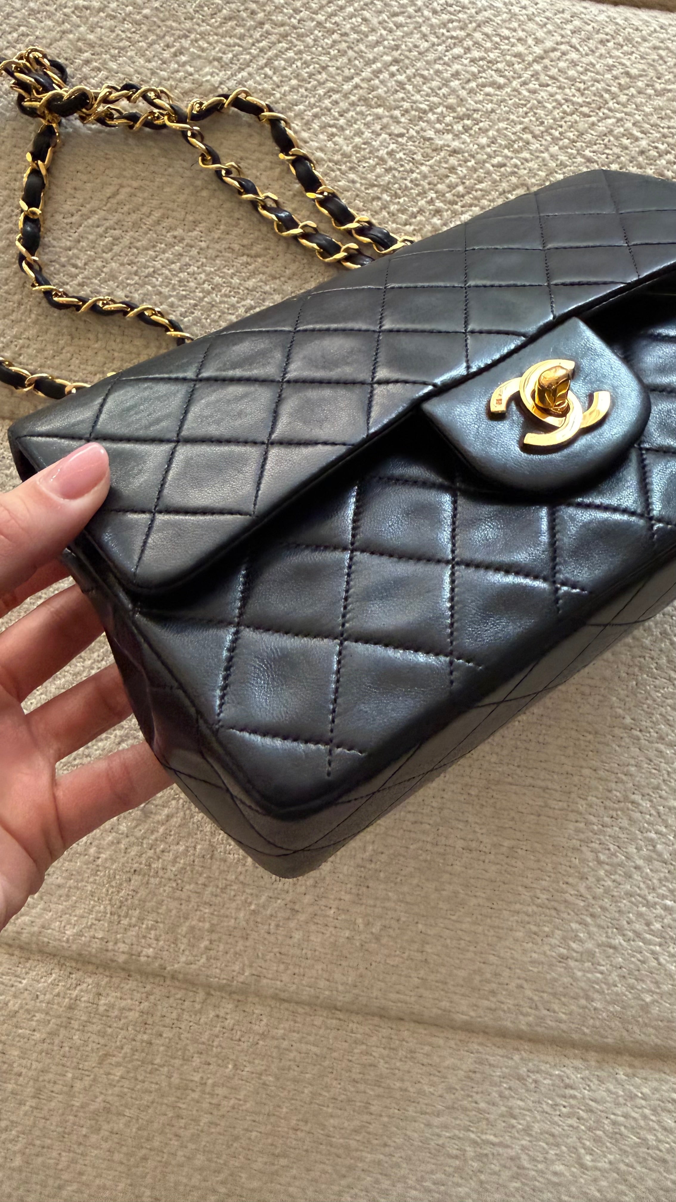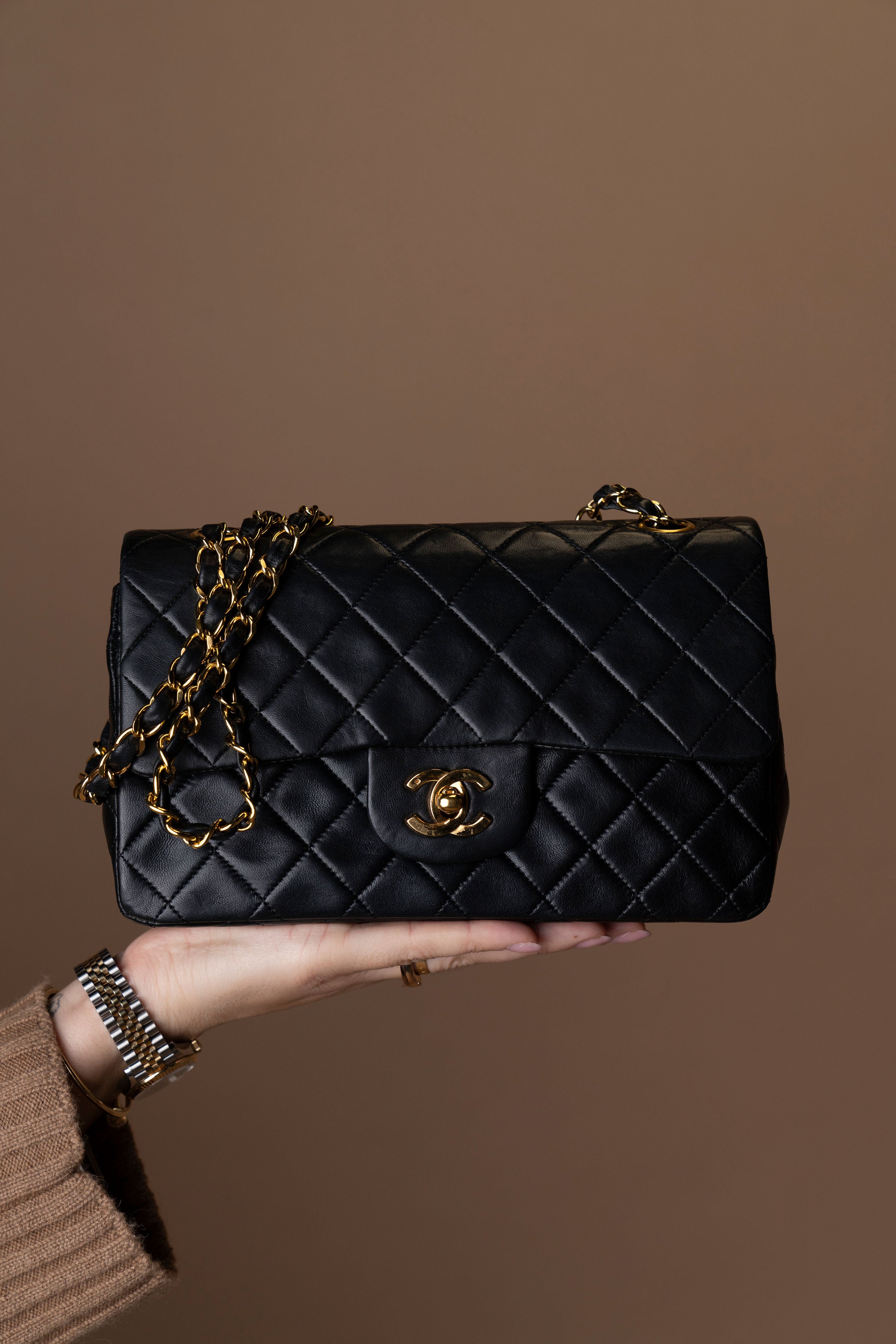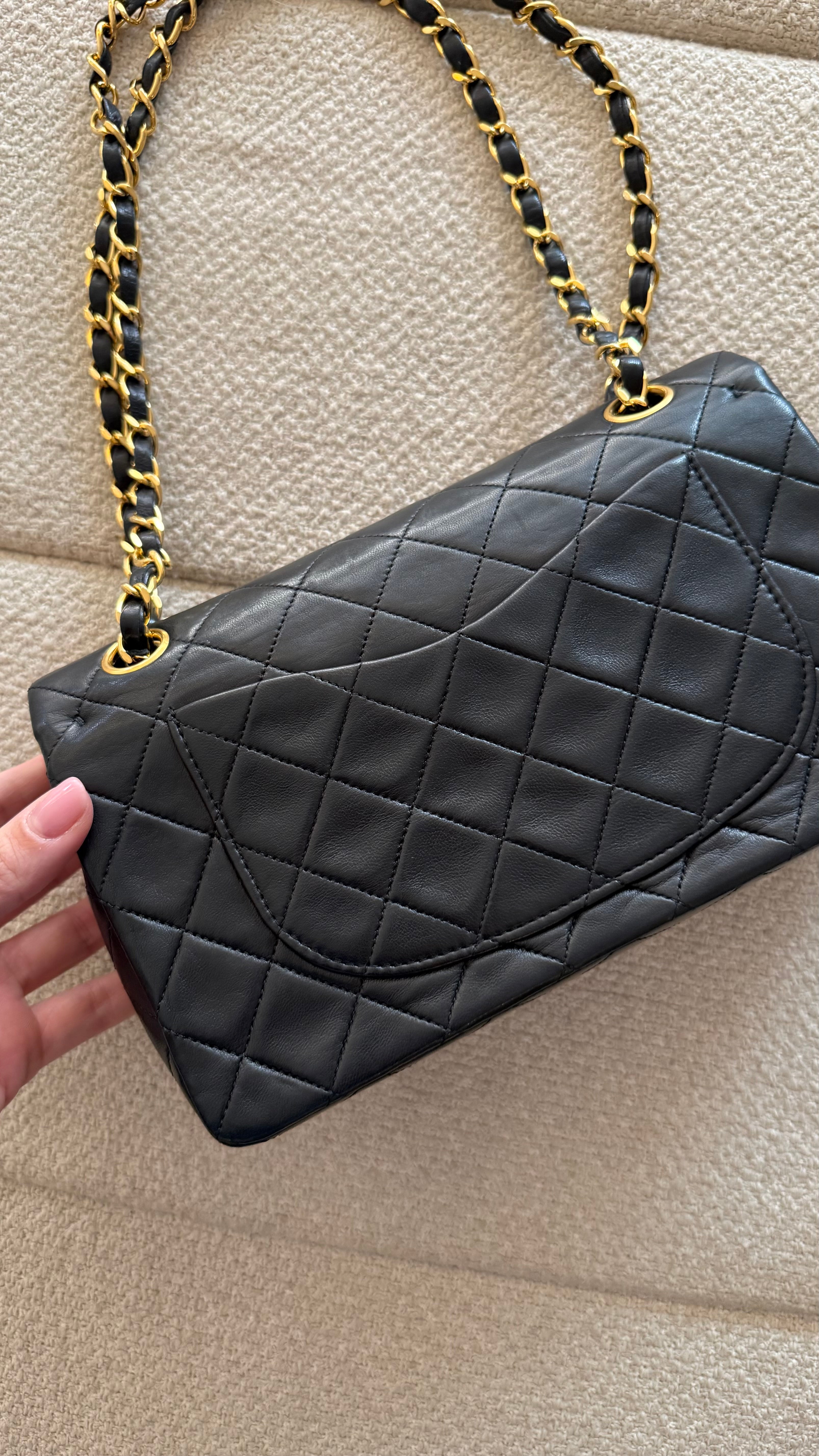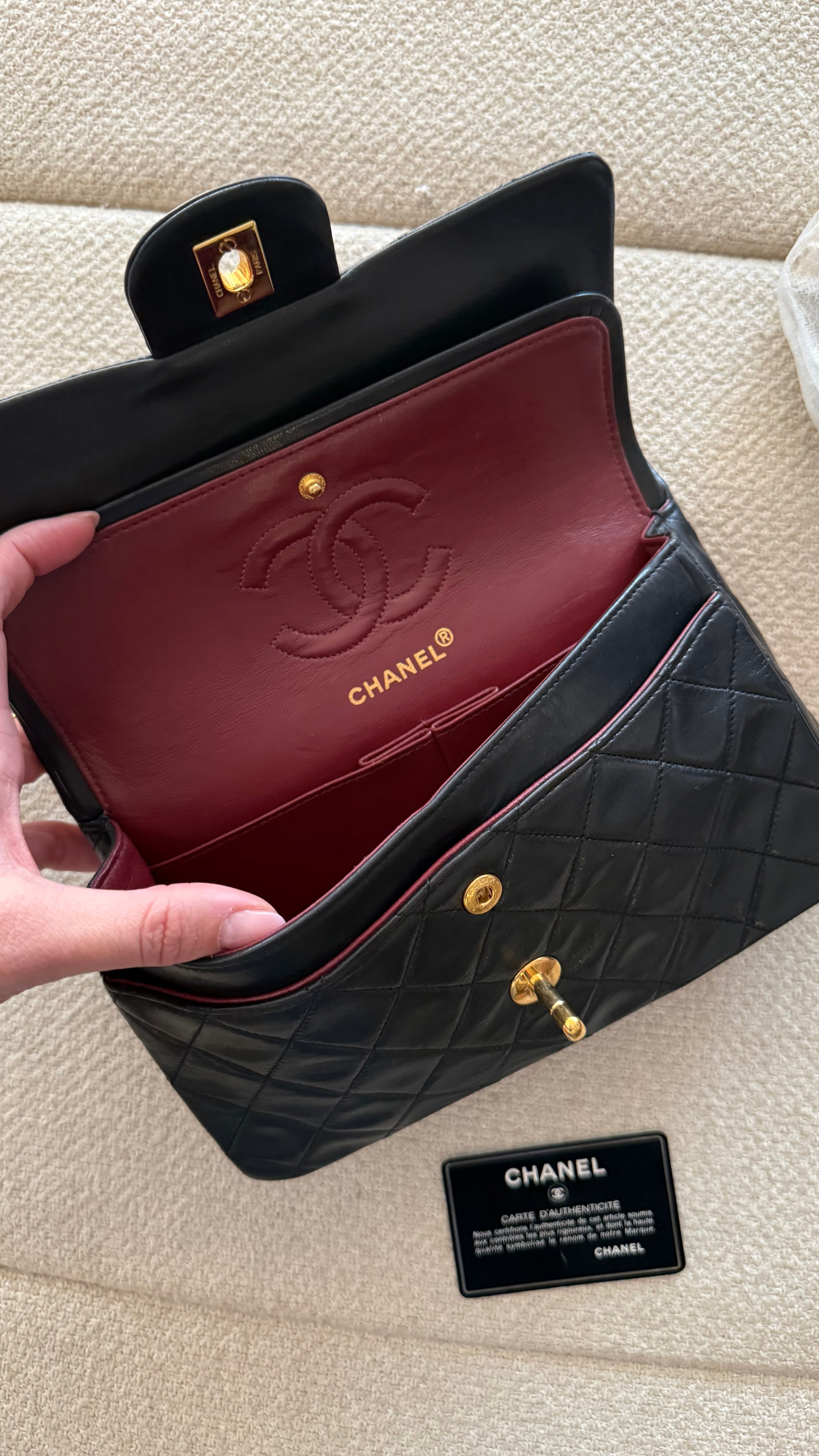 A pala dupla — assinatura dos designs mais emblemáticos de Coco Chanel — revela um interior meticulosamente construído, pensado para quem aprecia luxo discreto. O fecho CC turn-lock, em metal banhado a ouro, irradia um brilho profundo e característico das criações vintage da casa, elevando a peça a um patamar de autenticidade e raridade.