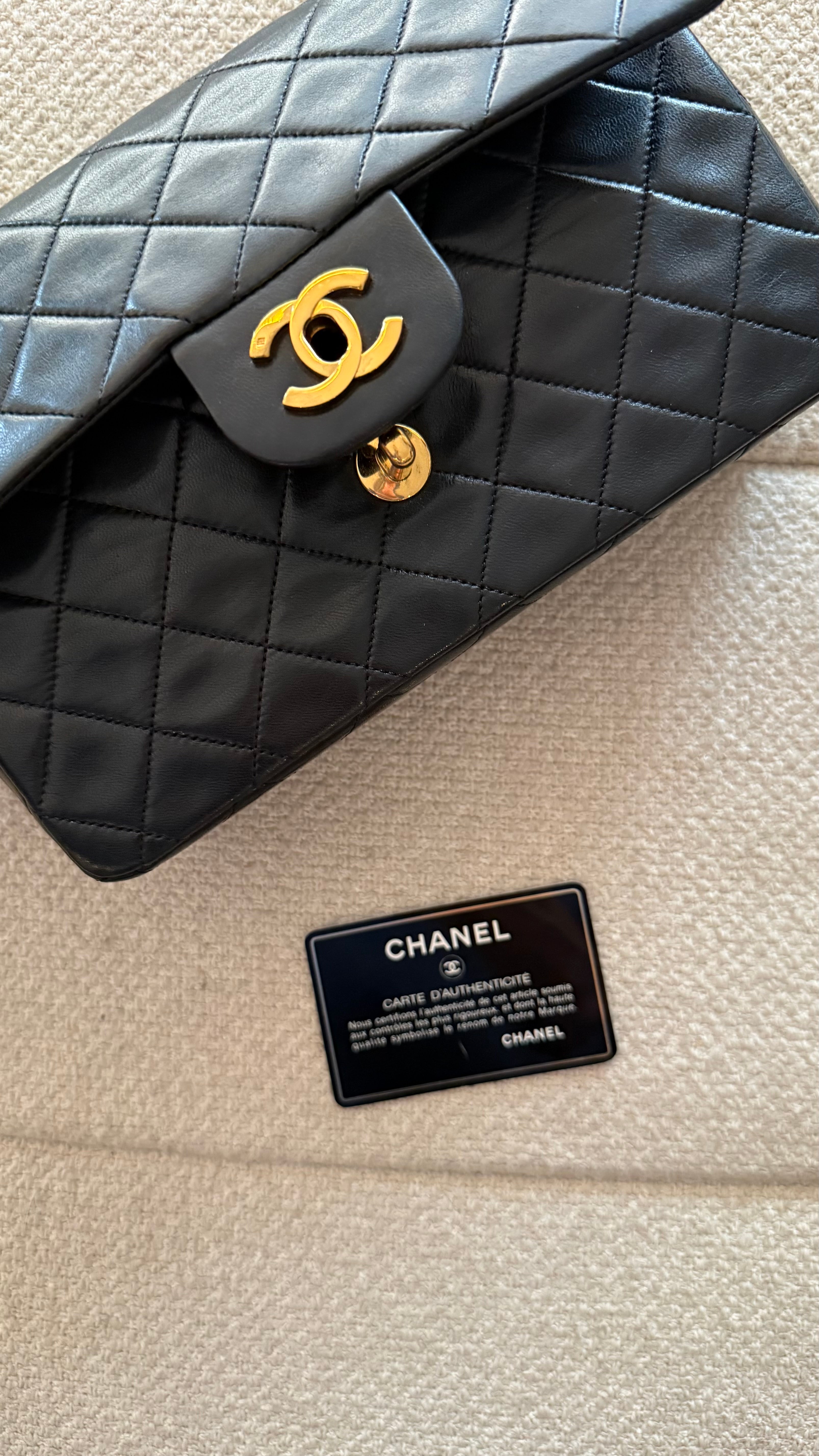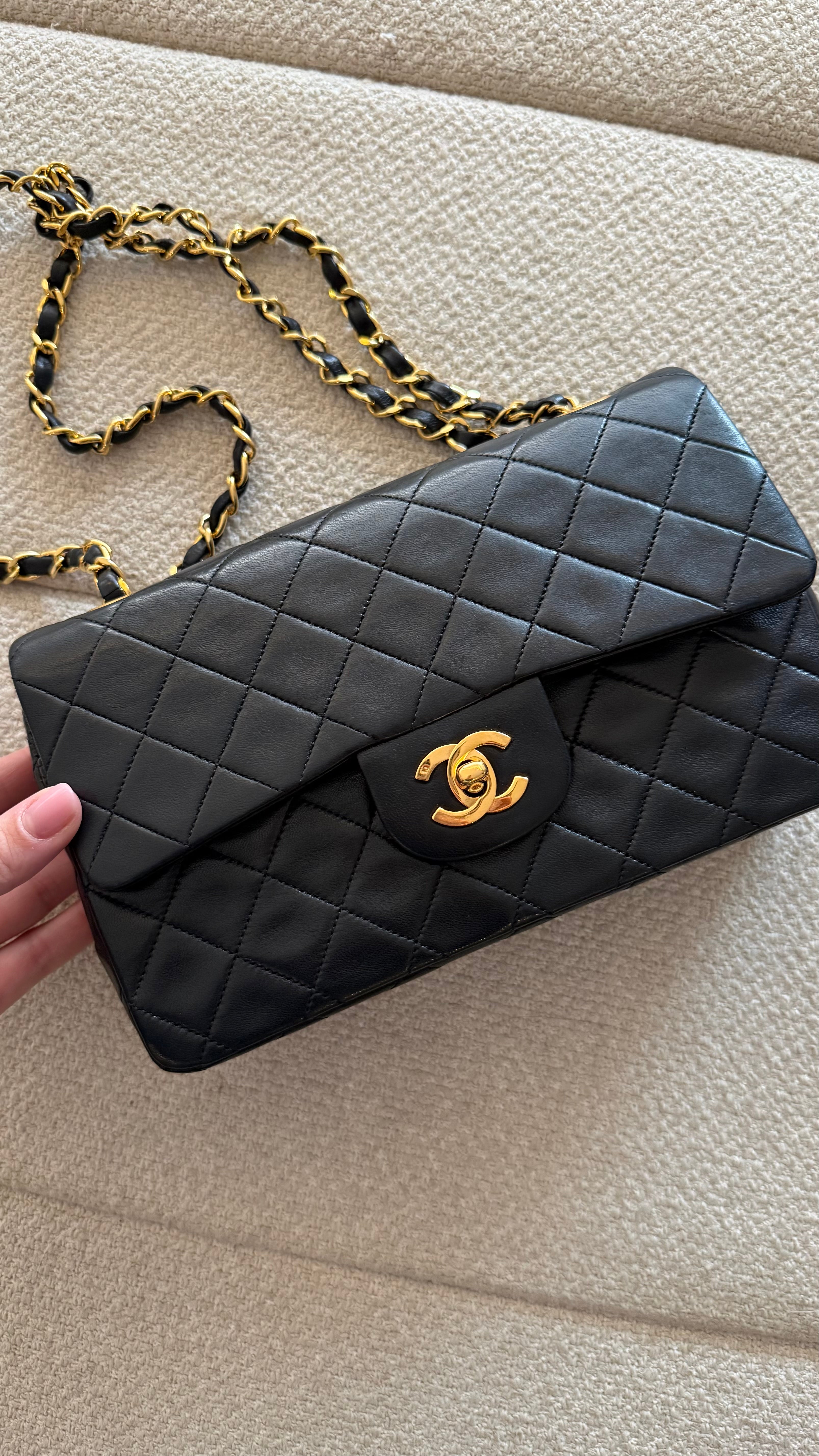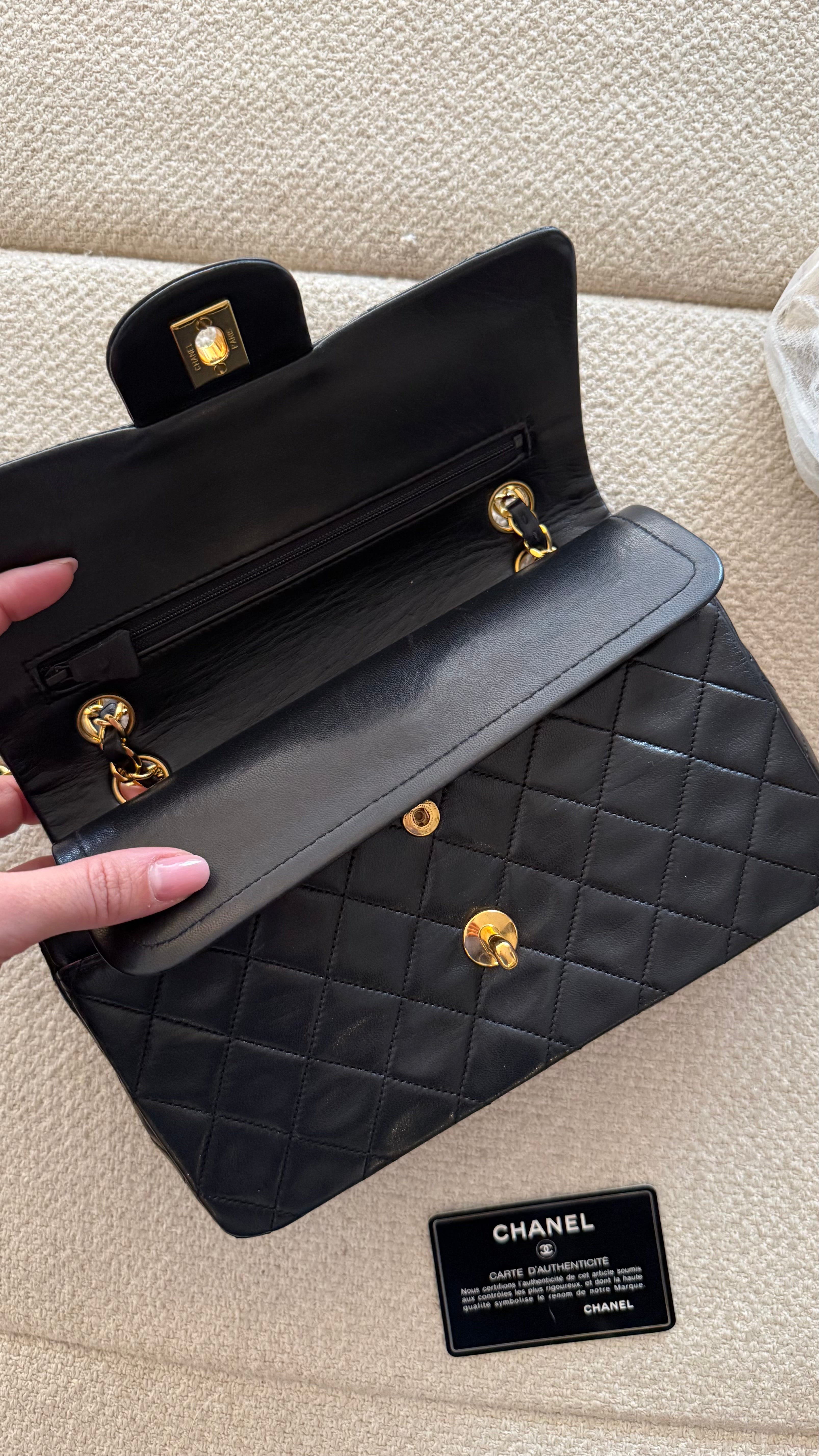 Uma peça de culto da Maison Chanel, este Classic Double Flap Small vintage é a expressão máxima da elegância parisiense. Confeccionado em pele preta de toque suave, exibindo o icónico matelassé em losangos, o modelo combina tradição, precisão artesanal e intemporalidade.