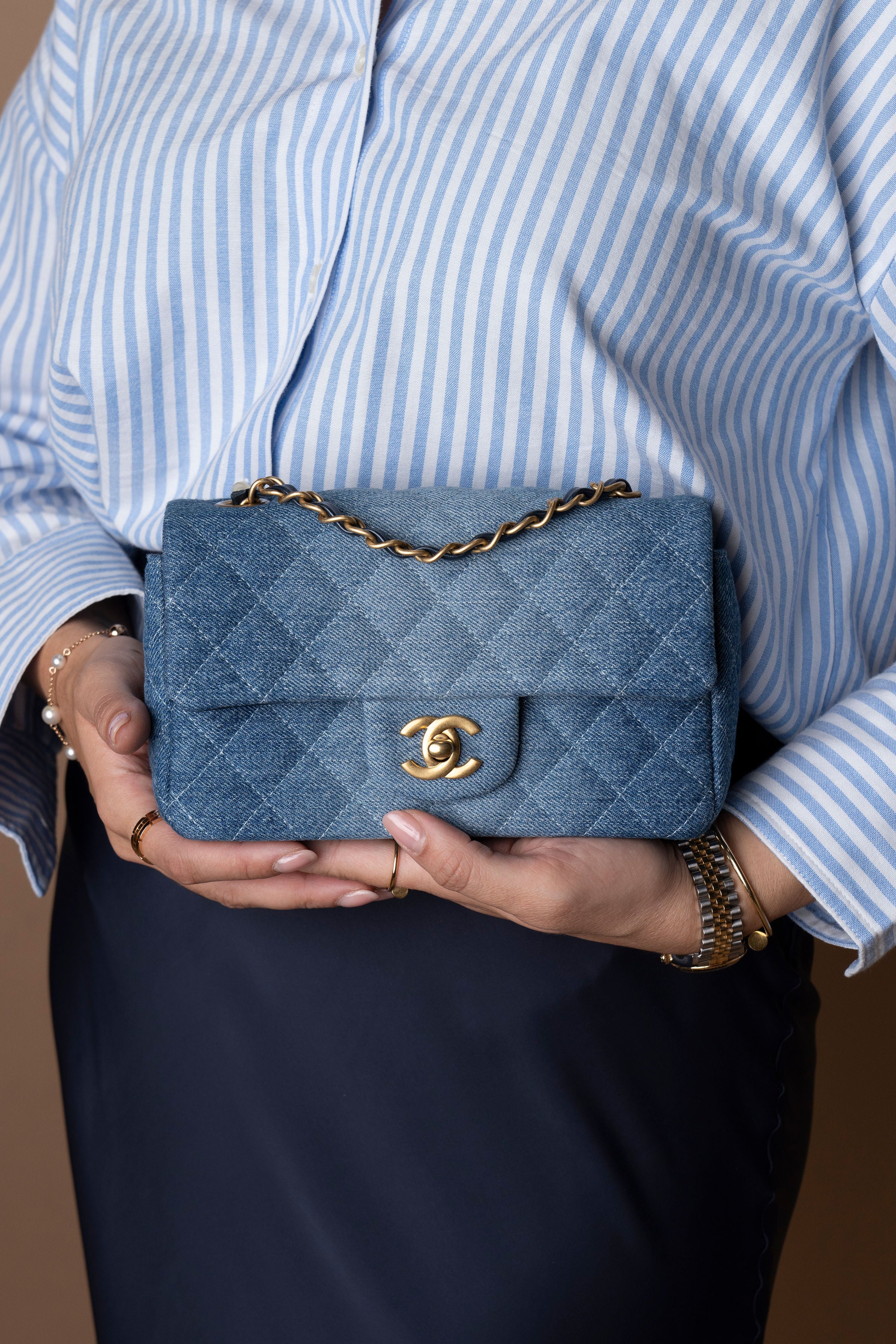 A Chanel Denim Mini Flap Bag é uma versão descontraída e moderna do icónico modelo Classic Flap da maison francesa. Produzida em denim azul, esta bolsa combina o estilo casual do tecido com a elegância e o requinte característicos da Chanel.