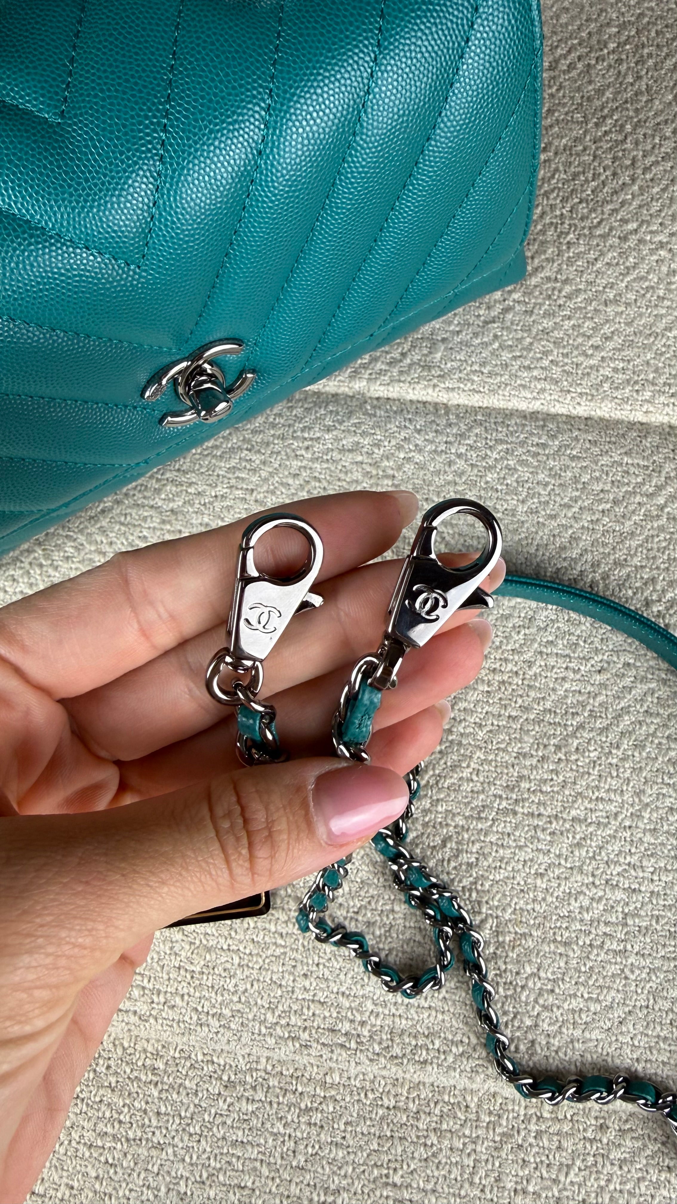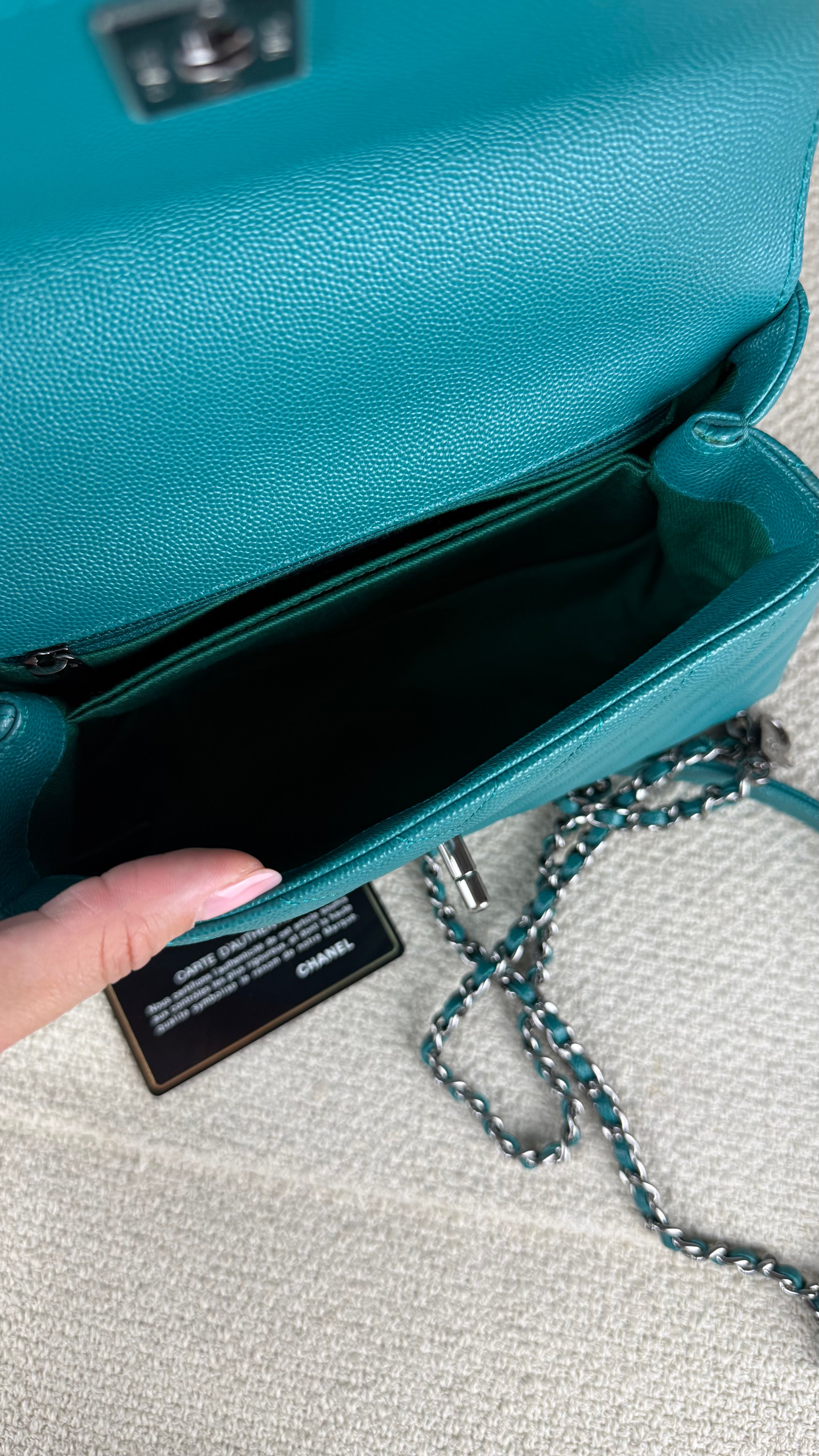 Confeccionada em couro Caviar, conhecido por sua durabilidade e textura levemente granulada, esta bolsa apresenta o emblemático fecho CC turn-lock em metal prateado e a distinta alça superior que adiciona charme e versatilidade.