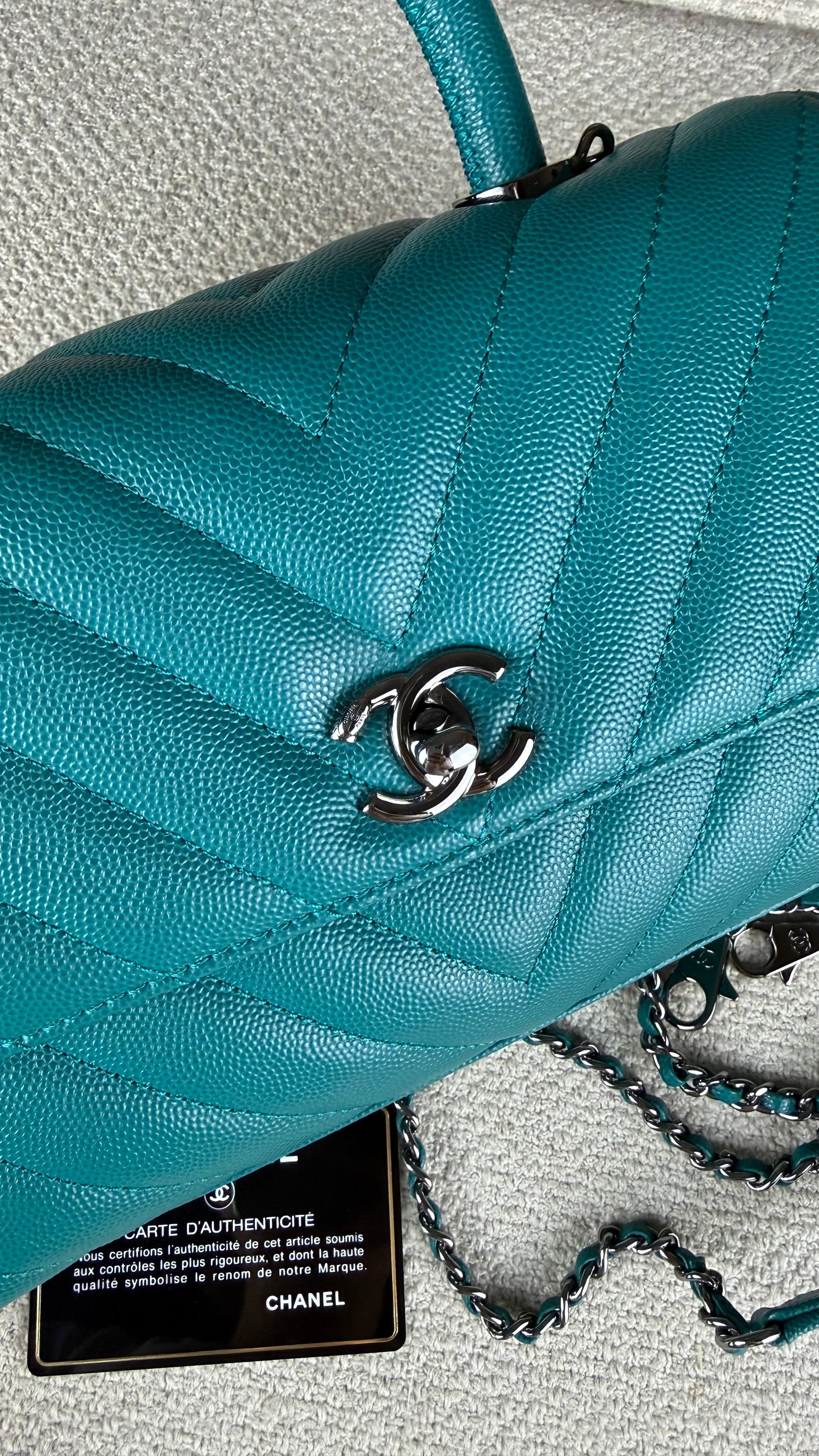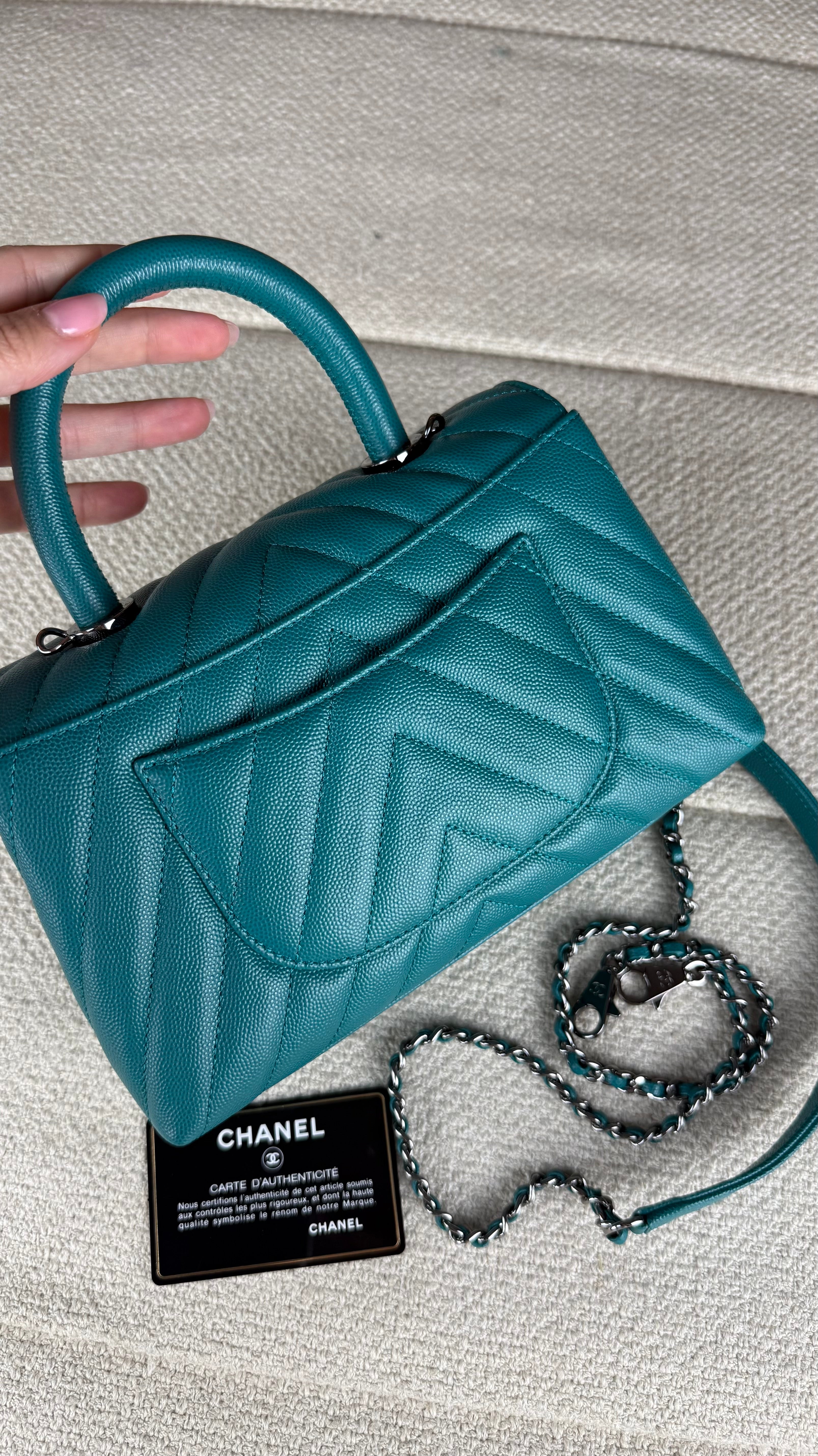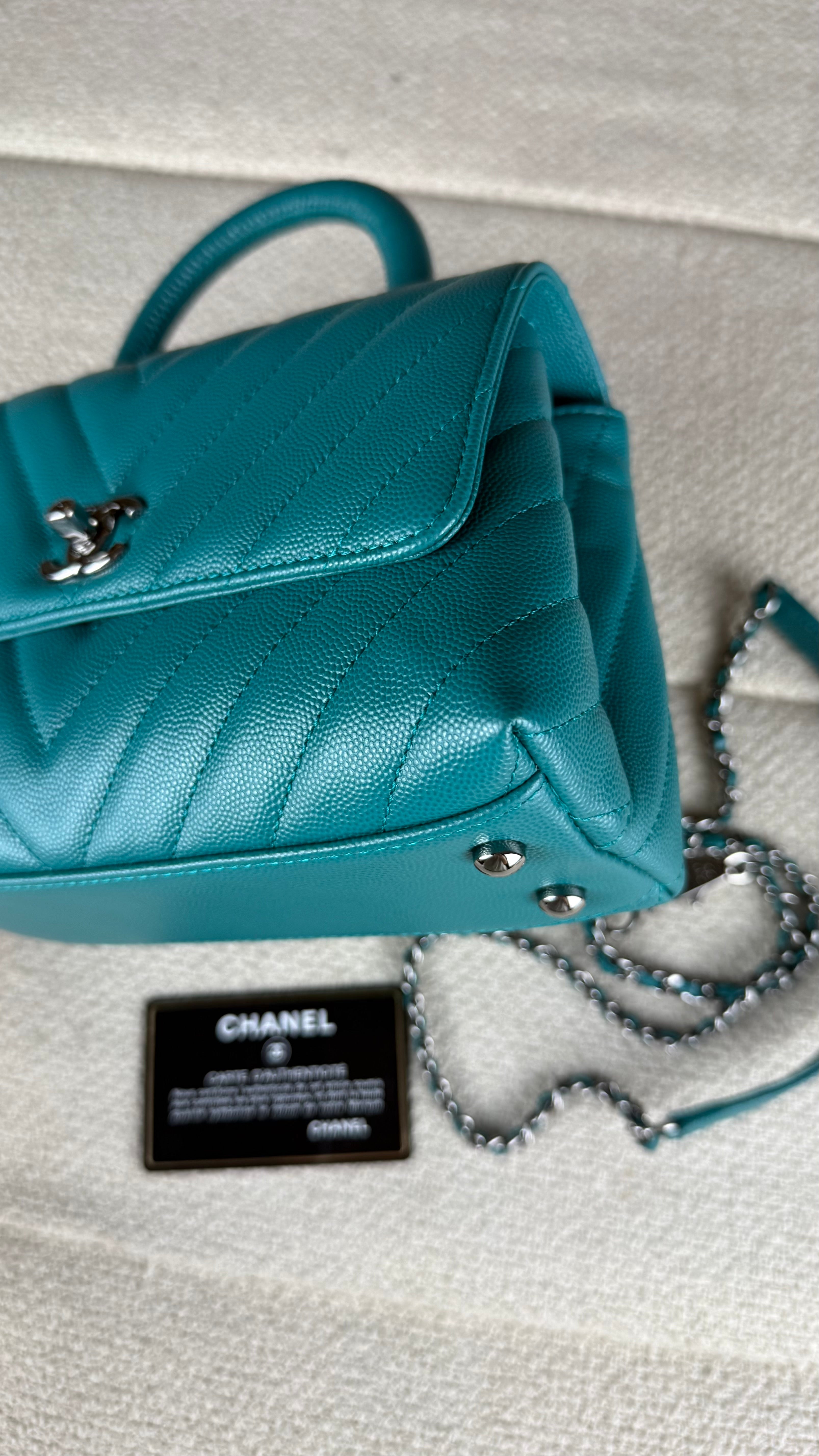 A combinação perfeita entre elegância clássica e sofisticação moderna. A Chanel Mini Coco Handle é uma das peças mais desejadas da maison, trazendo o icônico design estruturado com um toque contemporâneo através do acabamento Chevron (costura em V).