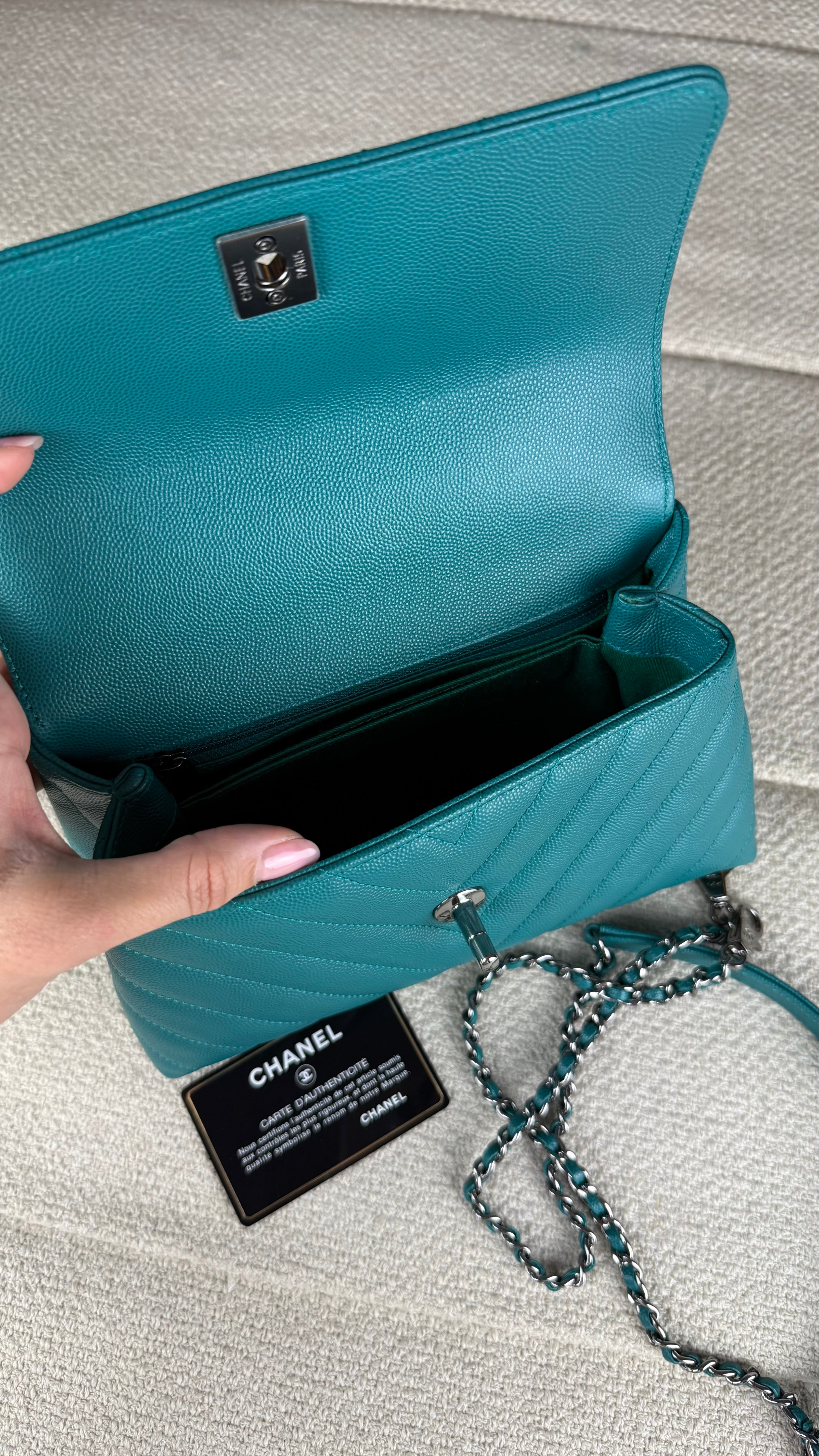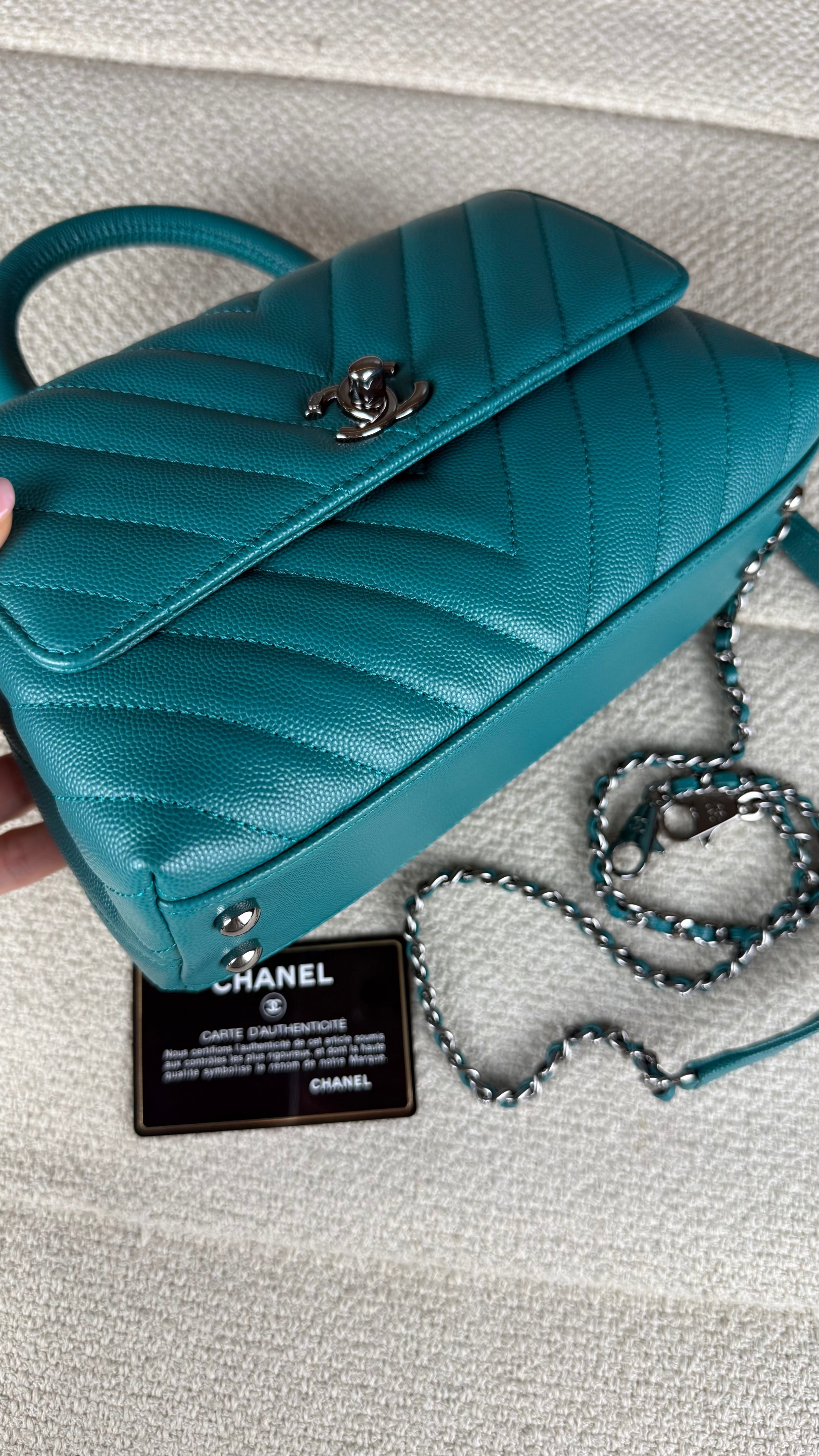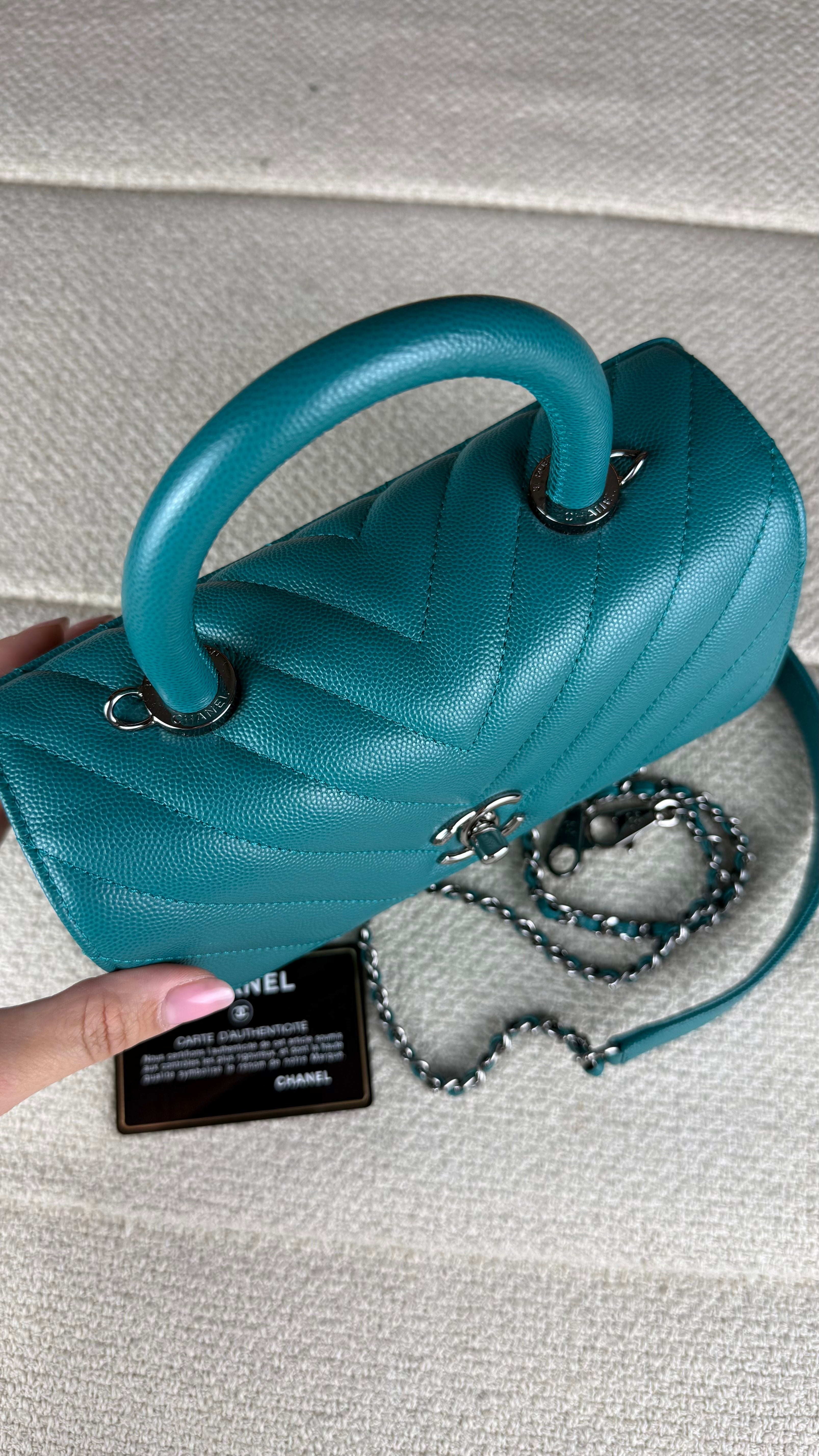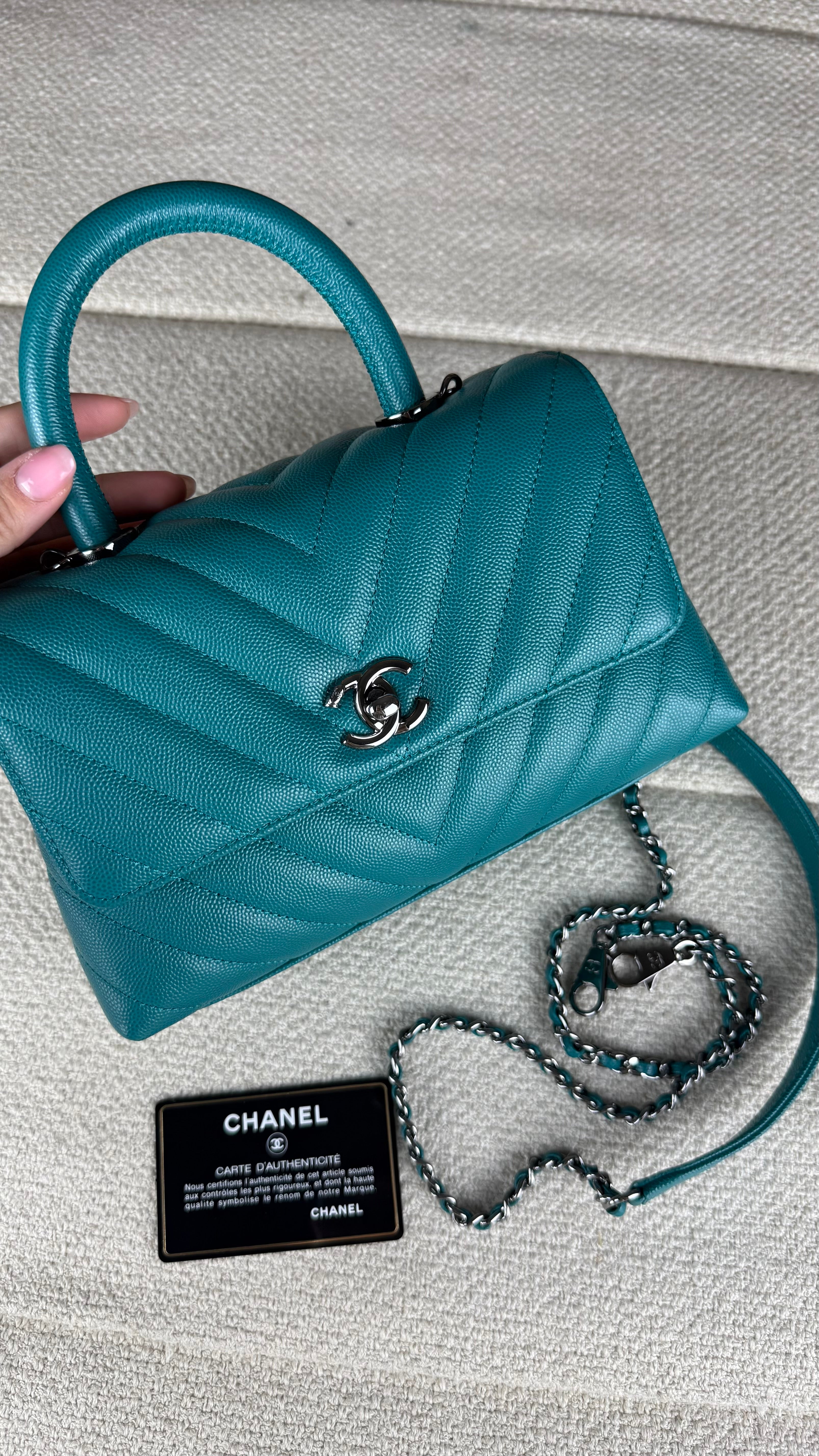 A combinação perfeita entre elegância clássica e sofisticação moderna. A Chanel Mini Coco Handle é uma das peças mais desejadas da maison, trazendo o icônico design estruturado com um toque contemporâneo através do acabamento Chevron (costura em V).