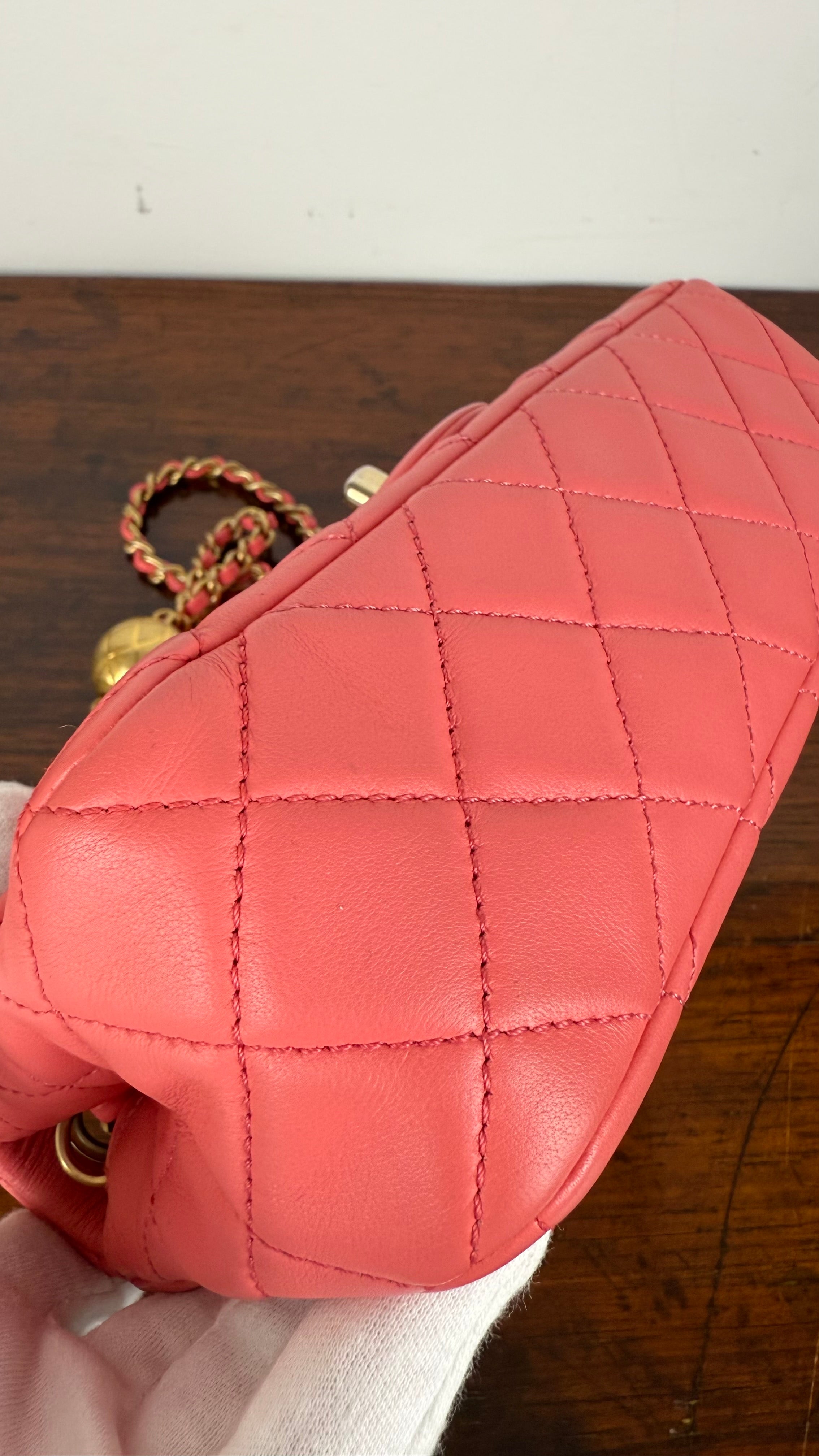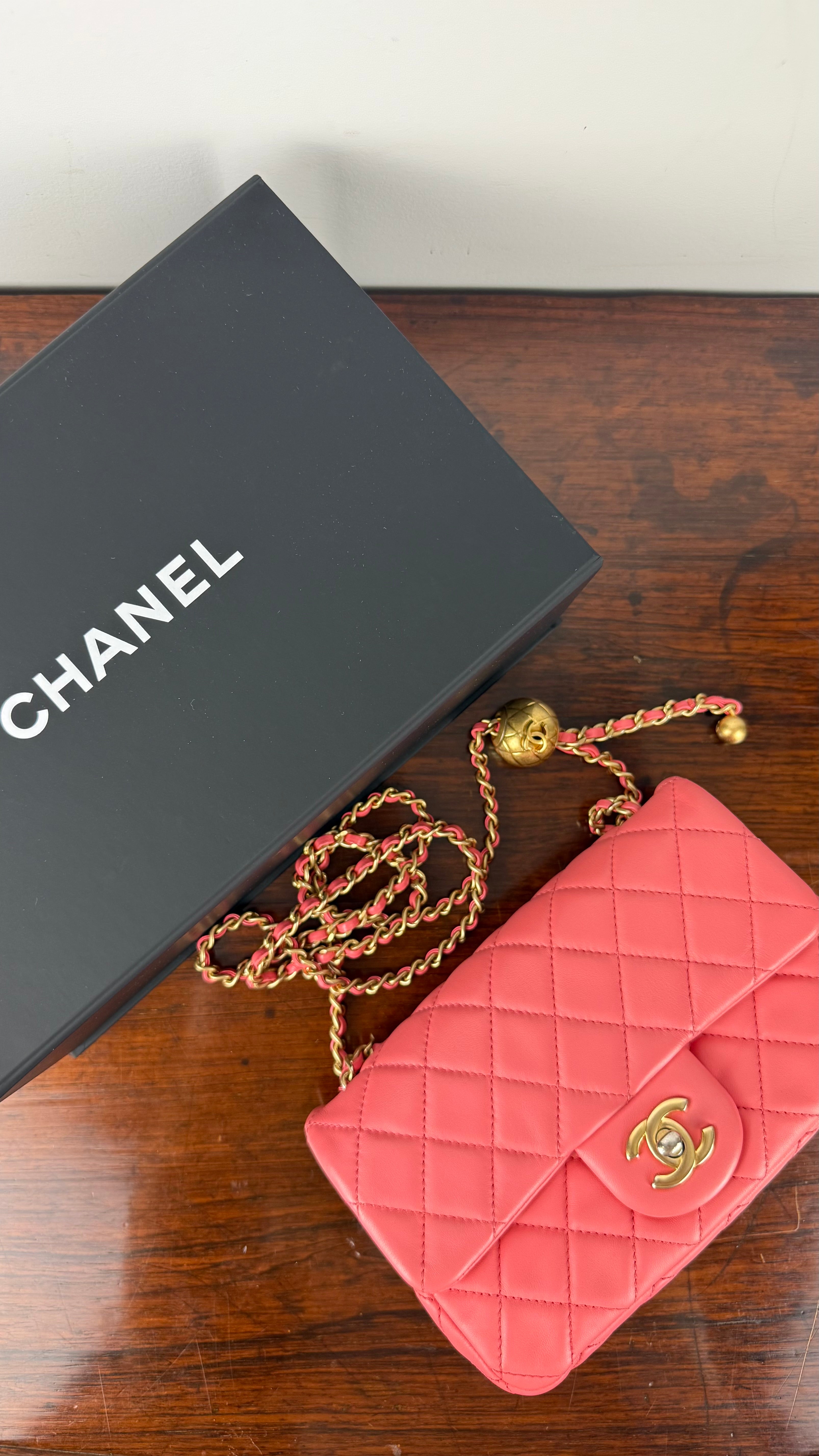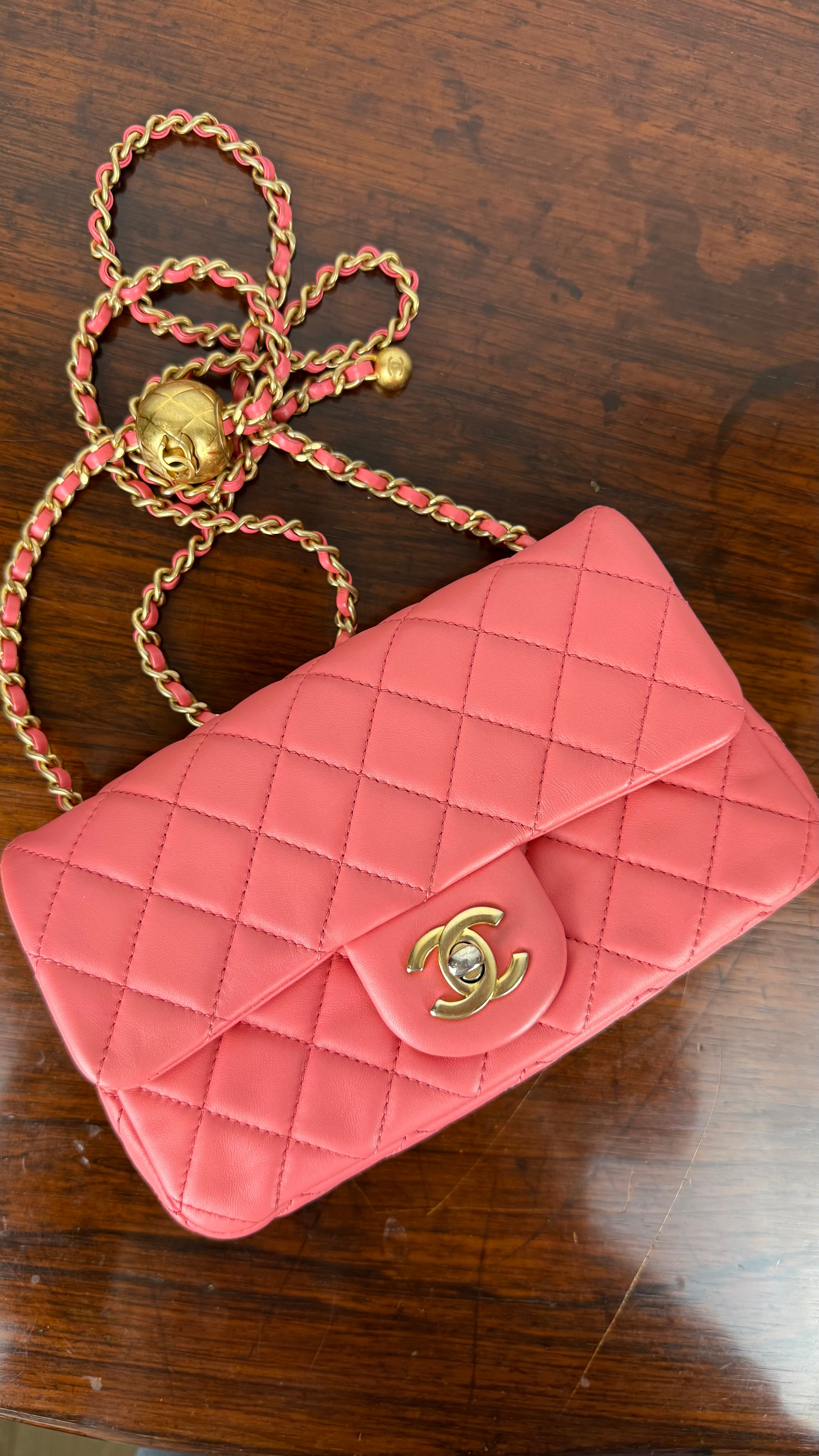 Esta mala Chanel Mini Flap distingue-se pelo design intemporal da maison, enriquecido com um detalhe moderno e feminino: a corrente de ombro rematada por uma pérola oversized em metal dourado, elemento icónico introduzido nas coleções mais recentes da marca.