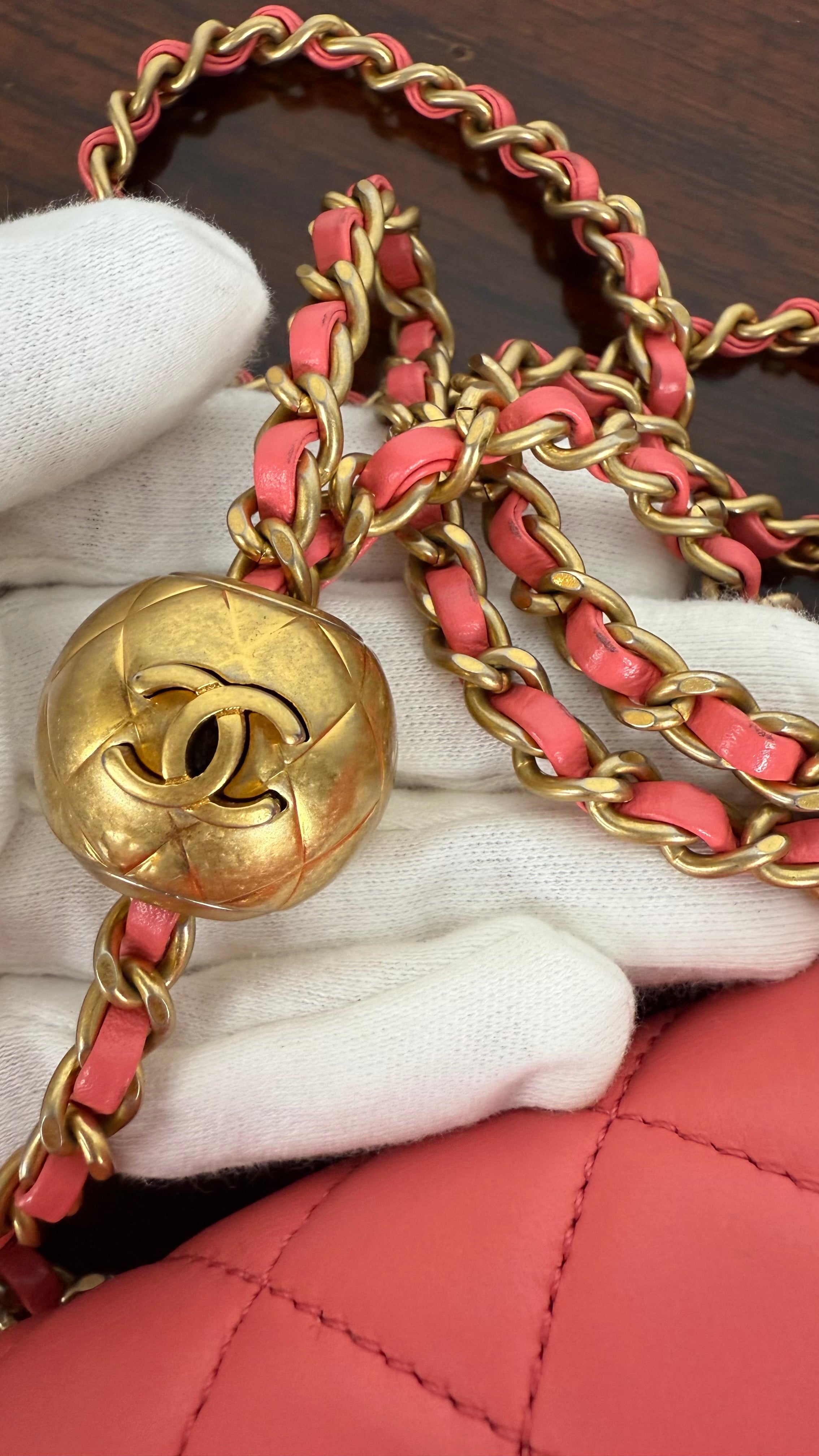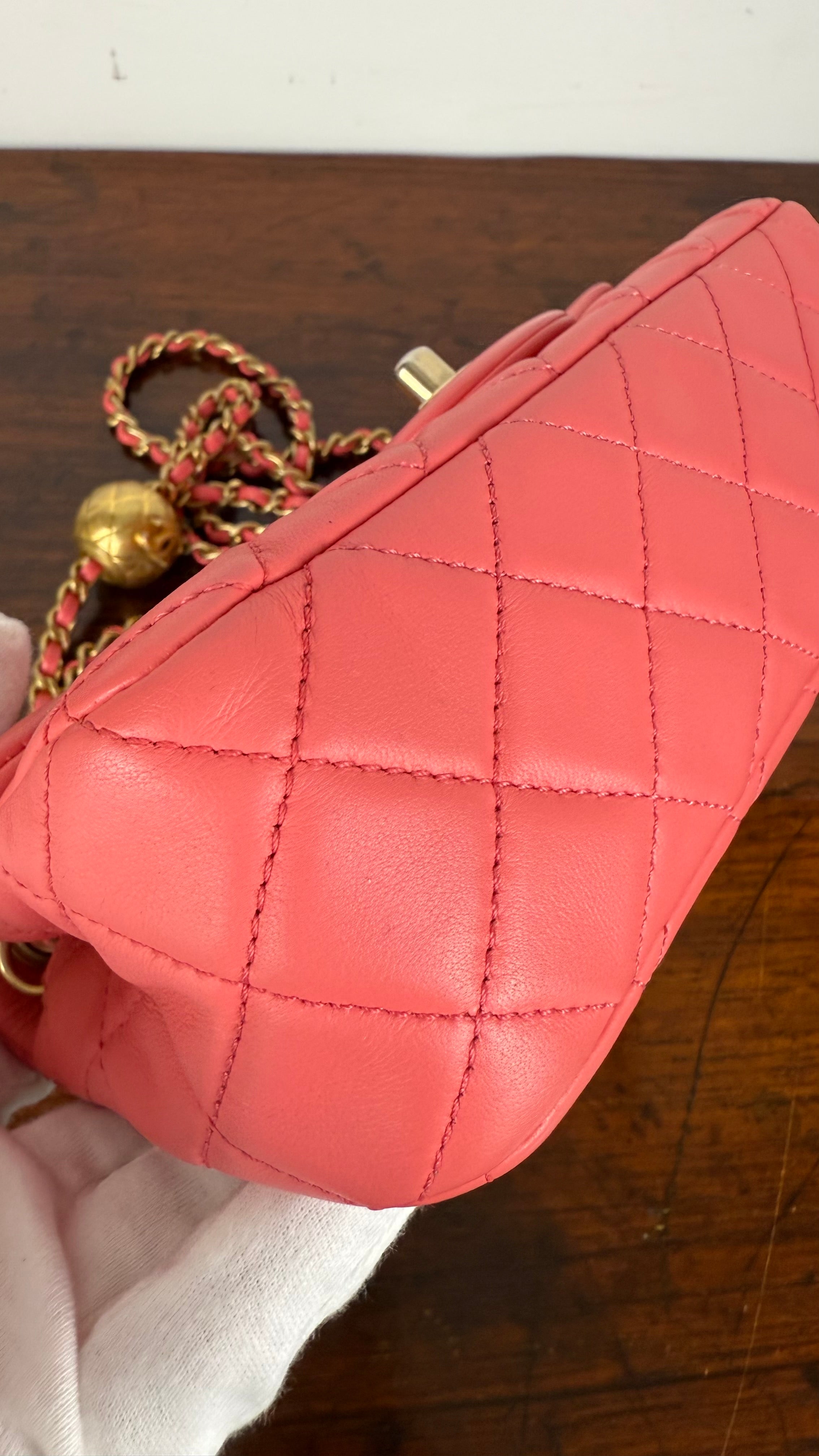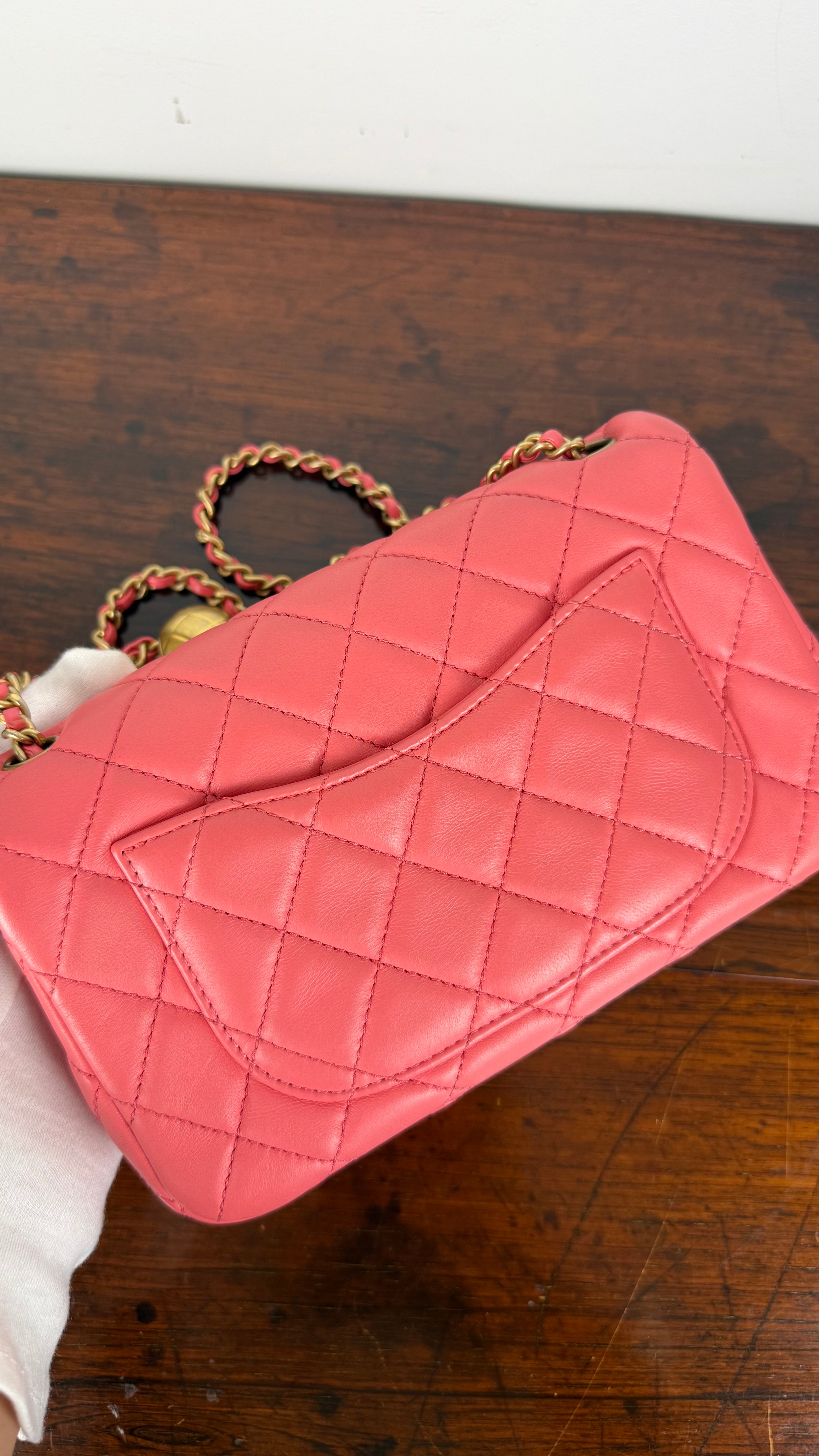 Esta mala Chanel Mini Flap distingue-se pelo design intemporal da maison, enriquecido com um detalhe moderno e feminino: a corrente de ombro rematada por uma pérola oversized em metal dourado, elemento icónico introduzido nas coleções mais recentes da marca.