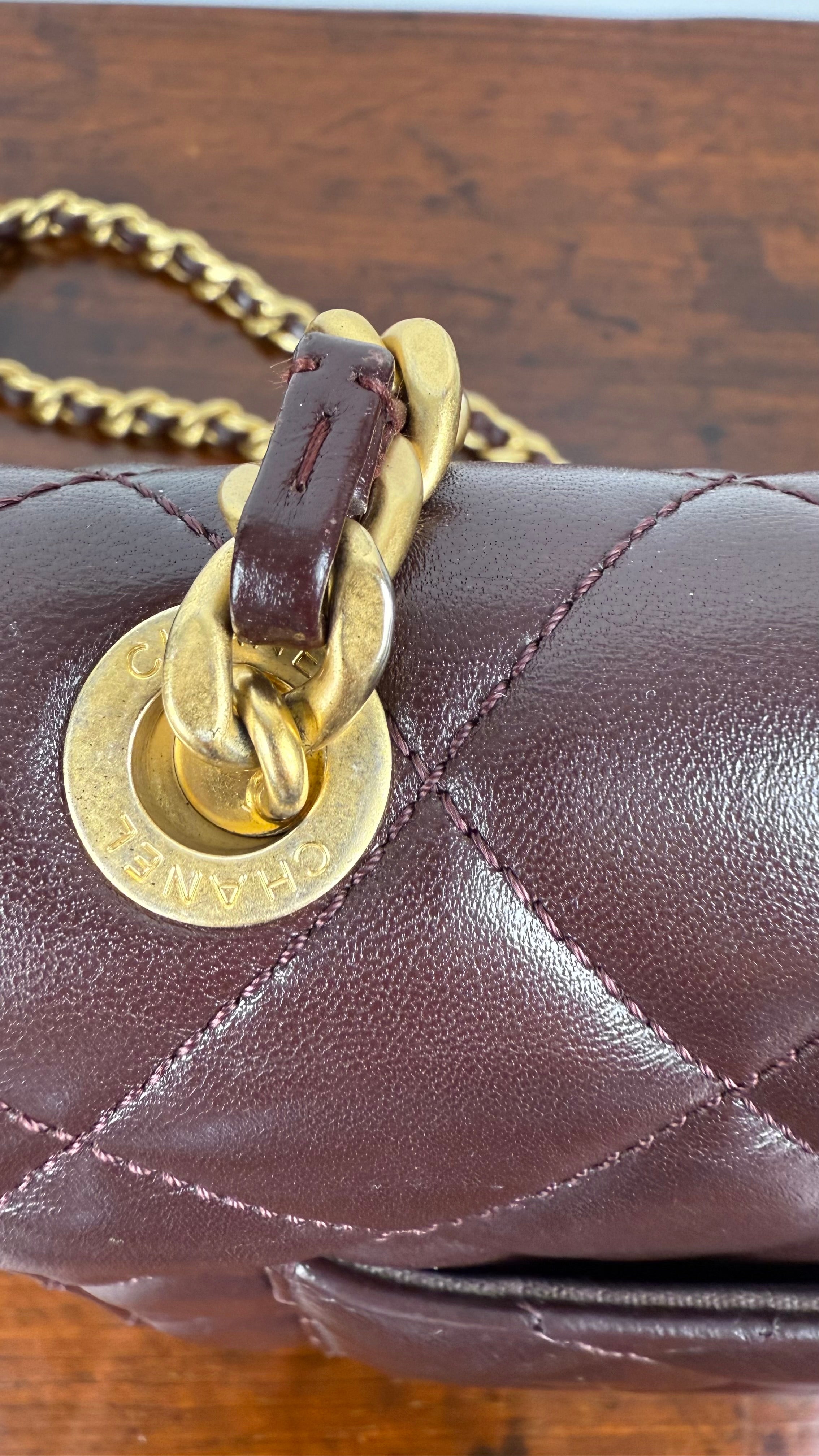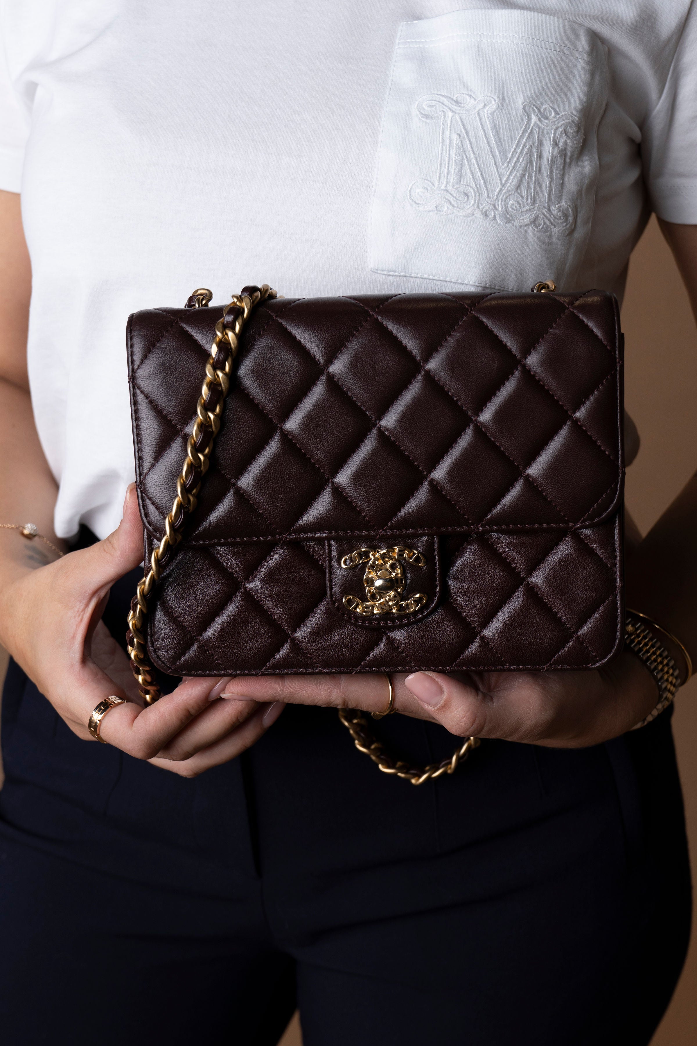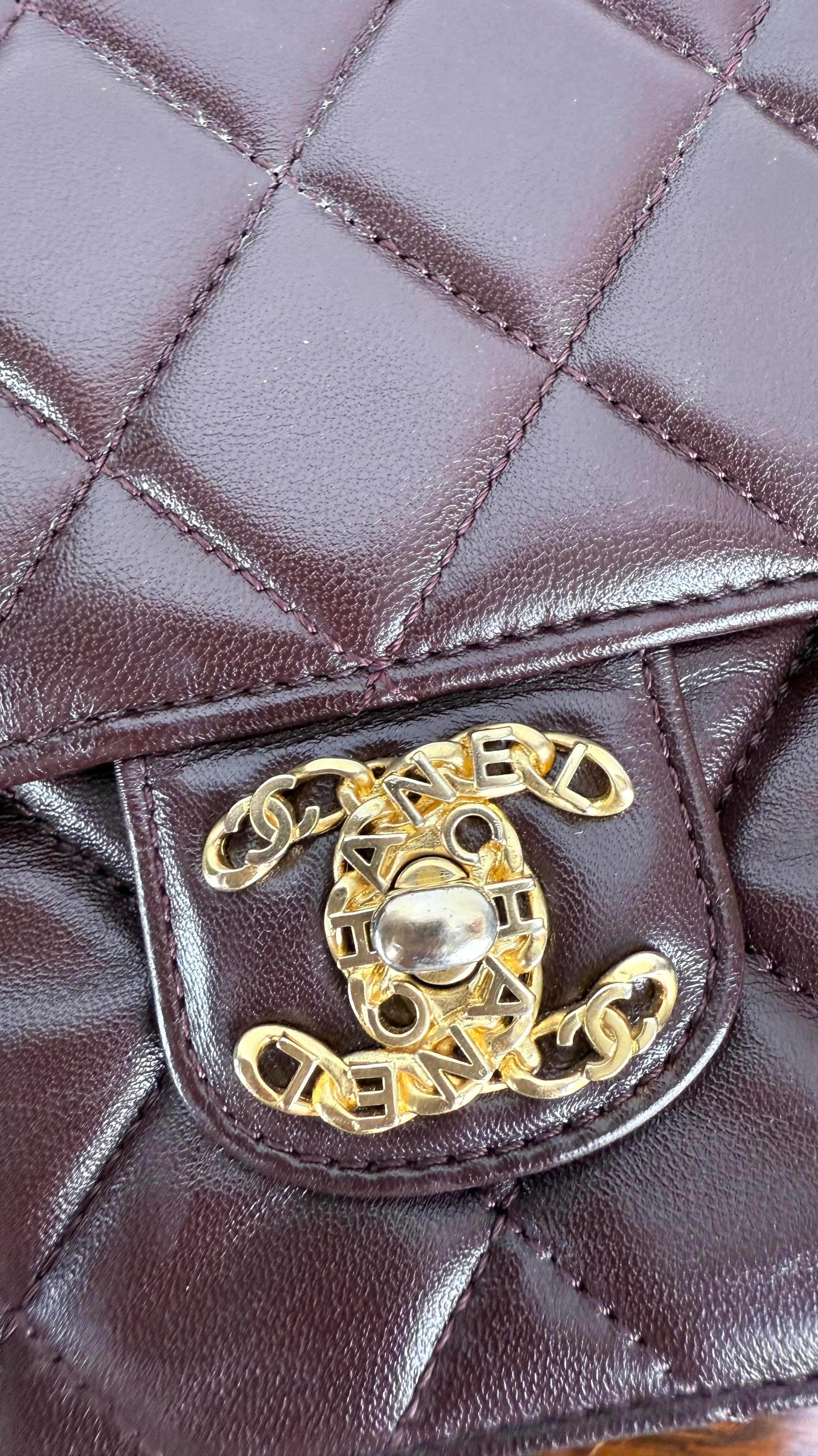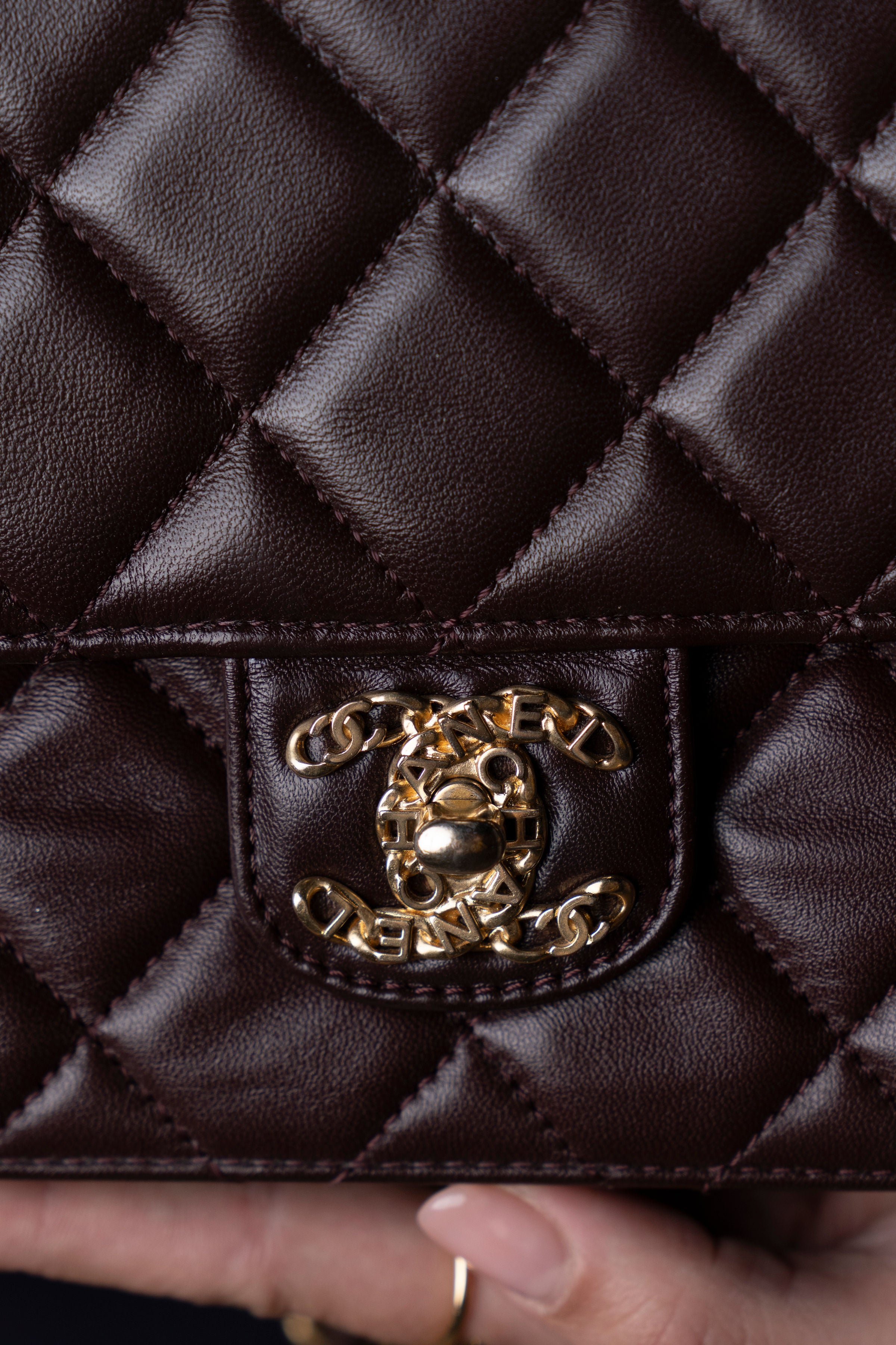 Bolsa Chanel Mini Single Flap em couro lambskin castanho chocolate com acabamento levemente brilhoso. Apresenta o icônico matelassê em padrão losango, a tradicional alça de corrente dourada entrelaçada em couro, e o sofisticado fecho CC turn-lock em metal dourado envelhecido, com detalhes em lettering CHANEL.
