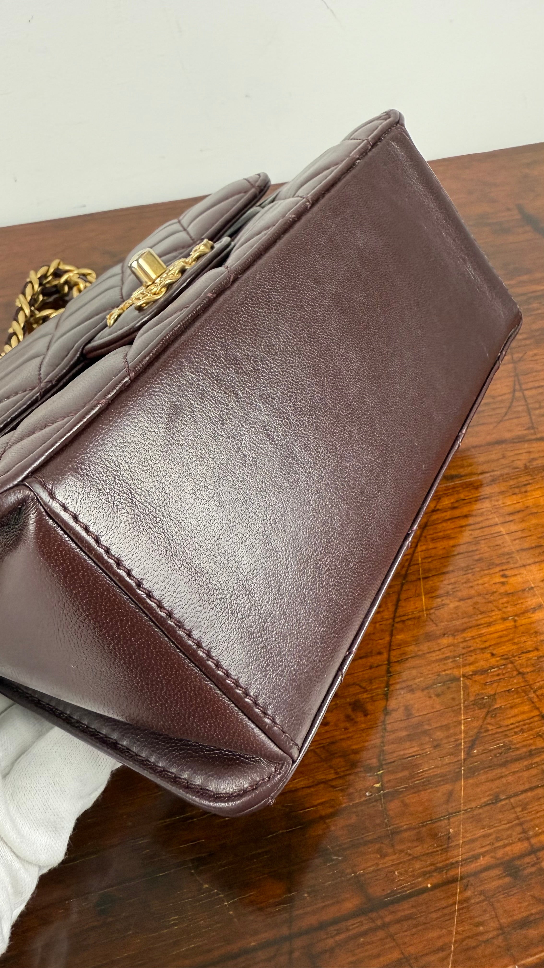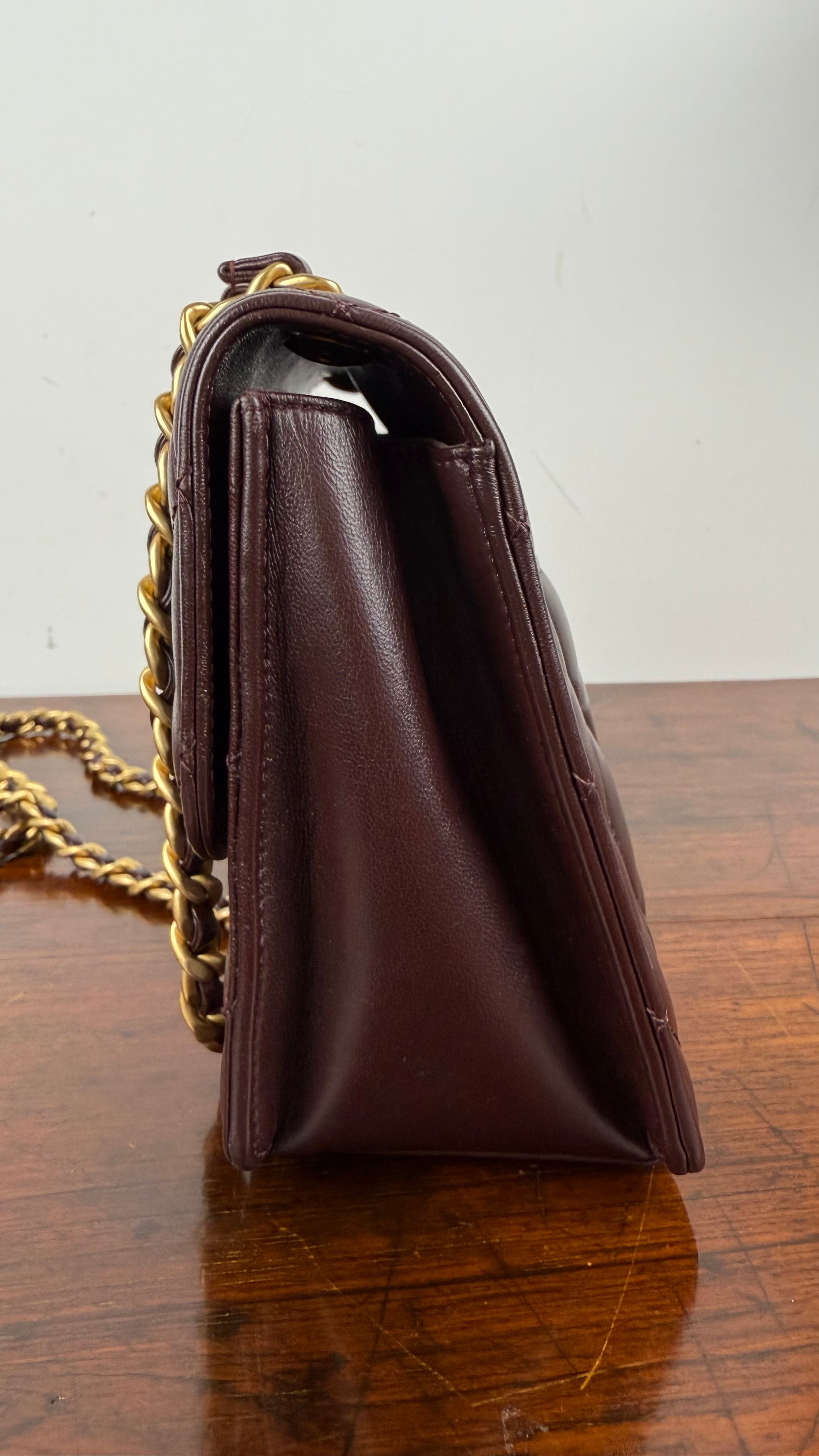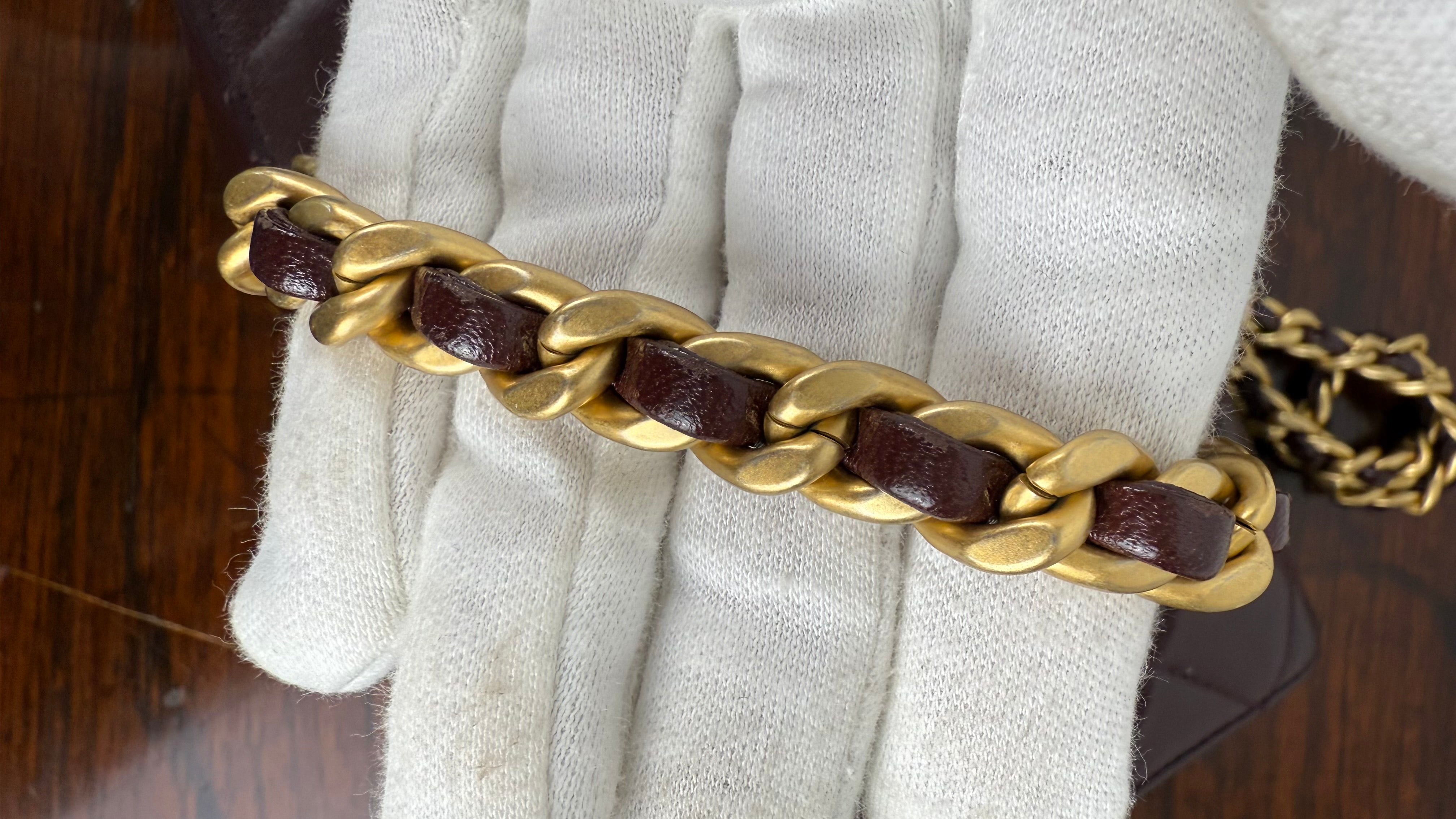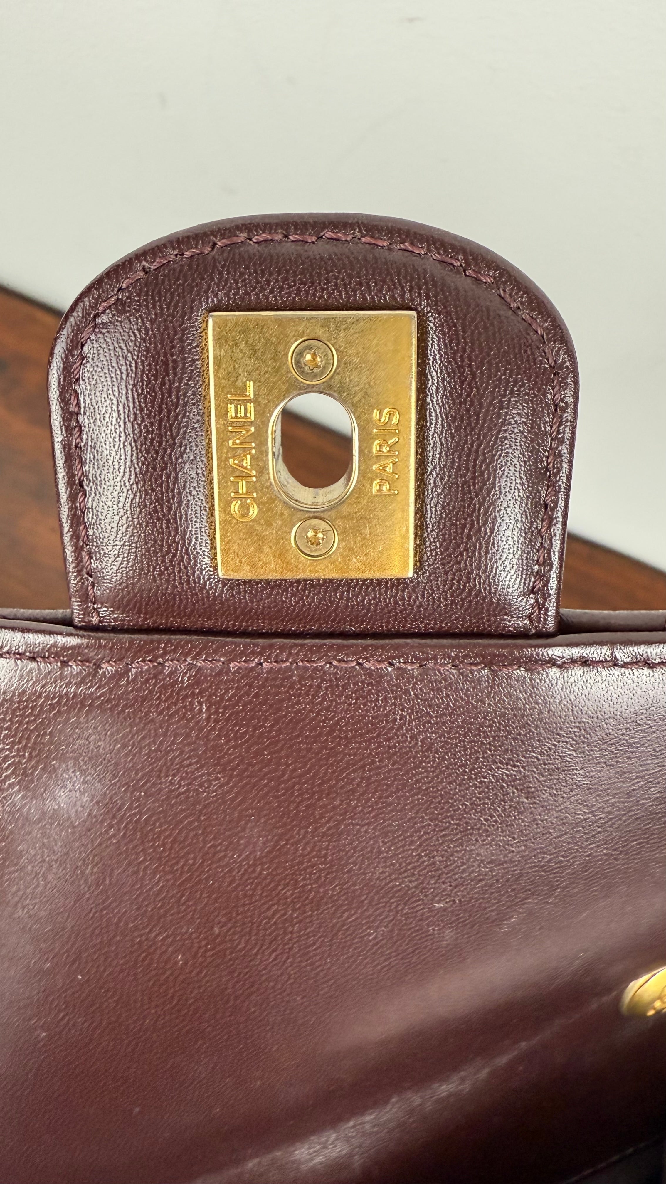 Bolsa Chanel Mini Single Flap em couro lambskin castanho chocolate com acabamento levemente brilhoso. Apresenta o icônico matelassê em padrão losango, a tradicional alça de corrente dourada entrelaçada em couro, e o sofisticado fecho CC turn-lock em metal dourado envelhecido, com detalhes em lettering CHANEL.