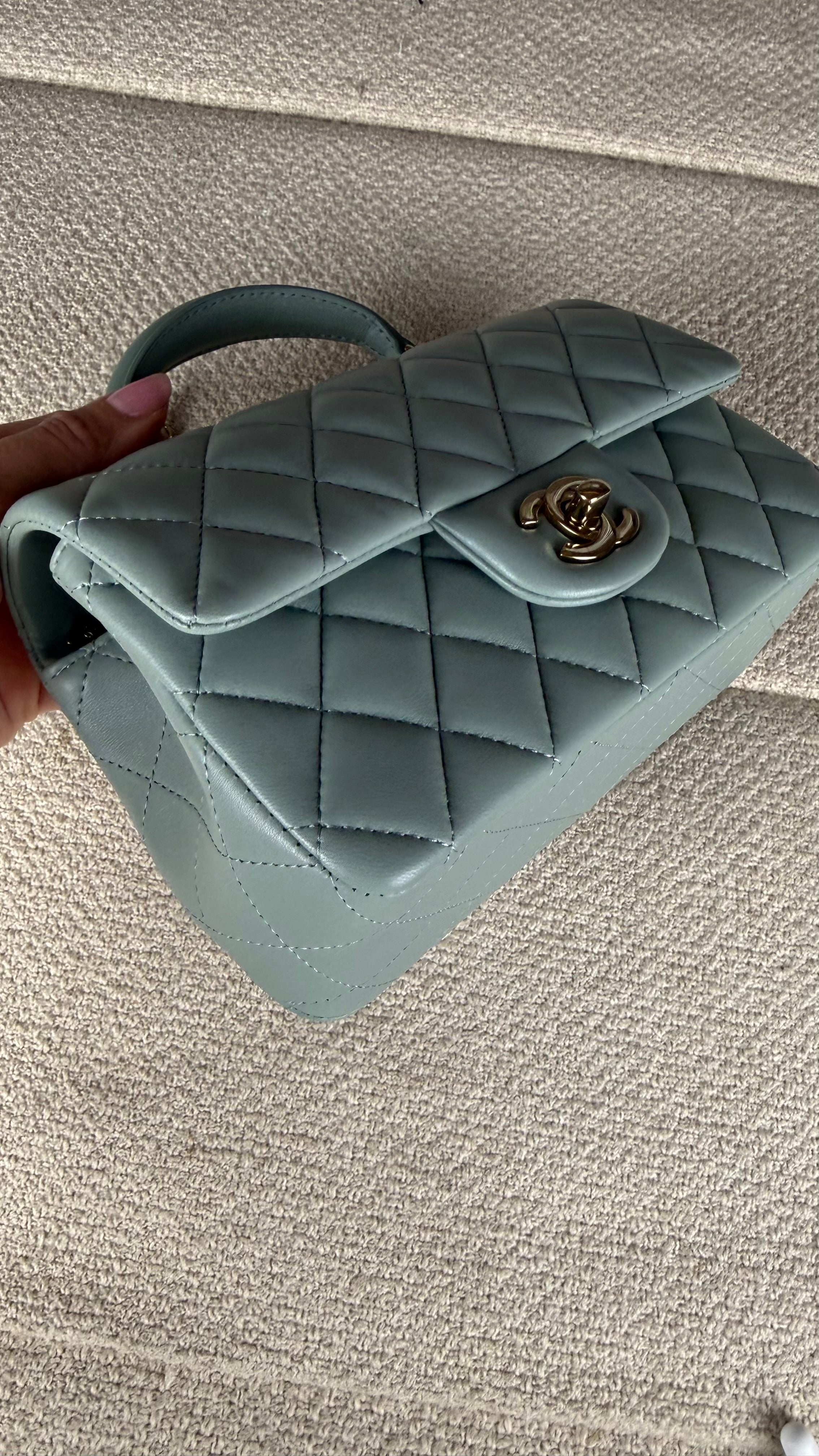 Um ícone de elegância atemporal, a Chanel Mini Top Handle Single Flap combina o design clássico da maison francesa com um toque contemporâneo. Confeccionada em couro macio com o inconfundível matelassê Chanel, esta bolsa apresenta o fecho CC turn-lock em metal dourado envelhecido e o icônico entrelaçamento de couro e corrente.