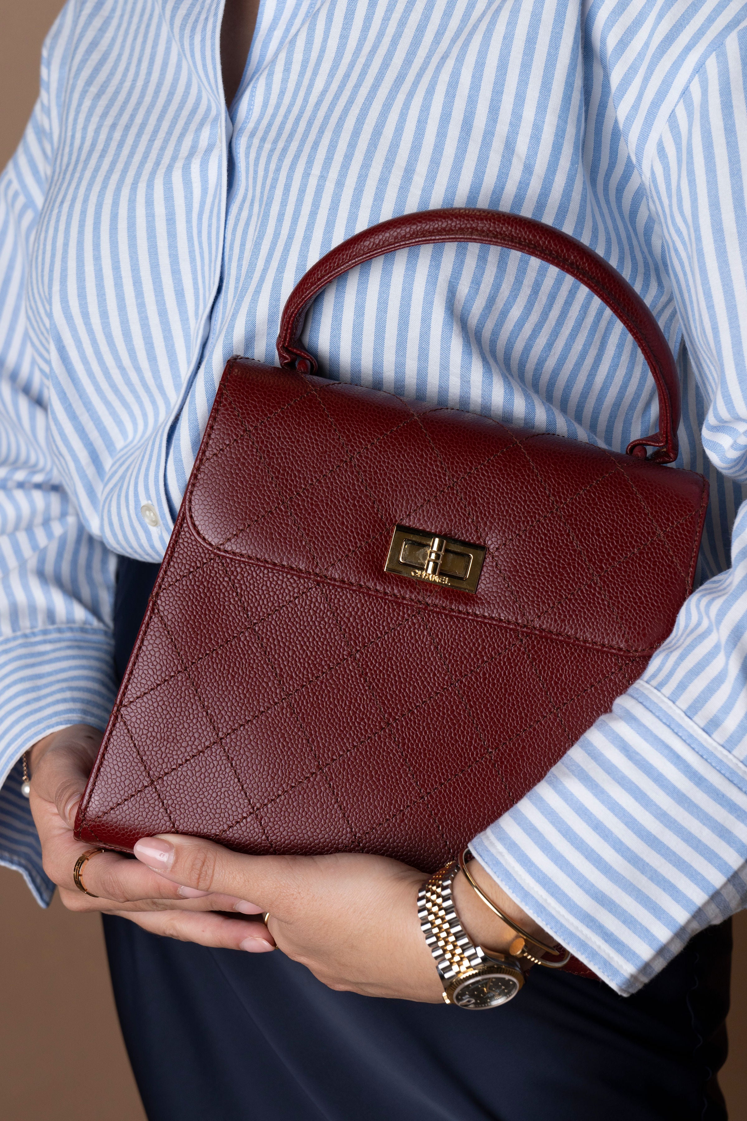Nesta versão com pega superior (Top Handle), a bolsa combina a sofisticação clássica do design original com um toque contemporâneo e funcional. Confeccionada em pele caviar bordo, apresenta o característico padrão matelassê e o emblemático fecho Mademoiselle em metal dourado, um detalhe distintivo que remete às criações originais de Coco Chanel.