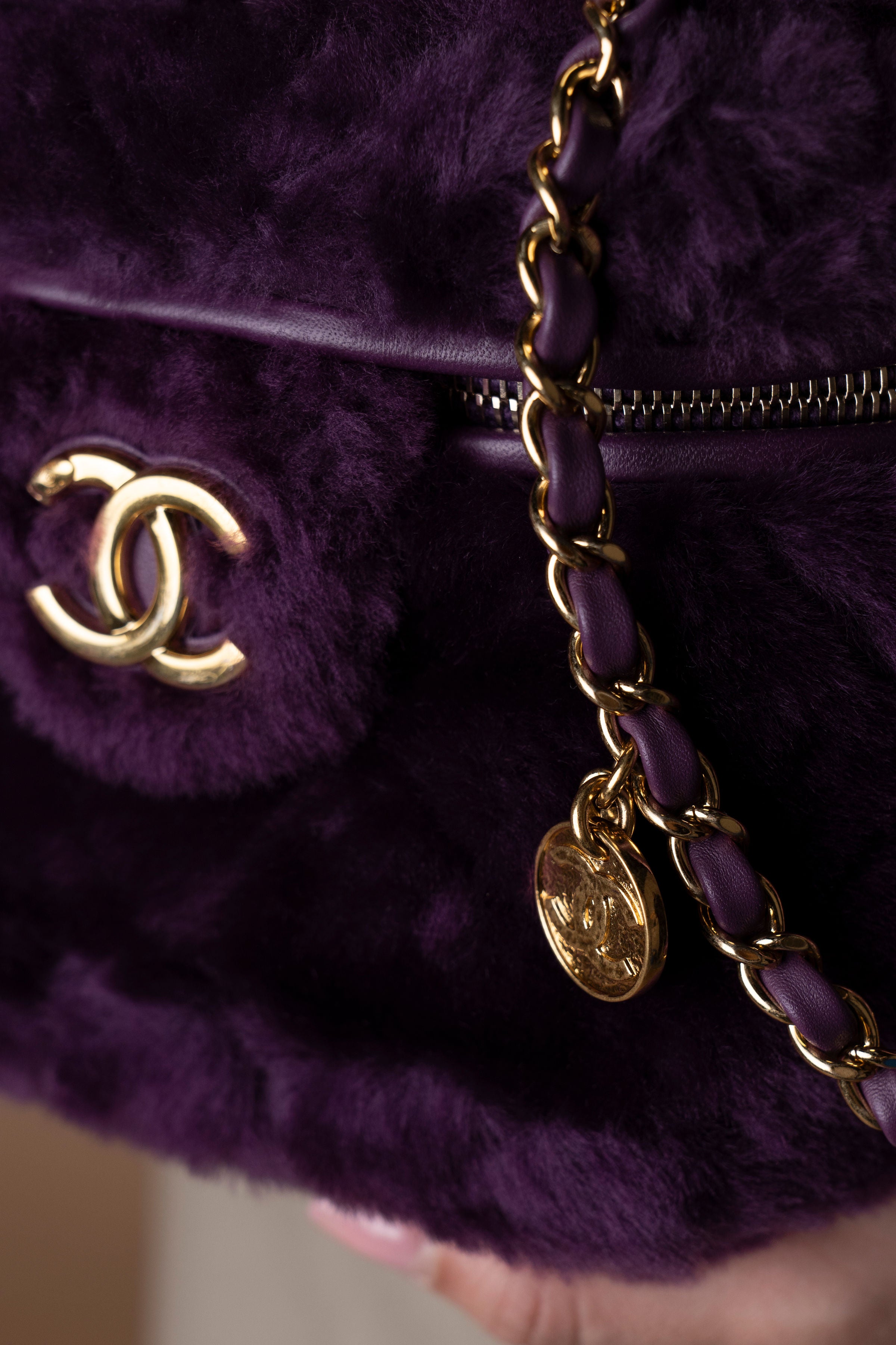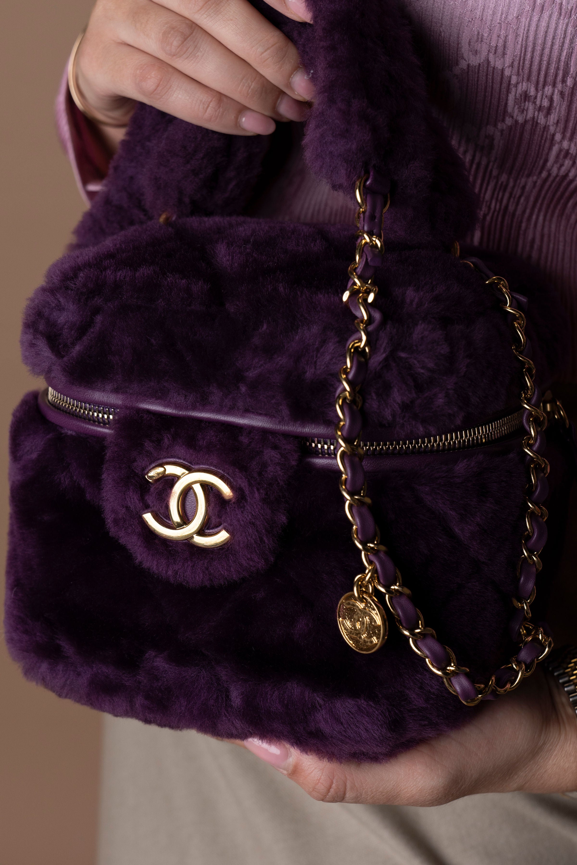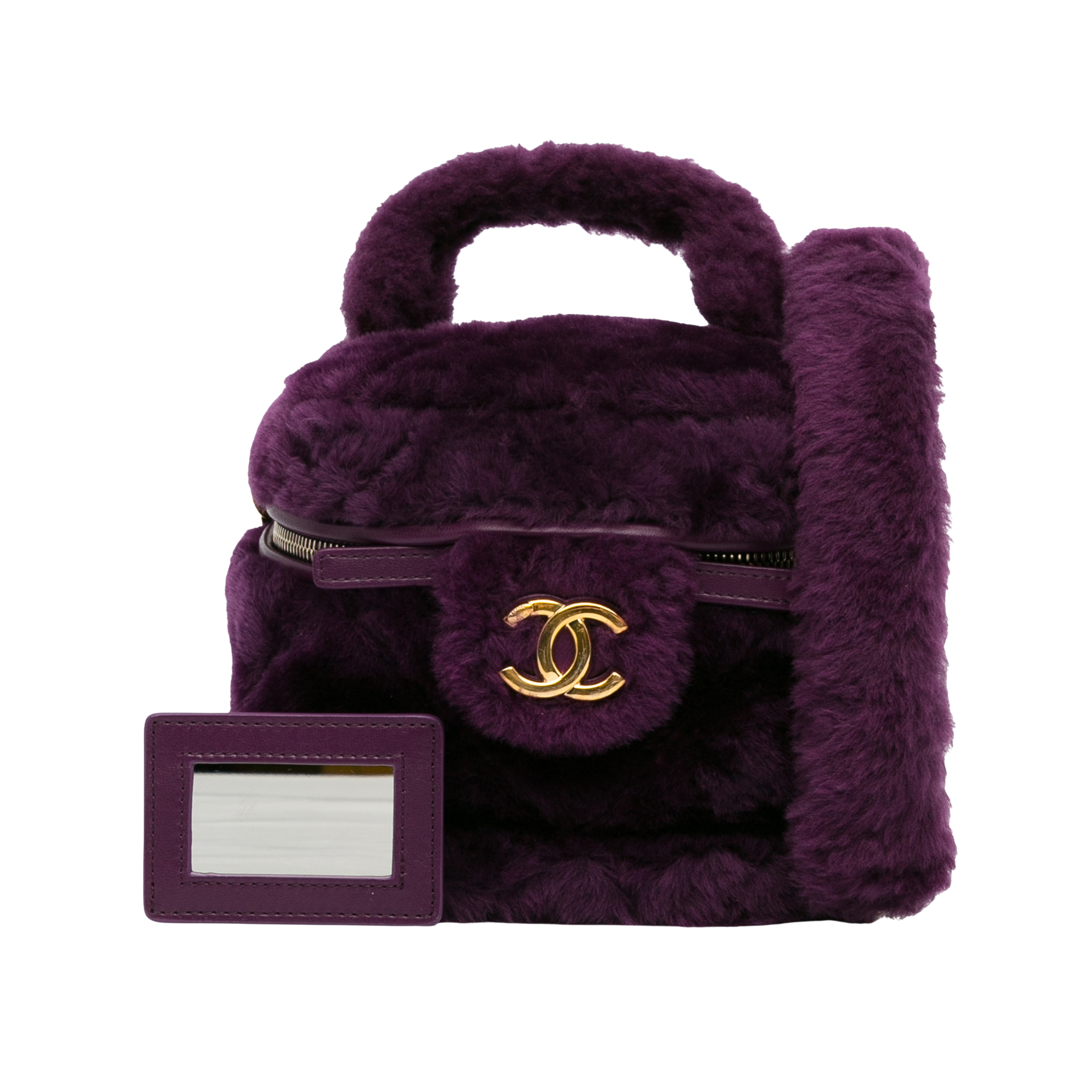 Elegante e rara, esta Chanel Shearling Vanity Case destaca-se pelo seu design luxuoso em pele de carneiro com pêlo (shearling) na tonalidade roxo profundo, complementada por ferragens douradas e o icónico logótipo CC na frente.