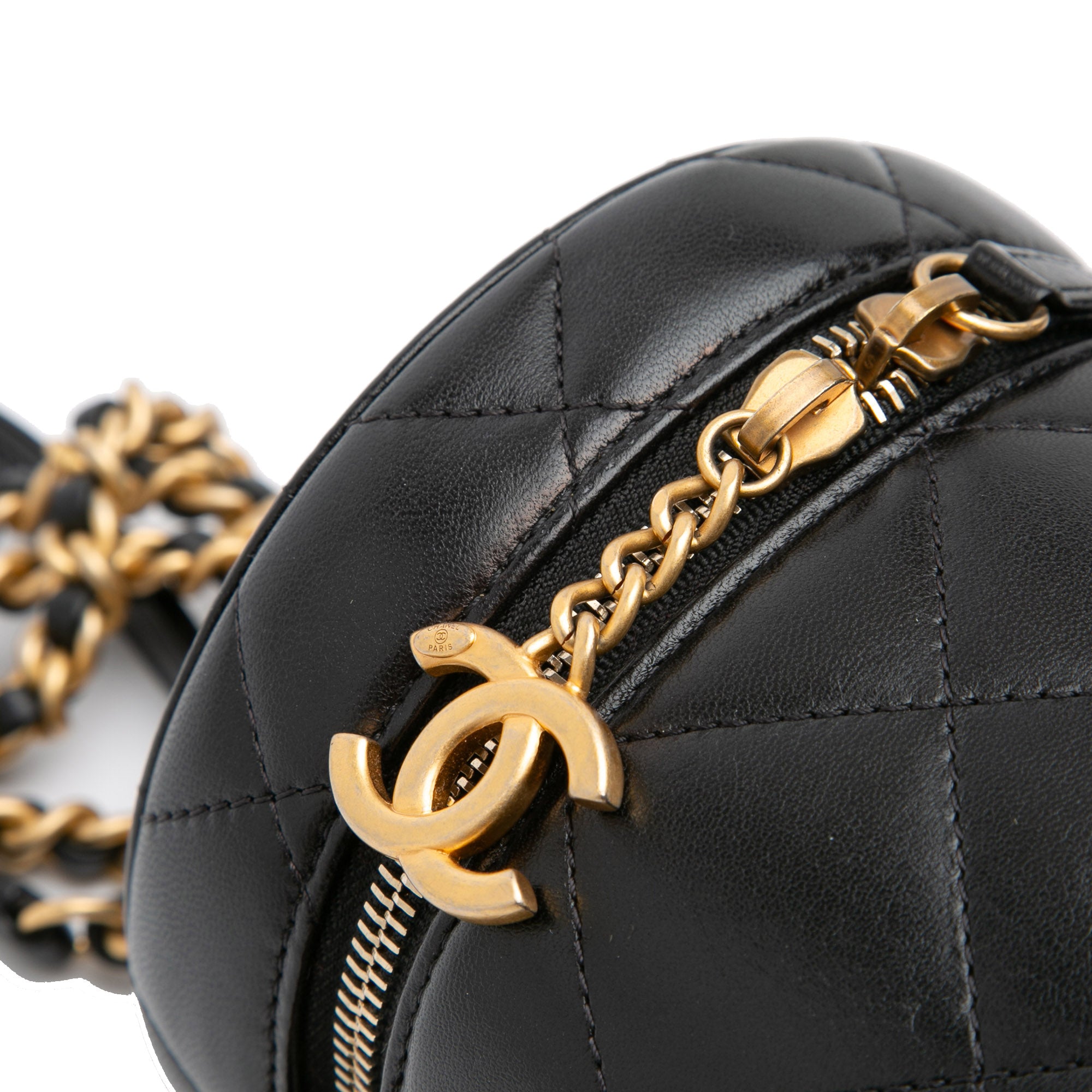 O destaque fica por conta da corrente entrelaçada em couro e metal dourado, adornada com o icônico pingente CC e o nome CHANEL gravado em letras metálicas — uma declaração de estilo e exclusividade.