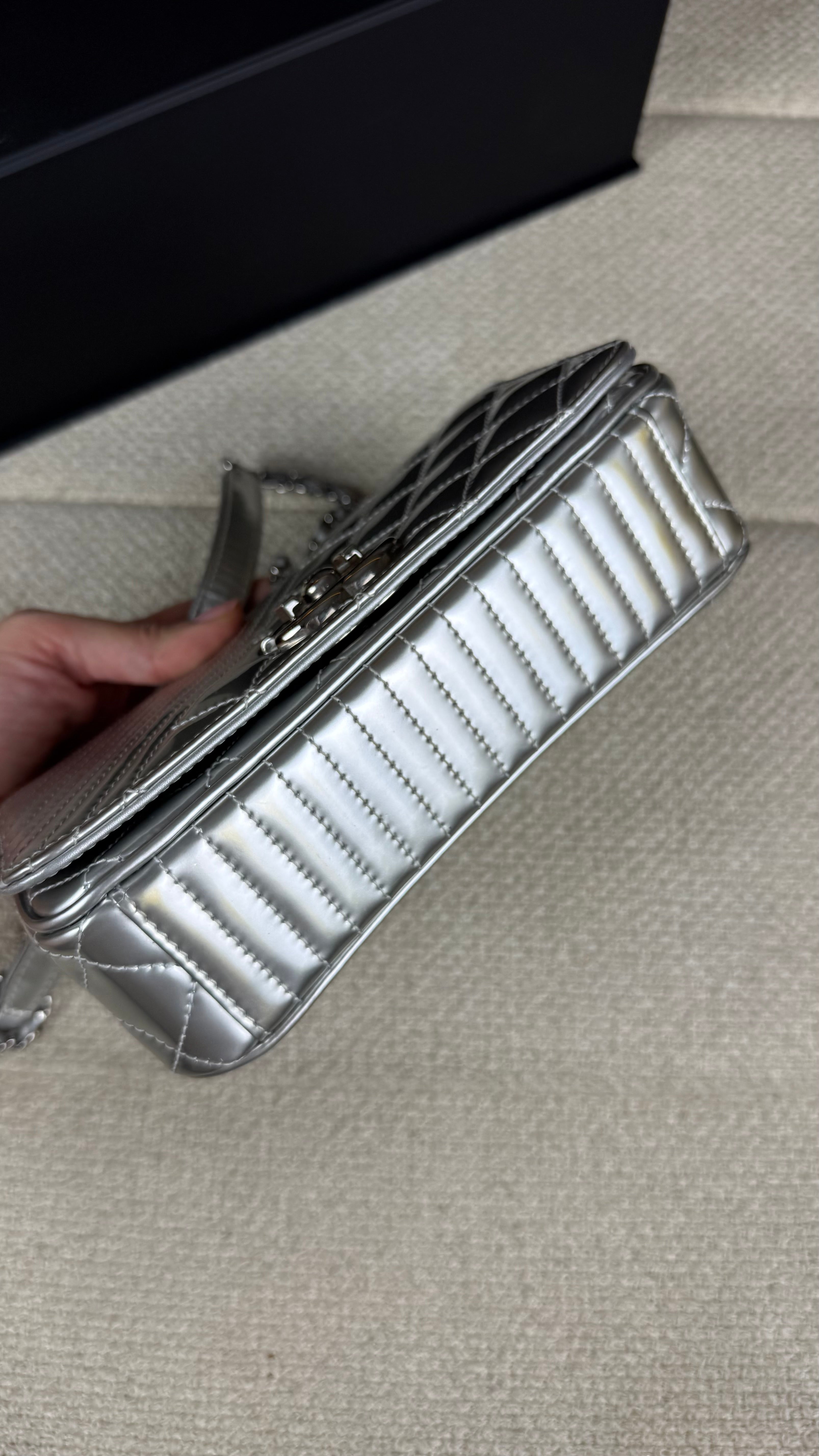 Moderna, arrojada e irresistivelmente luxuosa, esta Chanel Coco Boy Flap apresenta-se num acabamento prateado metalizado, que lhe confere um brilho espelhado e uma estética futurista, mantendo ao mesmo tempo o ADN clássico da maison.