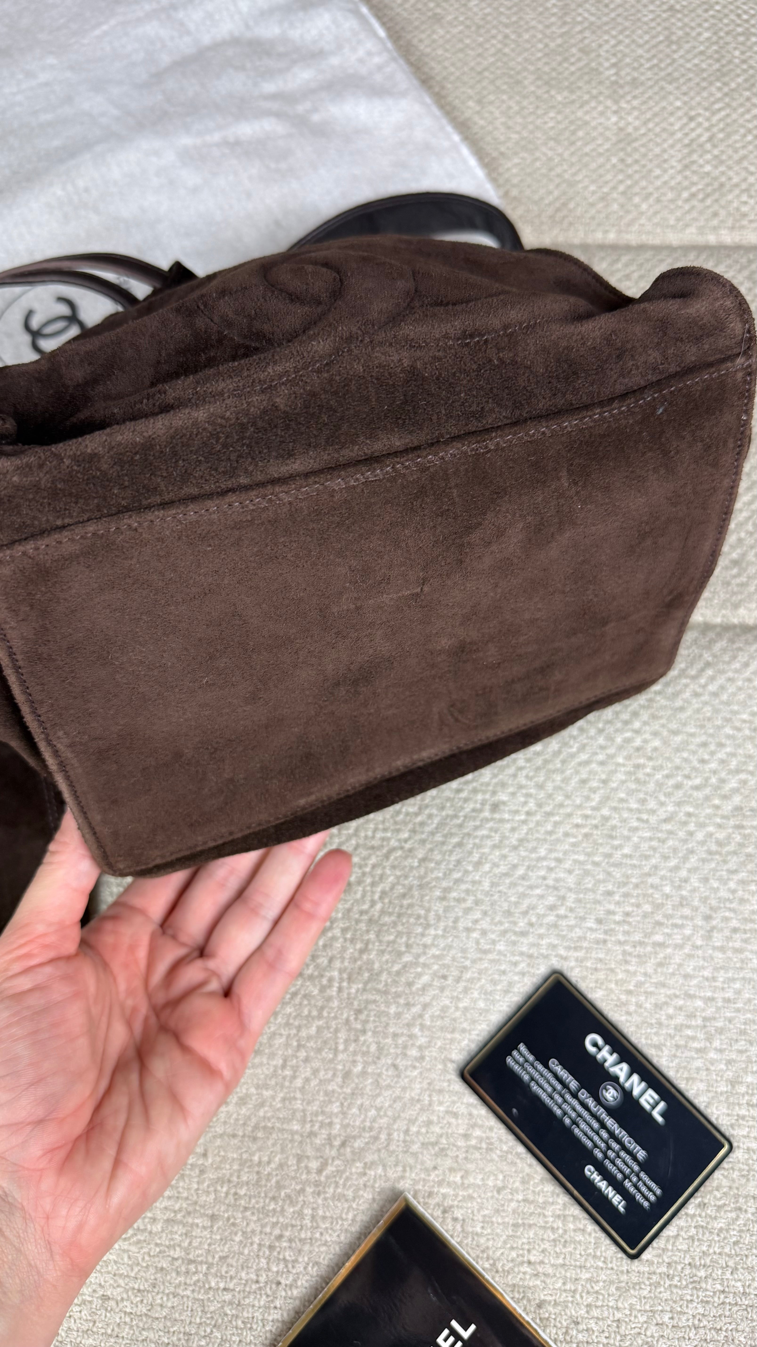 Elegante e cheia de carácter, esta mala Chanel vintage em formato bucket é confeccionada em camurça castanha escura, oferecendo uma textura macia e sofisticada que realça o seu estilo intemporal. O modelo apresenta o icónico CC discretamente marcado na parte frontal, num detalhe subtil e refinado, característico das criações clássicas da maison.