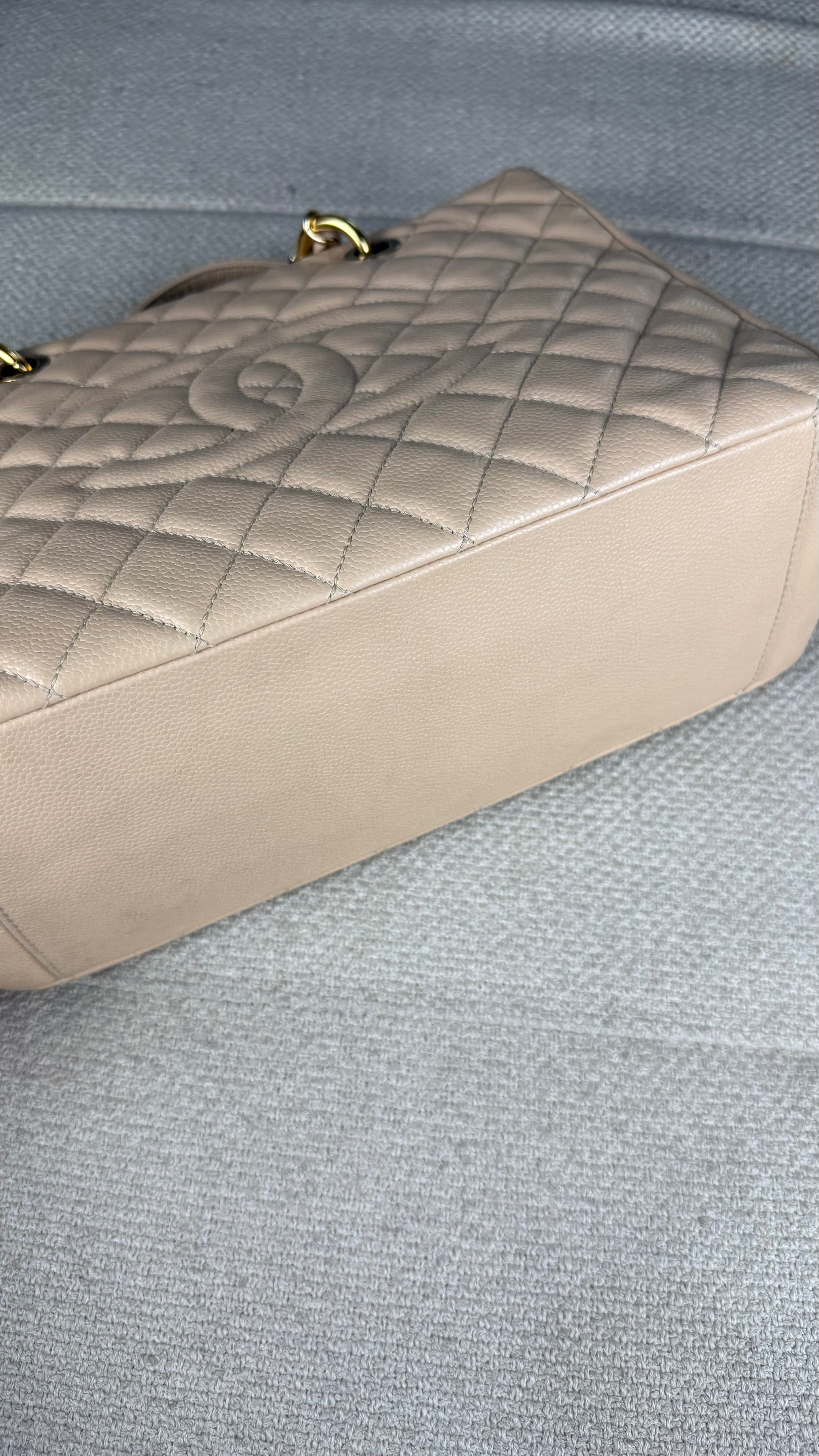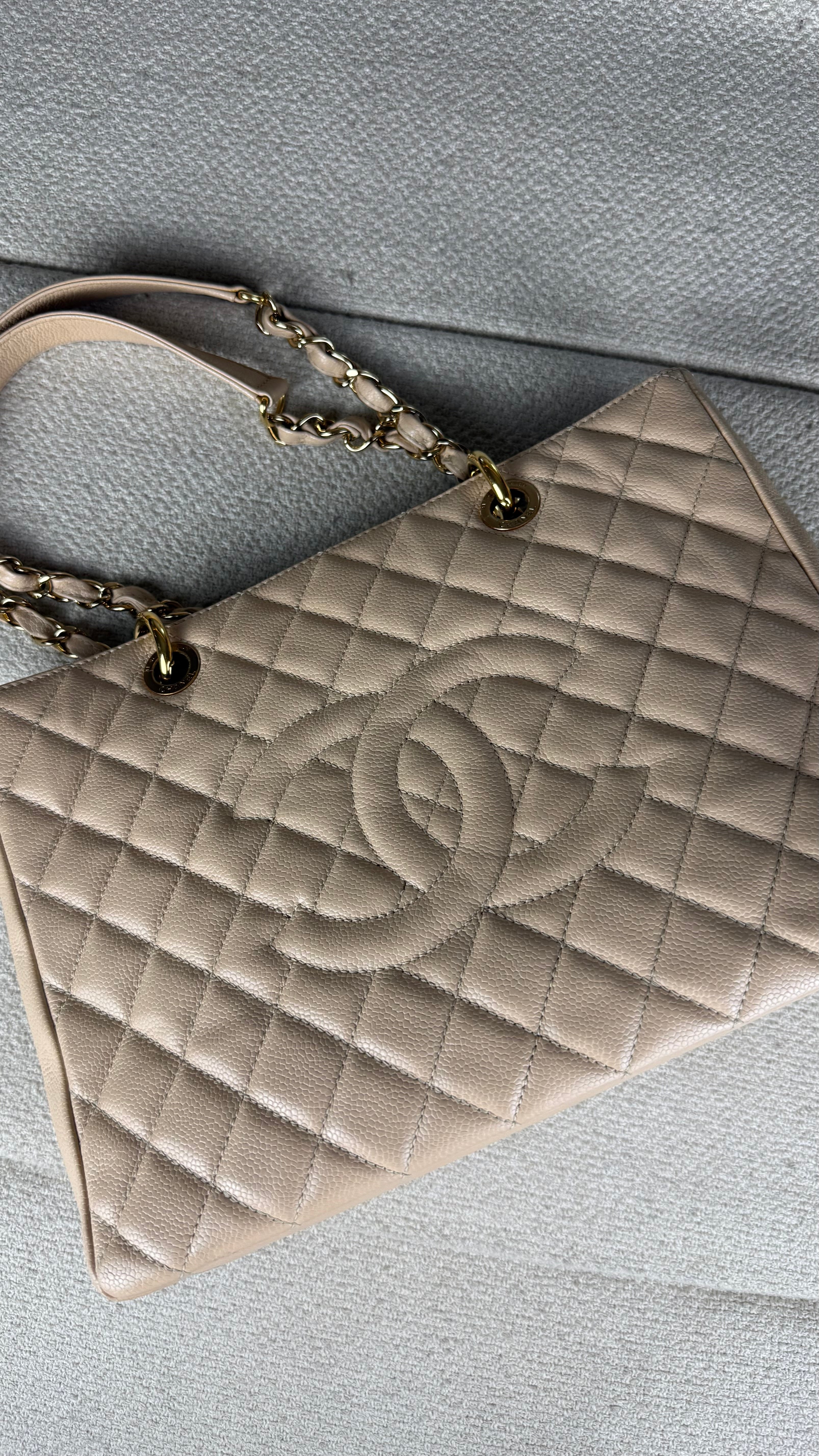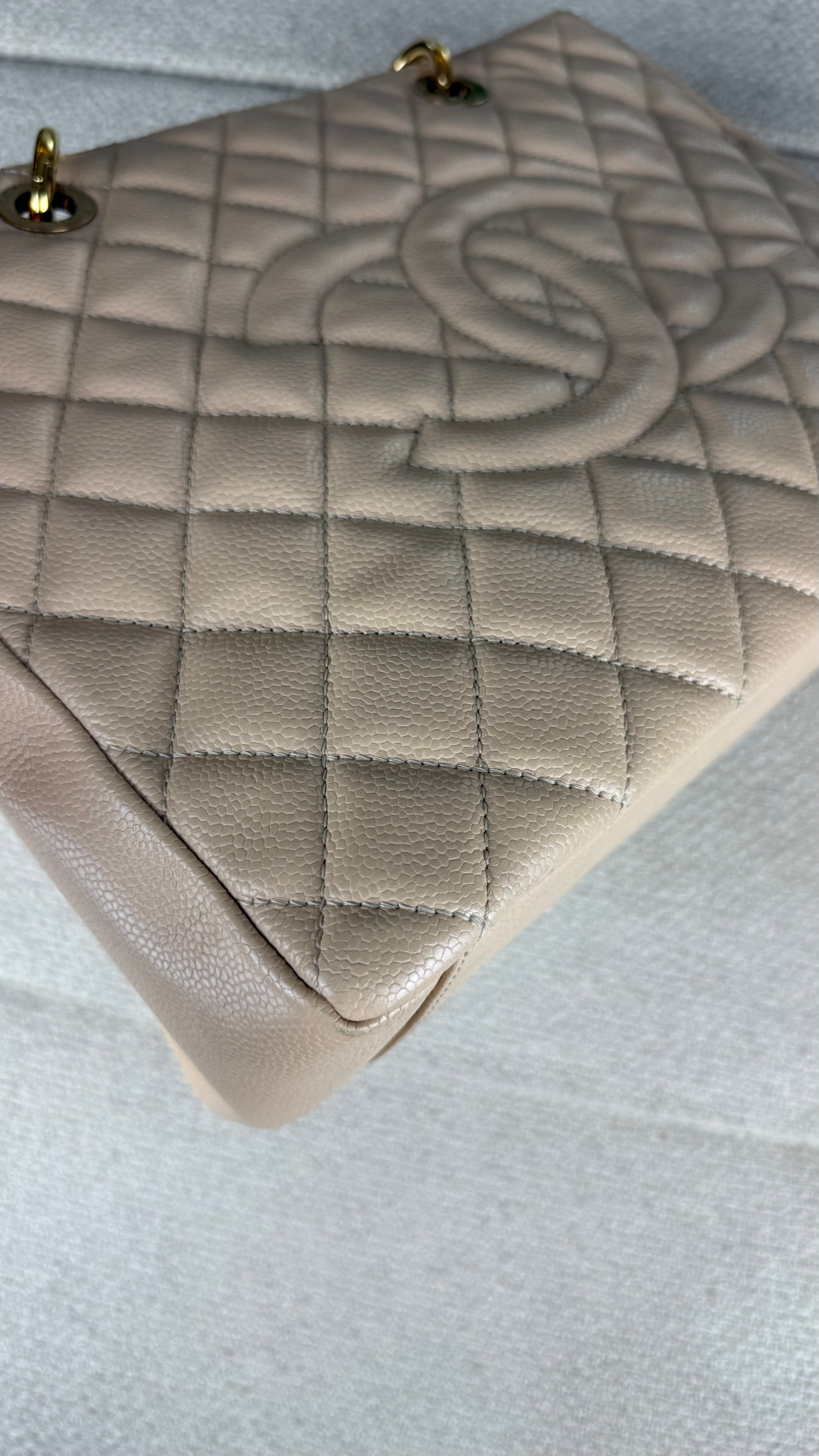 Chanel Grand Shopper Tote (GST) Bolsa icônica da Chanel, modelo Grand Shopper Tote, confeccionada em couro caviar matelassê com acabamento em padrão losangos. Possui o clássico logo duplo CC em relevo na parte frontal, tom sobre tom, reforçando a elegância atemporal da peça.