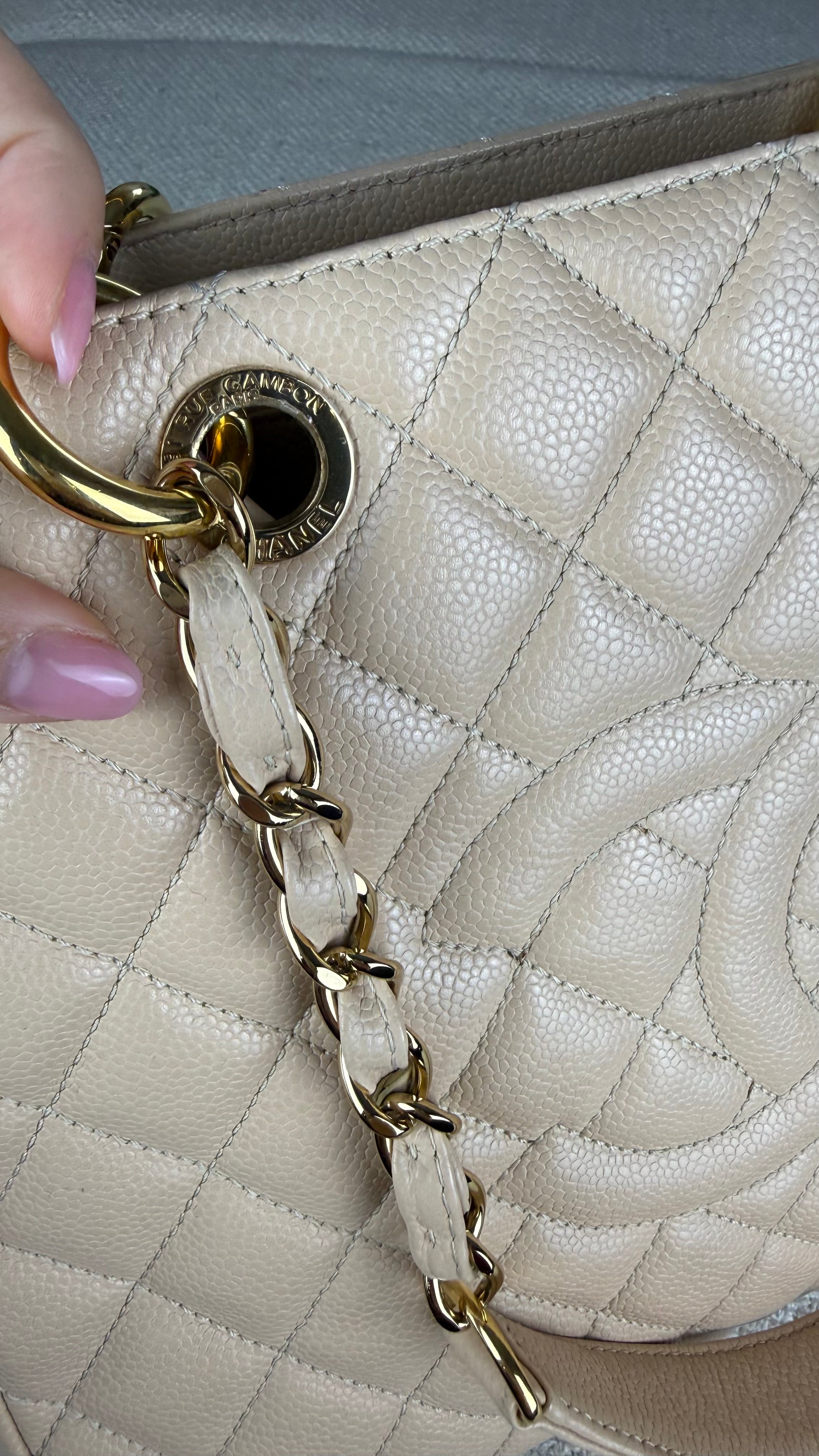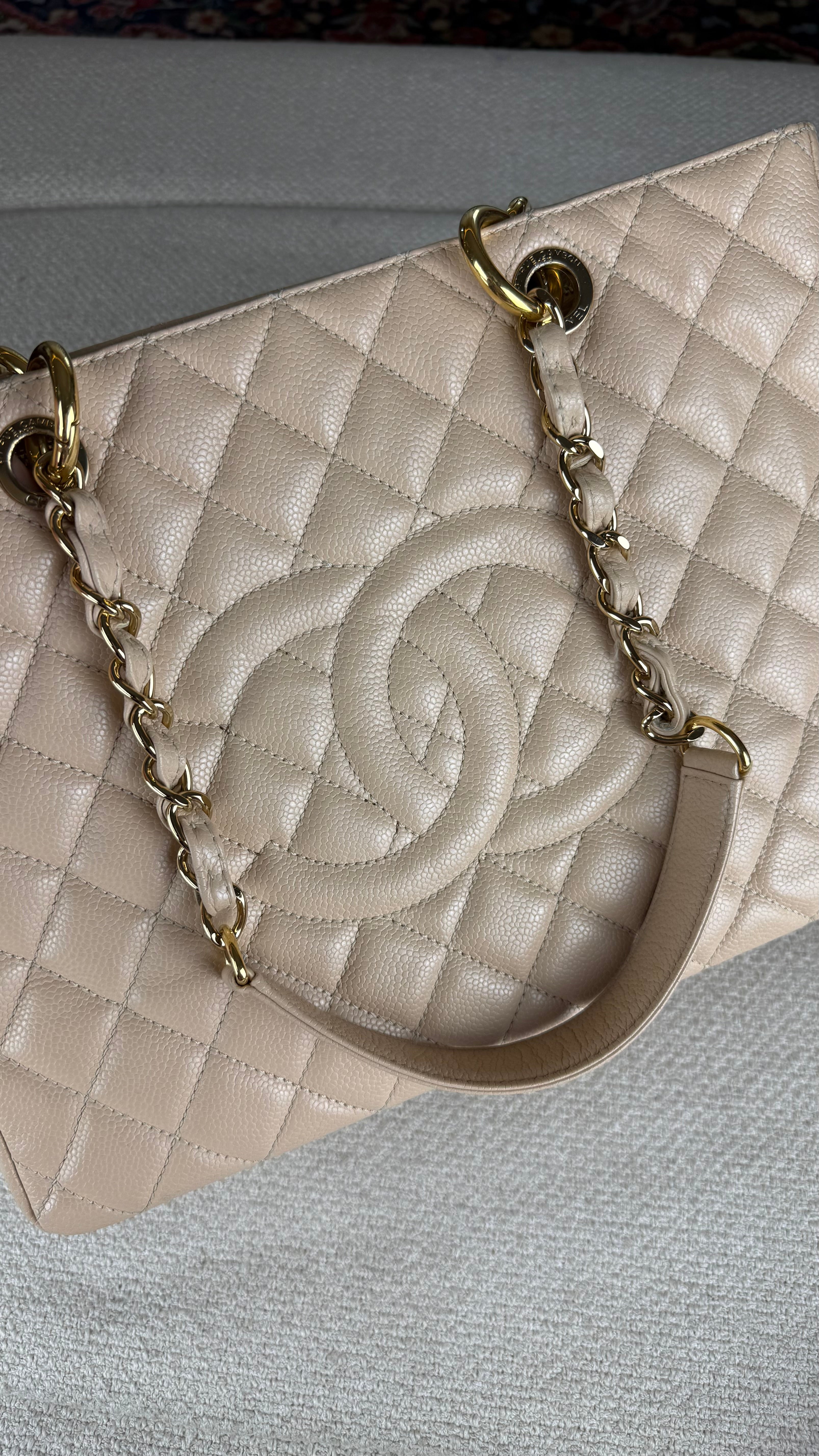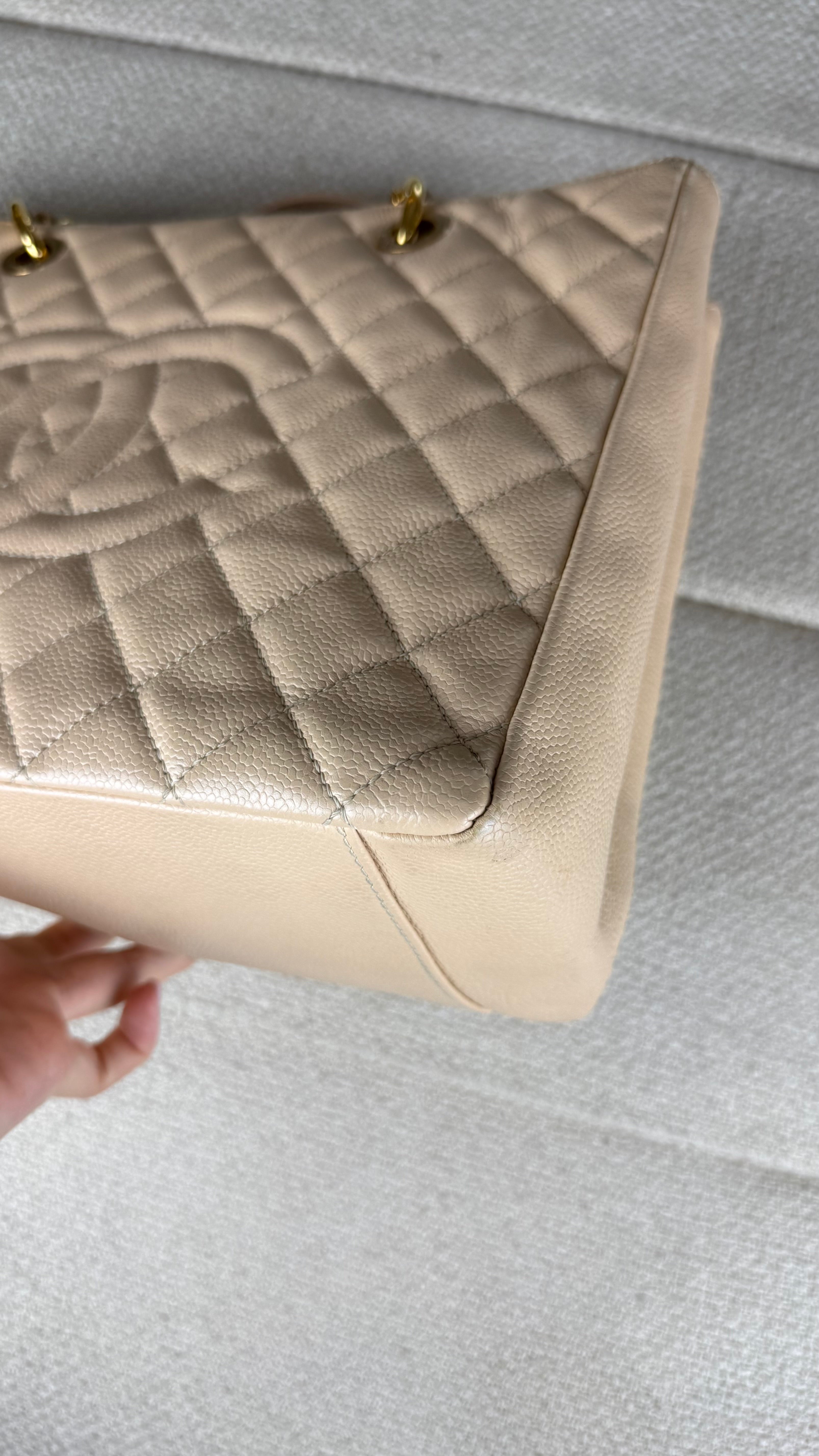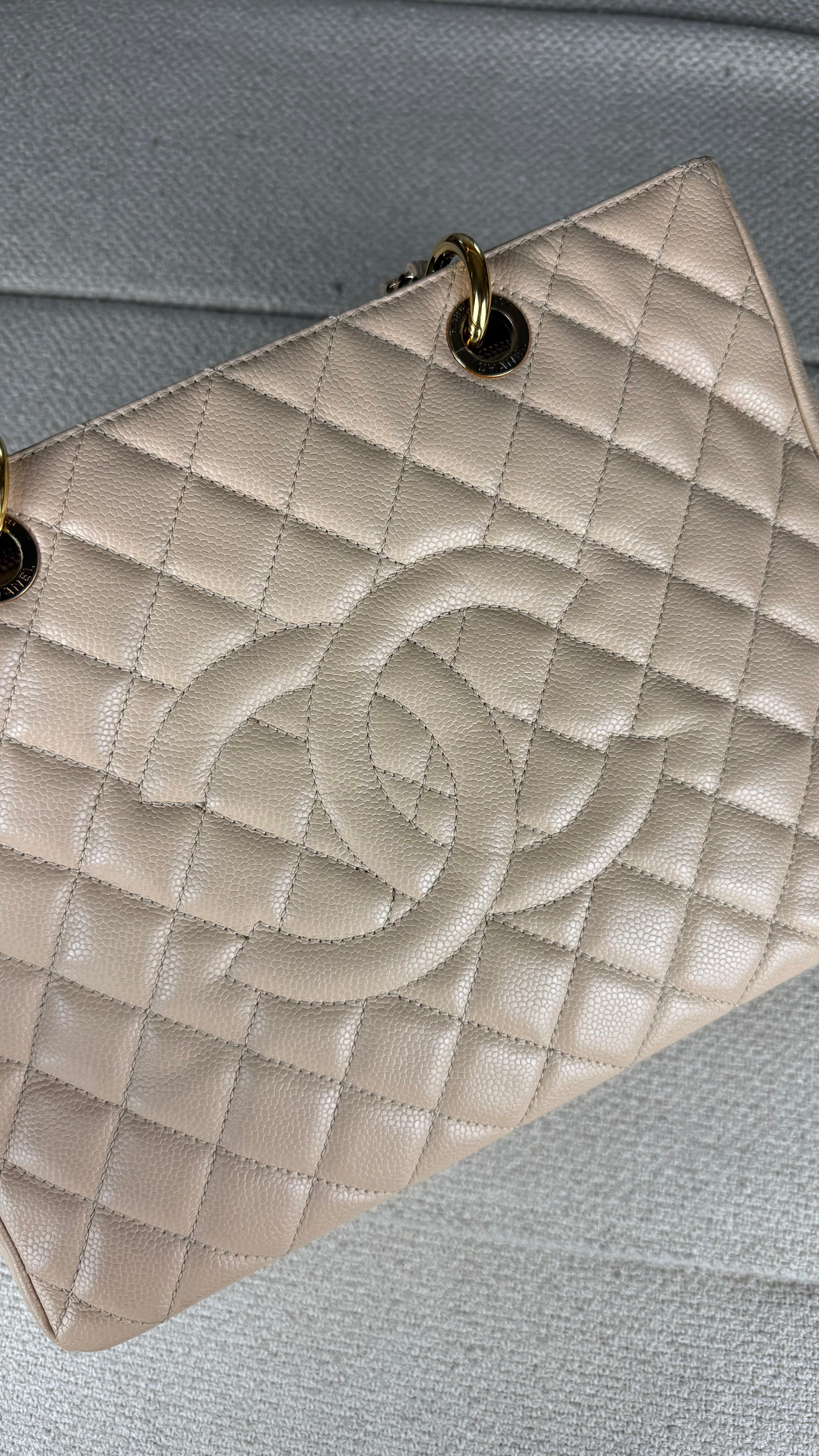 Chanel Grand Shopper Tote (GST) Bolsa icônica da Chanel, modelo Grand Shopper Tote, confeccionada em couro caviar matelassê com acabamento em padrão losangos. Possui o clássico logo duplo CC em relevo na parte frontal, tom sobre tom, reforçando a elegância atemporal da peça.