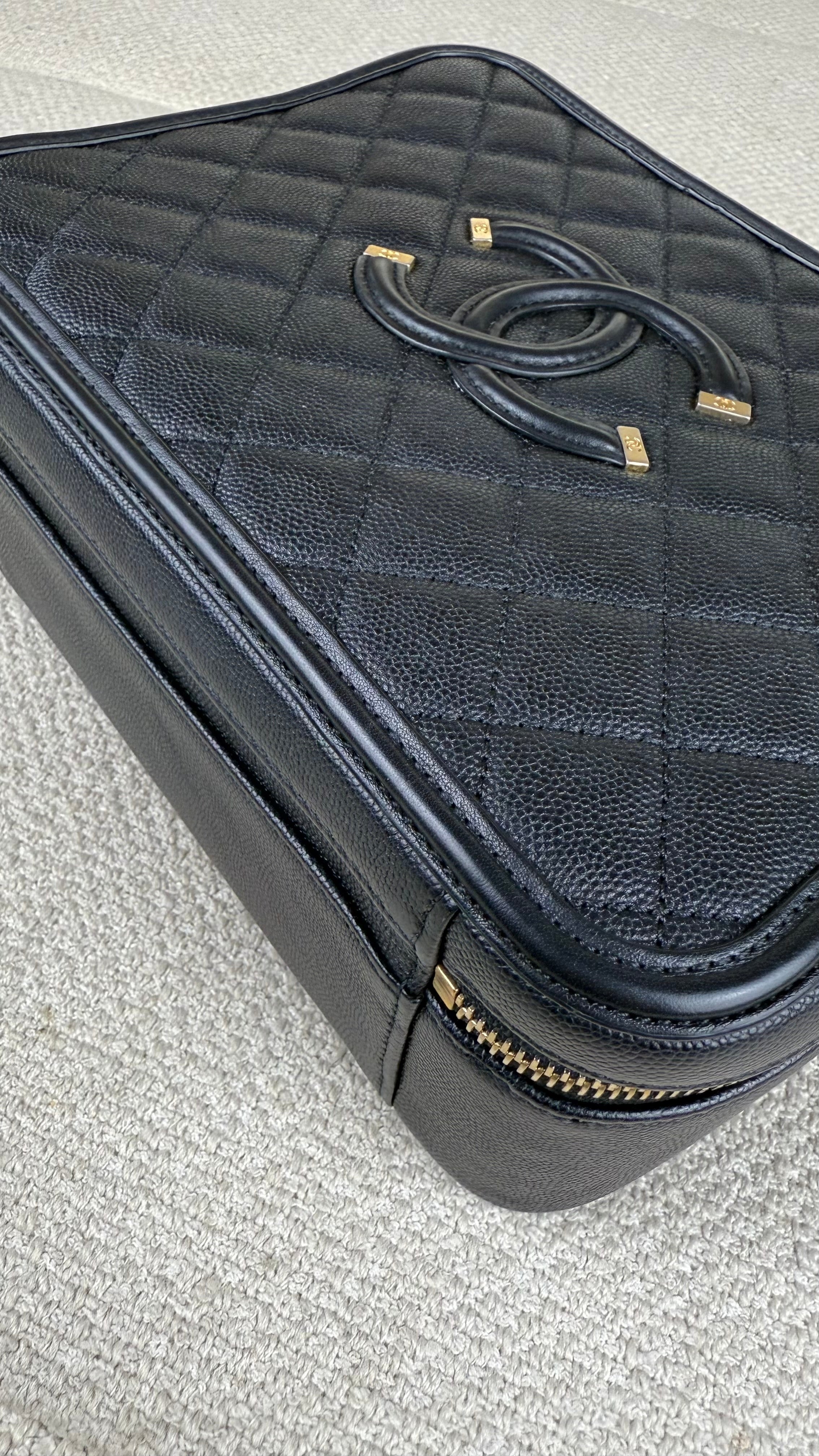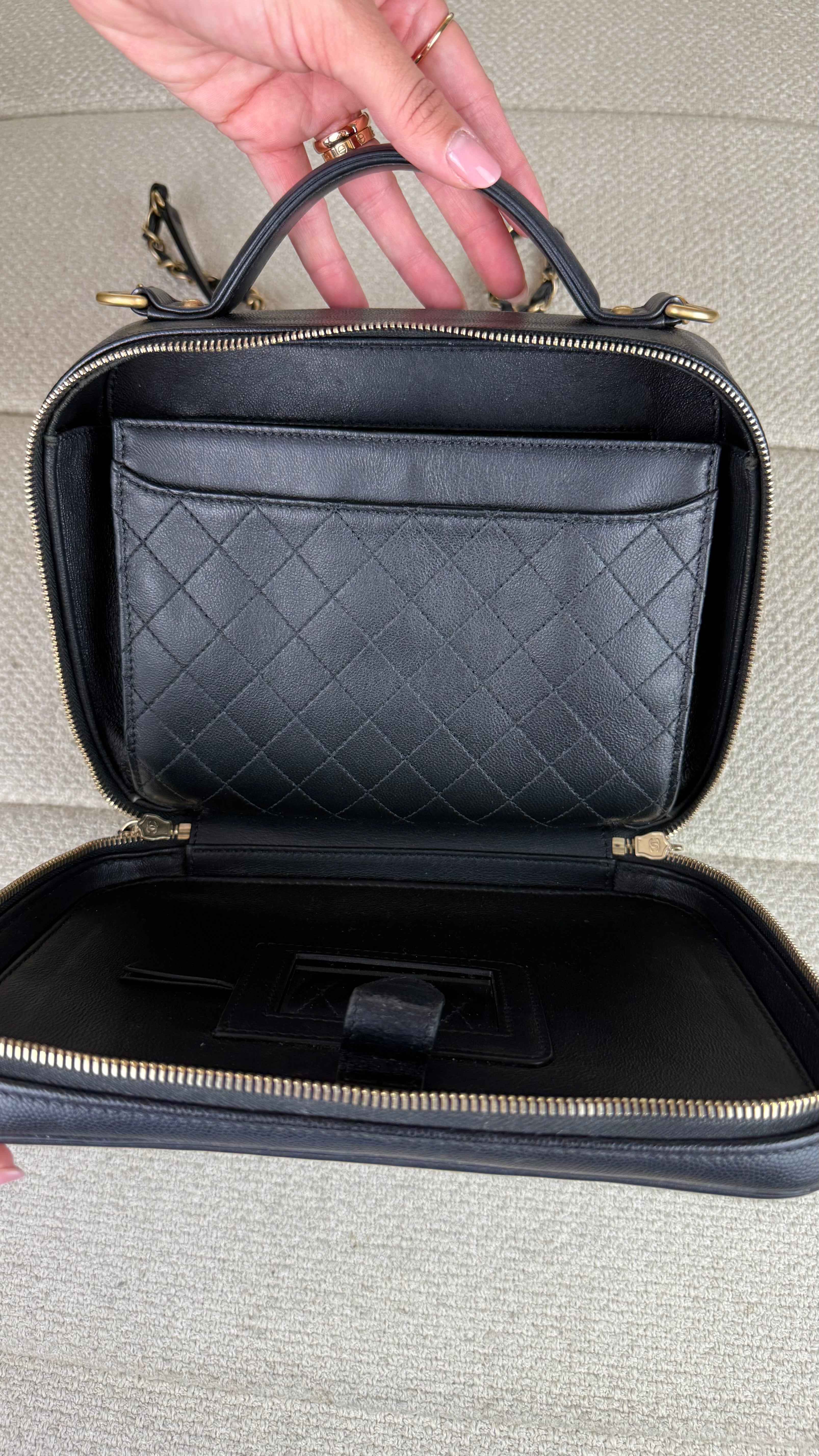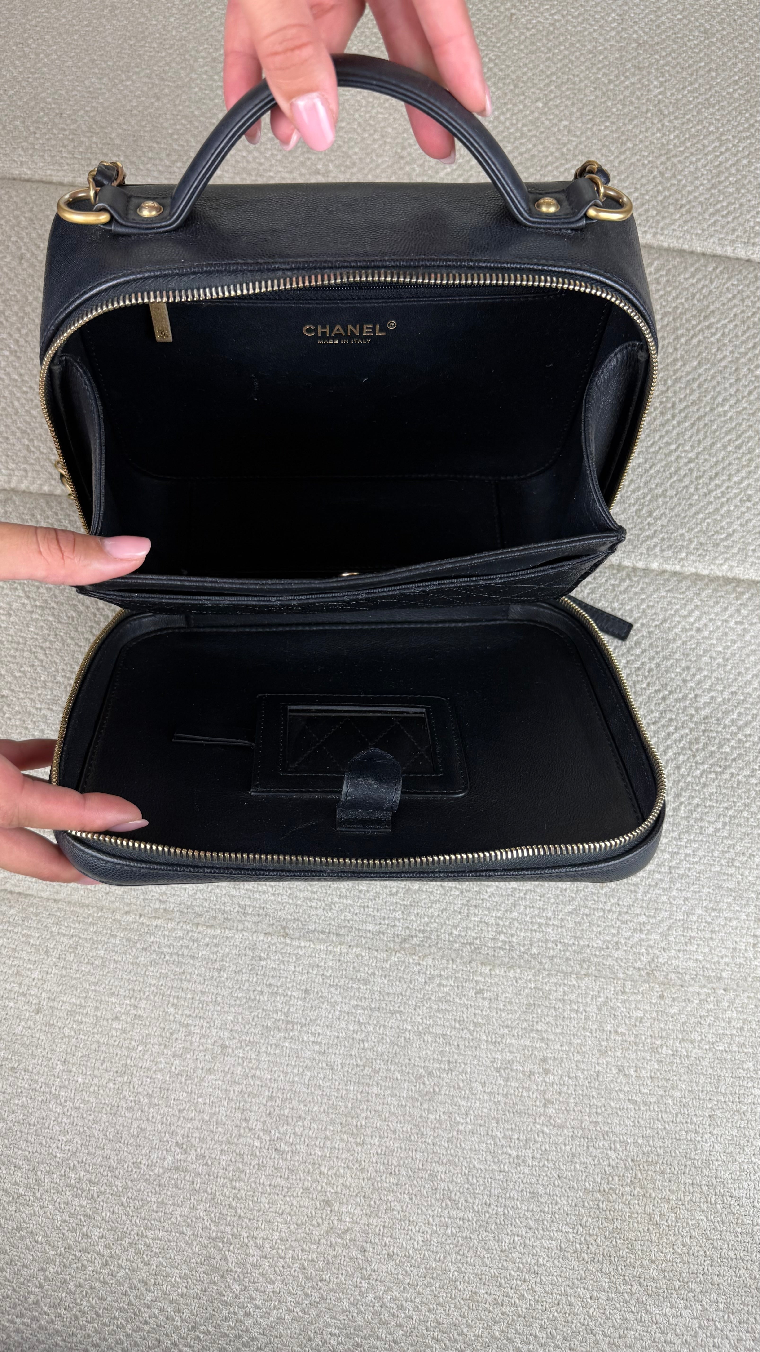 Elegância e praticidade em uma só peça: a Chanel Vanity Case é confeccionada em couro caviar preto matelassê, com logo CC em relevo e ferragens douradas. Seu design estruturado e espaçoso a torna ideal para o dia a dia sofisticado, enquanto a alça de corrente entrelaçada em couro adiciona a versatilidade do uso crossbody.