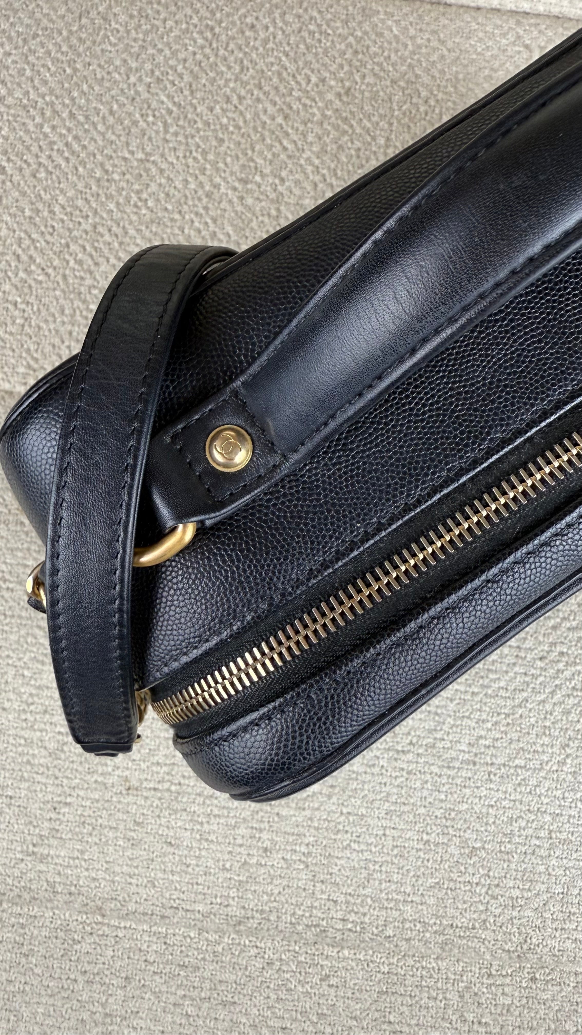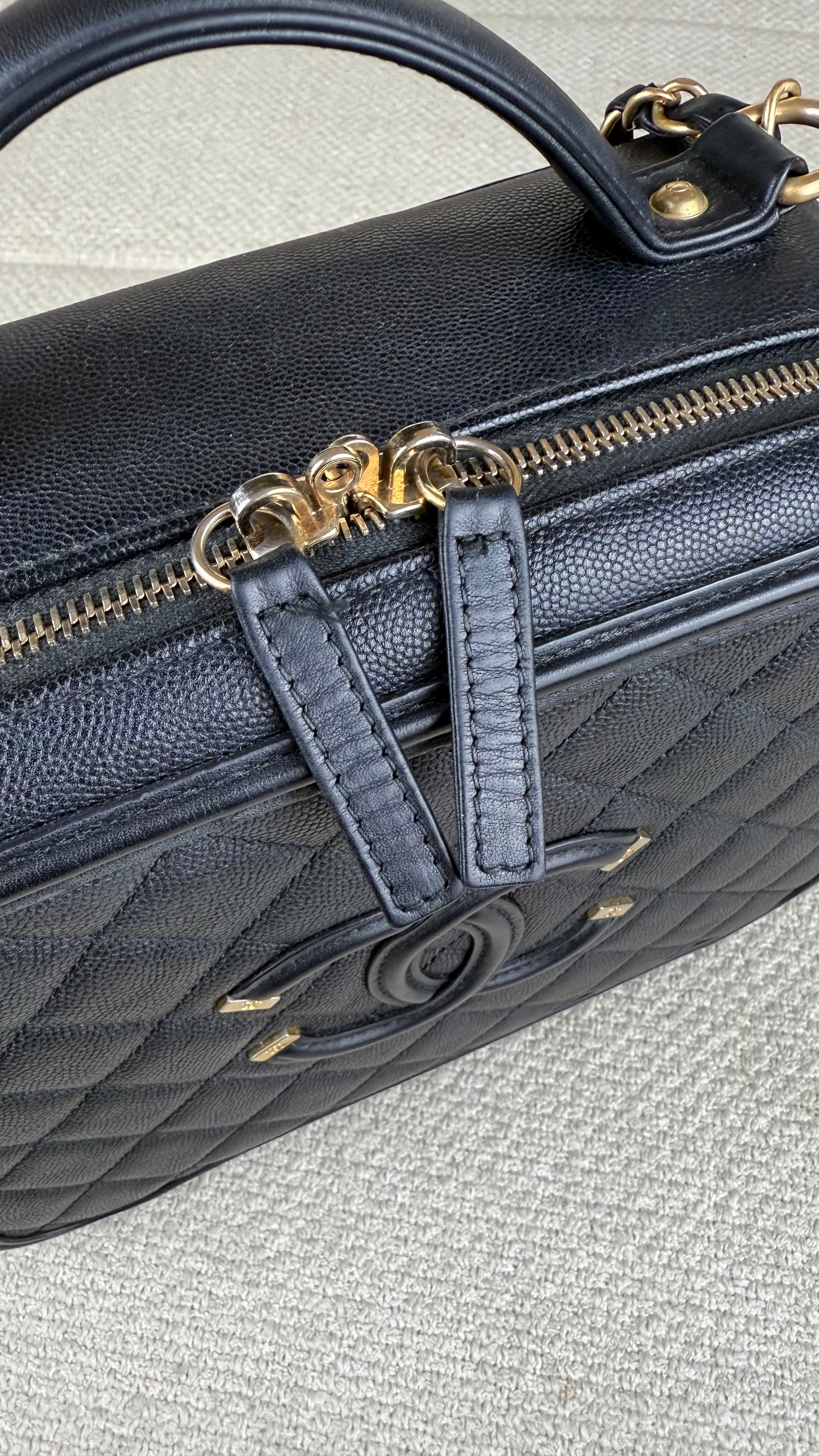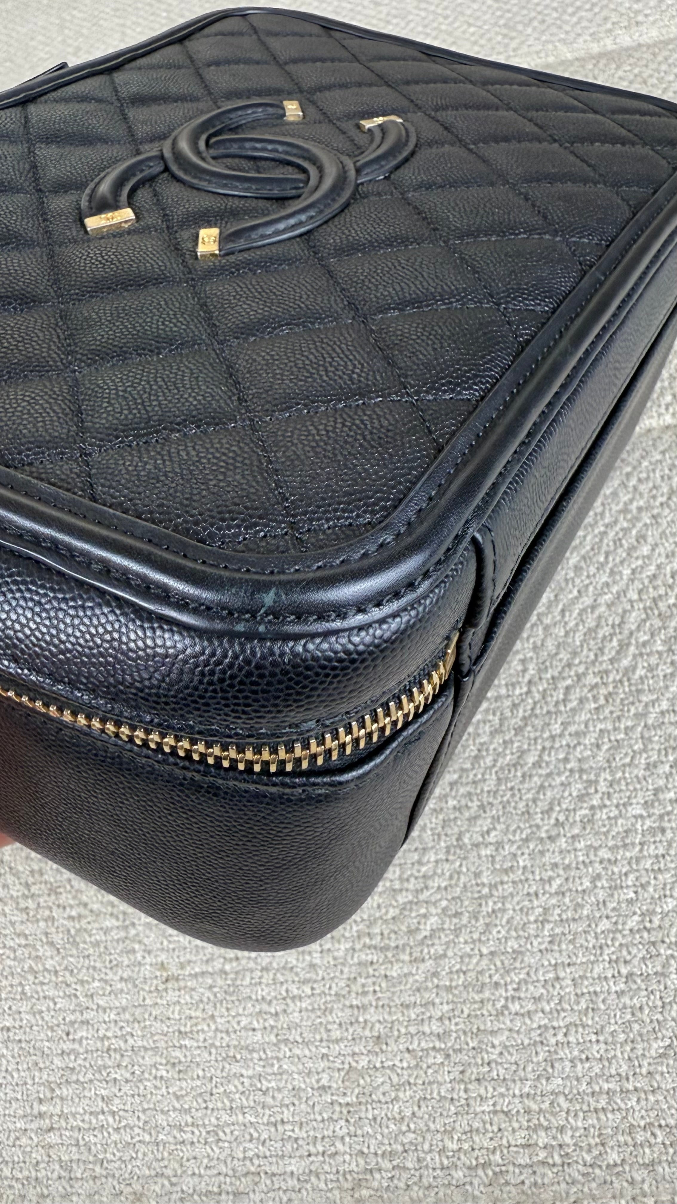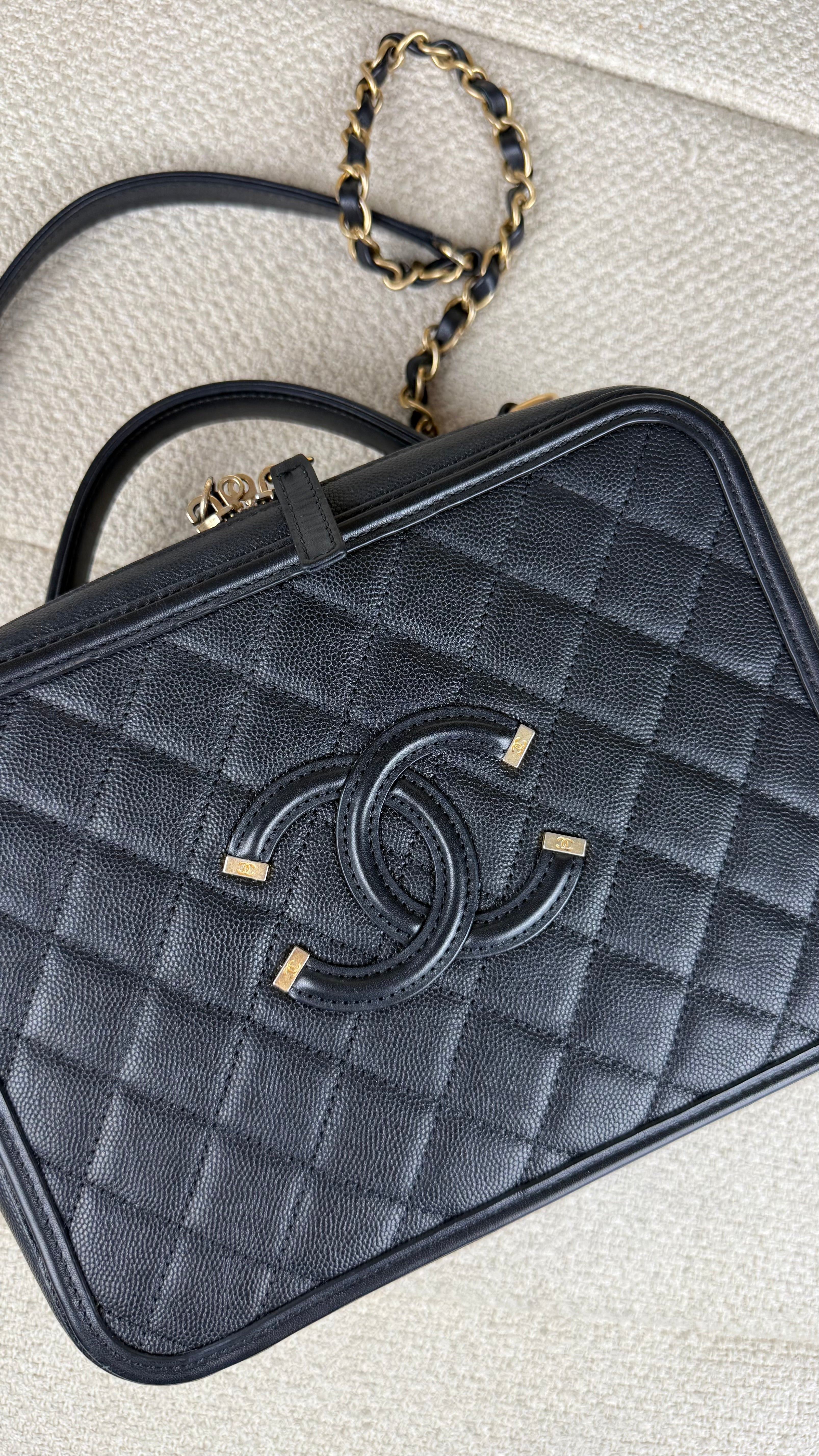 Elegância e praticidade em uma só peça: a Chanel Vanity Case é confeccionada em couro caviar preto matelassê, com logo CC em relevo e ferragens douradas. Seu design estruturado e espaçoso a torna ideal para o dia a dia sofisticado, enquanto a alça de corrente entrelaçada em couro adiciona a versatilidade do uso crossbody.
