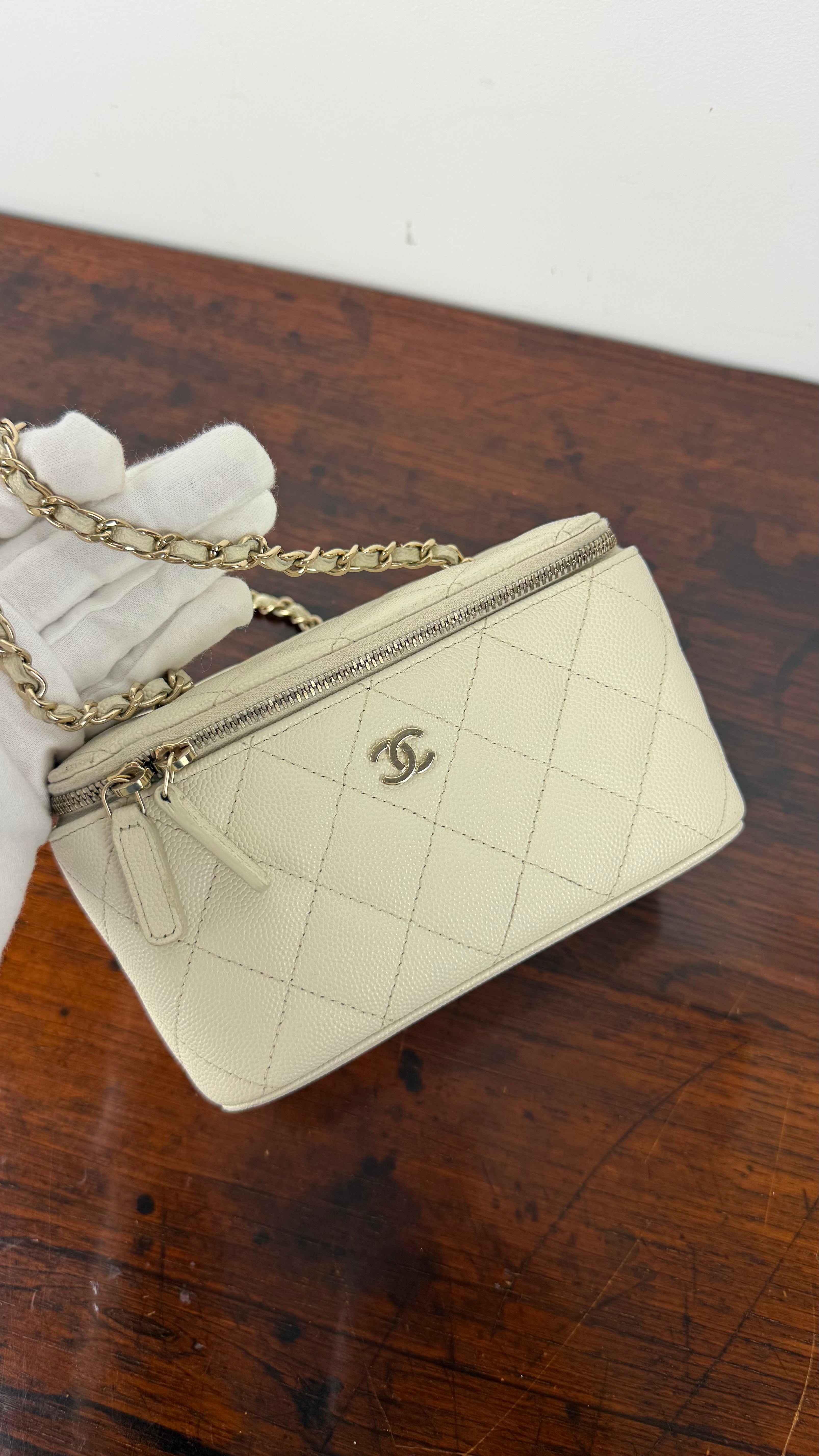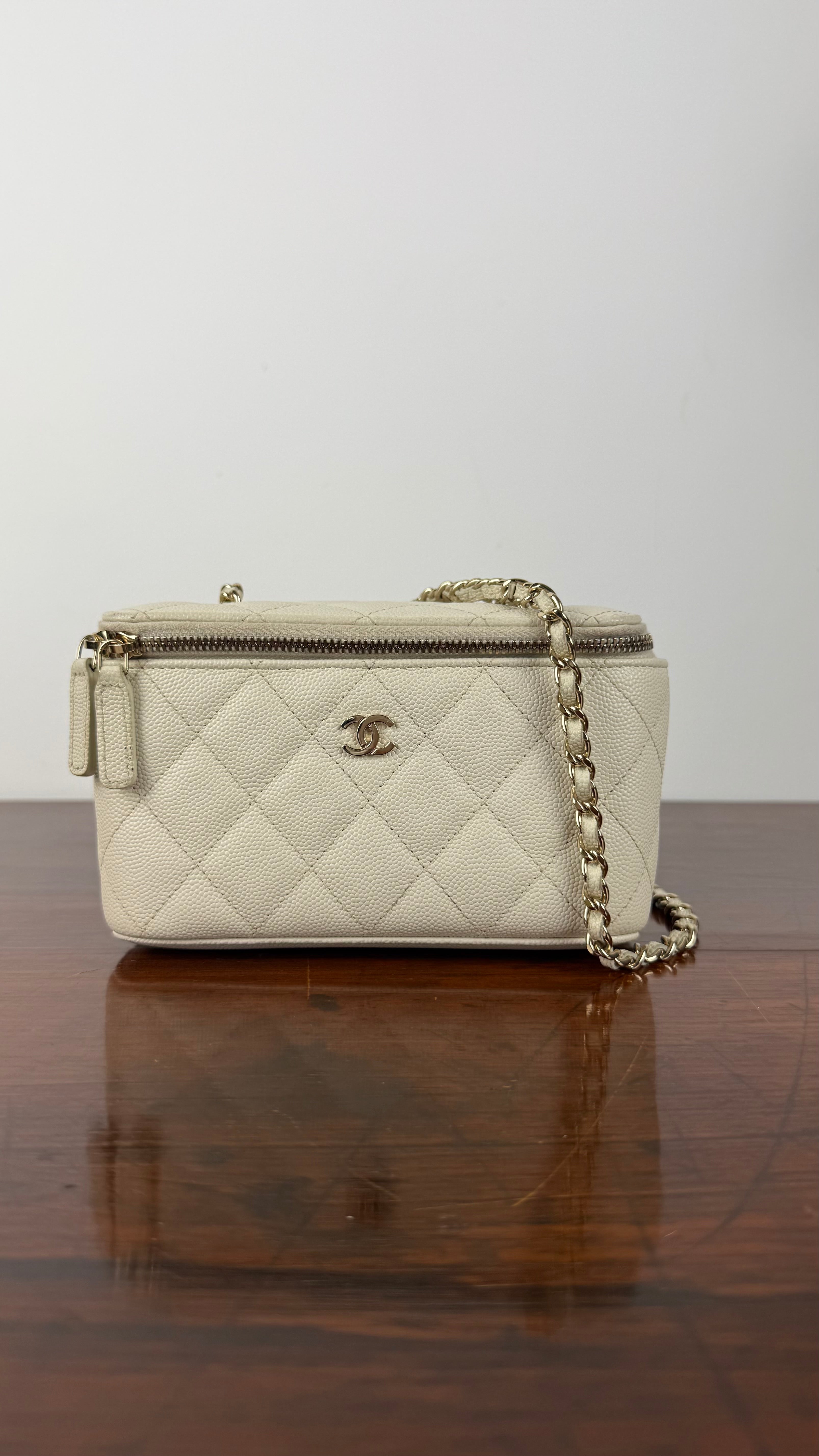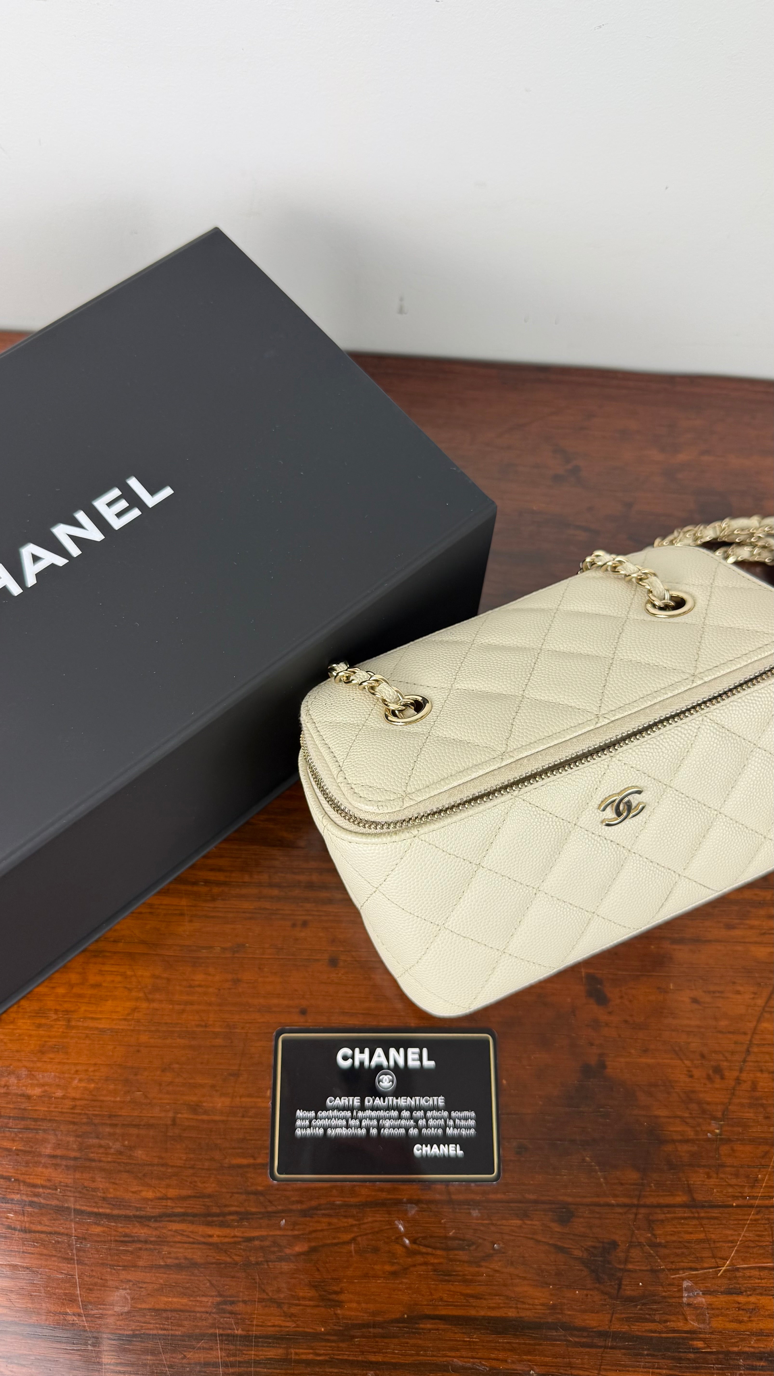 A Vanity Bag da Chanel é uma das peças mais desejadas das coleções recentes, reinterpretando as clássicas vanity cases em versão moderna e funcional. O design combina a elegância intemporal do acolchoado Chanel com a praticidade de uma mala compacta para o dia a dia.