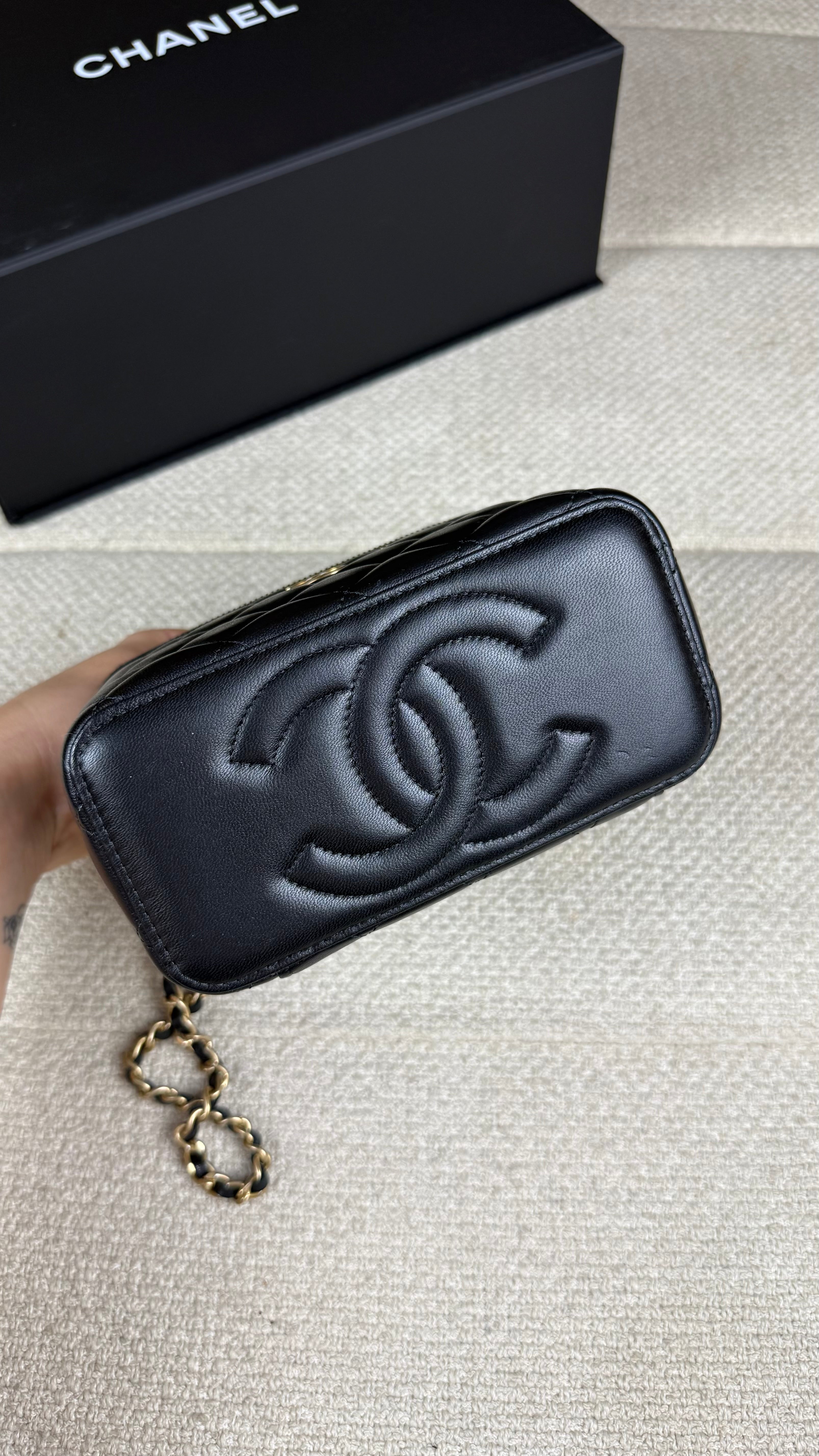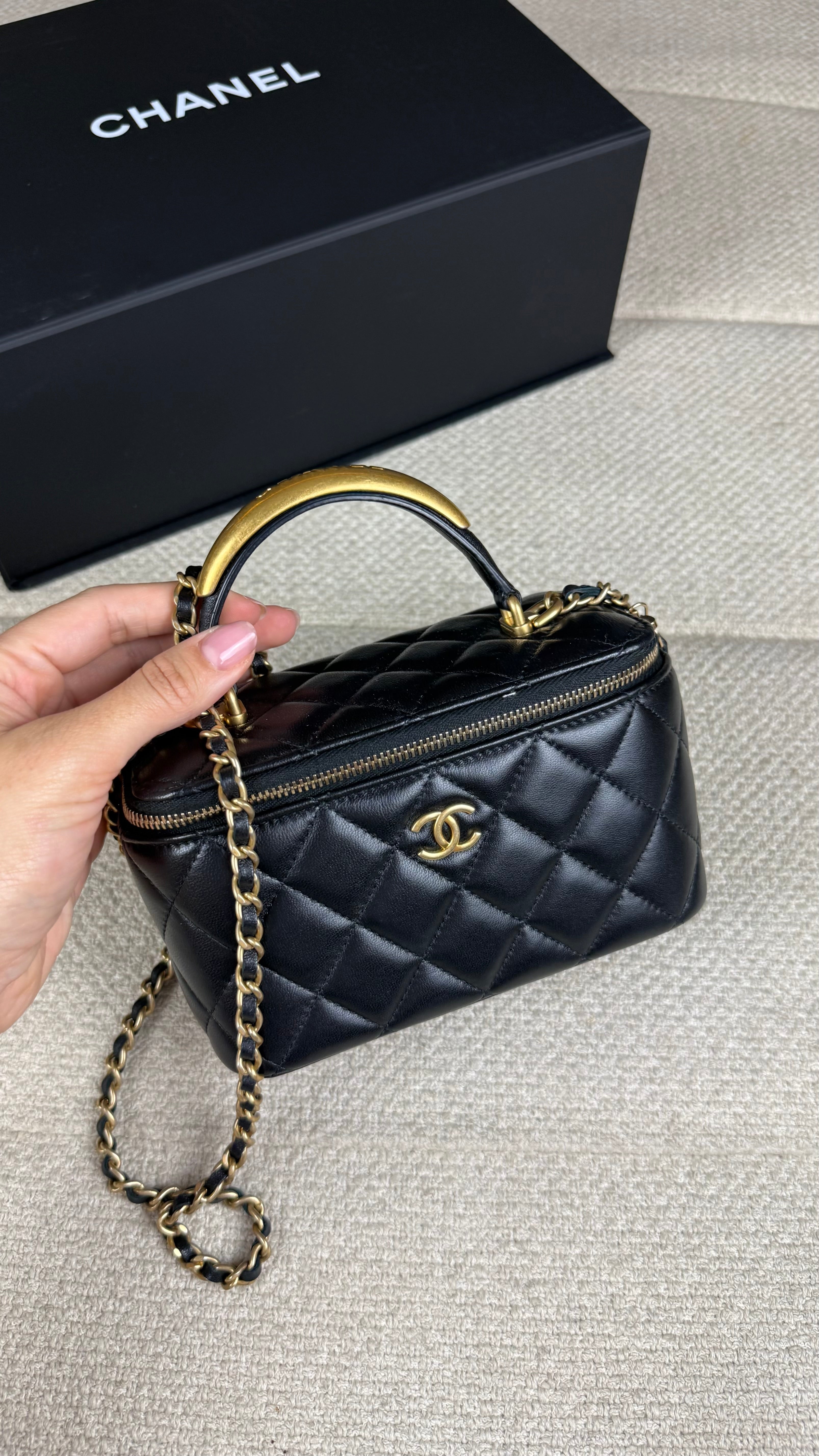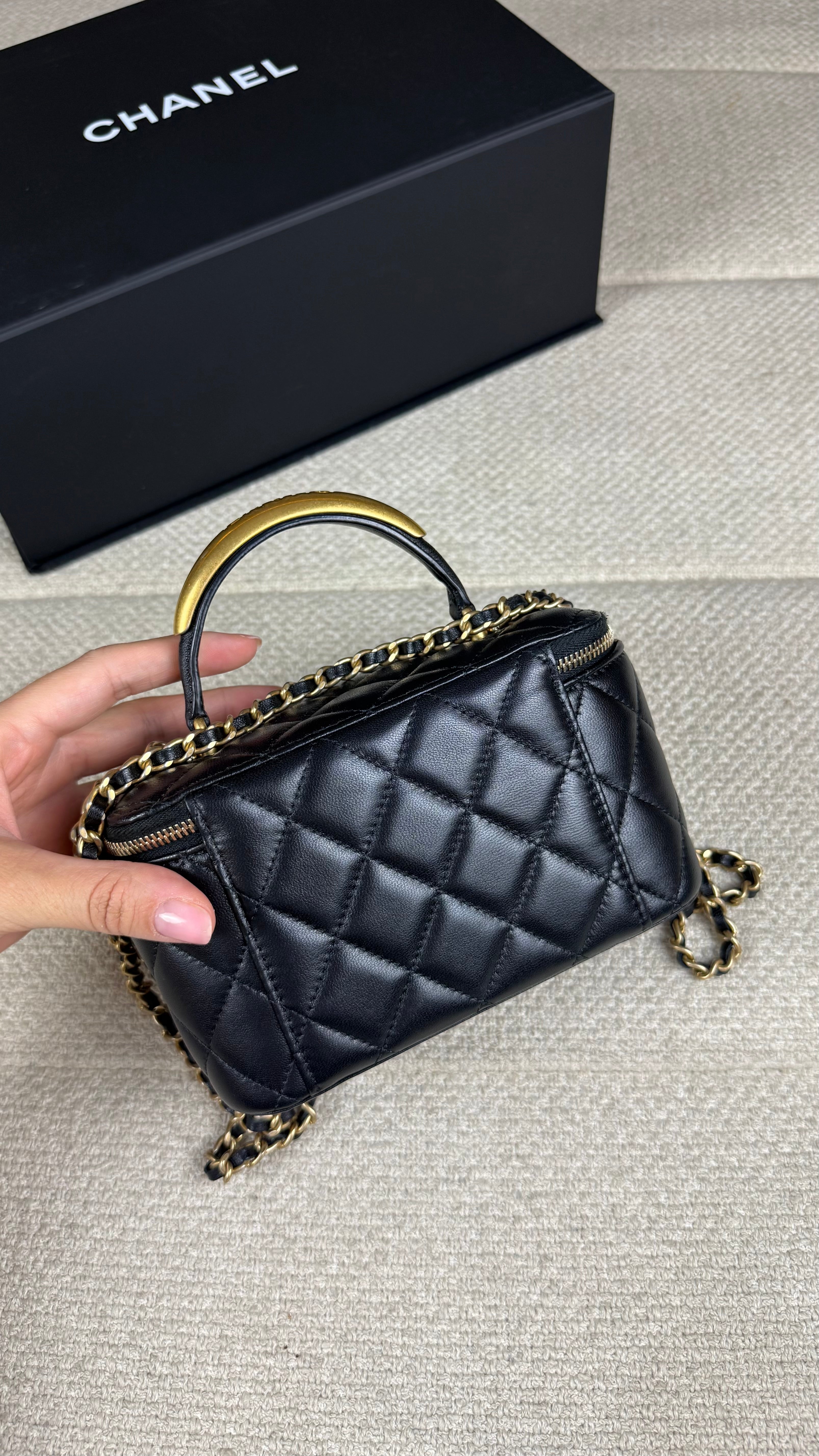 A Chanel Vanity Case Top Handle é uma das peças mais icónicas e desejadas da Chanel, inspirada nas clássicas maletas de beleza da Maison. Compacta, estruturada e extremamente elegante, combina o atemporal matelassé Chanel com uma alça rígida superior curvada, que lhe confere um charme vintage irresistível.