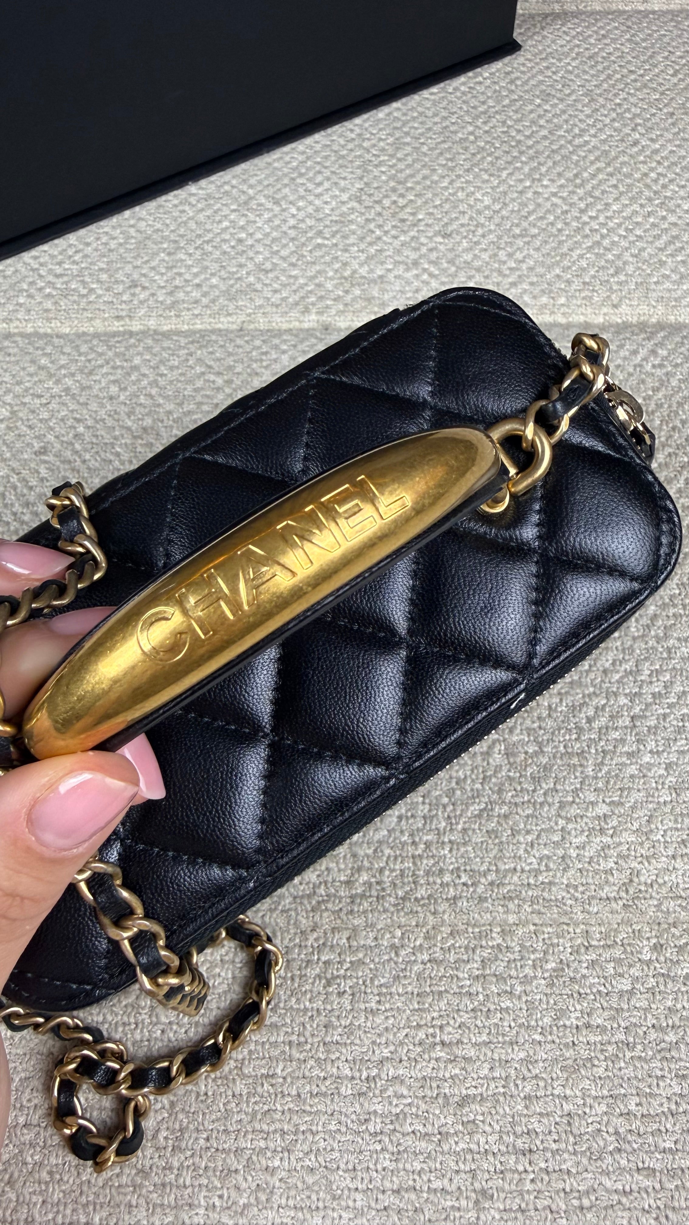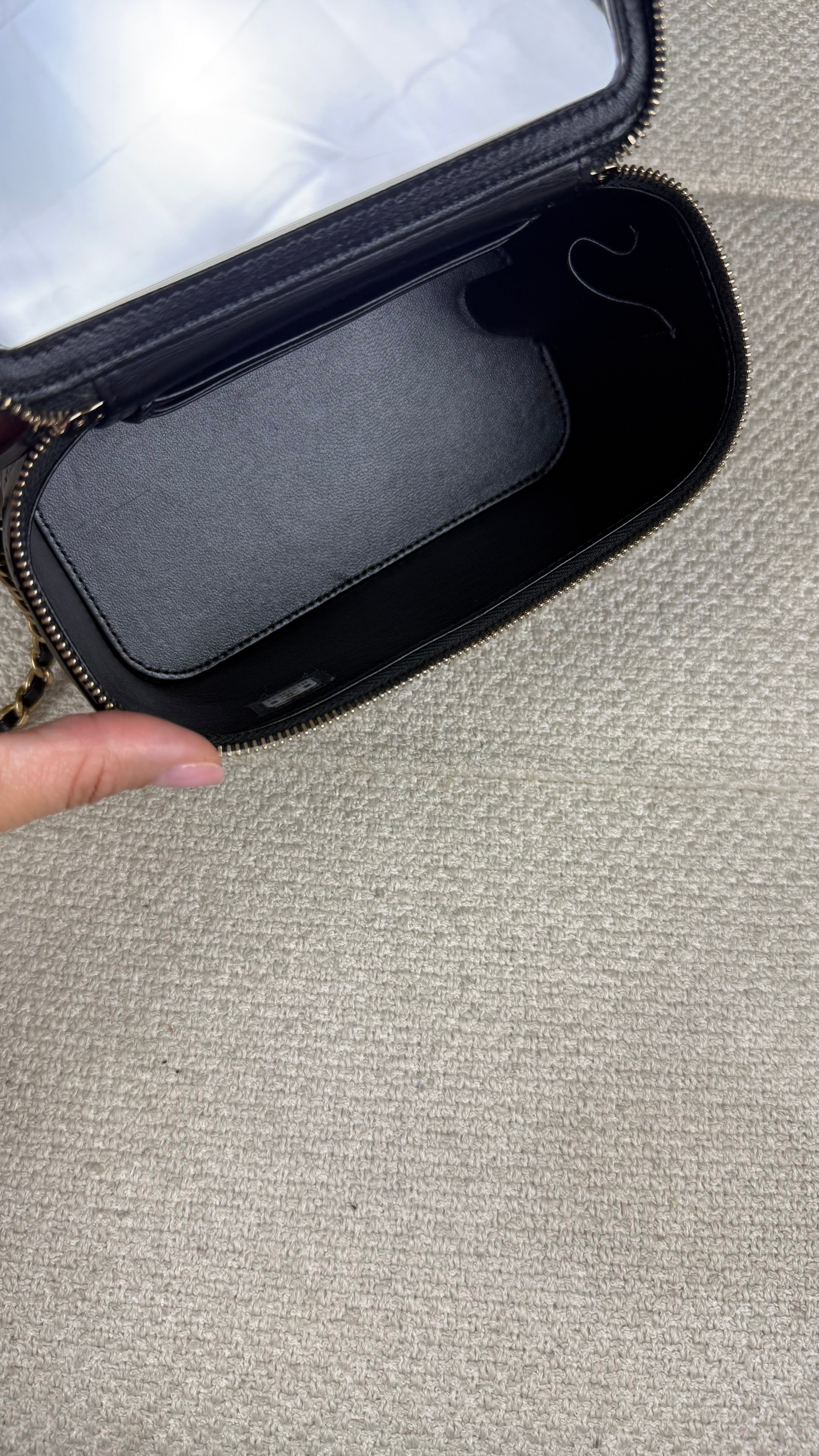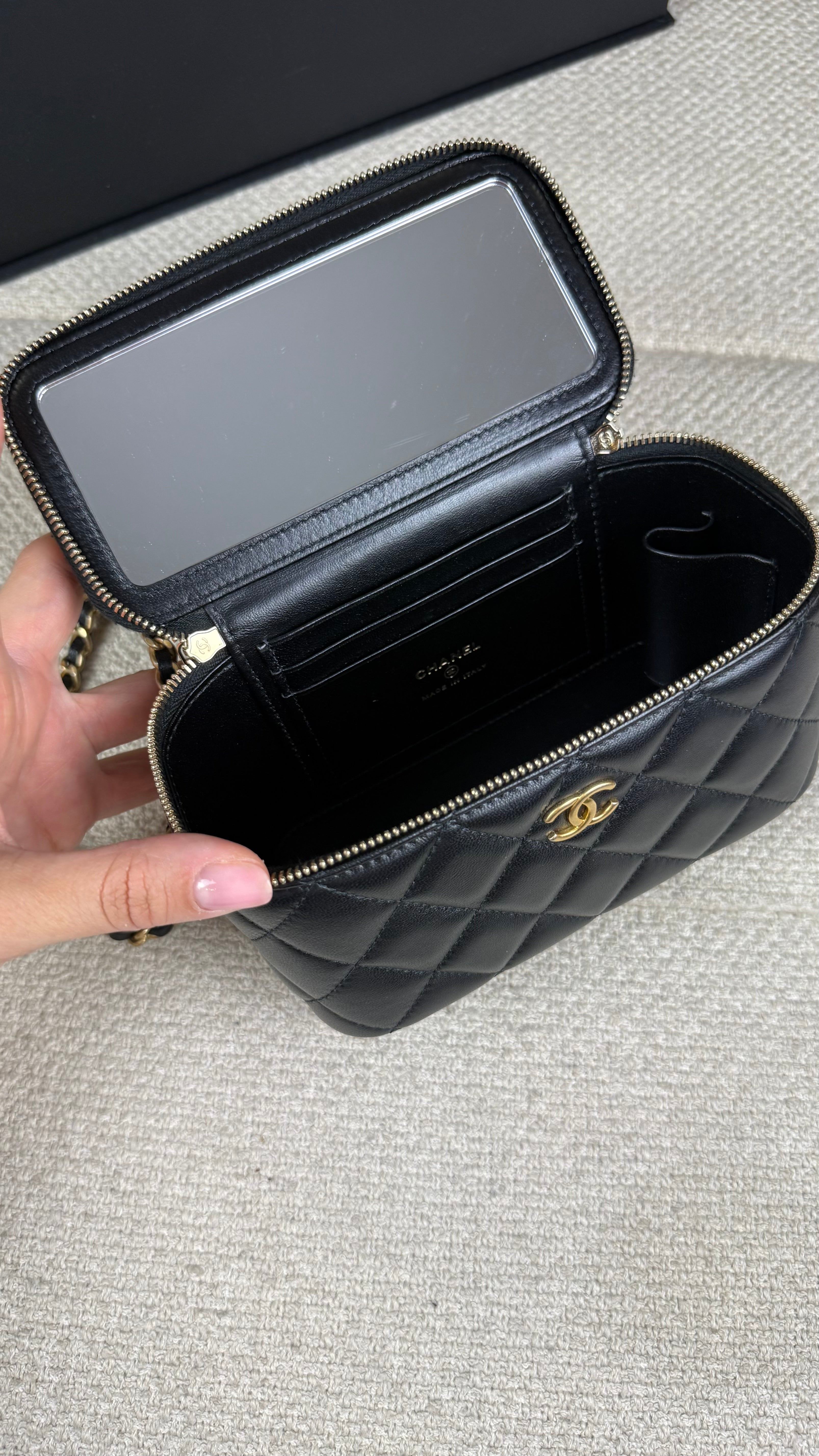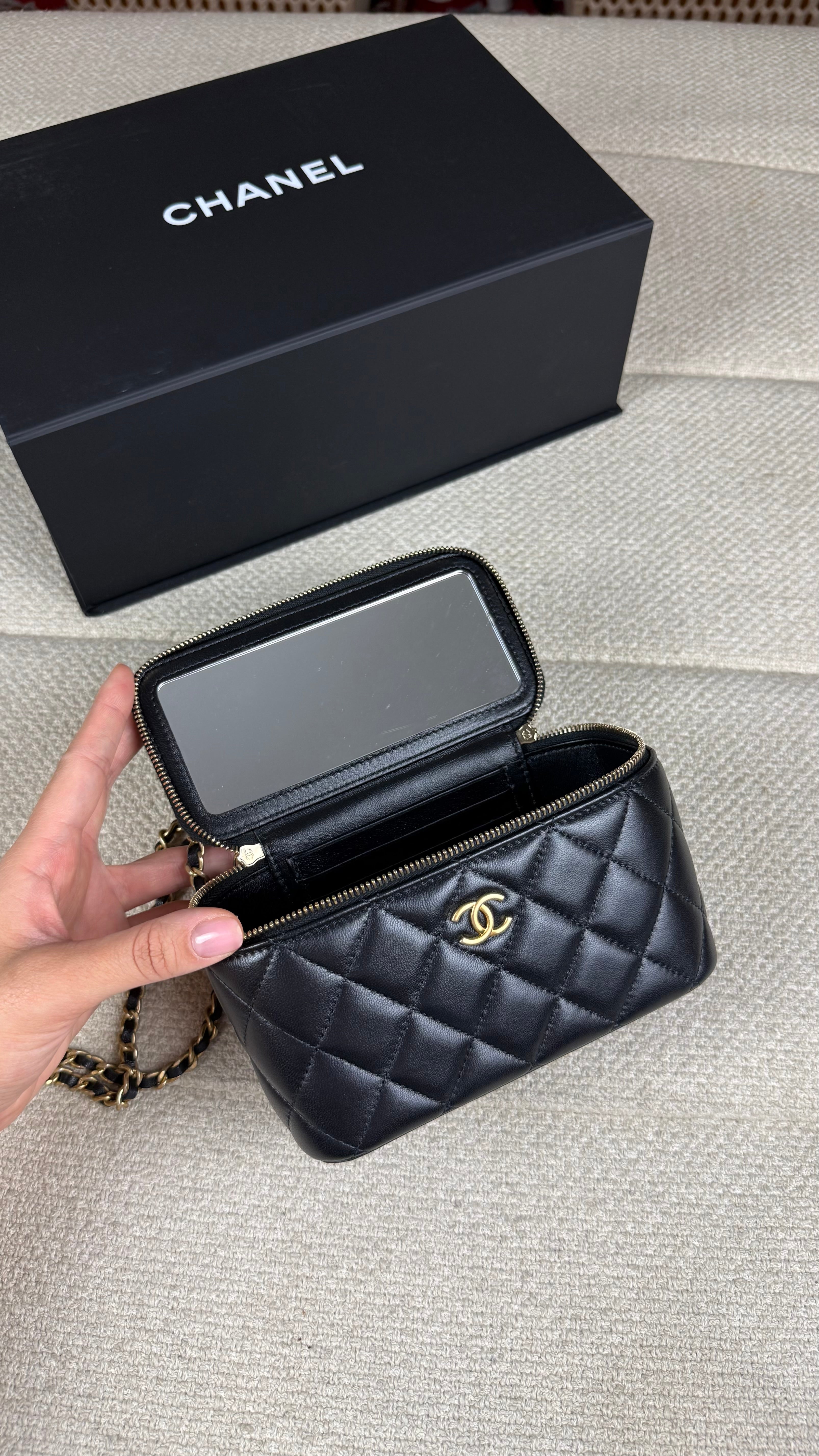 A Chanel Vanity Case Top Handle é uma das peças mais icónicas e desejadas da Chanel, inspirada nas clássicas maletas de beleza da Maison. Compacta, estruturada e extremamente elegante, combina o atemporal matelassé Chanel com uma alça rígida superior curvada, que lhe confere um charme vintage irresistível.