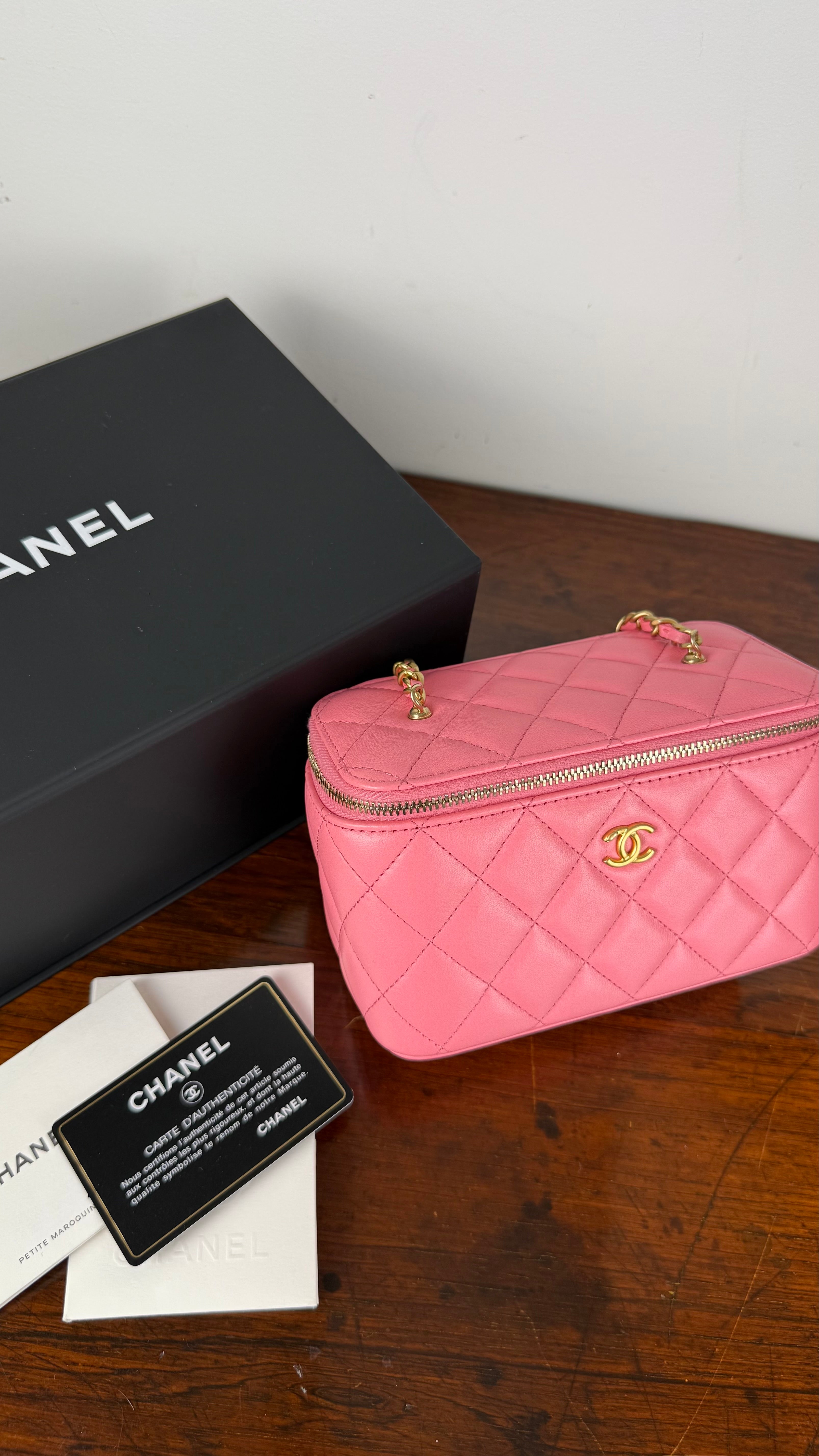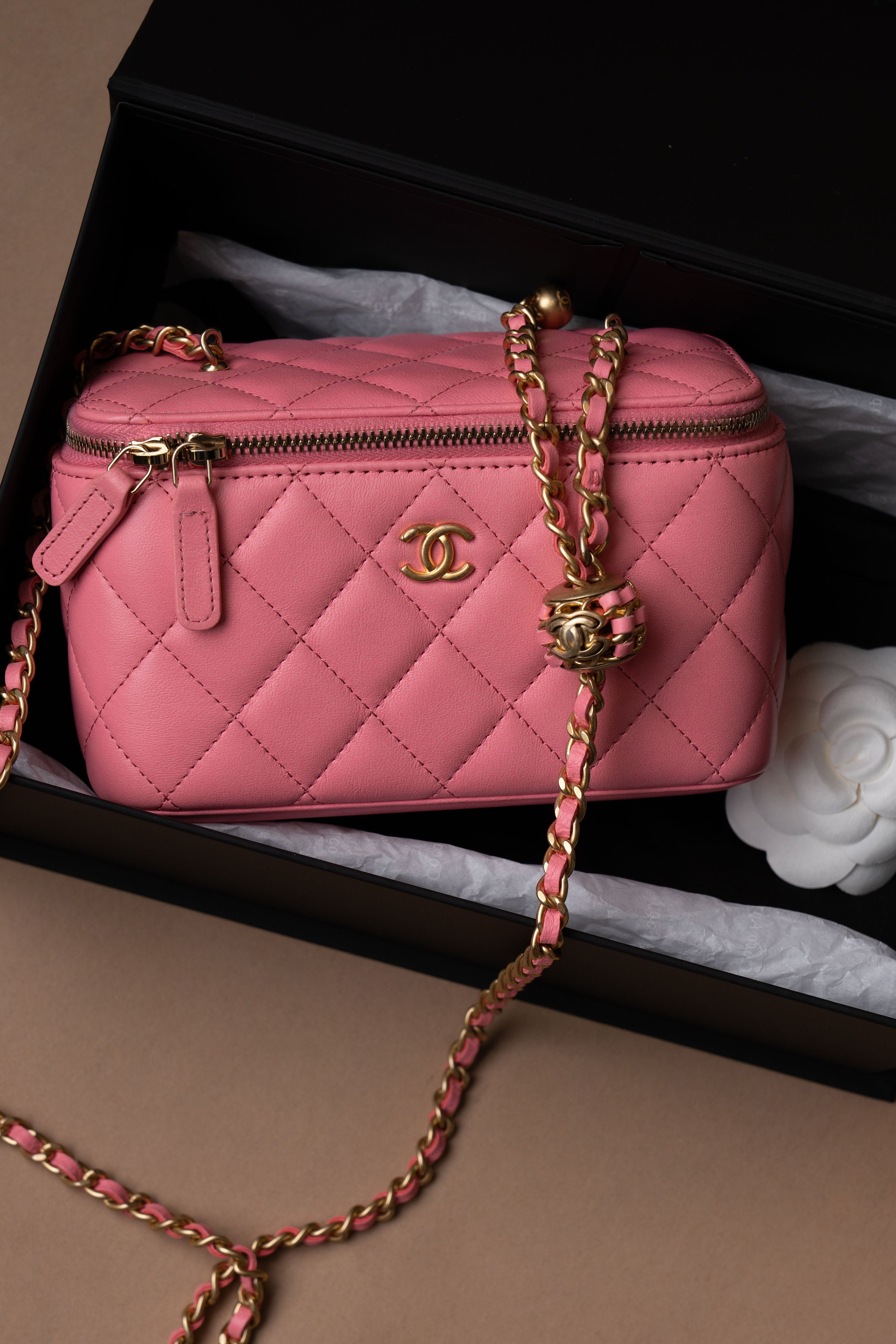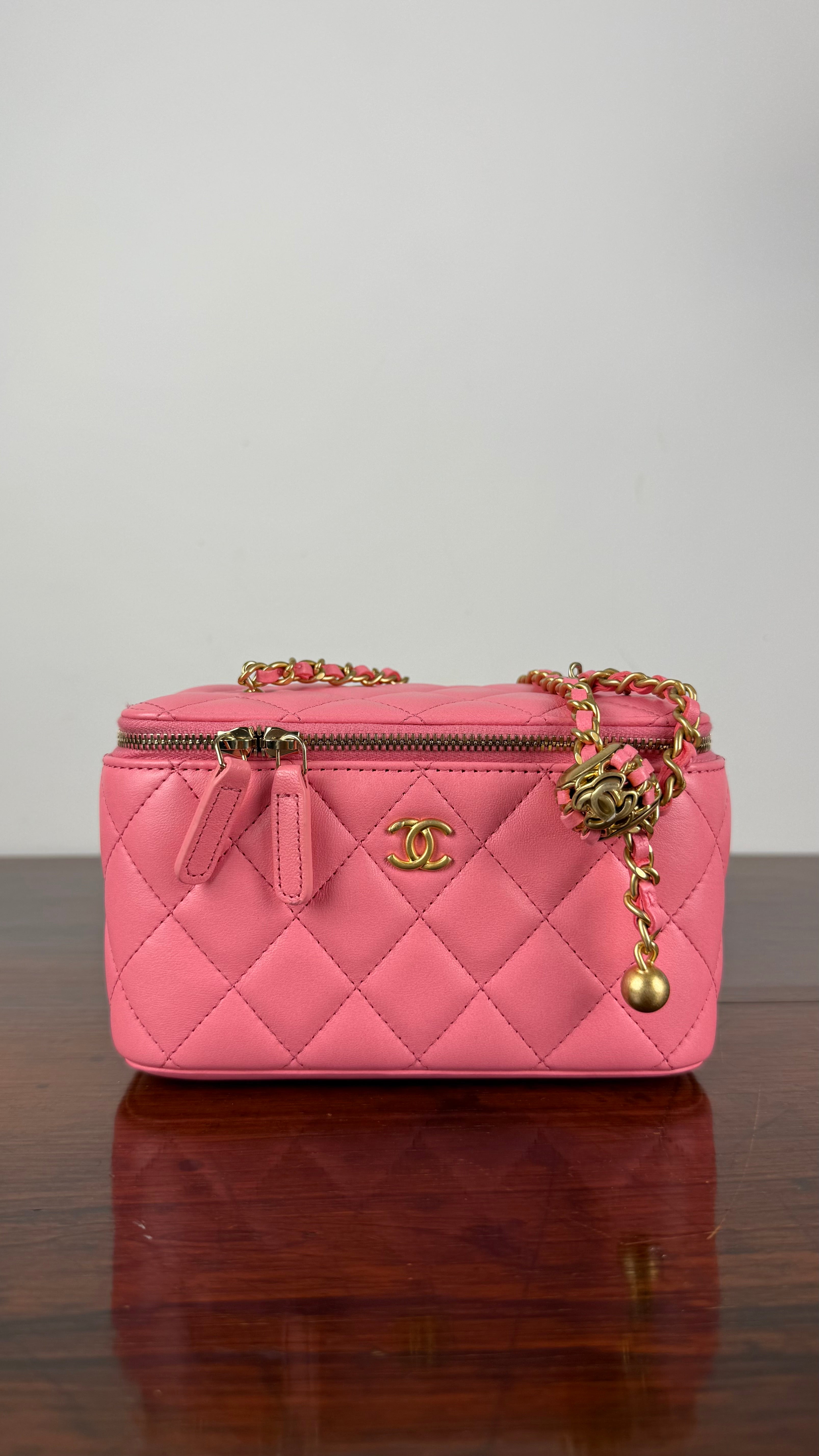 A Vanity Case da Chanel é uma peça atemporal que une sofisticação e praticidade. Inspirada nos estojos de beleza vintage da maison, ganhou uma versão moderna e versátil, perfeita para ser usada tanto como crossbody quanto como clutch de impacto.