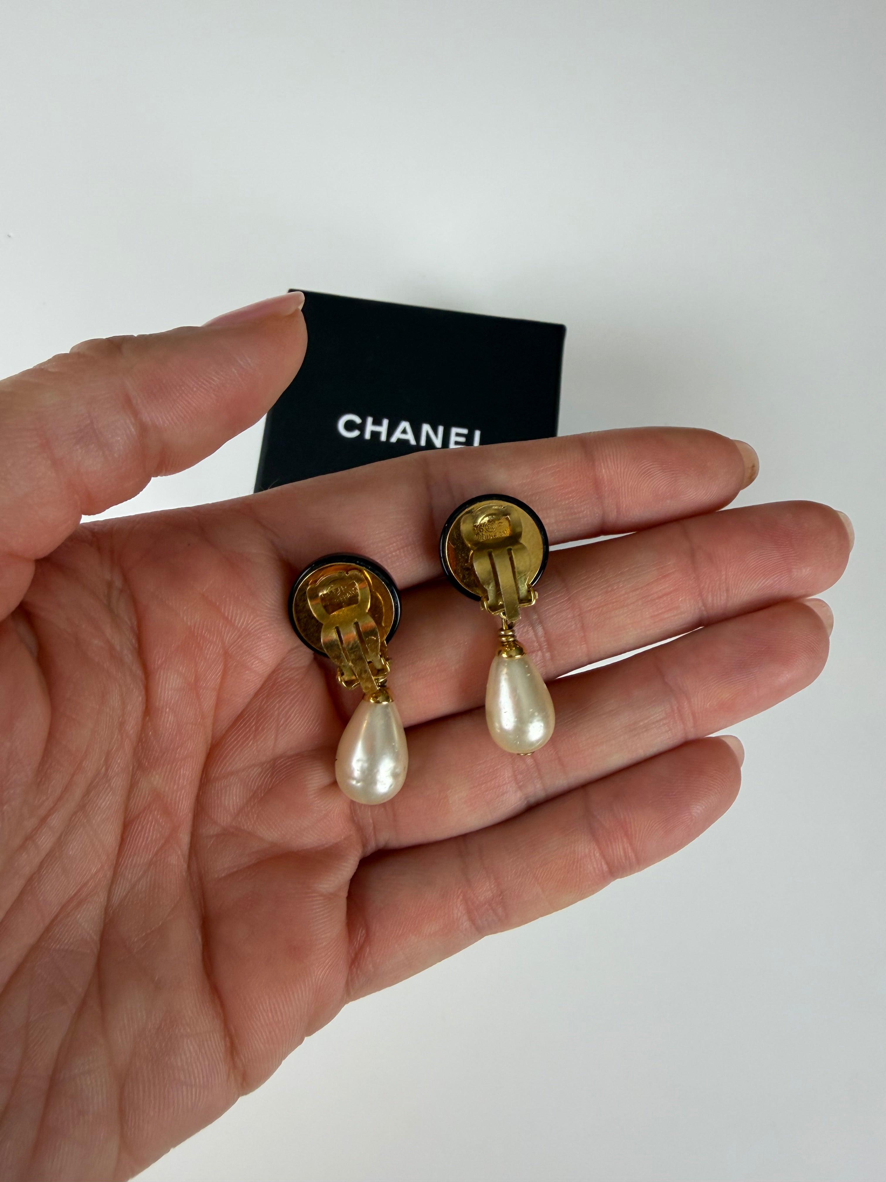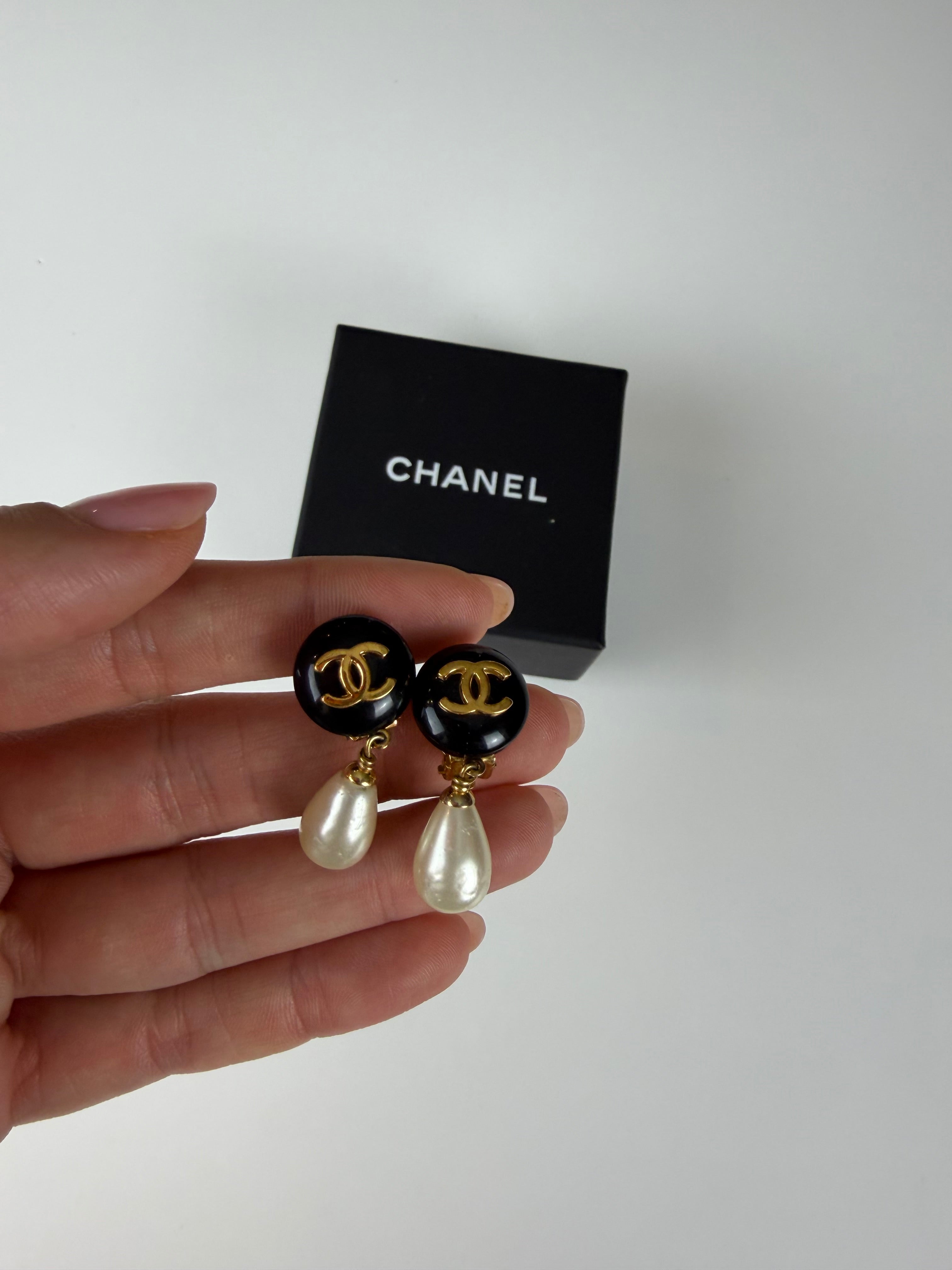 Icónicos e intemporais, estes brincos Chanel vintage representam o melhor da elegância parisiense. O design apresenta o logótipo CC dourado sobre uma base preta esmaltada, complementado por uma delicada pérola em forma de gota pendente — uma combinação perfeita entre sofisticação e feminilidade.